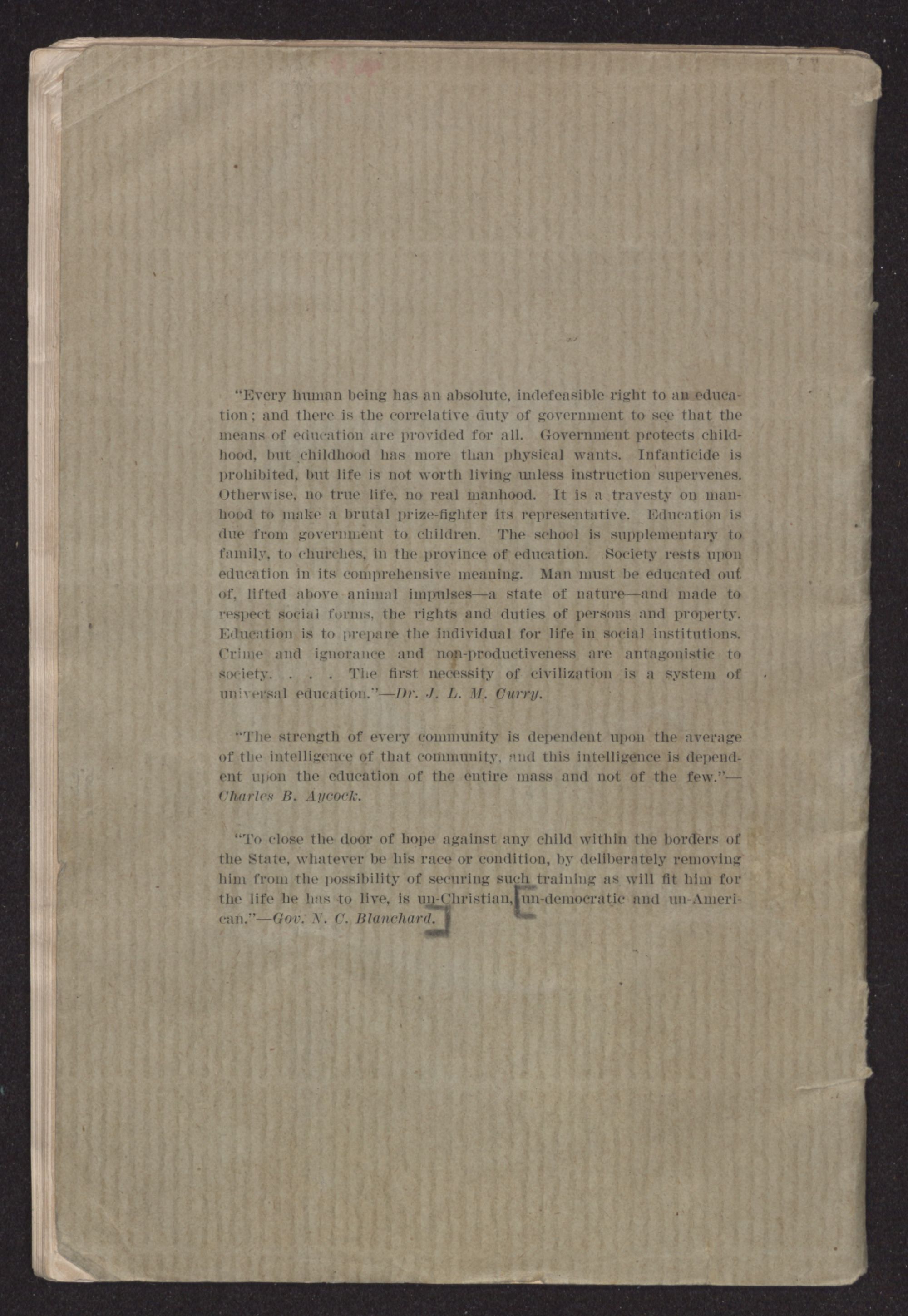“Every human being has an absolute, indefensible right to an education; and there is the correlative duty of government to see that the means of education are provided for all. Government protects childhood, but childhood has more than physical wants. Infanticide is prohibited, but life is not worth living unless instruction supervenes. Otherwise, no true life, no real manhood. It is a travesty on manhood to make a brutal prize-fighter its representative. Education is due from government to children. The school is supplementary to family, to churches, in the province of education. Society rests upon education in its comprehensive meaning. Man must be educated out of, lifted above animal impulses—a state of nature—and made to respect social forms, the rights and duties of persons and property. Education is to prepare the individual for life in social institutions. Crime and ignorance and non-productiveness are antagonistic to society. . . . The first necessity of civilization is a system of universal education.”—Dr. J. L. M. Curry.