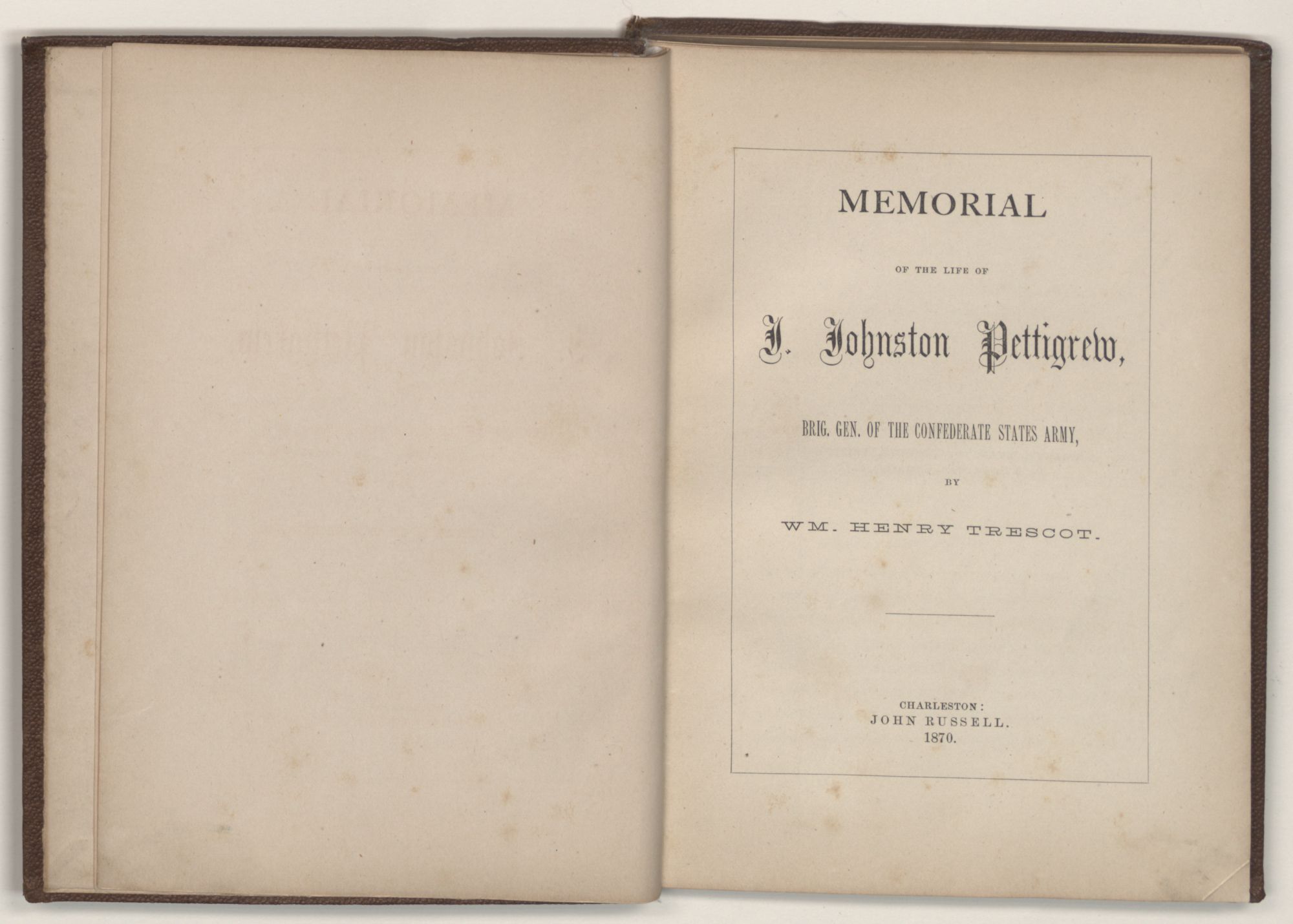 MEMORIALOF THE LIFE OFJ. Johnston Pettigrew,BRIG. GEN. OF THE CONFEDERATE STATES ARMY,BYWM. HENRY TRESCOTCHARLESTON:JOHN RUSSELL.1870.