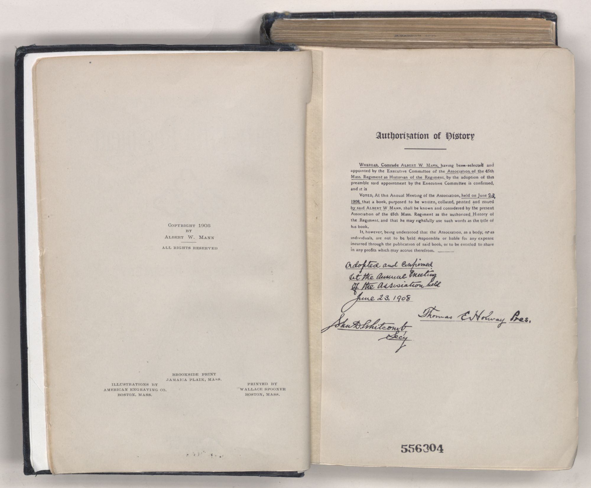 Voted, At this Annual Meeting of the Association, held on June 23, 1908, that a book, purposed to be written, collated, printed and issued by said Albert W Mann, shall be known and considered by the present Association of the 45th Mass. Regiment as the authorized History of the Regiment, and that he may rightfully use such words as the title of his book.