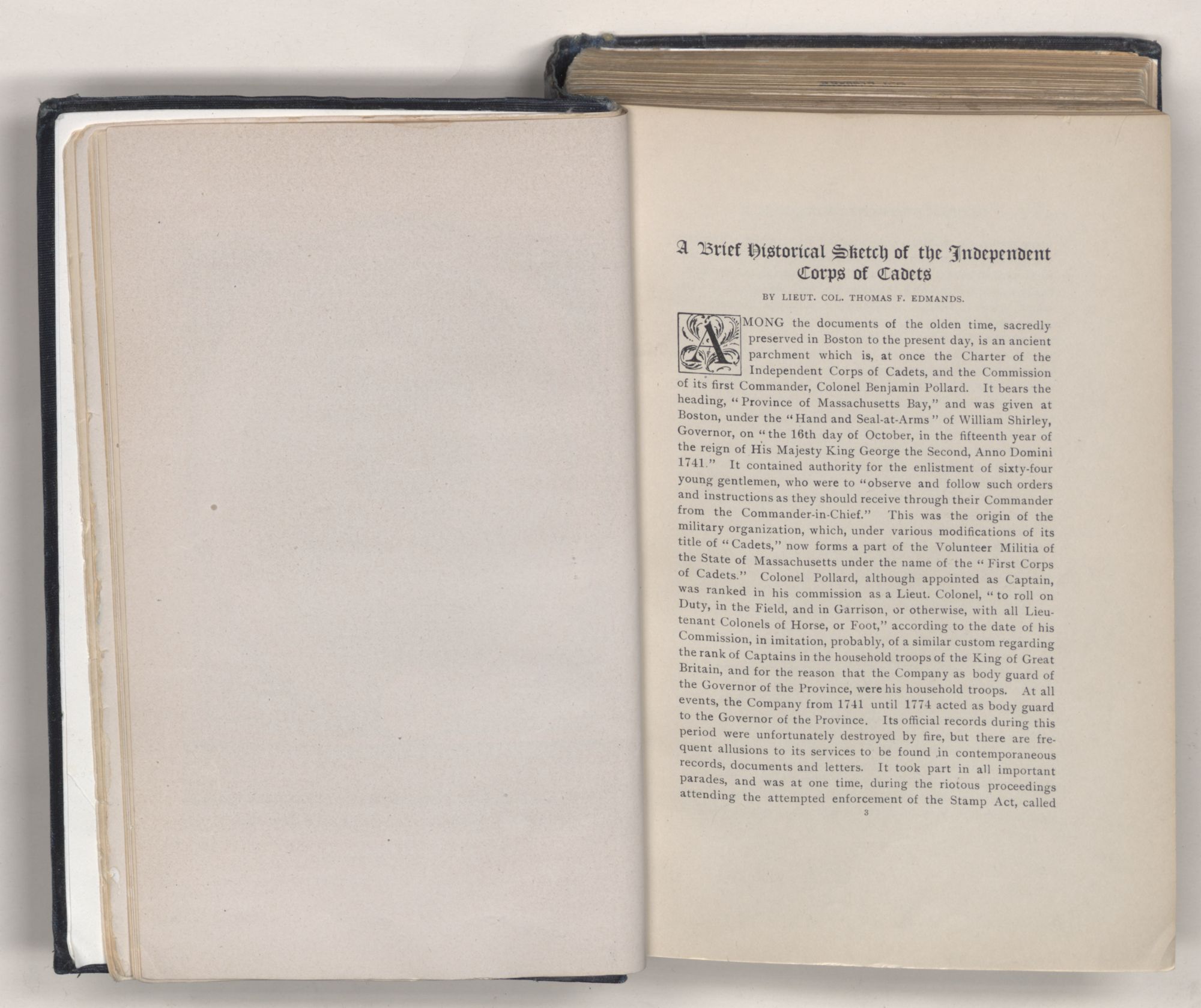 AMONG the documents of the olden time, sacredly preserved in Boston to the present day, is an ancient parchment which is, at once the Charter of the Independent Corps of Cadets, and the Commission of its first Commander, Colonel Benjamin Pollard. It bears the heading, “Province of Massachusetts Bay,” and was given at Boston, under the “Hand and Seal-at-Arms” of William Shirley, Governor, on “the 16th day of October, in the fifteenth year of the reign of His Majesty King George the Second, Anno Domini 1741.” It contained authority for the enlistment of sixty-four young gentlemen, who were to “observe and follow such orders and instructions as they should receive through their Commander from the Commander-in-Chief.” This was the origin of the military organization, which, under various modifications of its title of “Cadets,” now forms a part of the Volunteer Militia of the State of Massachusetts under the name of the “First Corps of Cadets.” Colonel Pollard, although appointed as Captain, was ranked in his commission as a Lieut. Colonel, “to roll on Duty, in the Field, and in Garrison, or otherwise, with all Lieutenant Colonels of Horse, or Foot,” according to the date of his Commission, in imitation, probably, of a similar custom regarding the rank of Captains in the household troops of the King of Great Britain, and for the reason that the Company as body guard of the Governor of the Province, were his household troops. At all events, the Company from 1741 until 1774 acted as body guard to the Governor of the Province. Its official records during this period were unfortunately destroyed by fire, but there are frequent allusions to its services to be found in contemporaneous records, documents and letters. It took part in all important parades, and was at one time, during the riotous proceedings attending the attempted enforcement of the Stamp Act, called