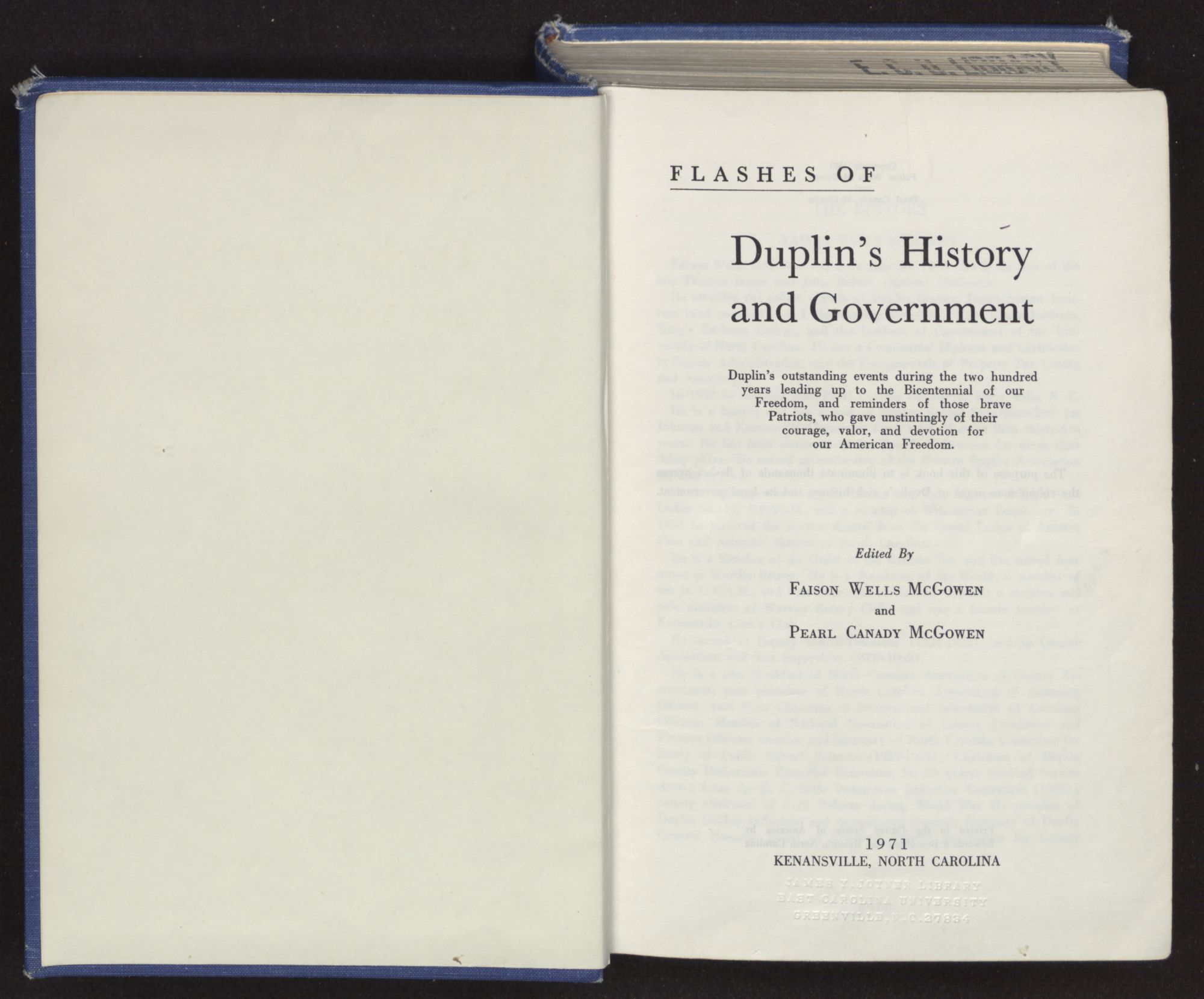 FLASHES OF Duplin's History and GovernmentDuplin's outstanding events during the two hundred years leading up to the Bicentennial of our Freedom, and reminders of those brave Patriots, who gave unstintingly of their courage, valor, and devotion for our American Freedom.Edited ByFAISON WELLS MCGOWEN and PEARL CANADY MCGOWEN1971KENANSVILLE, NORTH CAROLINA