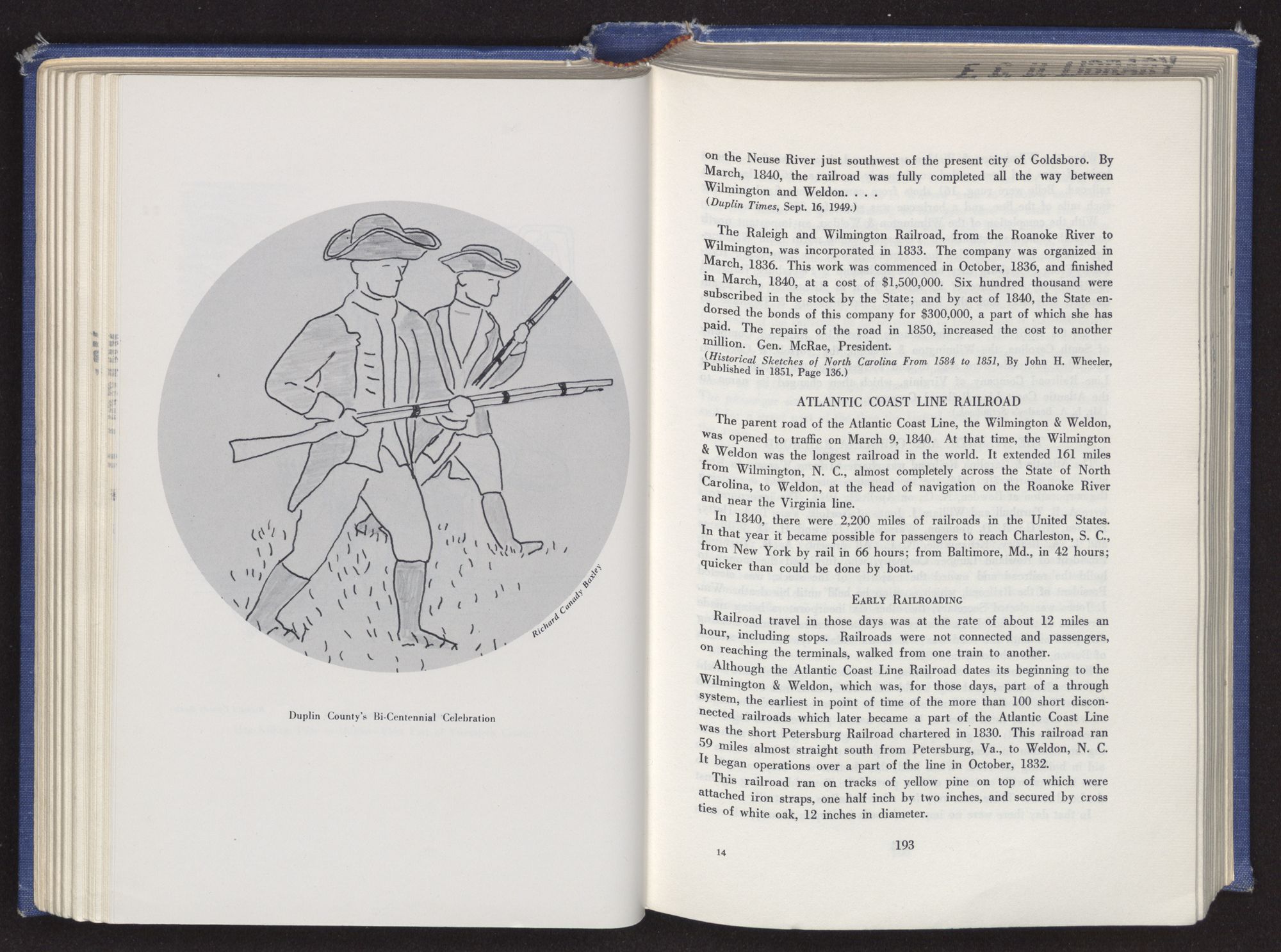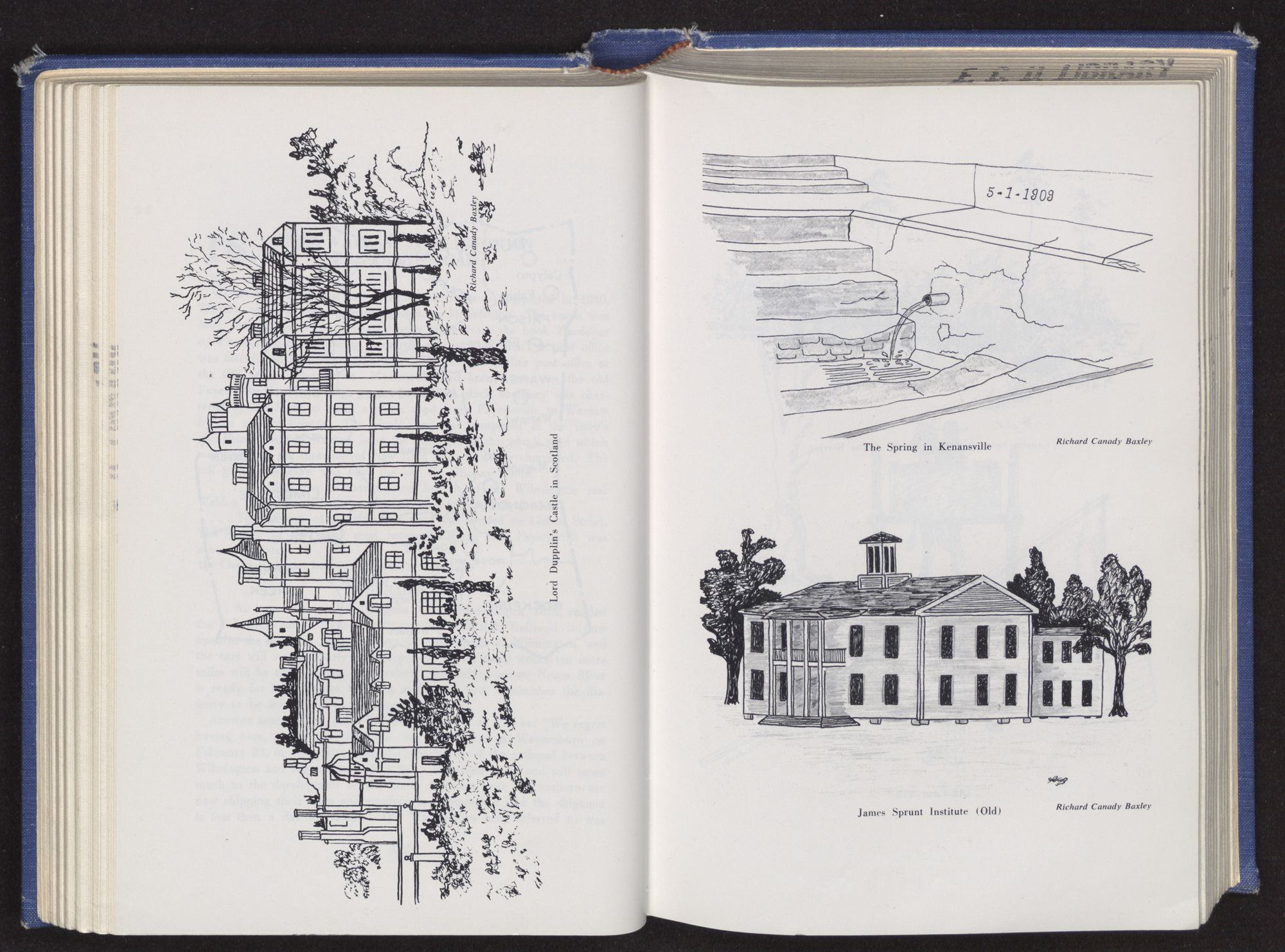 We express our sincere appreciation to the following for their fine cooperation and helpfulness: John Alexander McMahon, Chapel Hill, N. C.; James H. Blackmore, Wake Forest, N. C.; Mrs. Virginia Southerland Marshall, Wilmington, N. C.; Marse Grant, Editor and Business Manager of the Biblical Recorder; Ike F. Riddick, Publisher of the Duplin Times-Progress Sentinel; H. L. Oswald, Publisher The Wallace Enterprise, and The Warsaw-Faison News; Thad Eure, Secretary of State; Department of Archives and History; W. C. Blackmore, Burgaw, N. C.; State Library; University of North Carolina Library; Duplin County Dorothy Wightman Library; County Officials and their assistants; all of those persons who have furnished biographical sketches, and all others who have supplied various and sundry items. We are most thankful to Dr. W. Dallas Herring for the country drawing, and his cooperation; and also to President Dixon Hall and the James Sprunt Library staff for their help.
