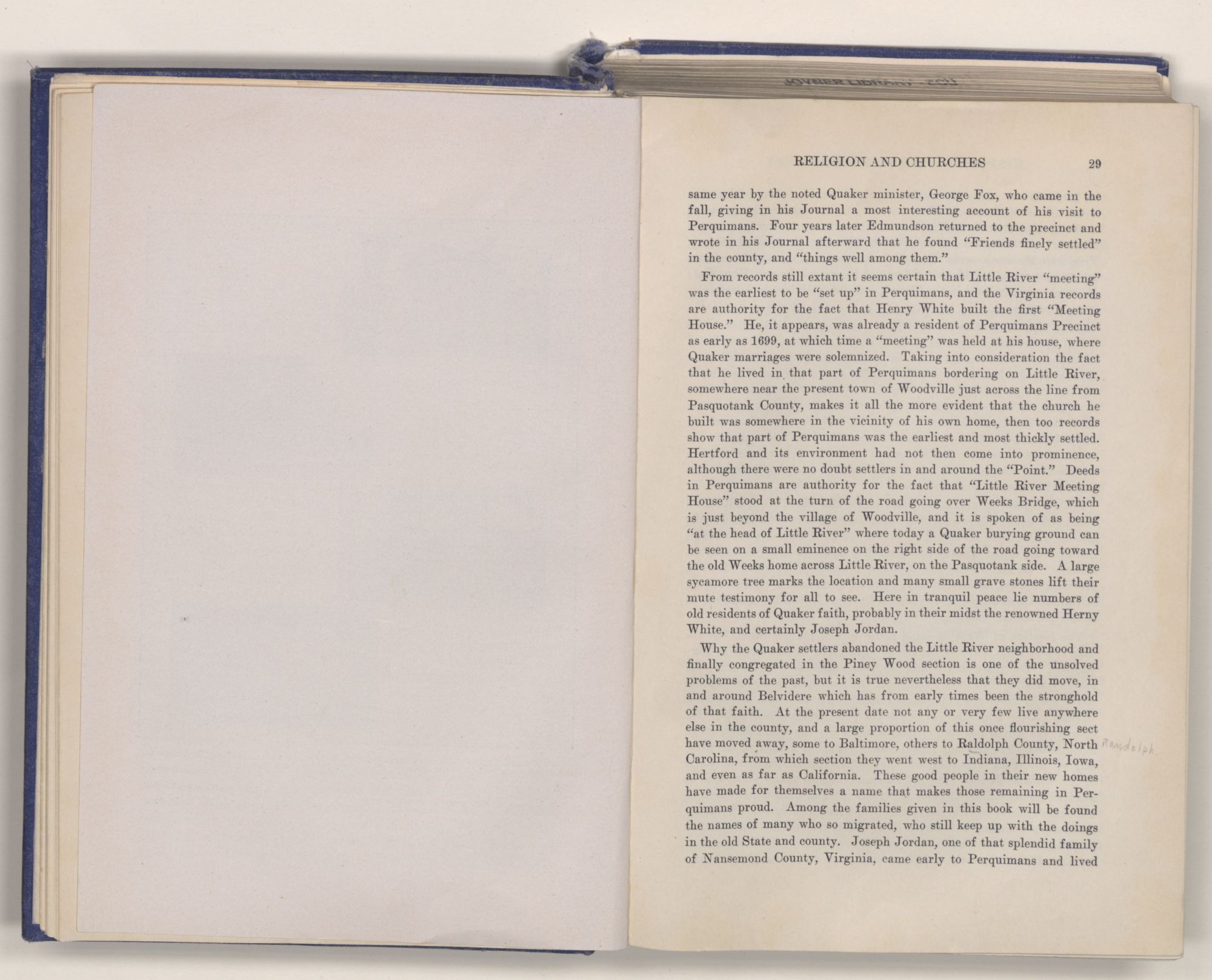The Quaker records in Lower Monthly Meeting, Isle of Wight, Burleigh, and other meetings in Virginia, teem with marriages of Quakers who came to Perquimans. They also give other very important items of interest, which I have endeavored to weave into this history, thereby making a more complete record.