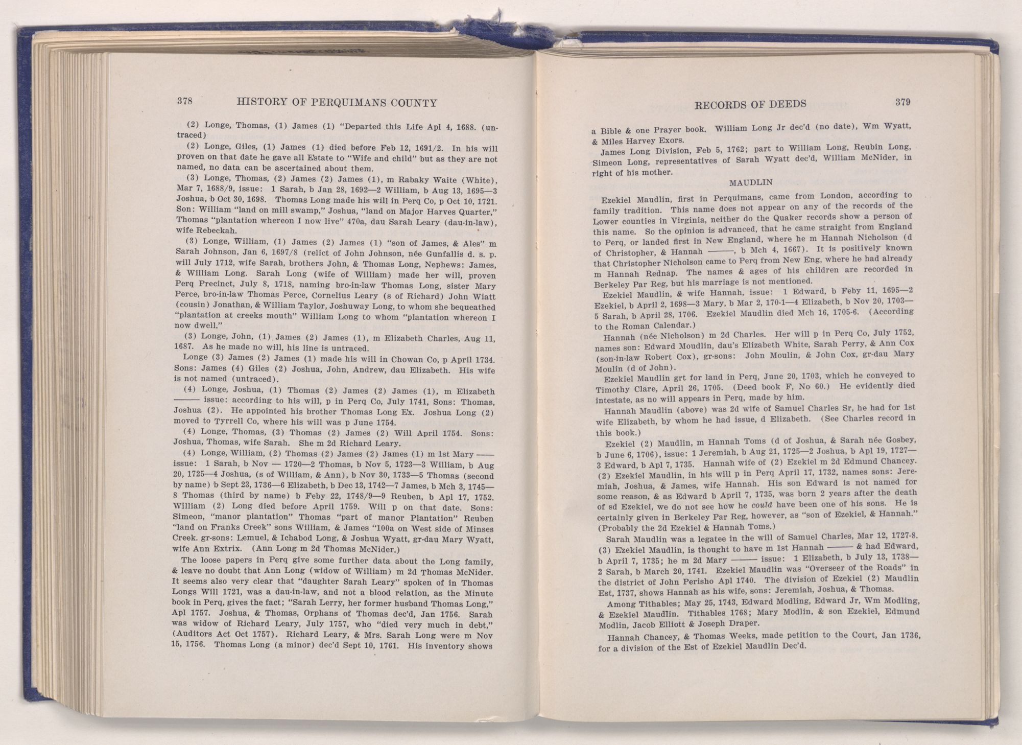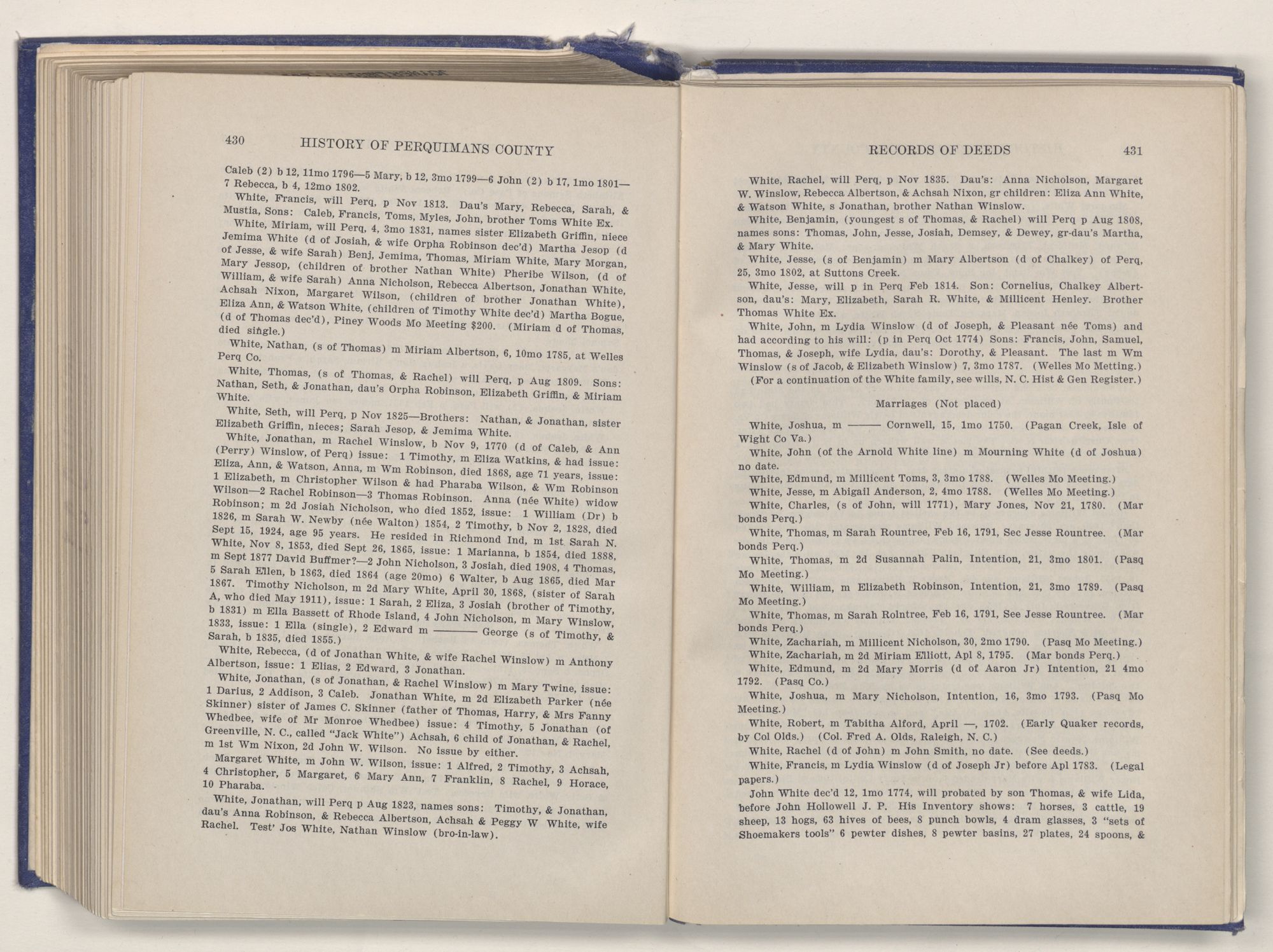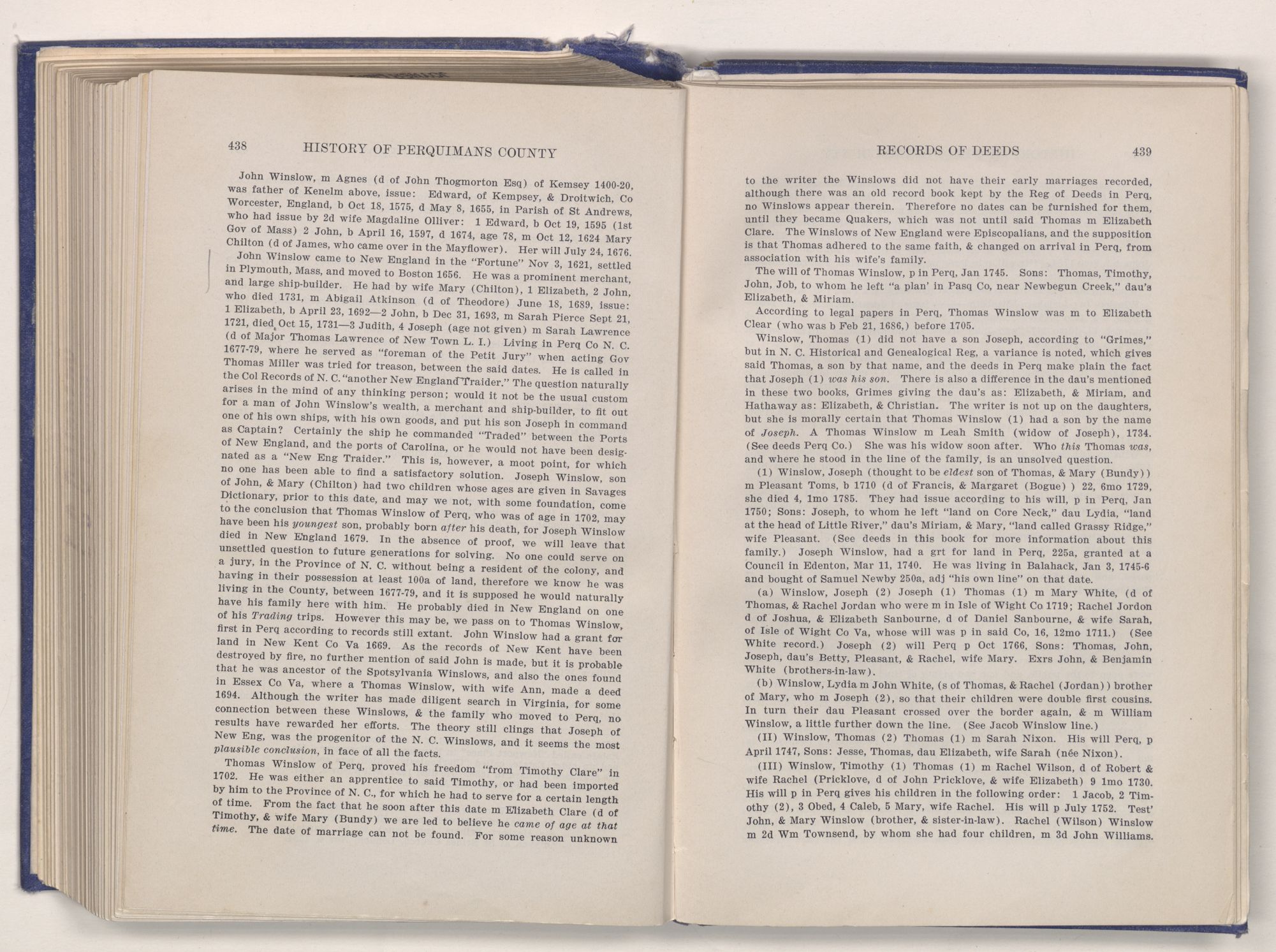 This work represents years of untiring labor, trips to various counties in Virginia, days spent in Guilford College, for Quaker data, and over a year's work on the Perquimans records. I think I can say without egotism, that I am well acquainted with Perquimans County, from the beginning to the present day. And yet there is much more that ought to be done to make this work complete. One person could not in justice to the wonderful storehouse of information contained in the records here, make a finished job of them alone. So it is my earnest hope that a younger person, with enthusiasm and love for his, or her, native county, will take up the work where I am leaving off, and carry it through to a more satisfactory end. My work only takes these grand records to and through the Revolutionary period, and much of interest could be added.