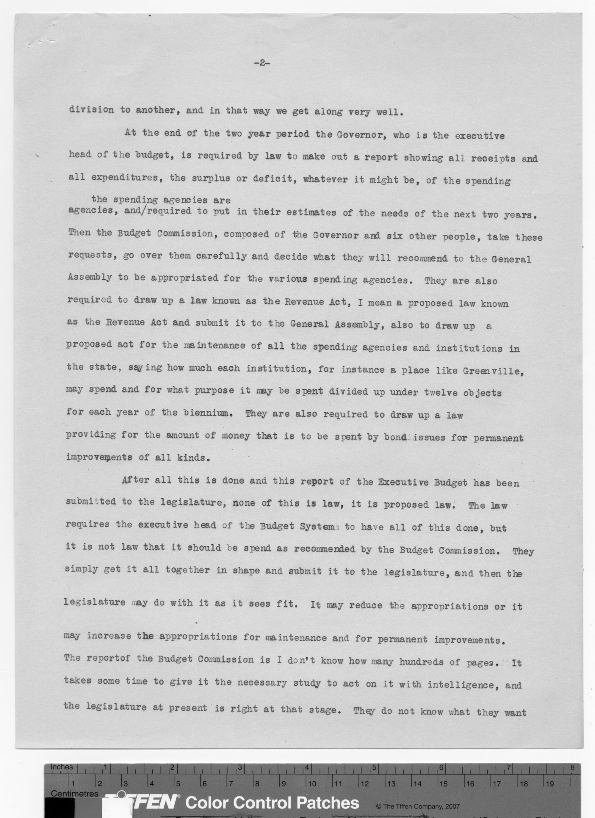 as the Revenue Act and submit it to the General Assembly, also to draw up a proposed not for the maintenance of all the spending agencies and institutions in the state, saying how much each institution, for instance a place like Greenville, may spend and for what purpose it may be spent divided up under twelve objects