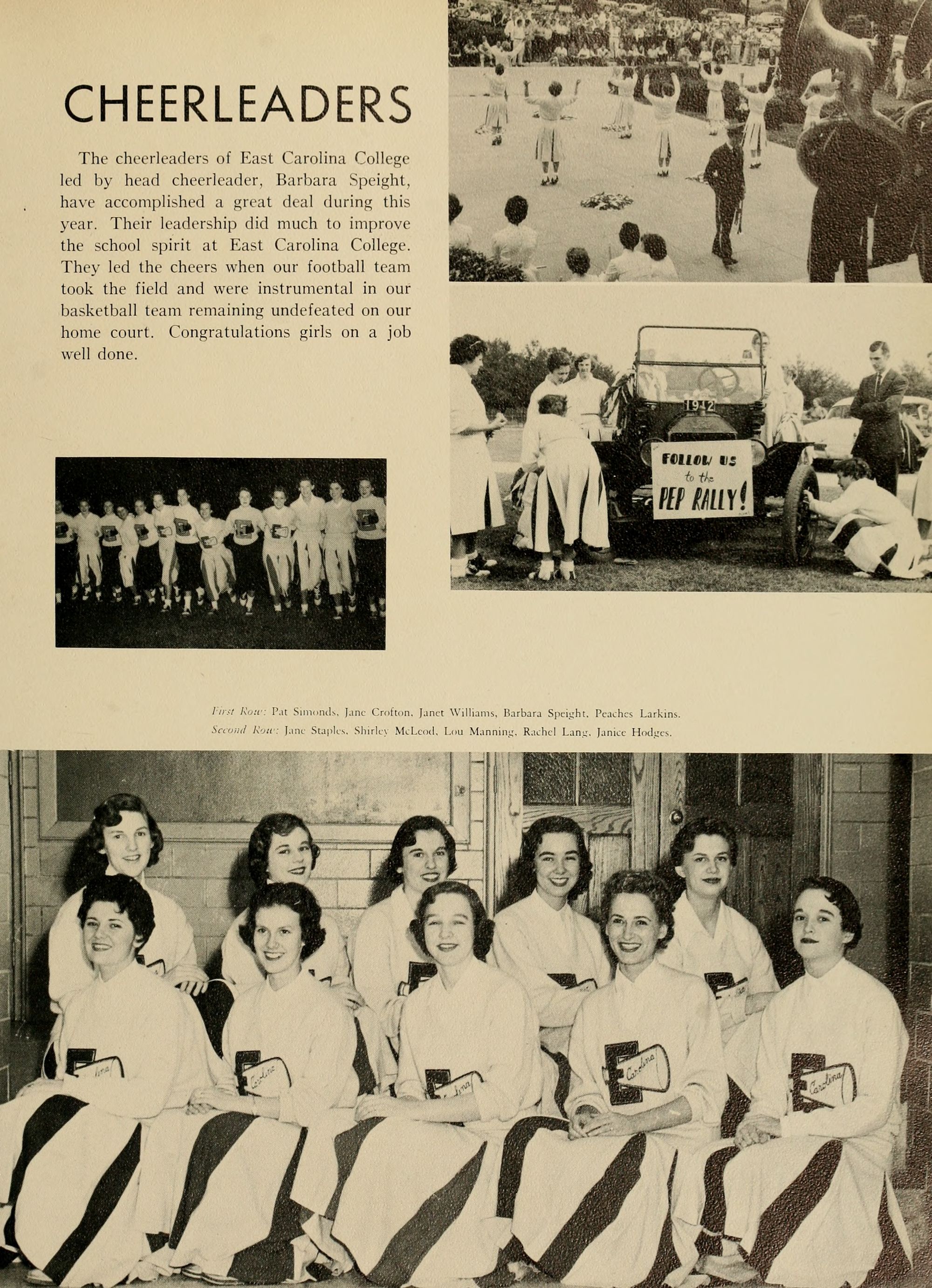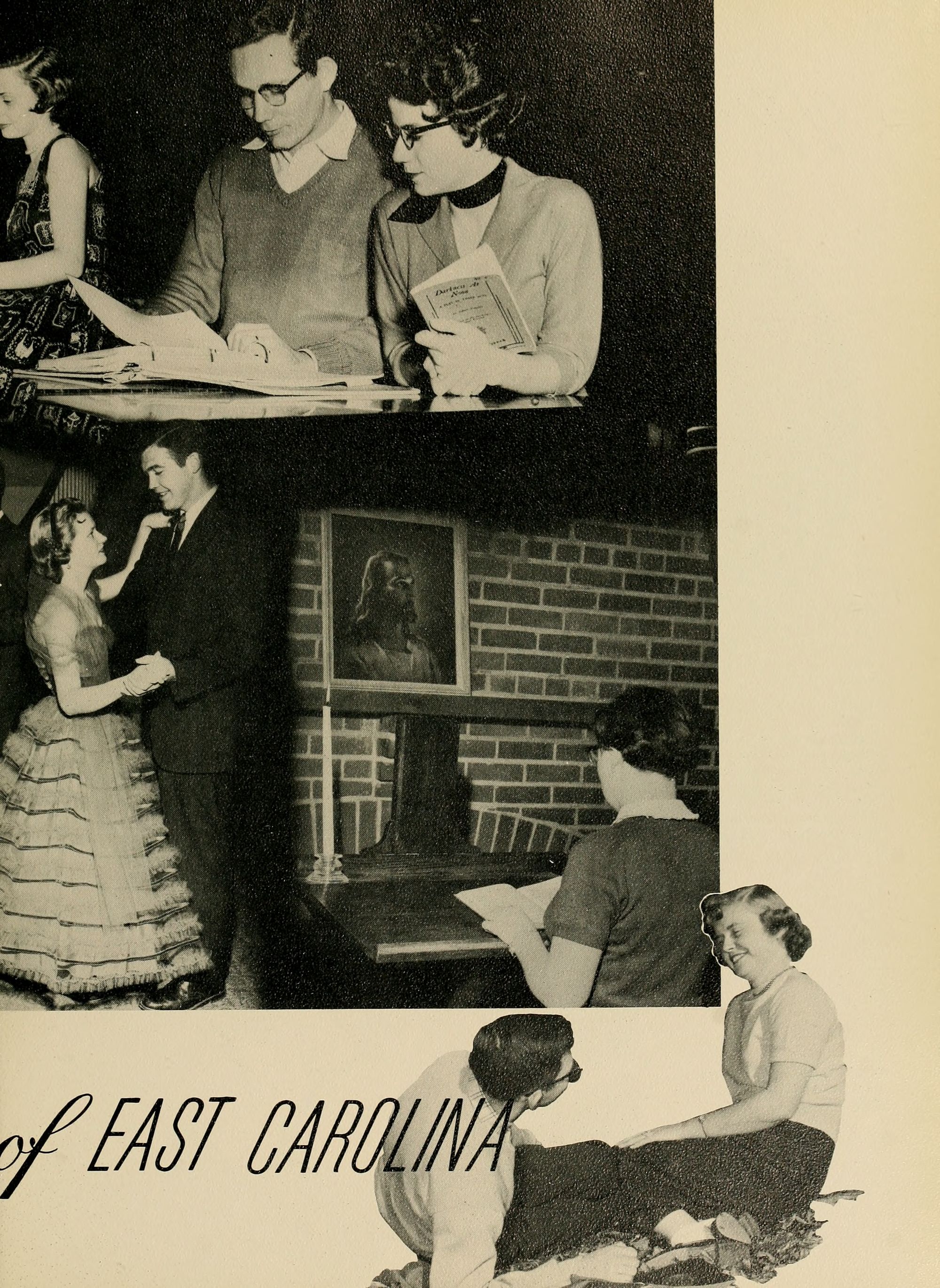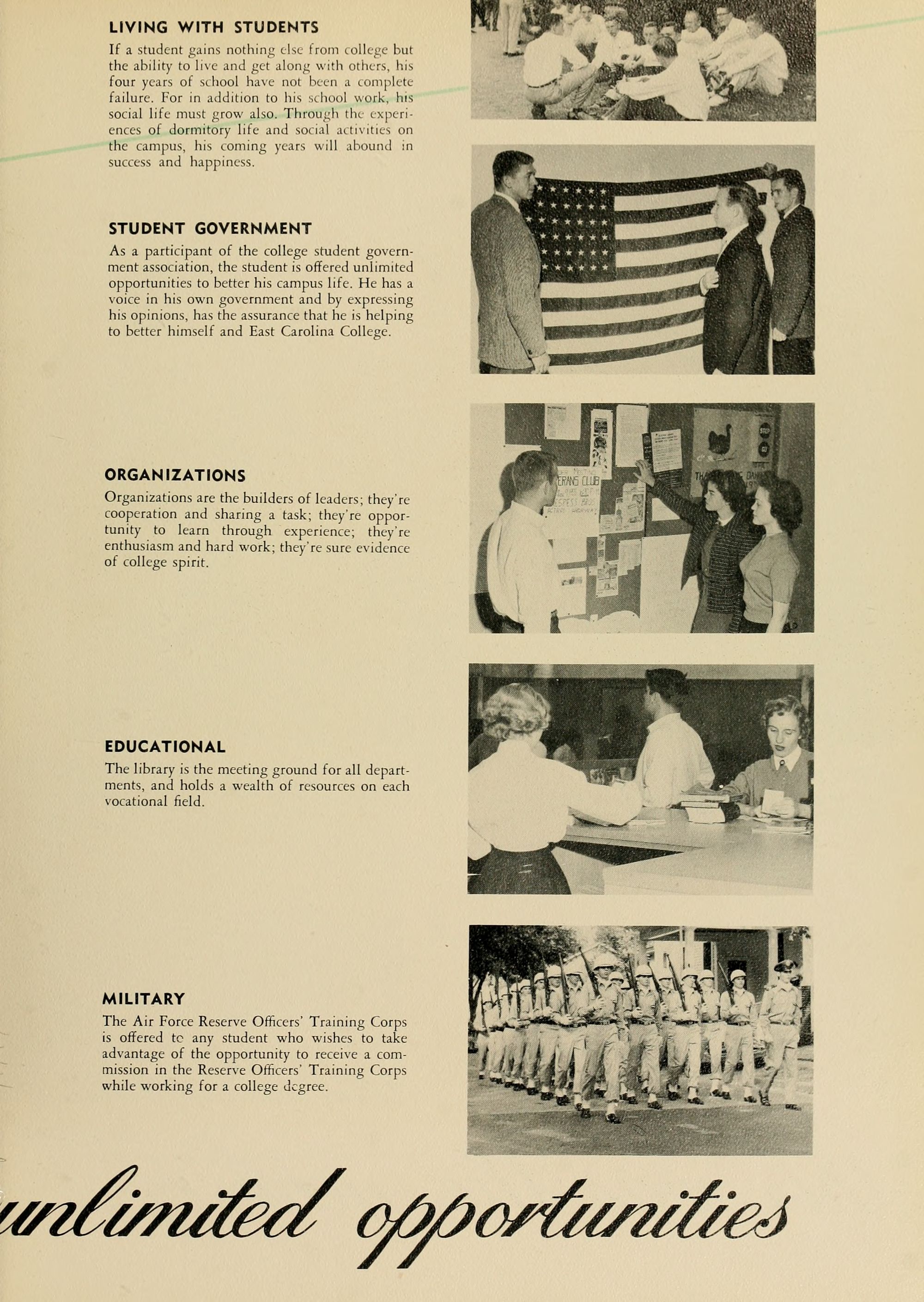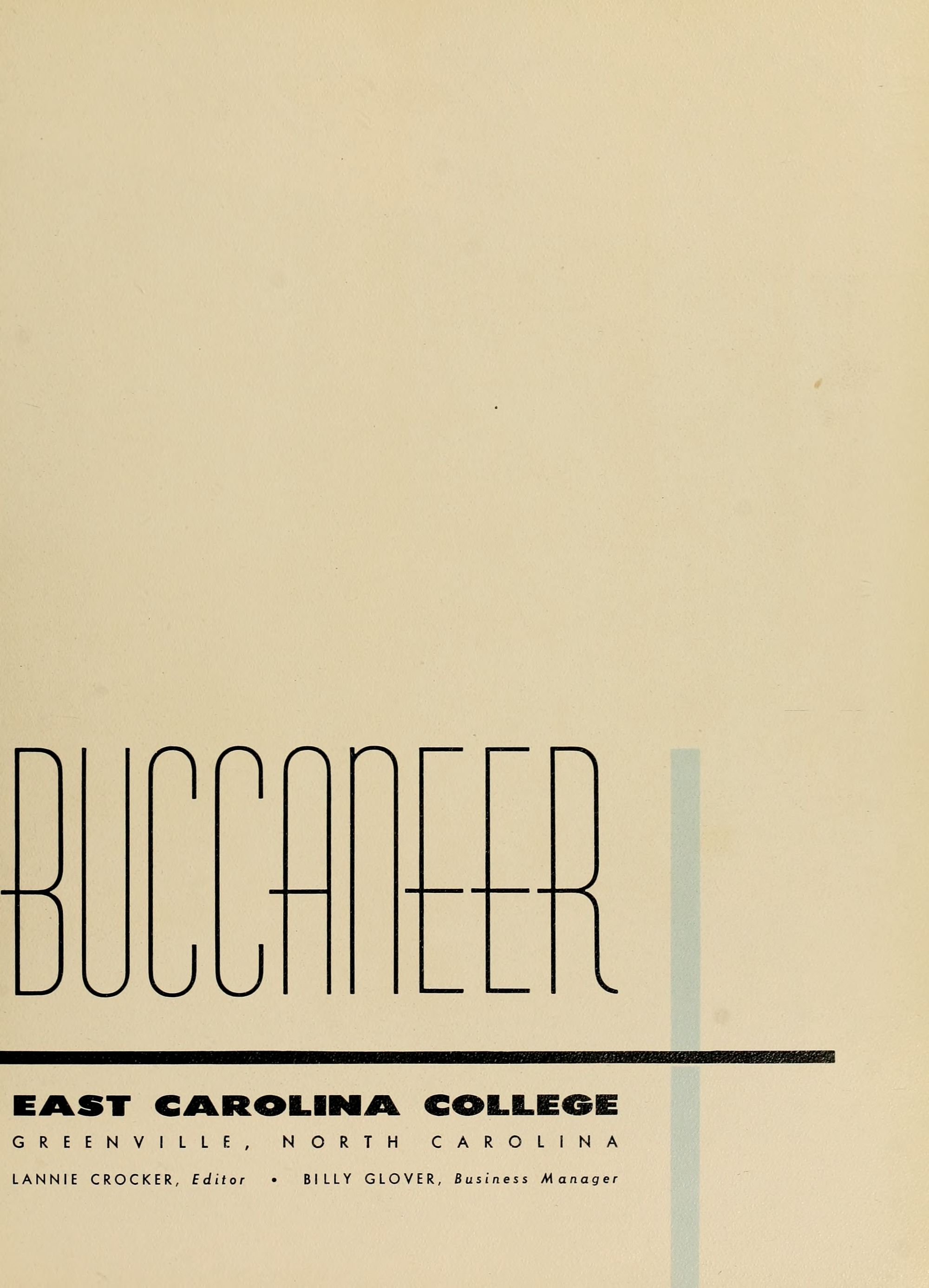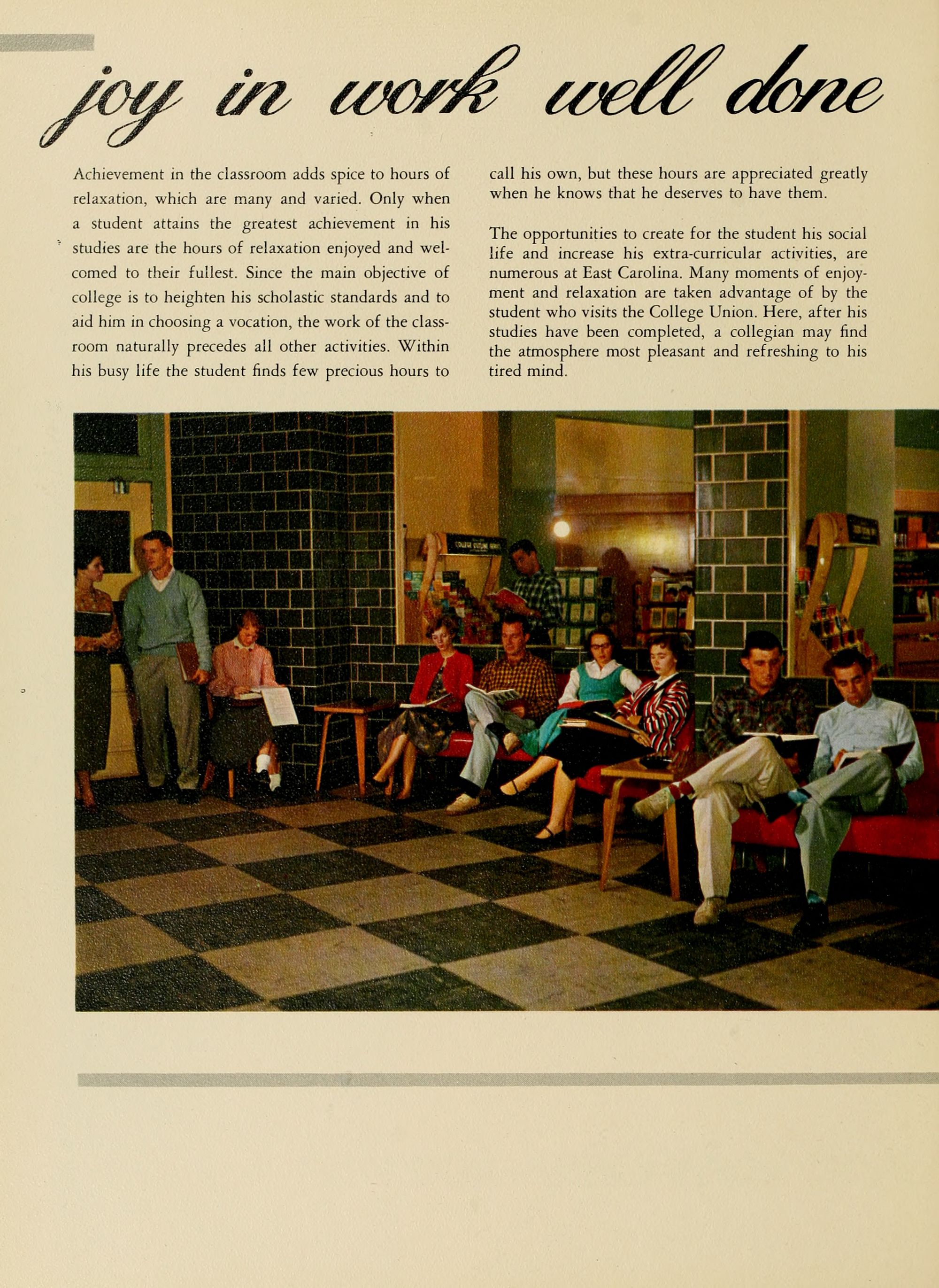 The spirit of EAST CAROLINA results from the spontaneous expression of social, educa-tional, spiritual, and sportsmanship activities of the college students, as they work toward the double goal of adulthood and graduation. In college a student finds a wide selection of cultural and social opportunities which are correlated with the curriculum. While living with contemporaries, college students estab-lish for themselves a set of values and learn to select the best from life with an aim toward living it. Graduation is the culmination of a successful college life; the student emerges into his place in the world, equipped with the best upon which to build a worthy life.