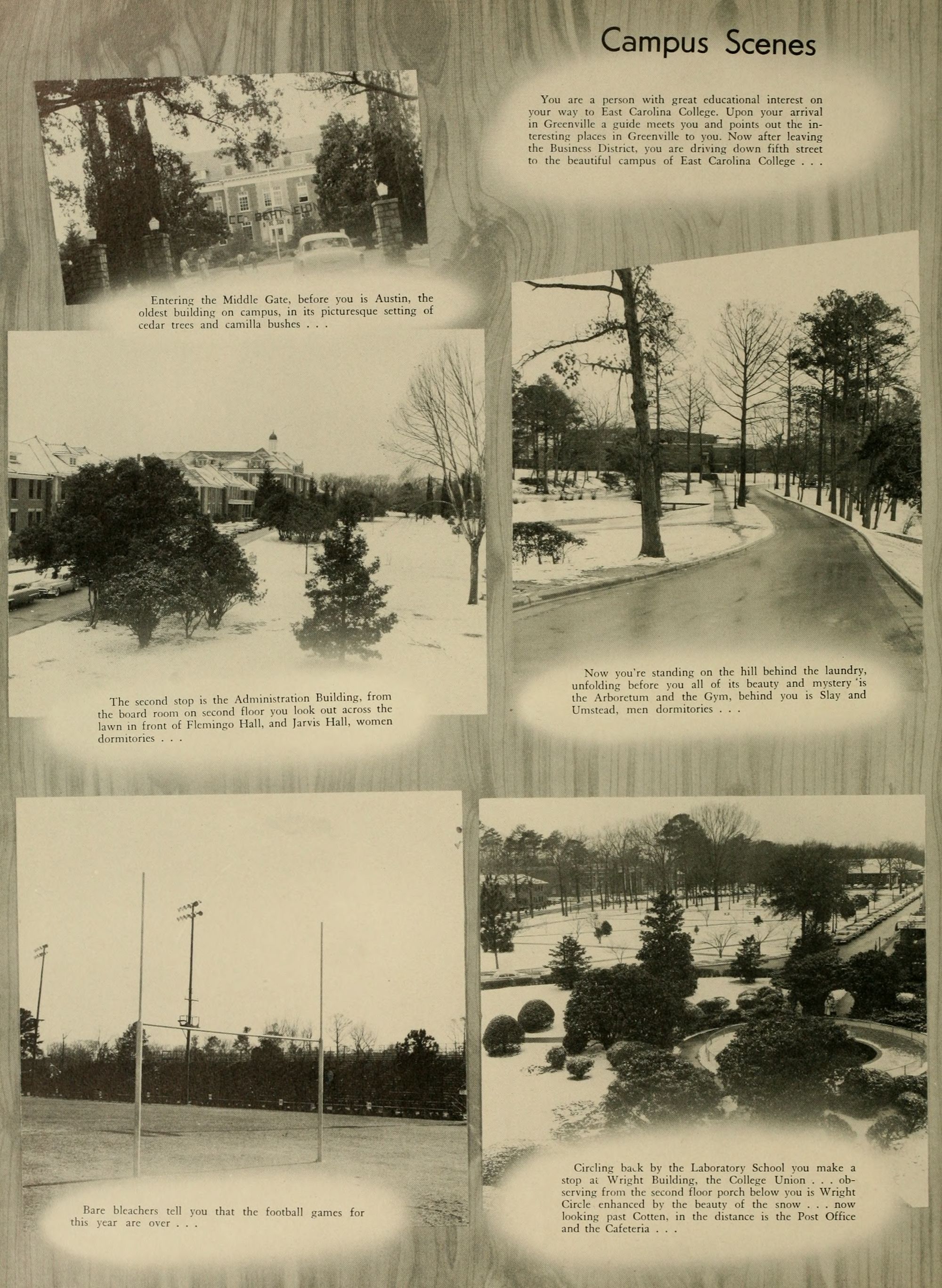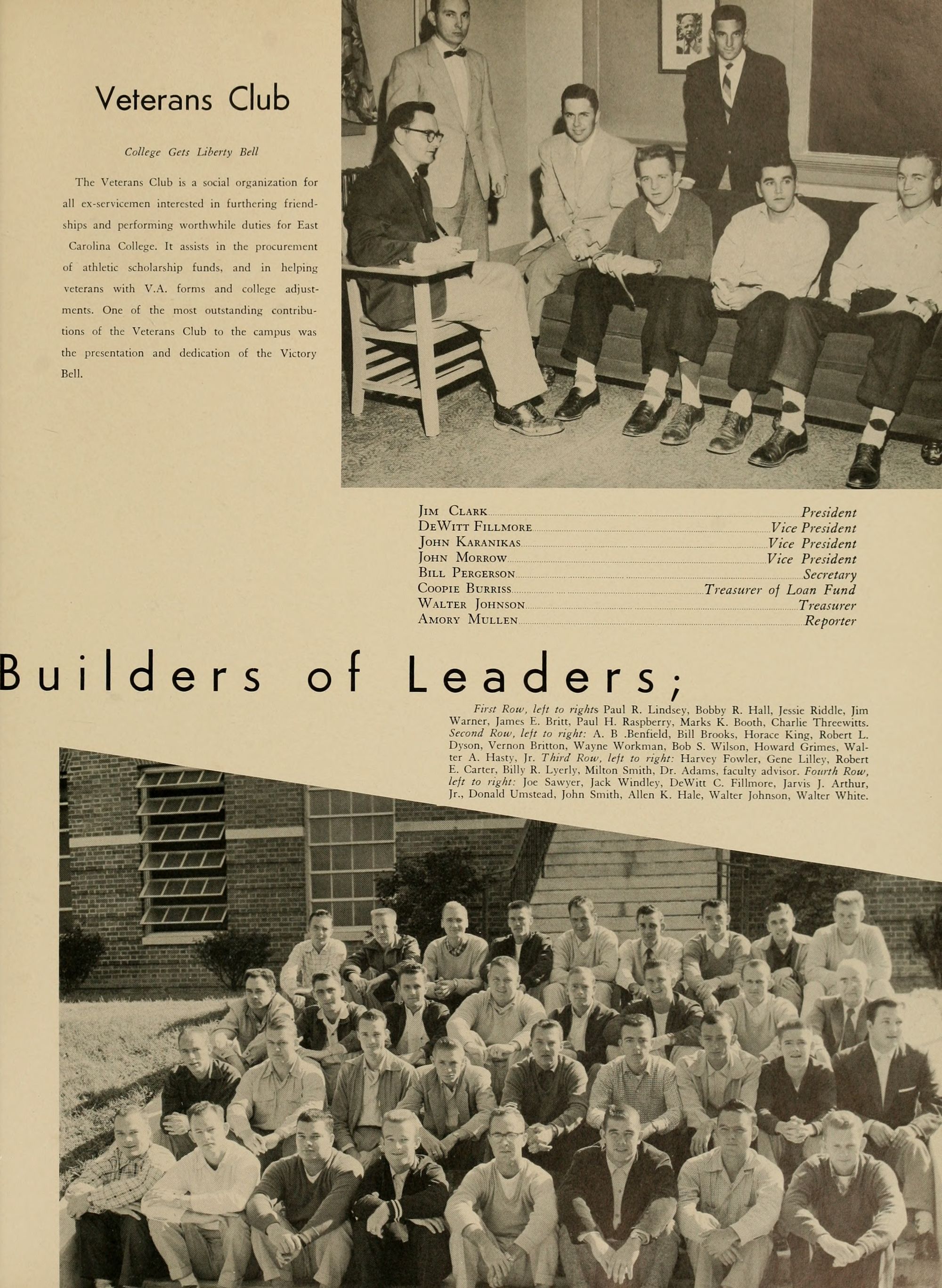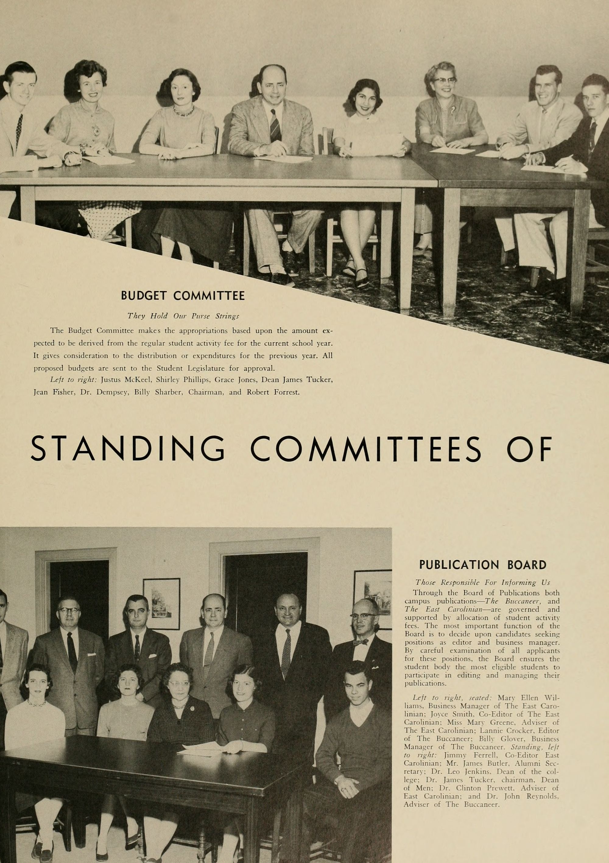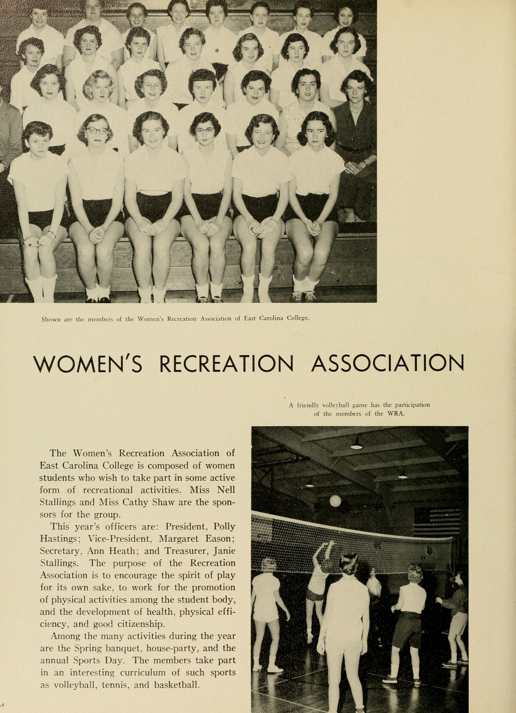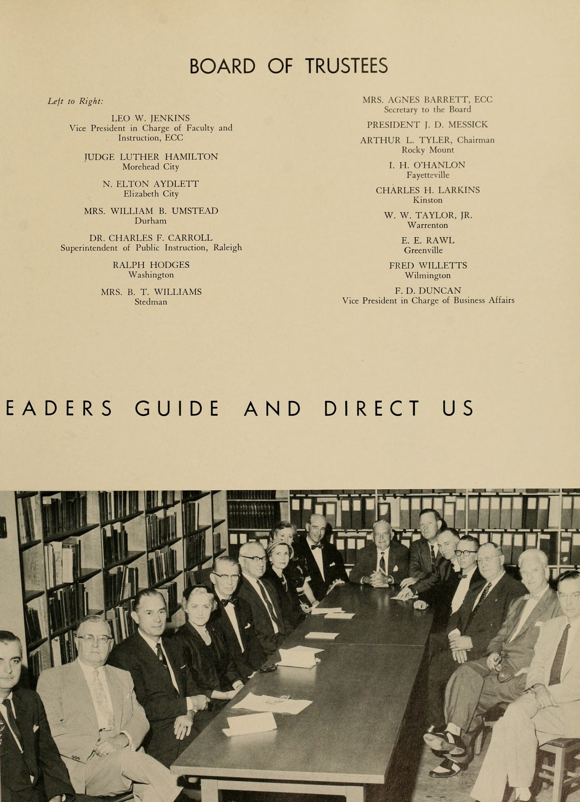 The spirit of EAST CAROLINA results from the spontaneous expression of social, educa-tional, spiritual, and sportsmanship activities of the college students, as they work toward the double goal of adulthood and graduation. In college a student finds a wide selection of cultural and social opportunities which are correlated with the curriculum. While living with contemporaries, college students estab-lish for themselves a set of values and learn to select the best from life with an aim toward living it. Graduation is the culmination of a successful college life; the student emerges into his place in the world, equipped with the best upon which to build a worthy life.