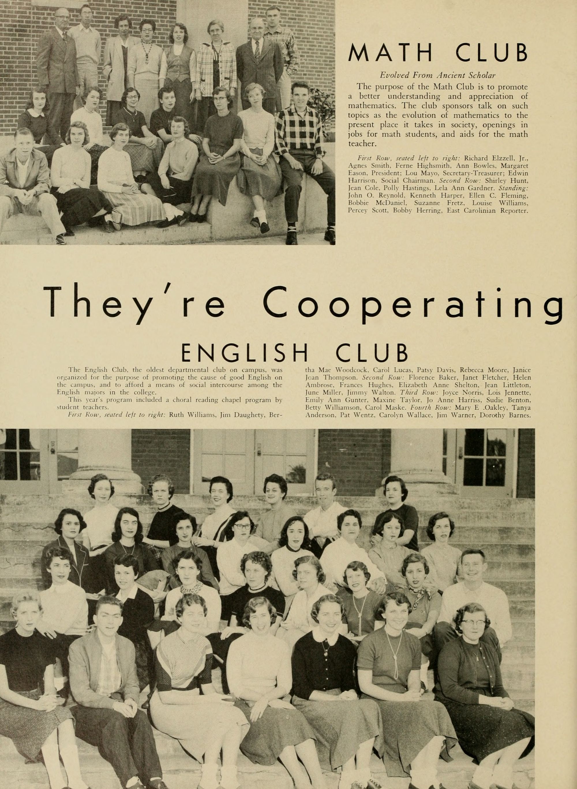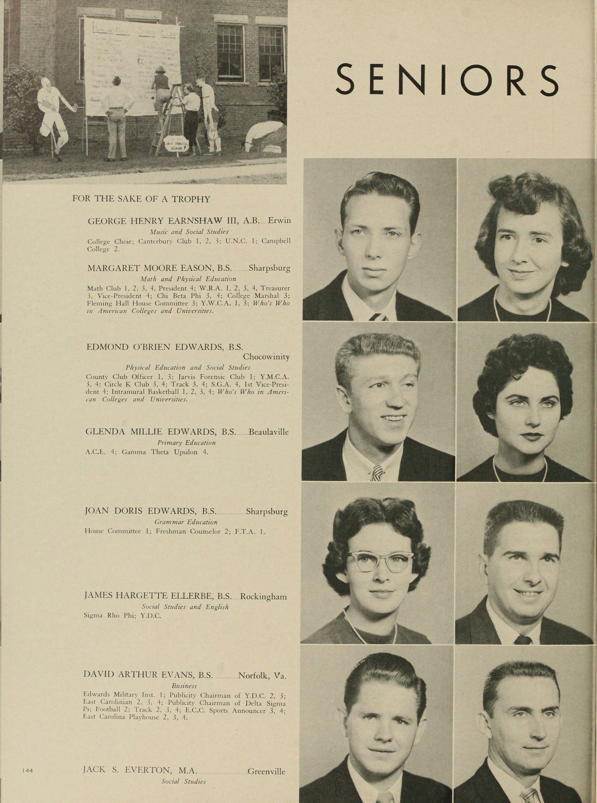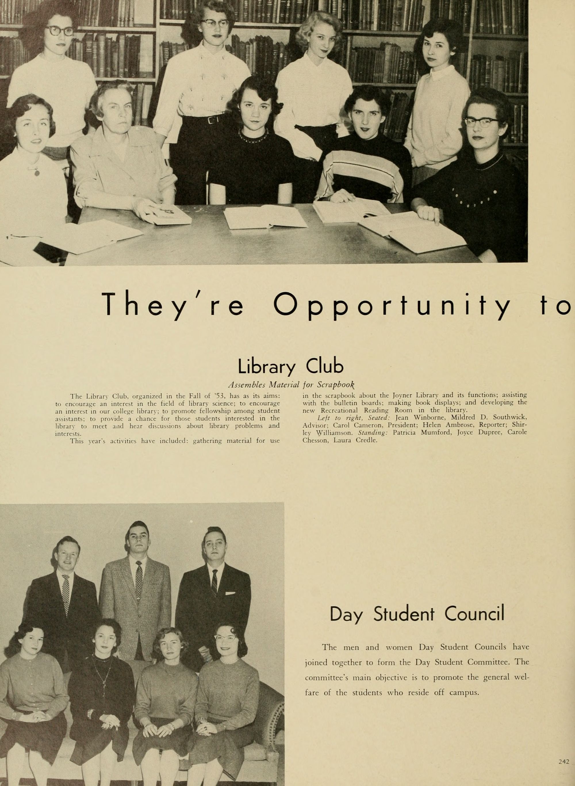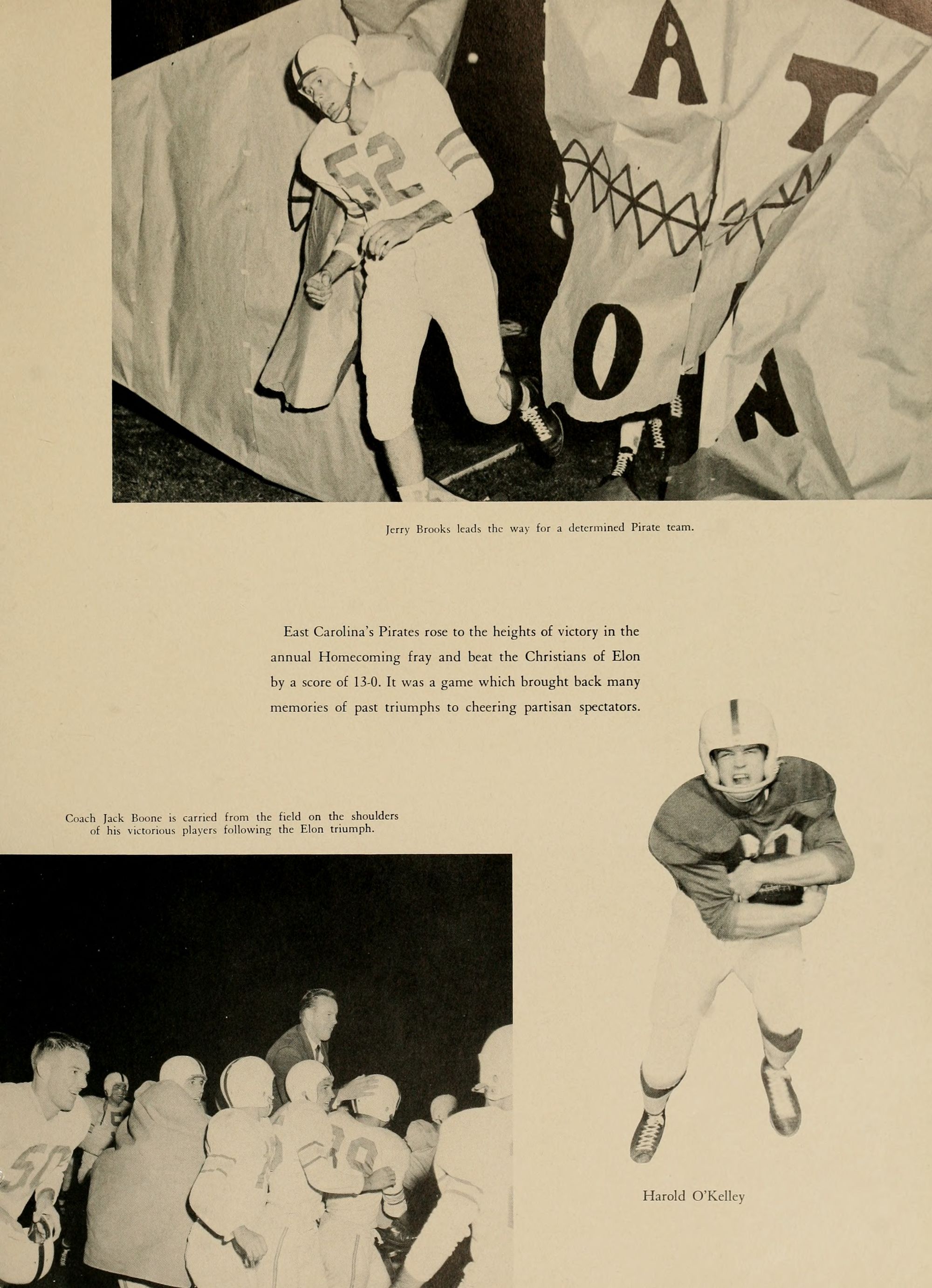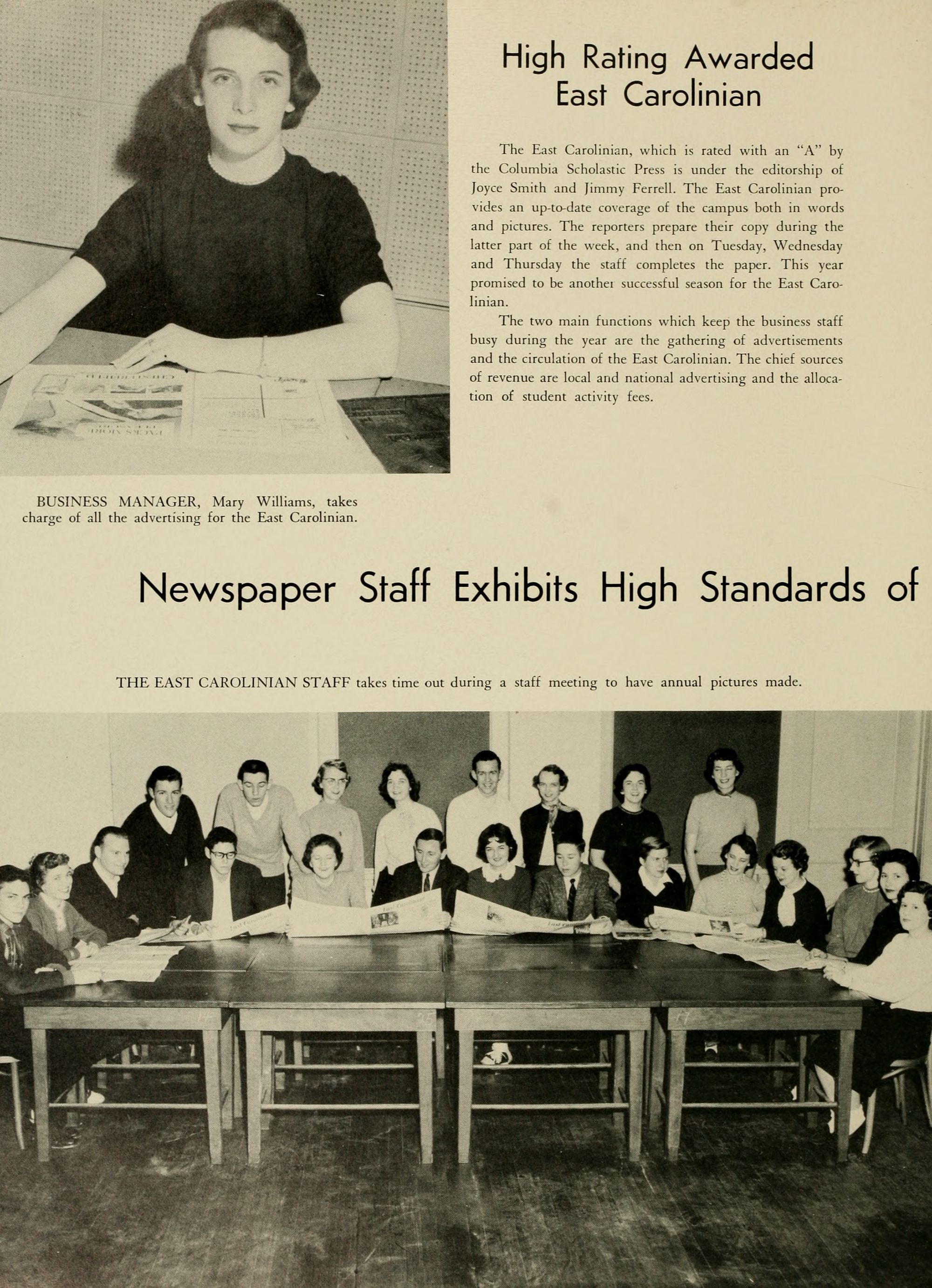 The spirit of EAST CAROLINA results from the spontaneous expression of social, educa-tional, spiritual, and sportsmanship activities of the college students, as they work toward the double goal of adulthood and graduation. In college a student finds a wide selection of cultural and social opportunities which are correlated with the curriculum. While living with contemporaries, college students estab-lish for themselves a set of values and learn to select the best from life with an aim toward living it. Graduation is the culmination of a successful college life; the student emerges into his place in the world, equipped with the best upon which to build a worthy life.