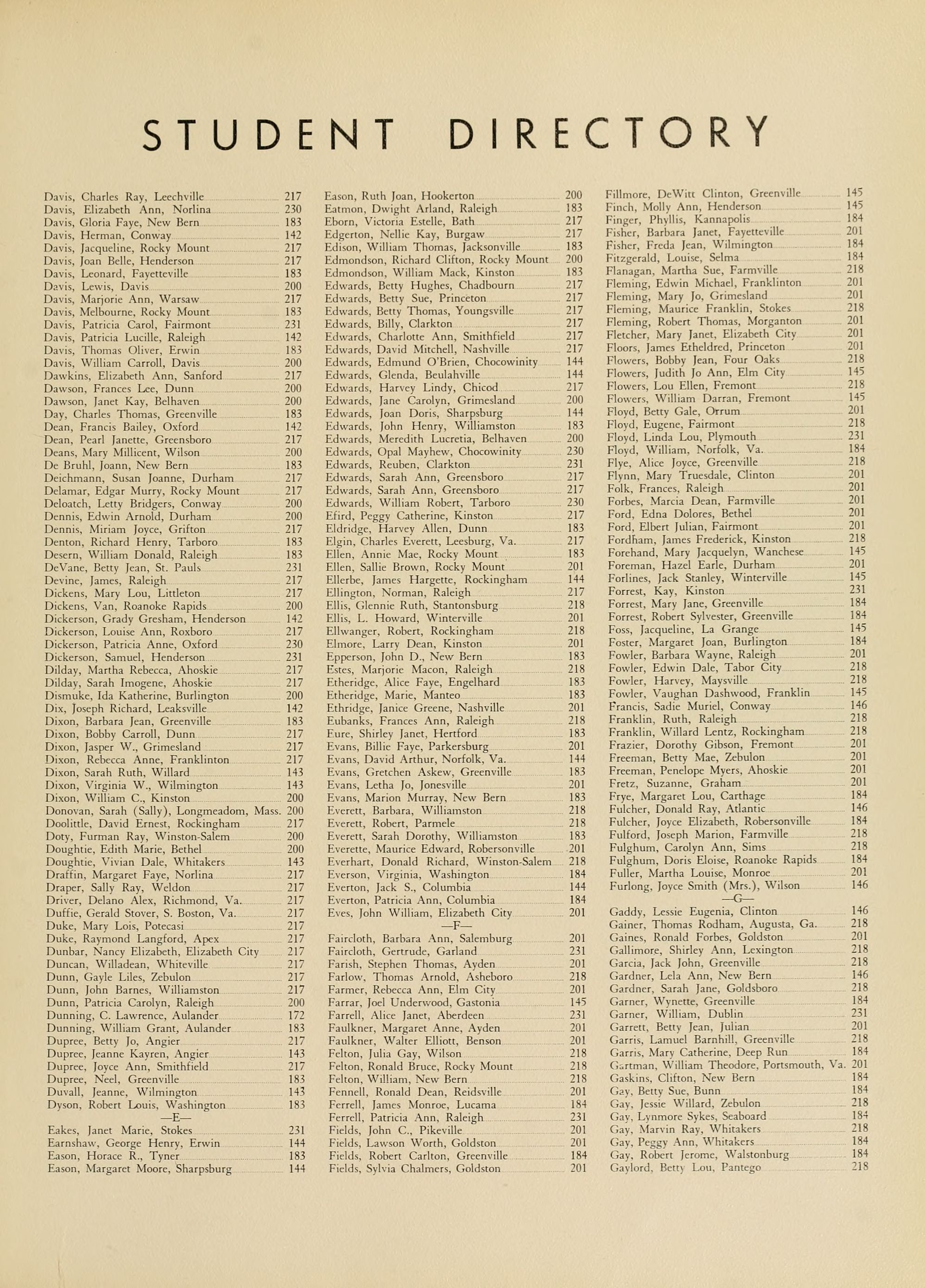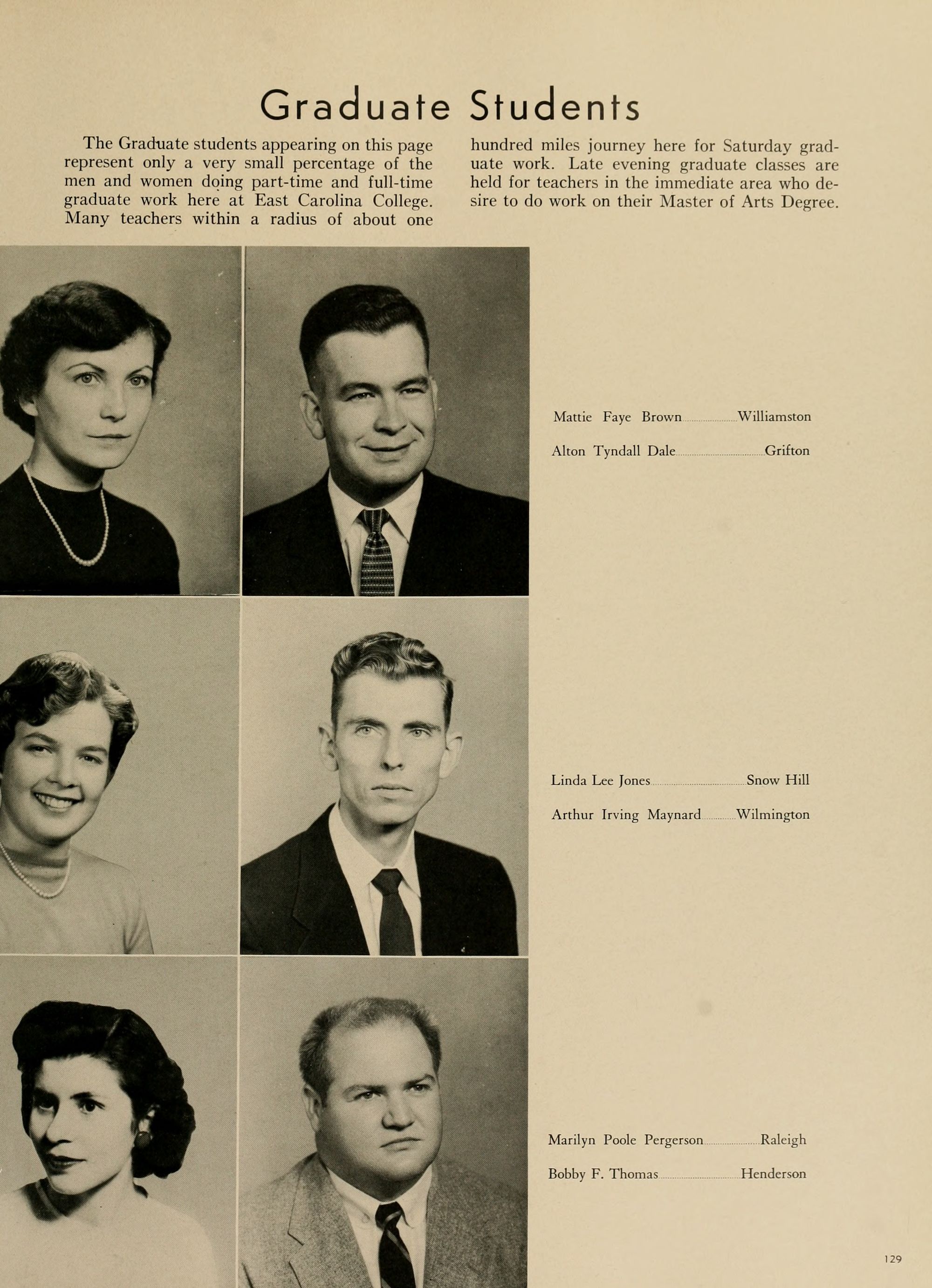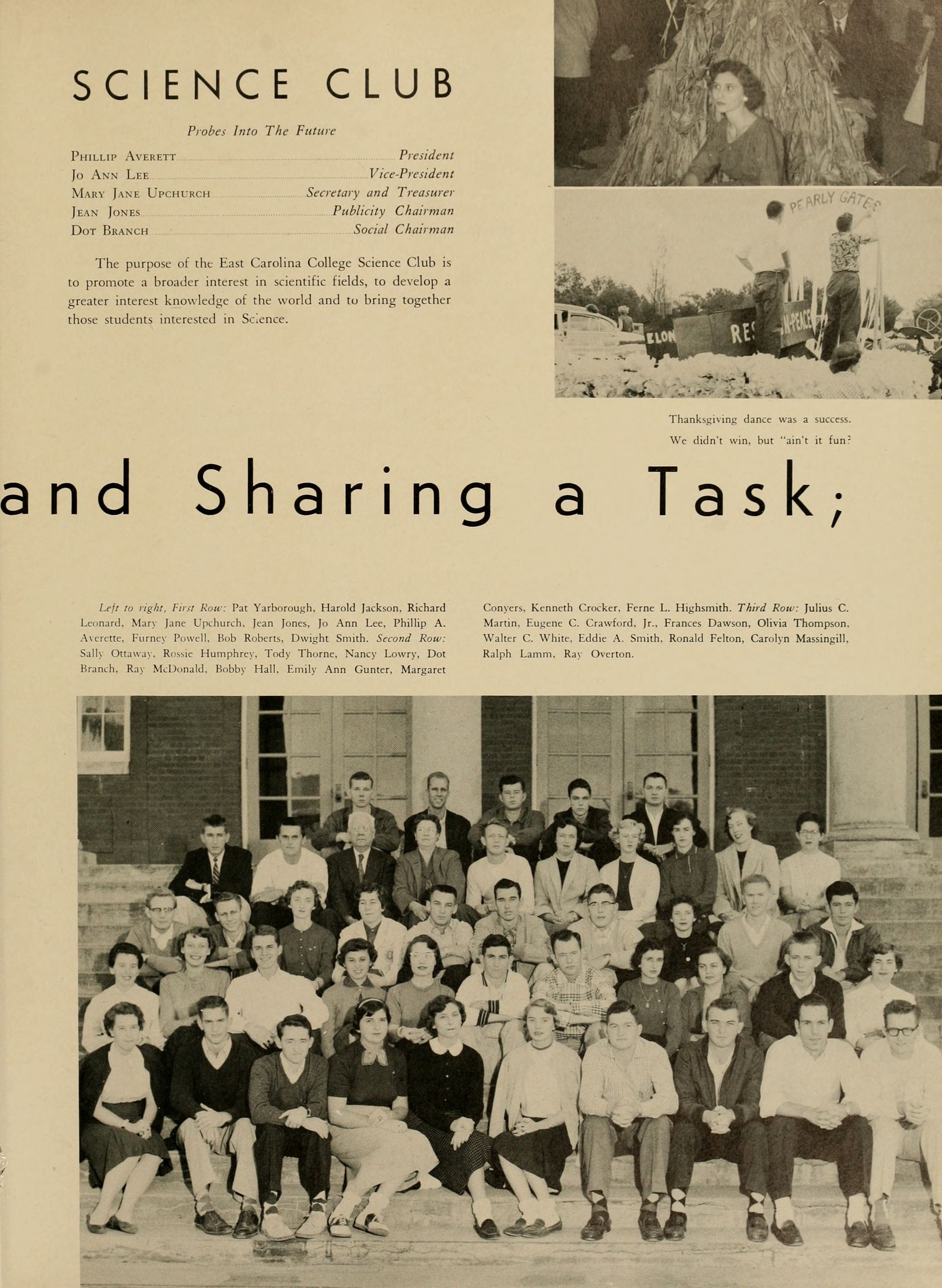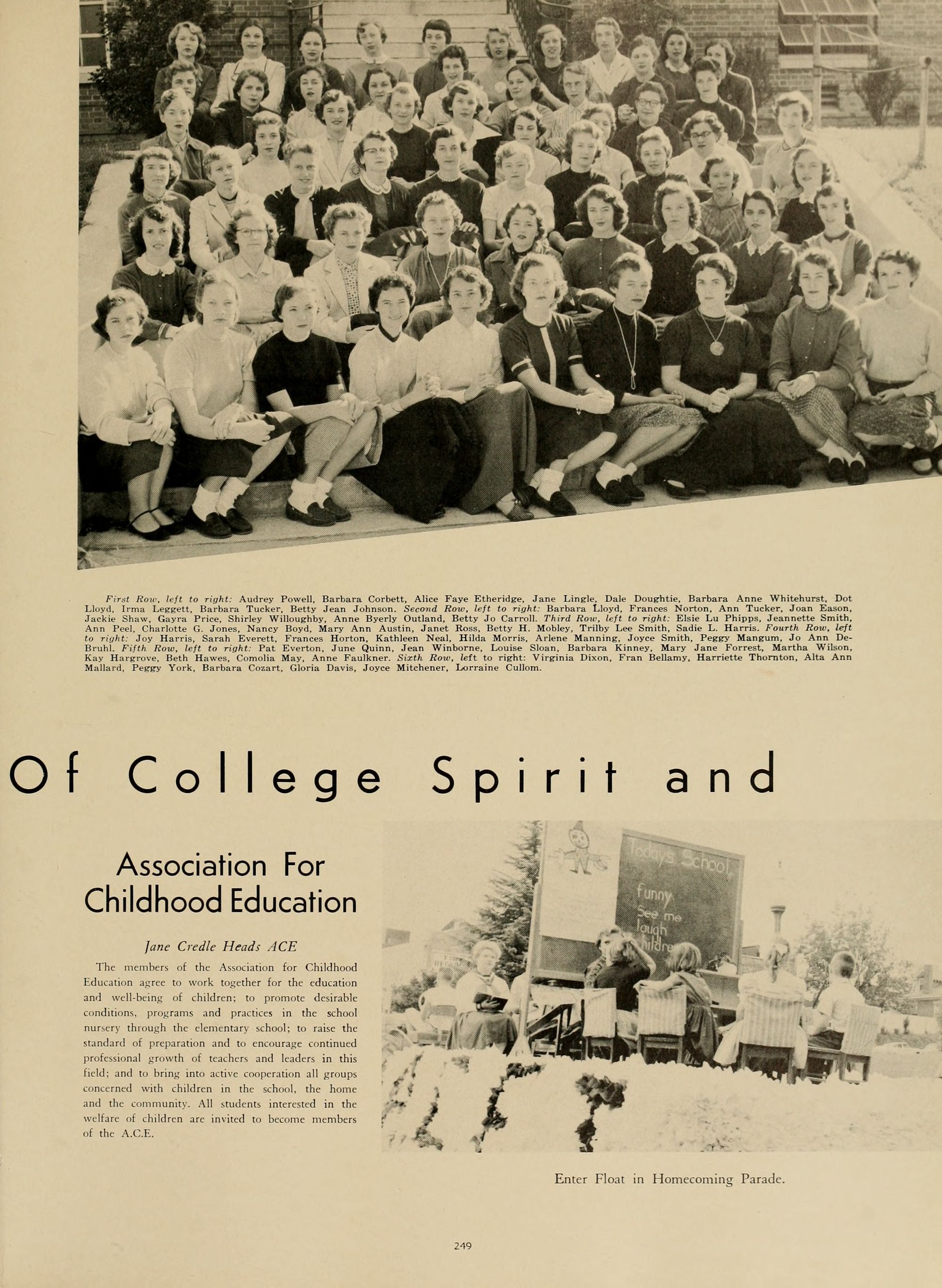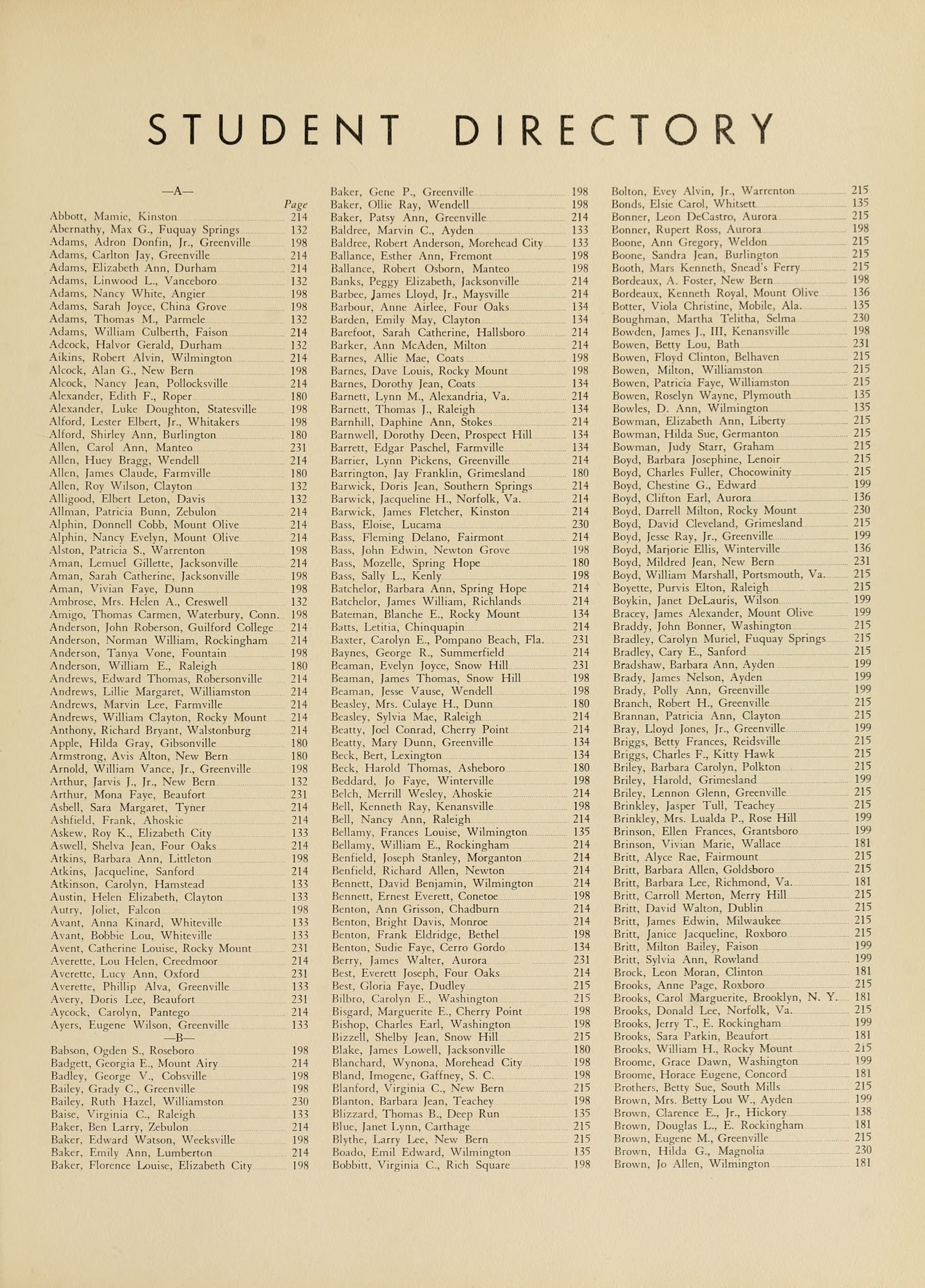 The spirit of EAST CAROLINA results from the spontaneous expression of social, educa-tional, spiritual, and sportsmanship activities of the college students, as they work toward the double goal of adulthood and graduation. In college a student finds a wide selection of cultural and social opportunities which are correlated with the curriculum. While living with contemporaries, college students estab-lish for themselves a set of values and learn to select the best from life with an aim toward living it. Graduation is the culmination of a successful college life; the student emerges into his place in the world, equipped with the best upon which to build a worthy life.