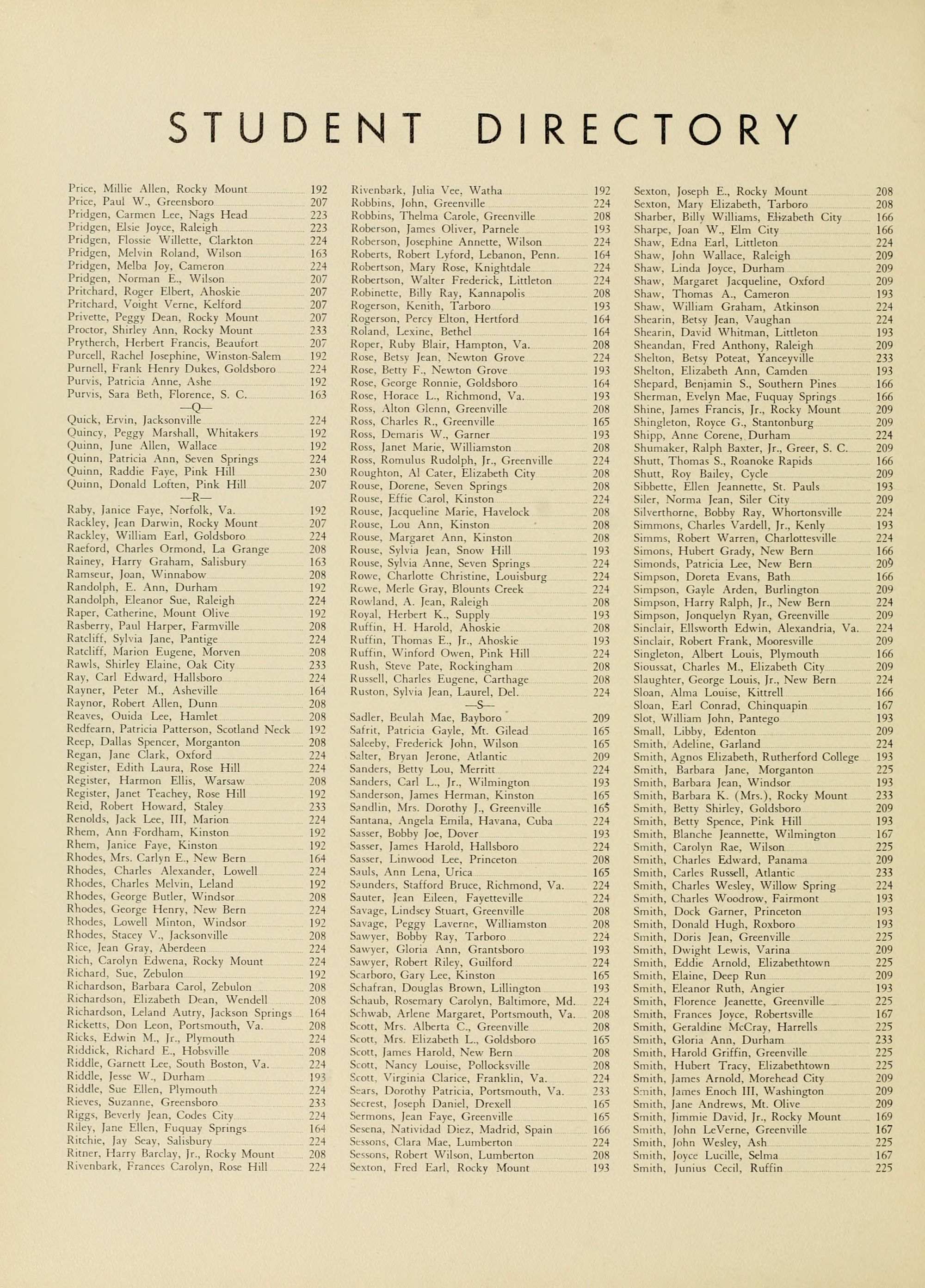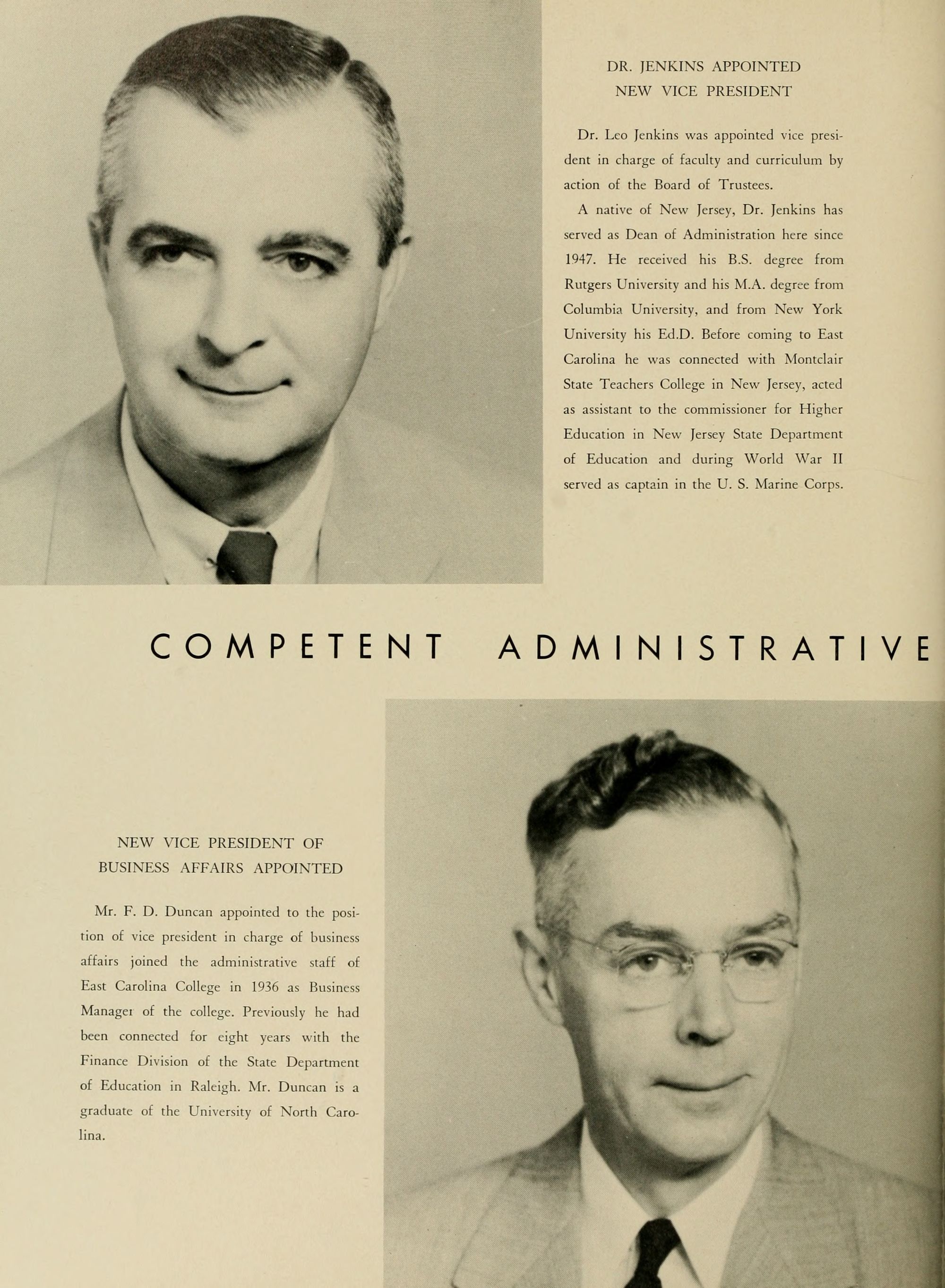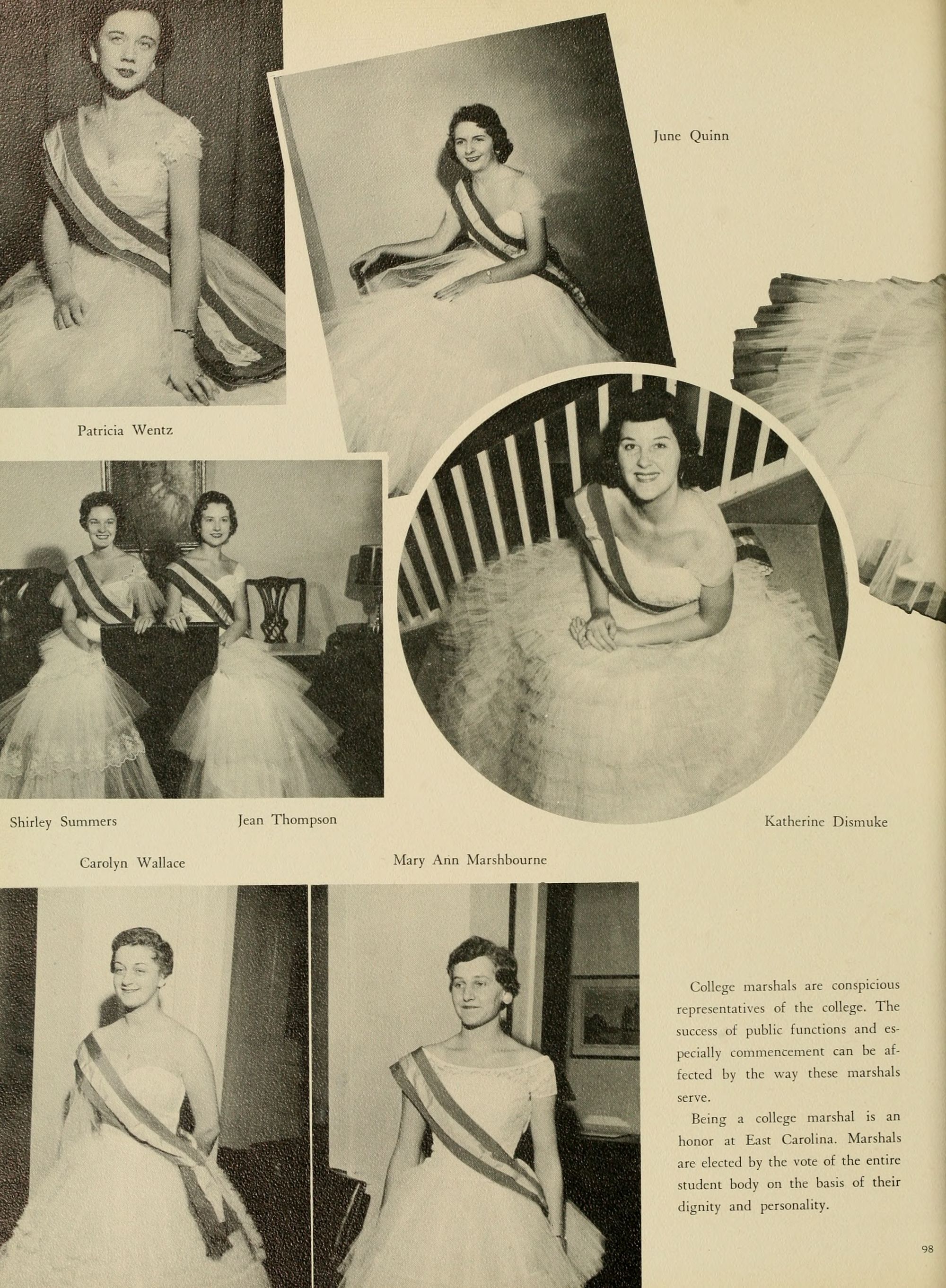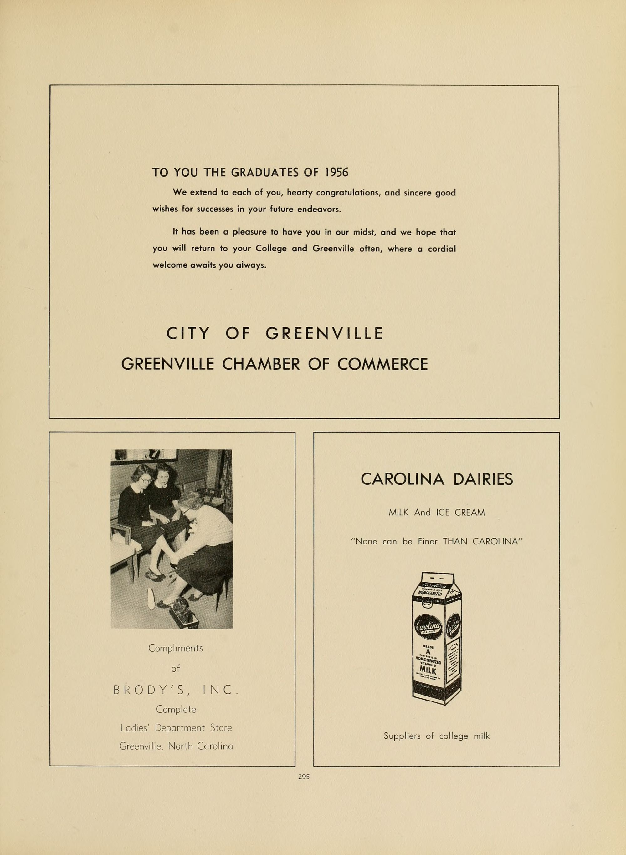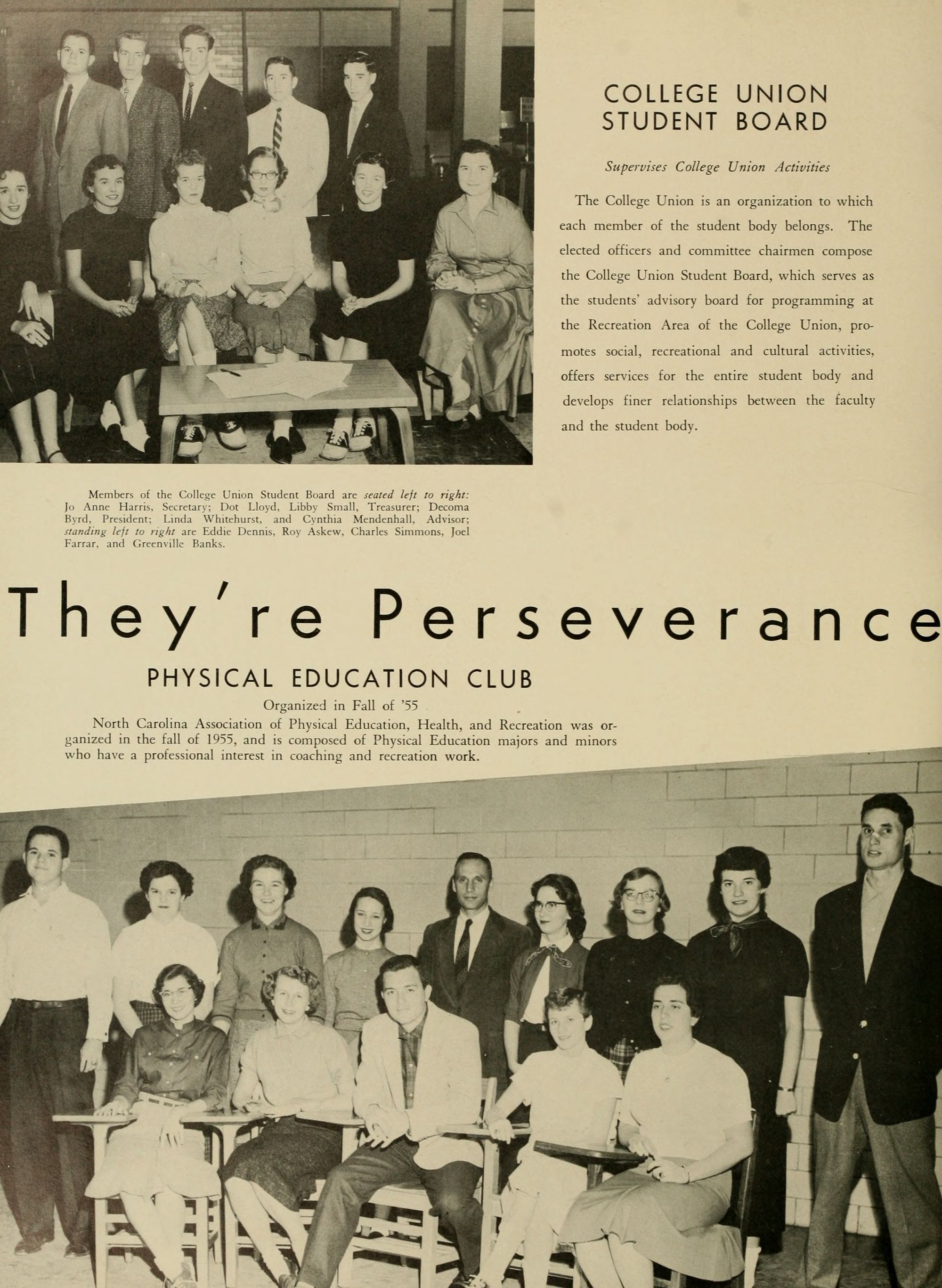 The spirit of EAST CAROLINA results from the spontaneous expression of social, educa-tional, spiritual, and sportsmanship activities of the college students, as they work toward the double goal of adulthood and graduation. In college a student finds a wide selection of cultural and social opportunities which are correlated with the curriculum. While living with contemporaries, college students estab-lish for themselves a set of values and learn to select the best from life with an aim toward living it. Graduation is the culmination of a successful college life; the student emerges into his place in the world, equipped with the best upon which to build a worthy life.