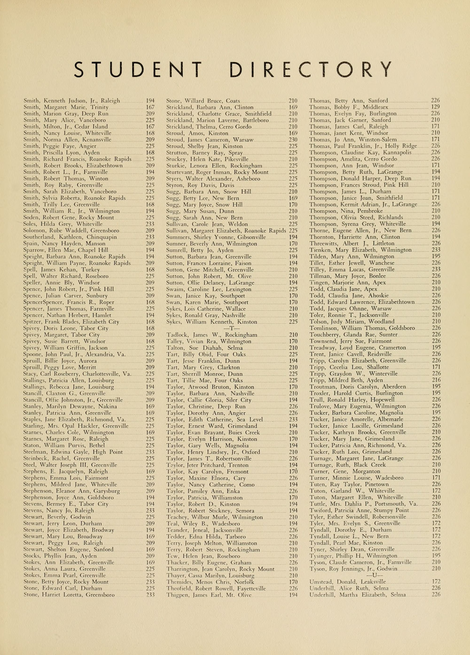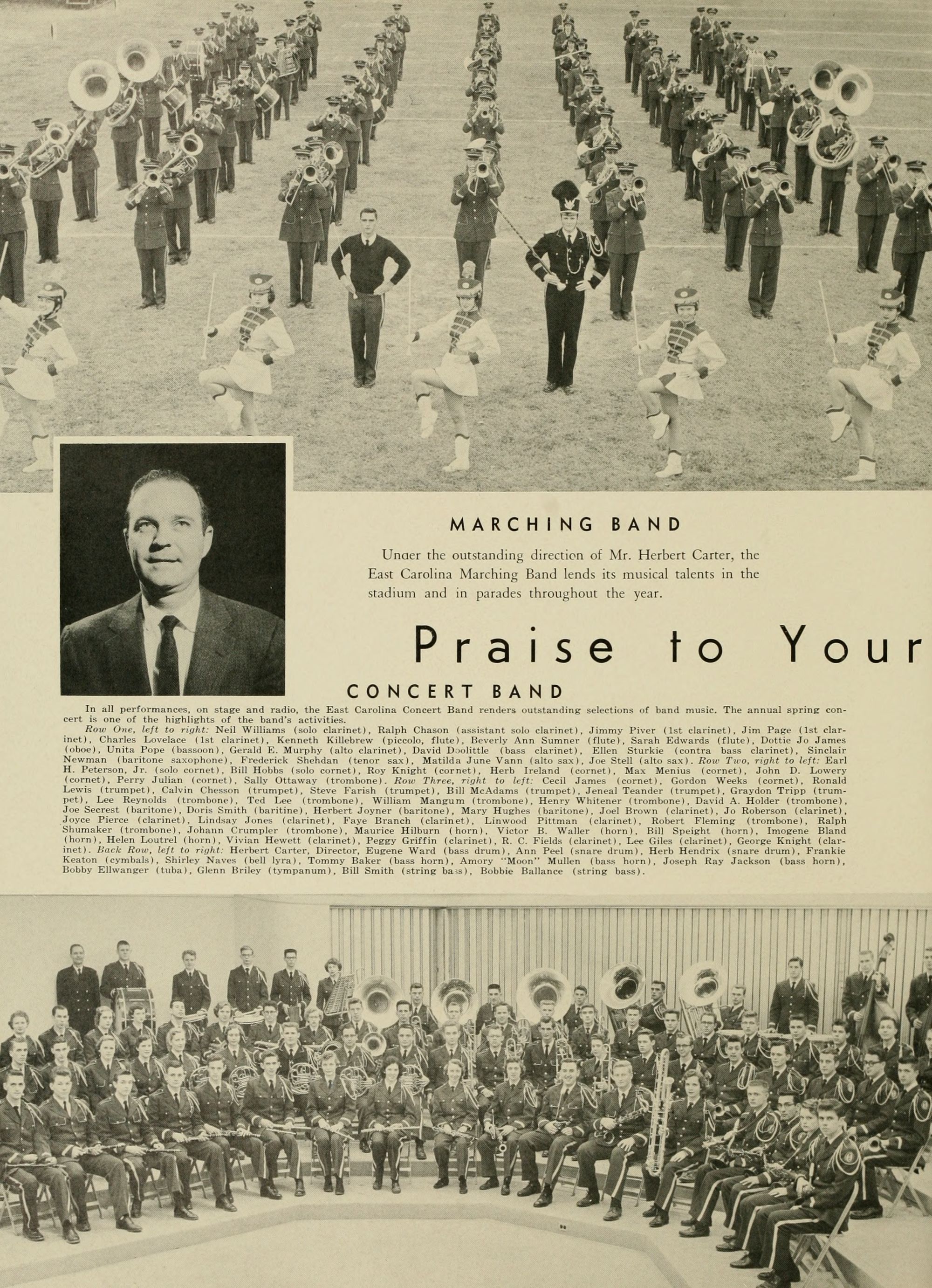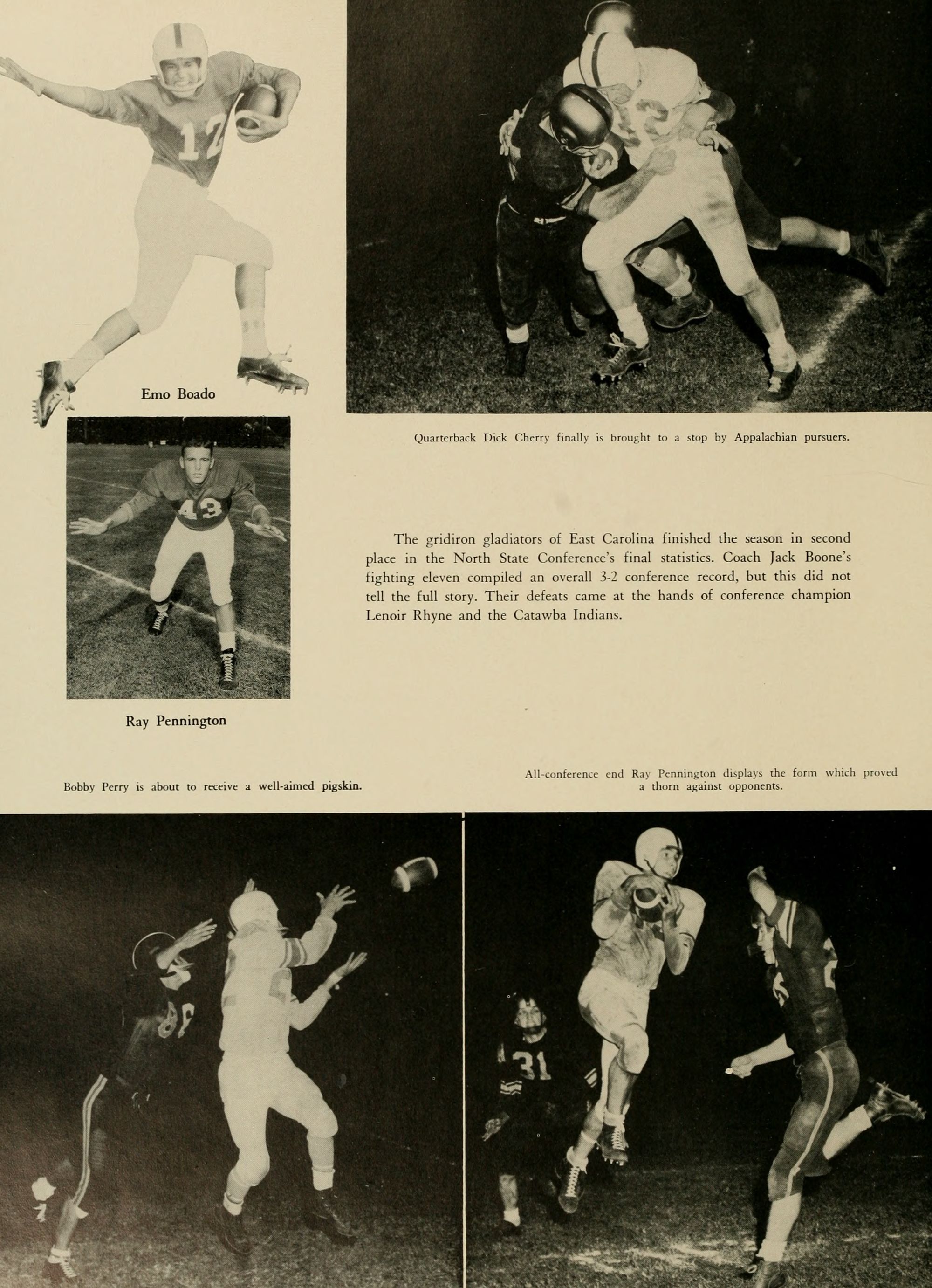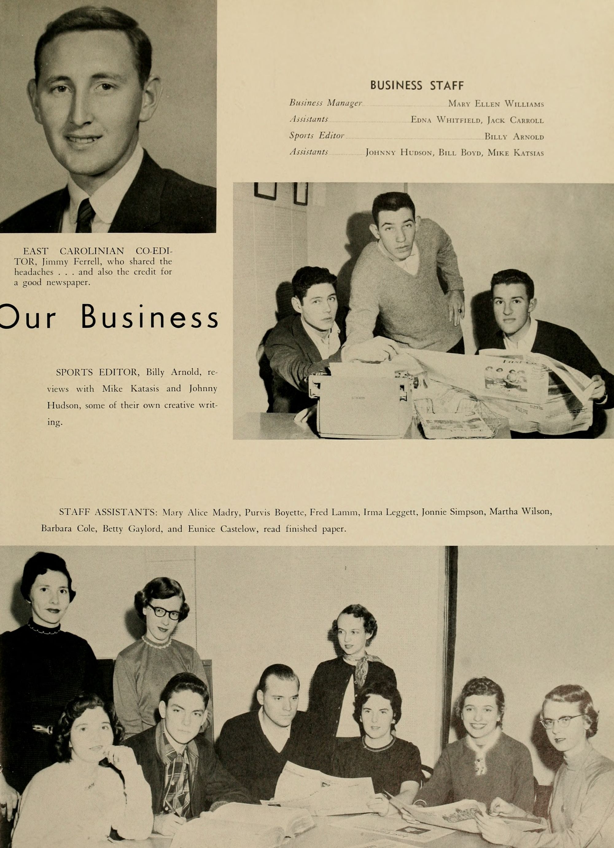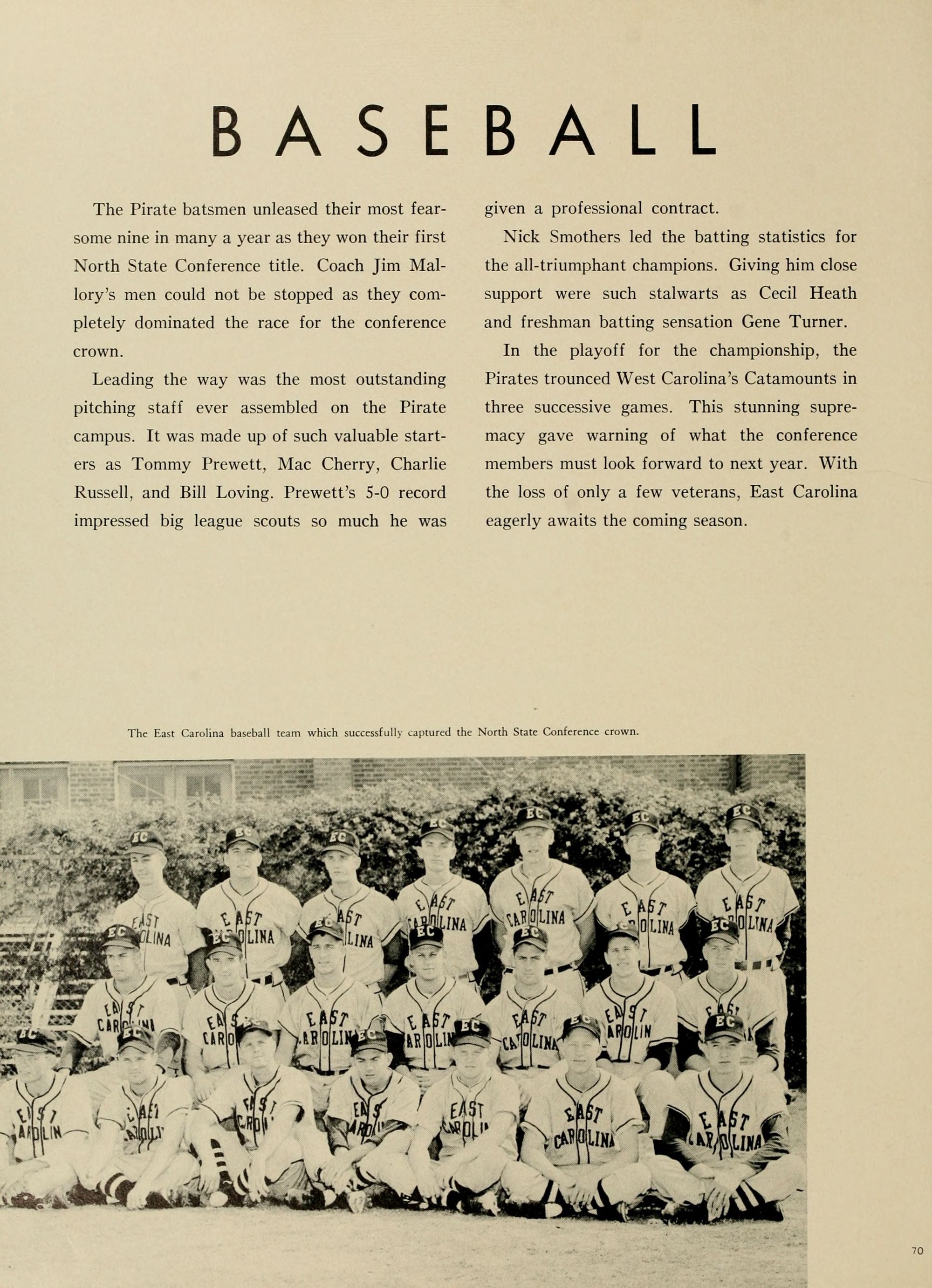 The spirit of EAST CAROLINA results from the spontaneous expression of social, educa-tional, spiritual, and sportsmanship activities of the college students, as they work toward the double goal of adulthood and graduation. In college a student finds a wide selection of cultural and social opportunities which are correlated with the curriculum. While living with contemporaries, college students estab-lish for themselves a set of values and learn to select the best from life with an aim toward living it. Graduation is the culmination of a successful college life; the student emerges into his place in the world, equipped with the best upon which to build a worthy life.