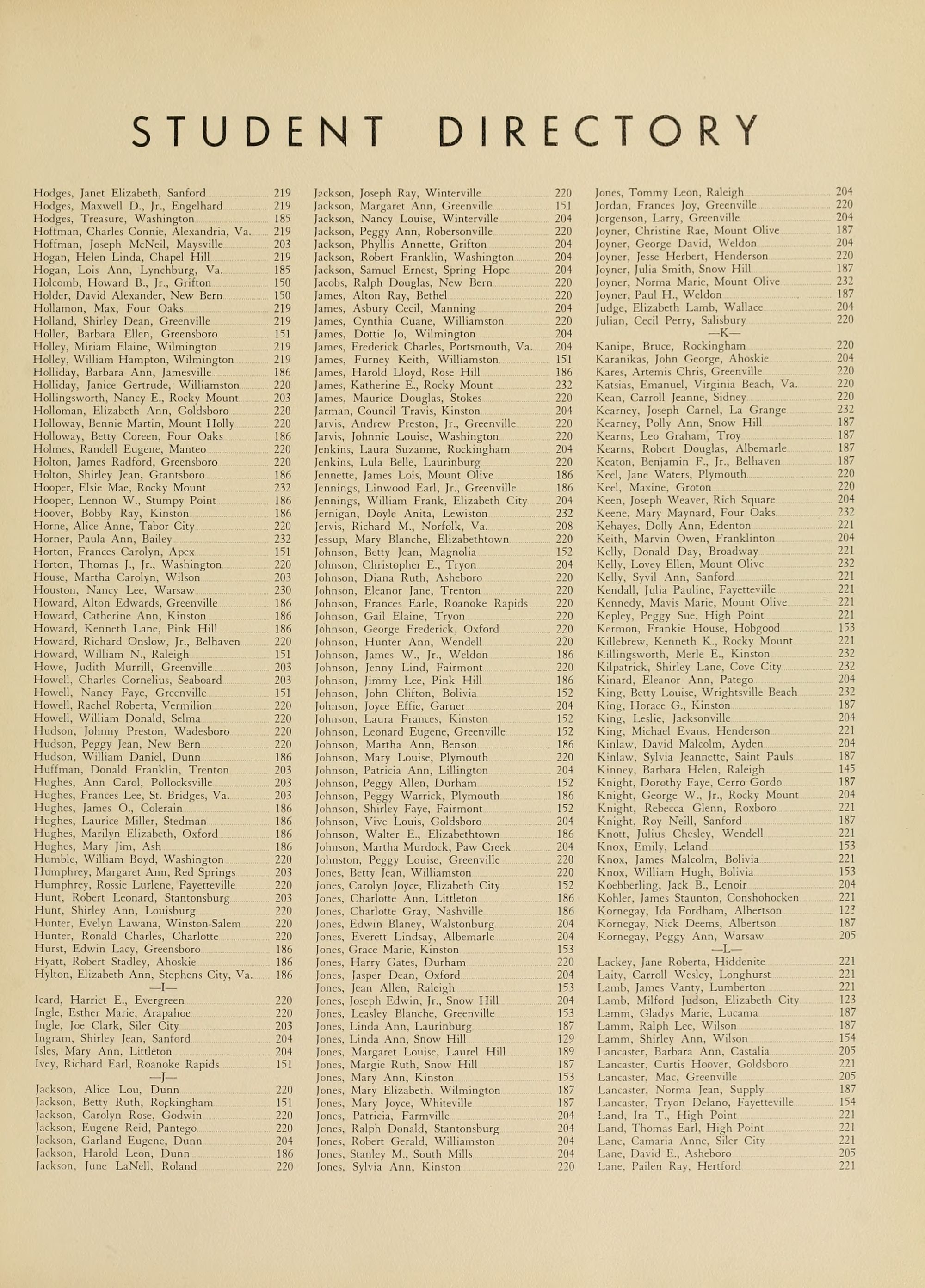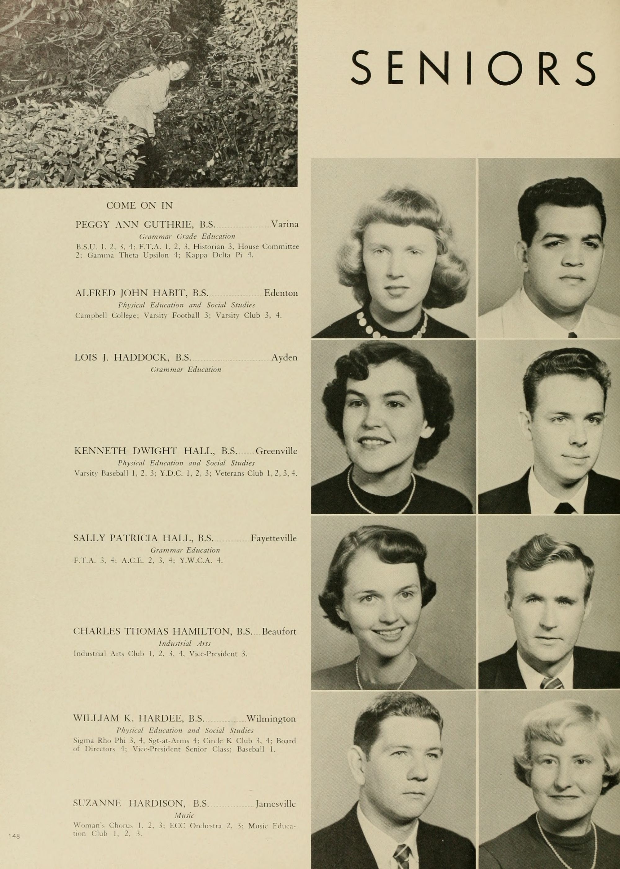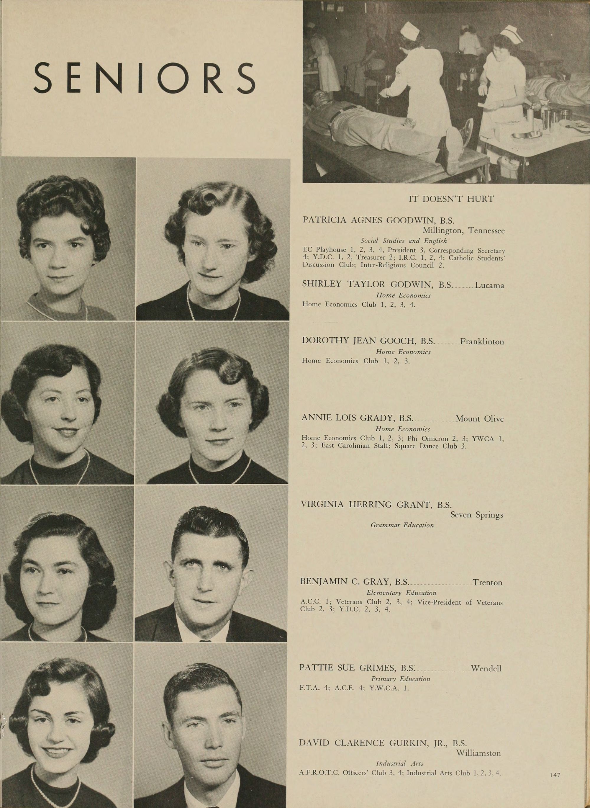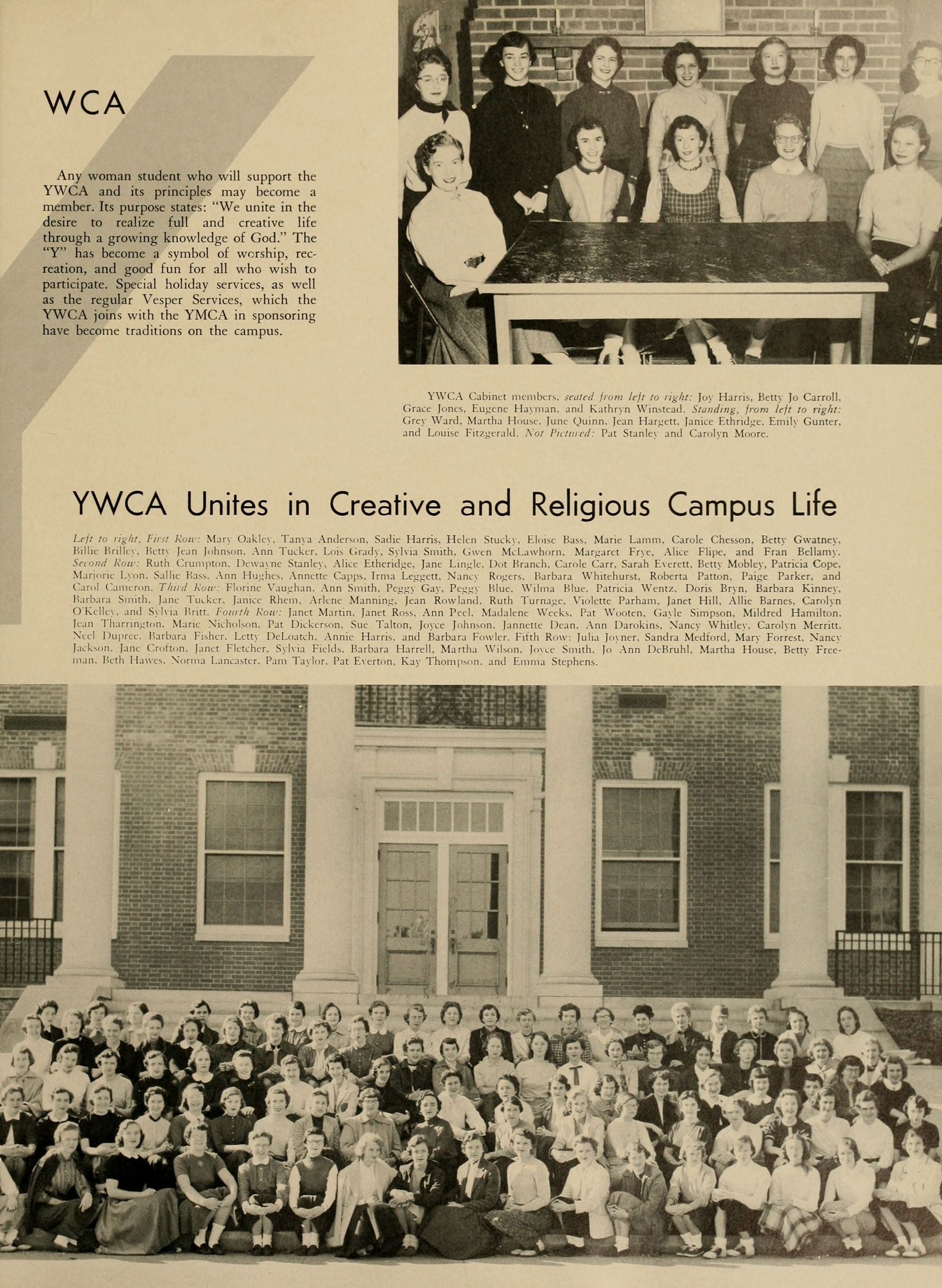 The spirit of EAST CAROLINA results from the spontaneous expression of social, educa-tional, spiritual, and sportsmanship activities of the college students, as they work toward the double goal of adulthood and graduation. In college a student finds a wide selection of cultural and social opportunities which are correlated with the curriculum. While living with contemporaries, college students estab-lish for themselves a set of values and learn to select the best from life with an aim toward living it. Graduation is the culmination of a successful college life; the student emerges into his place in the world, equipped with the best upon which to build a worthy life.