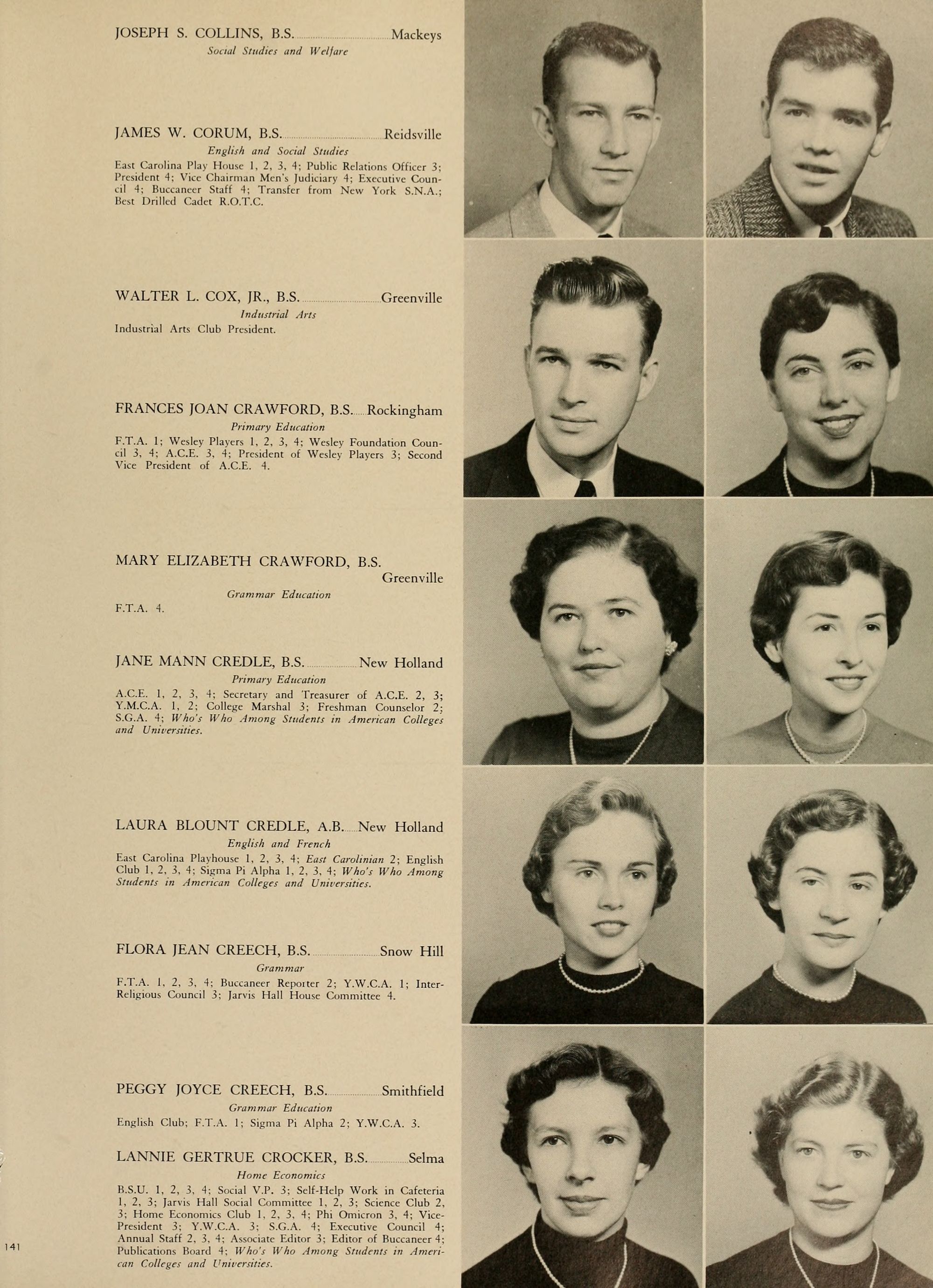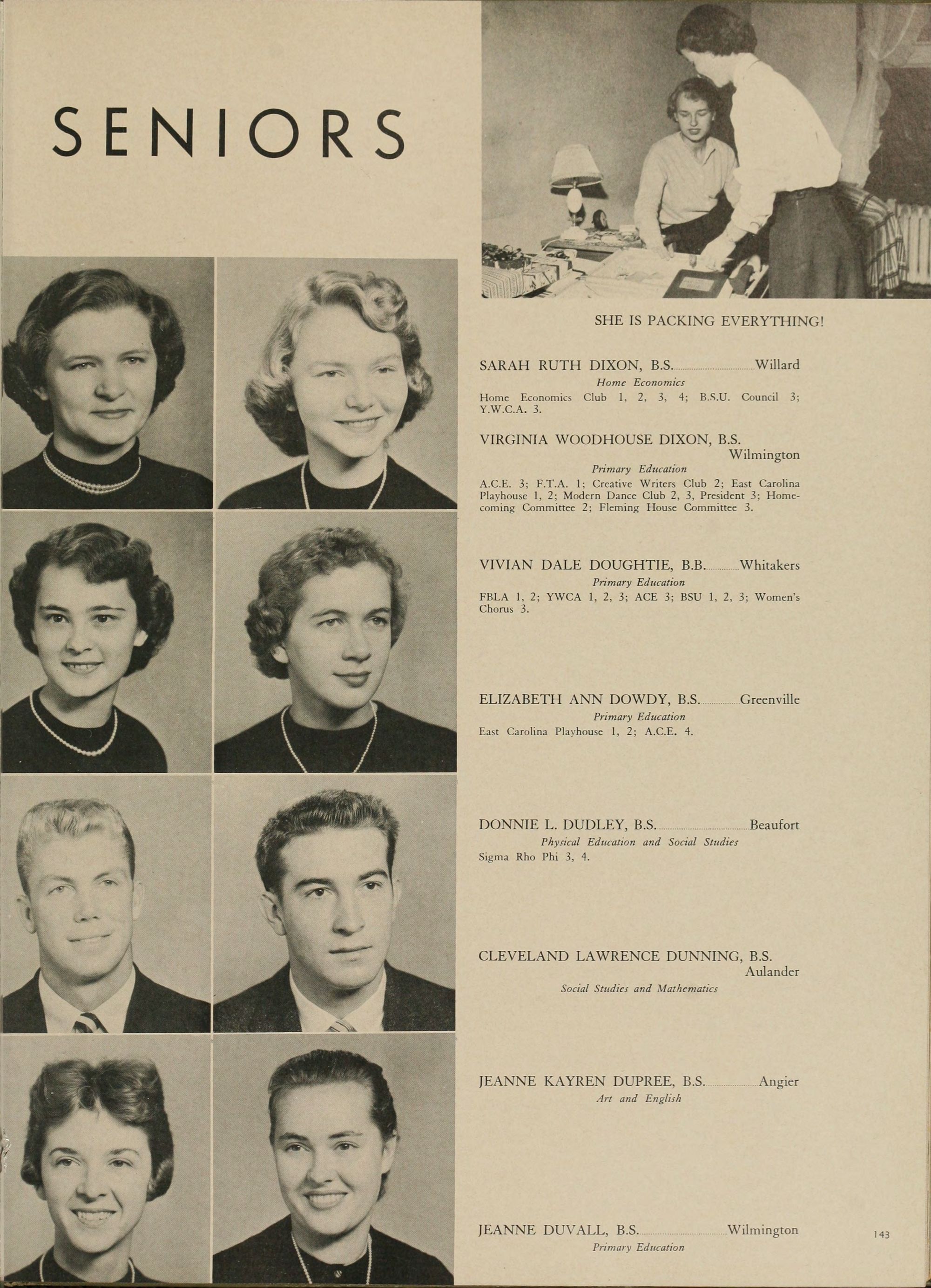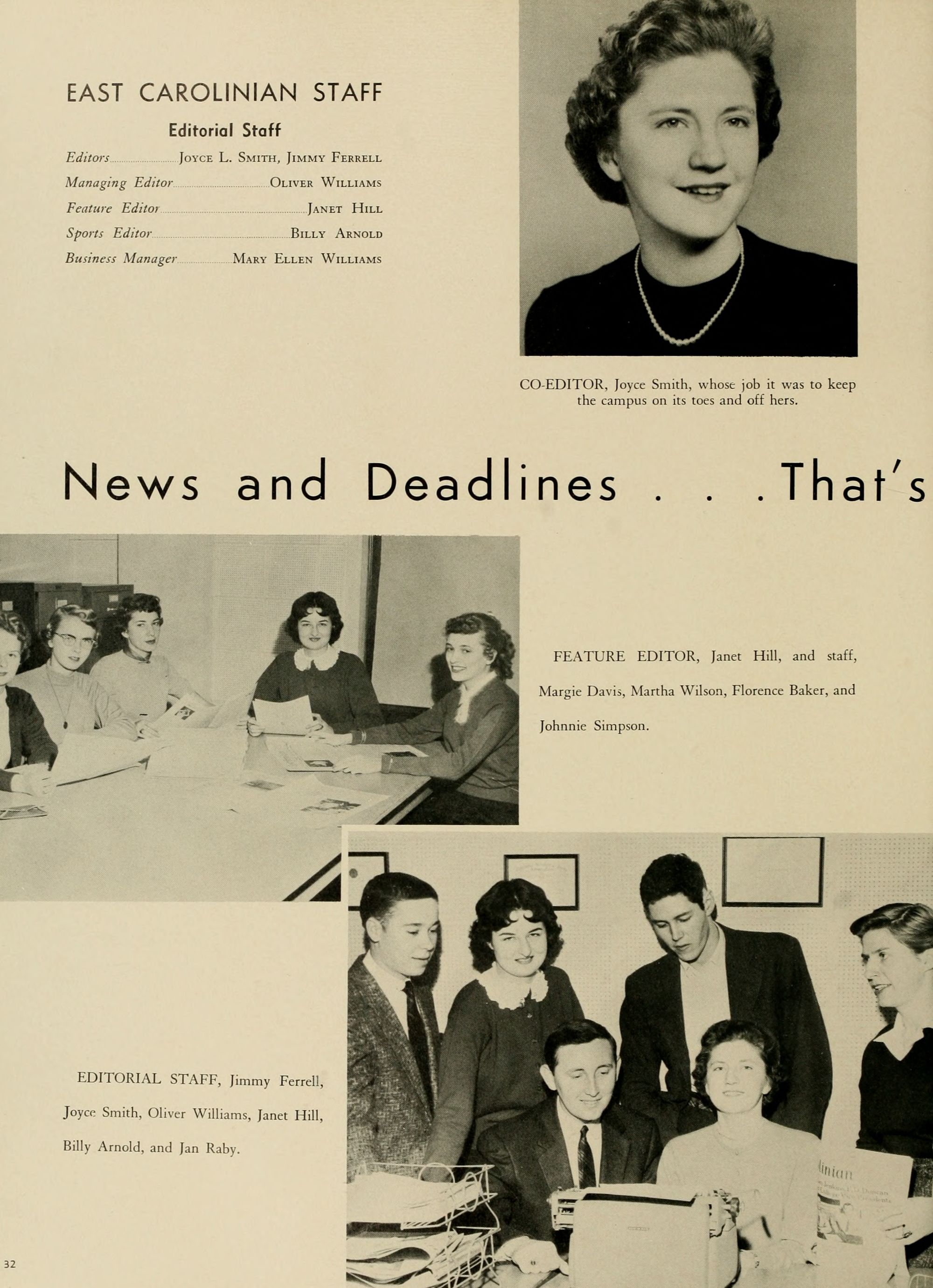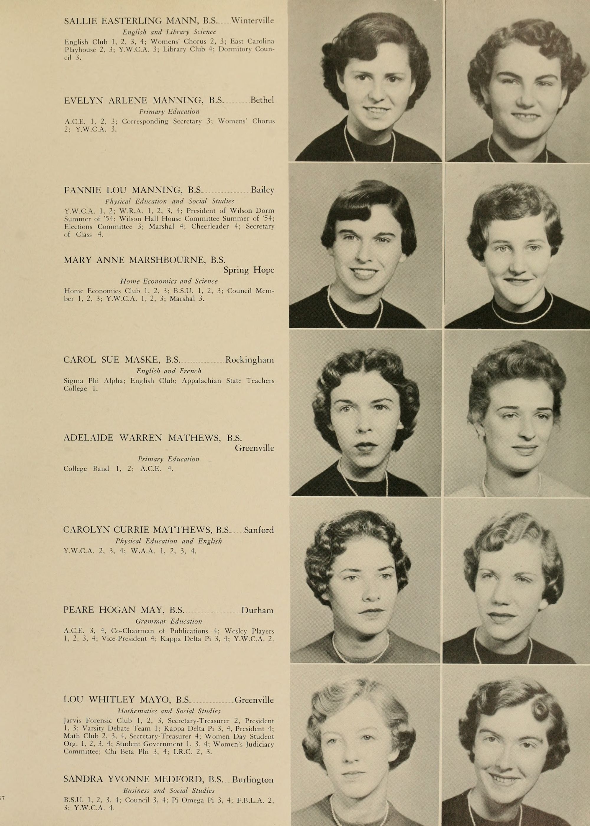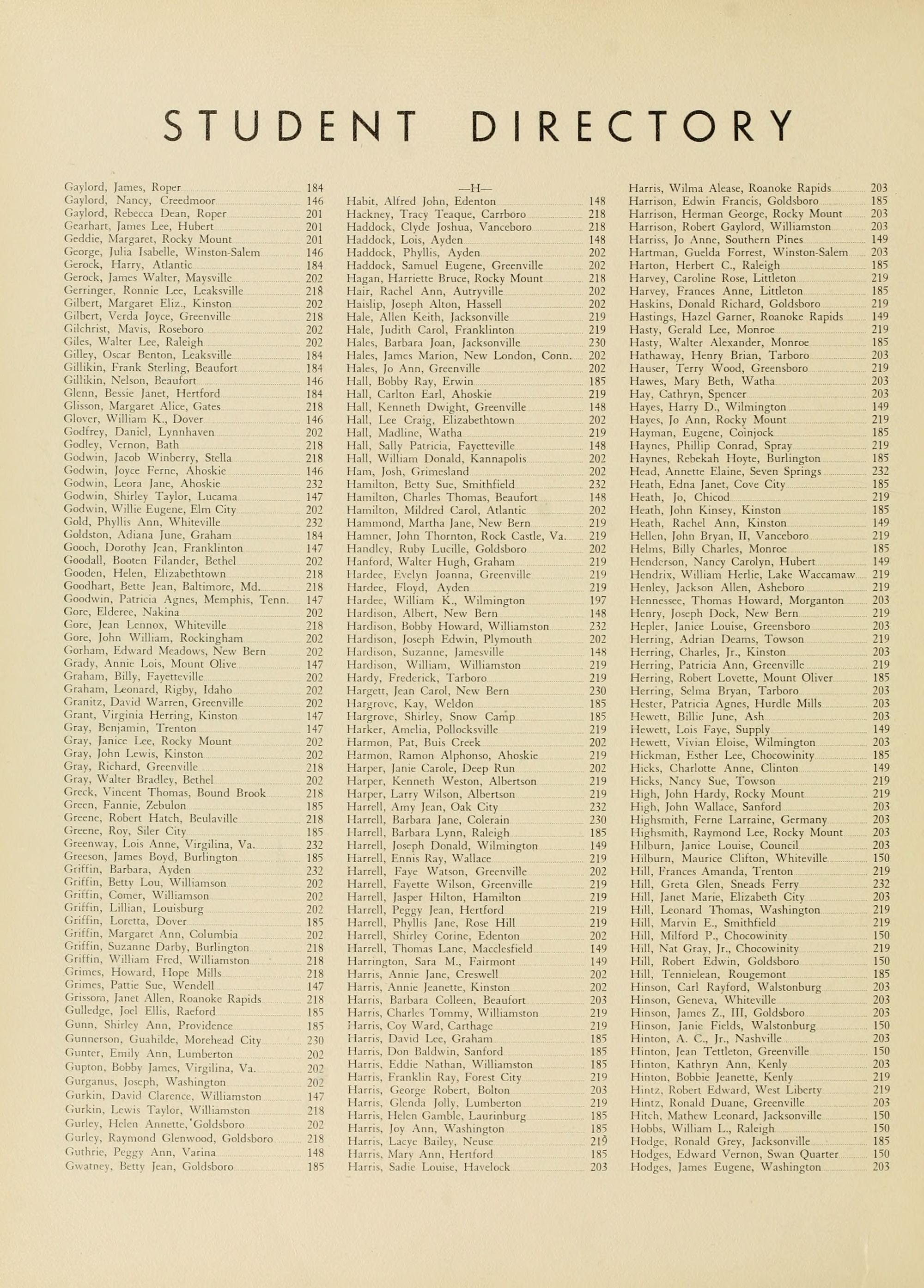 The spirit of EAST CAROLINA results from the spontaneous expression of social, educa-tional, spiritual, and sportsmanship activities of the college students, as they work toward the double goal of adulthood and graduation. In college a student finds a wide selection of cultural and social opportunities which are correlated with the curriculum. While living with contemporaries, college students estab-lish for themselves a set of values and learn to select the best from life with an aim toward living it. Graduation is the culmination of a successful college life; the student emerges into his place in the world, equipped with the best upon which to build a worthy life.