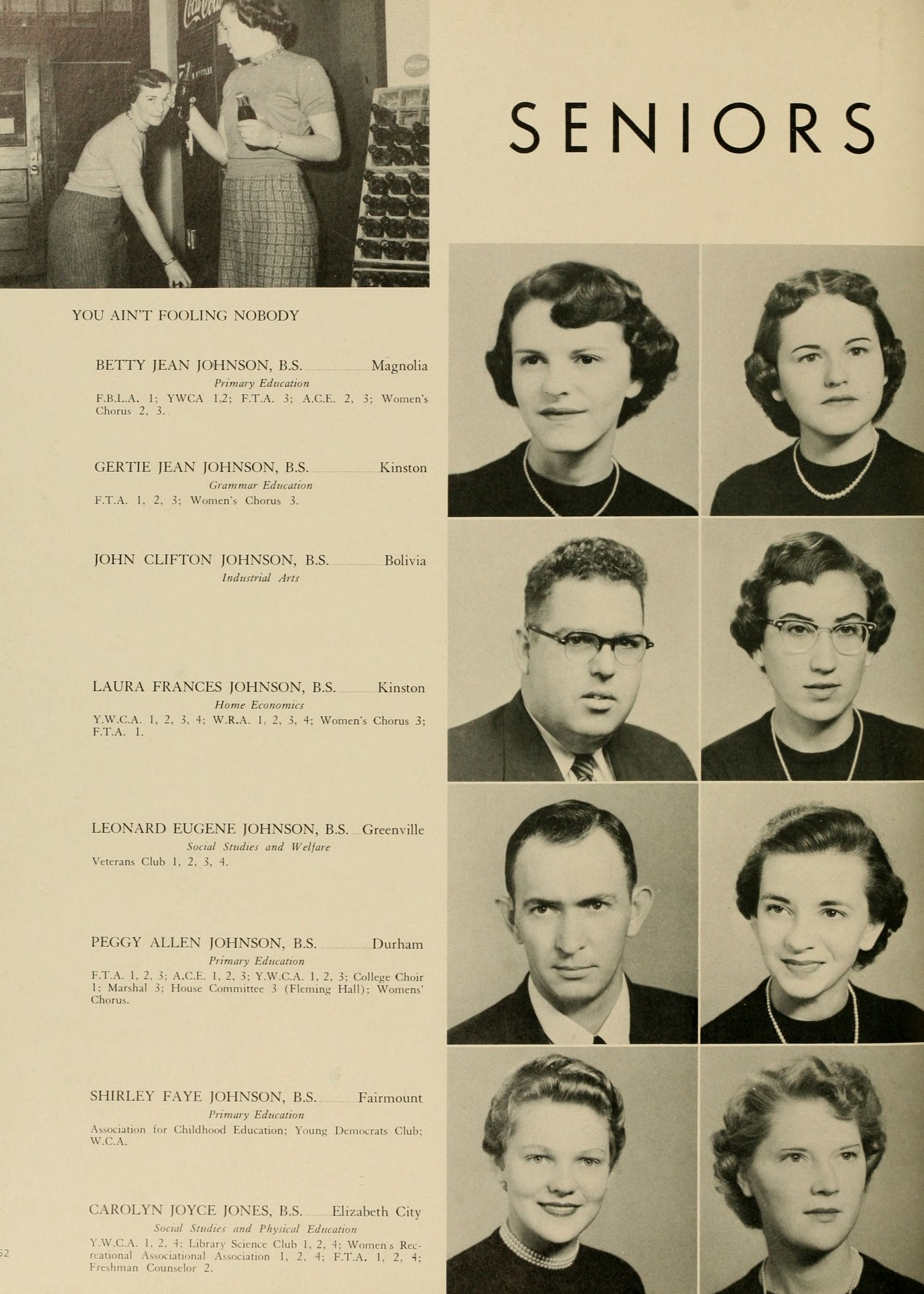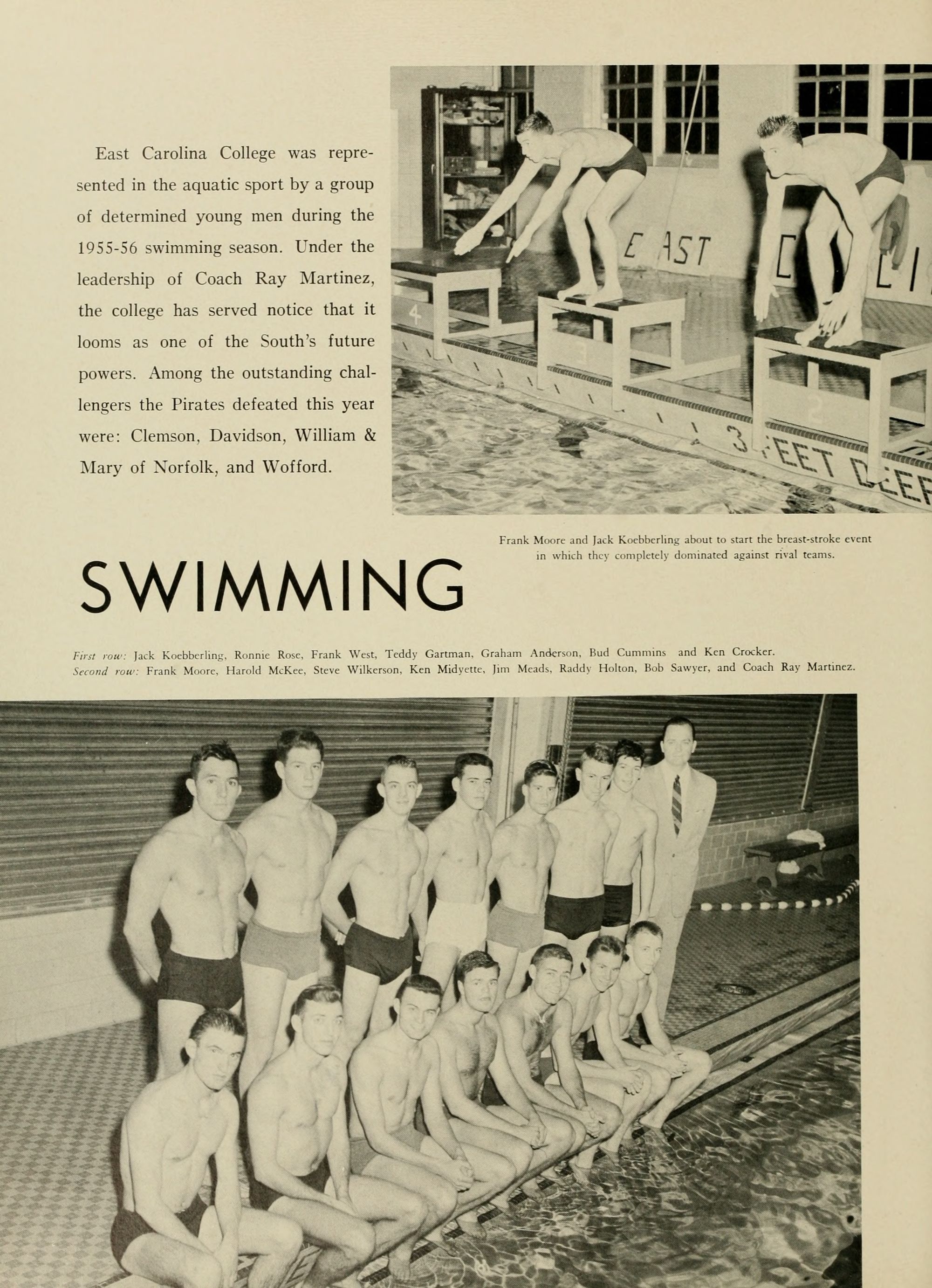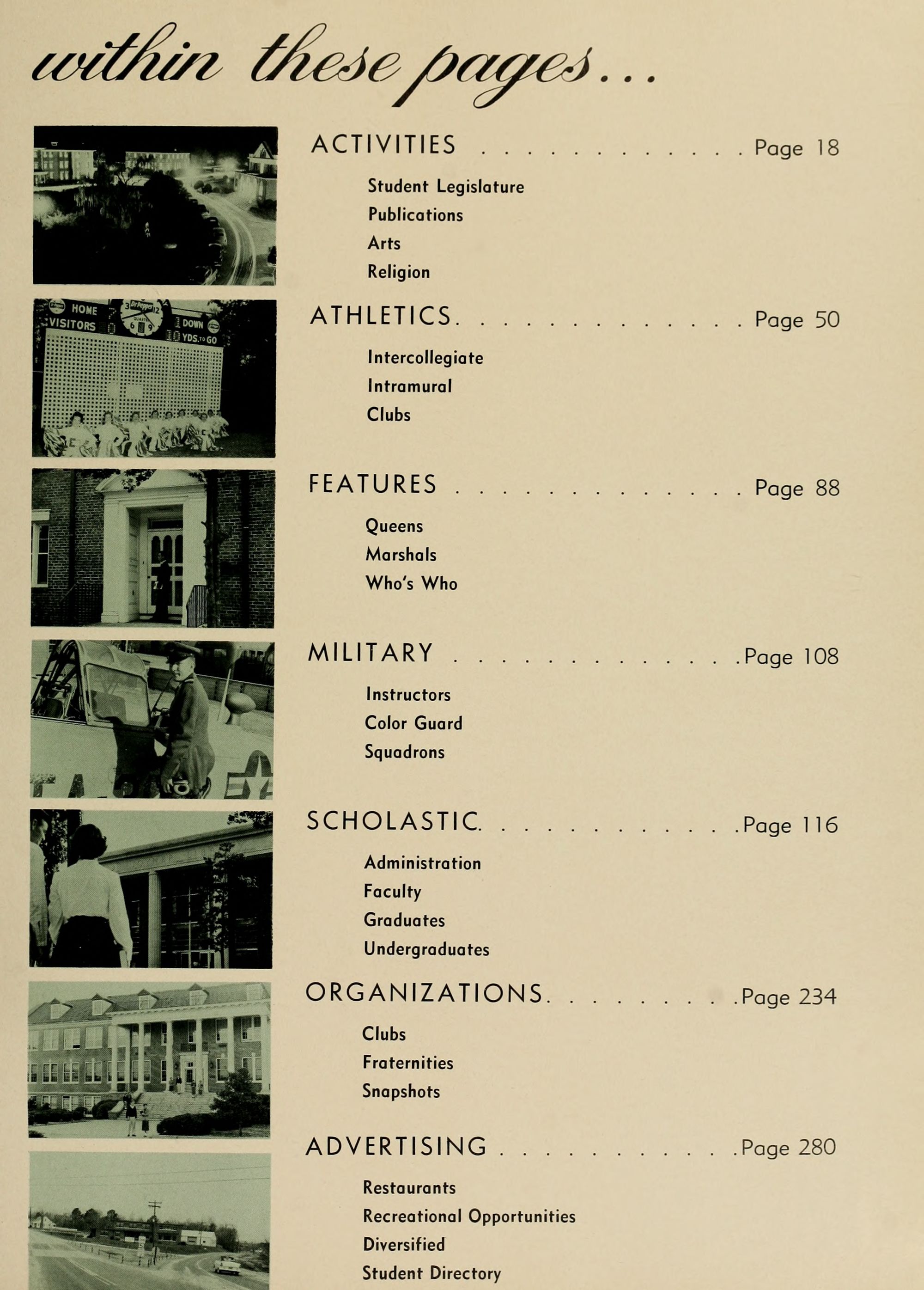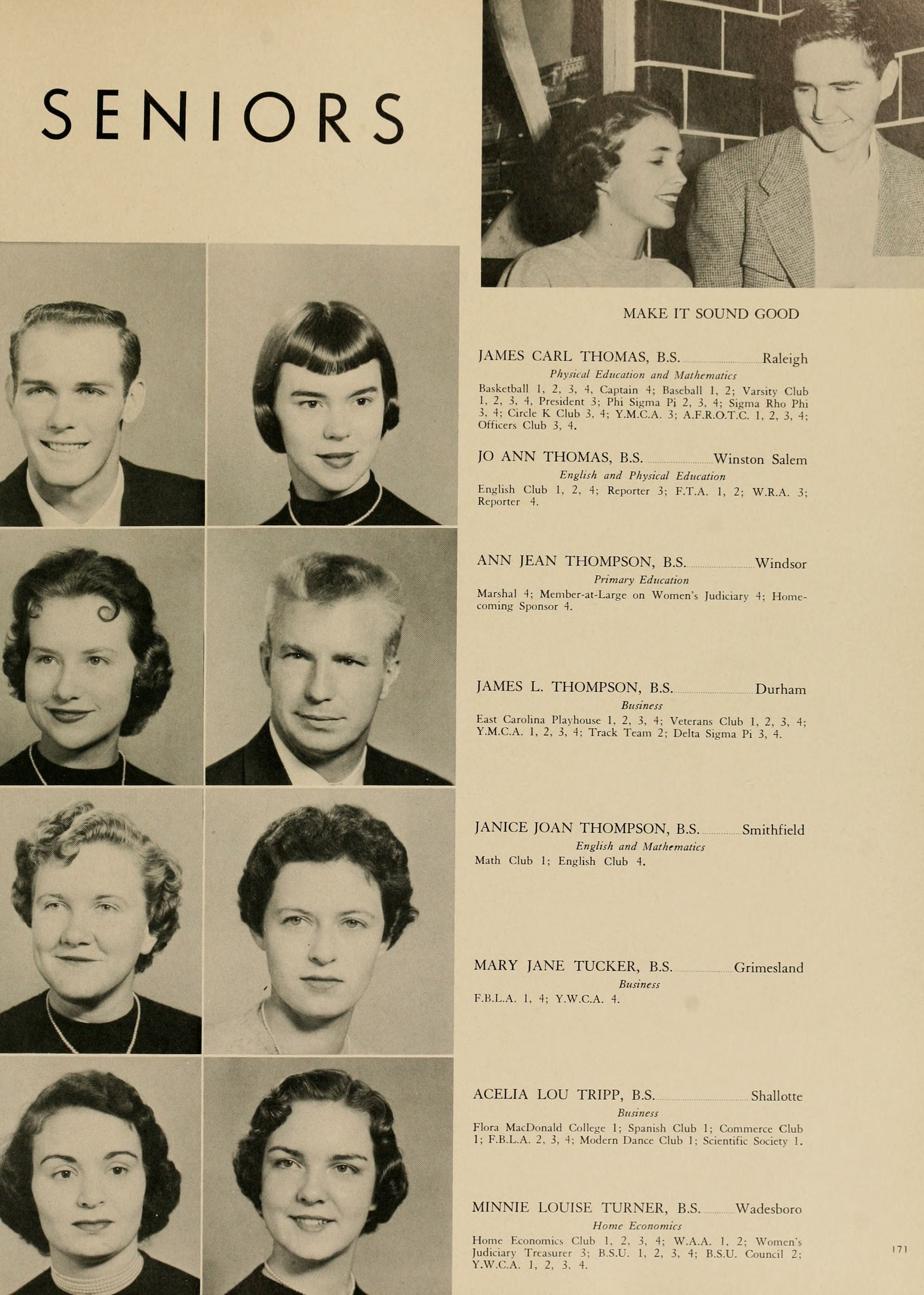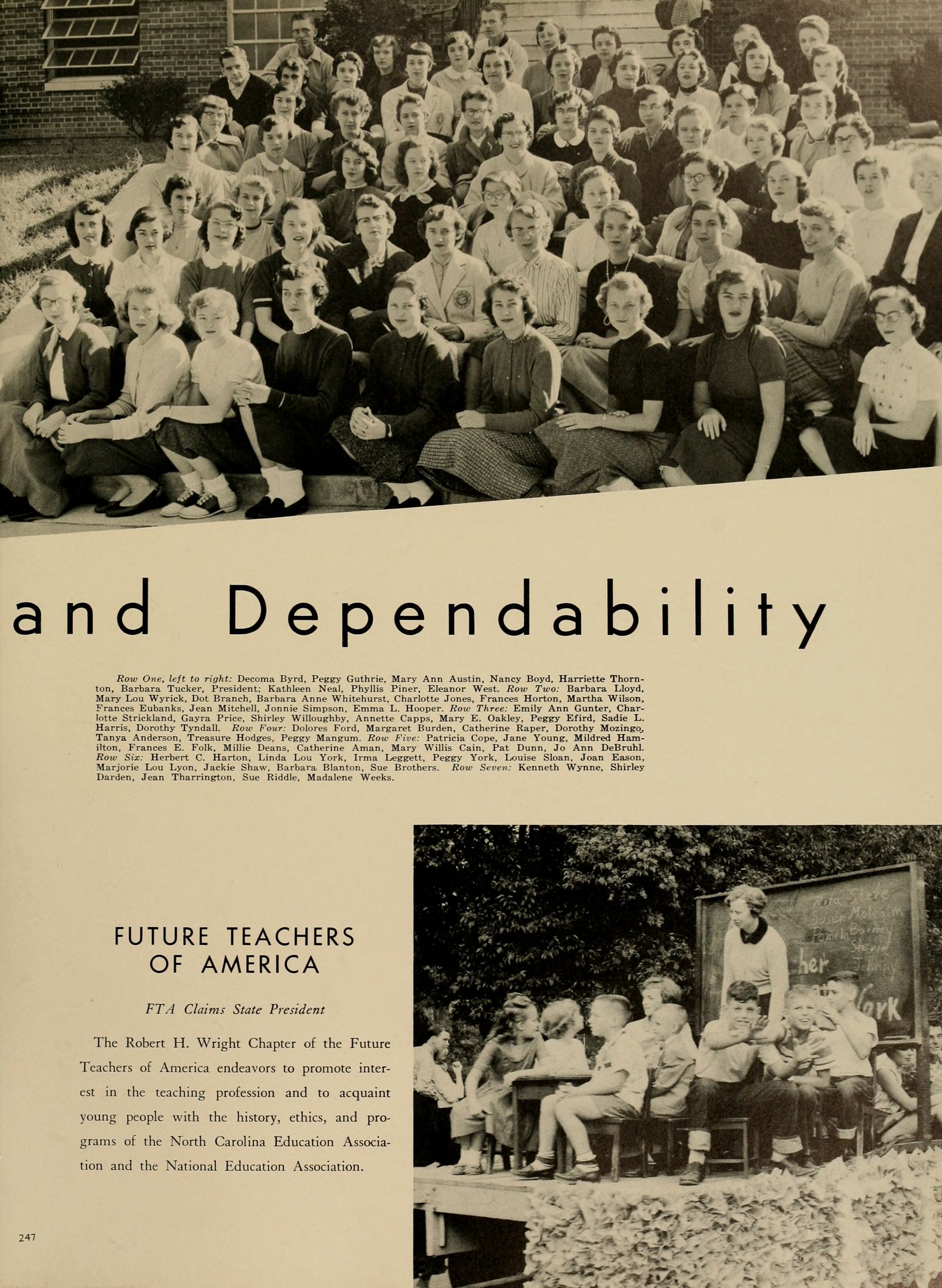 The spirit of EAST CAROLINA results from the spontaneous expression of social, educa-tional, spiritual, and sportsmanship activities of the college students, as they work toward the double goal of adulthood and graduation. In college a student finds a wide selection of cultural and social opportunities which are correlated with the curriculum. While living with contemporaries, college students estab-lish for themselves a set of values and learn to select the best from life with an aim toward living it. Graduation is the culmination of a successful college life; the student emerges into his place in the world, equipped with the best upon which to build a worthy life.