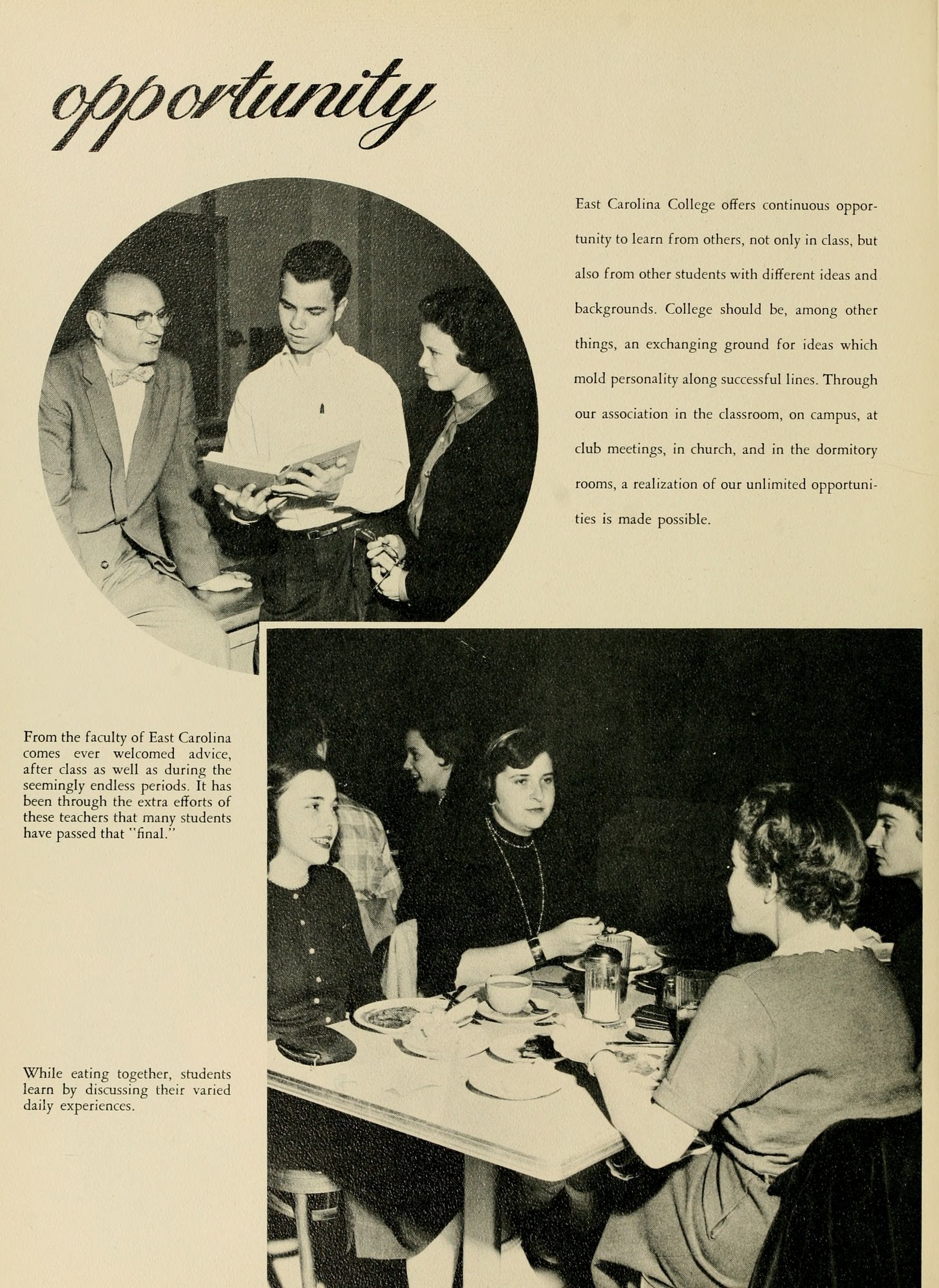 East Carolina College offers continuous oppor-tunity to learn from others, not only in class, but also from other students with different ideas and backgrounds. College should be, among other things, an exchanging ground for ideas which mold personality along successful lines. Through our association in the classroom, on campus, at club meetings, in church, and in the dormitory rooms, a realization of our unlimited opportuni- ties is made possible.
