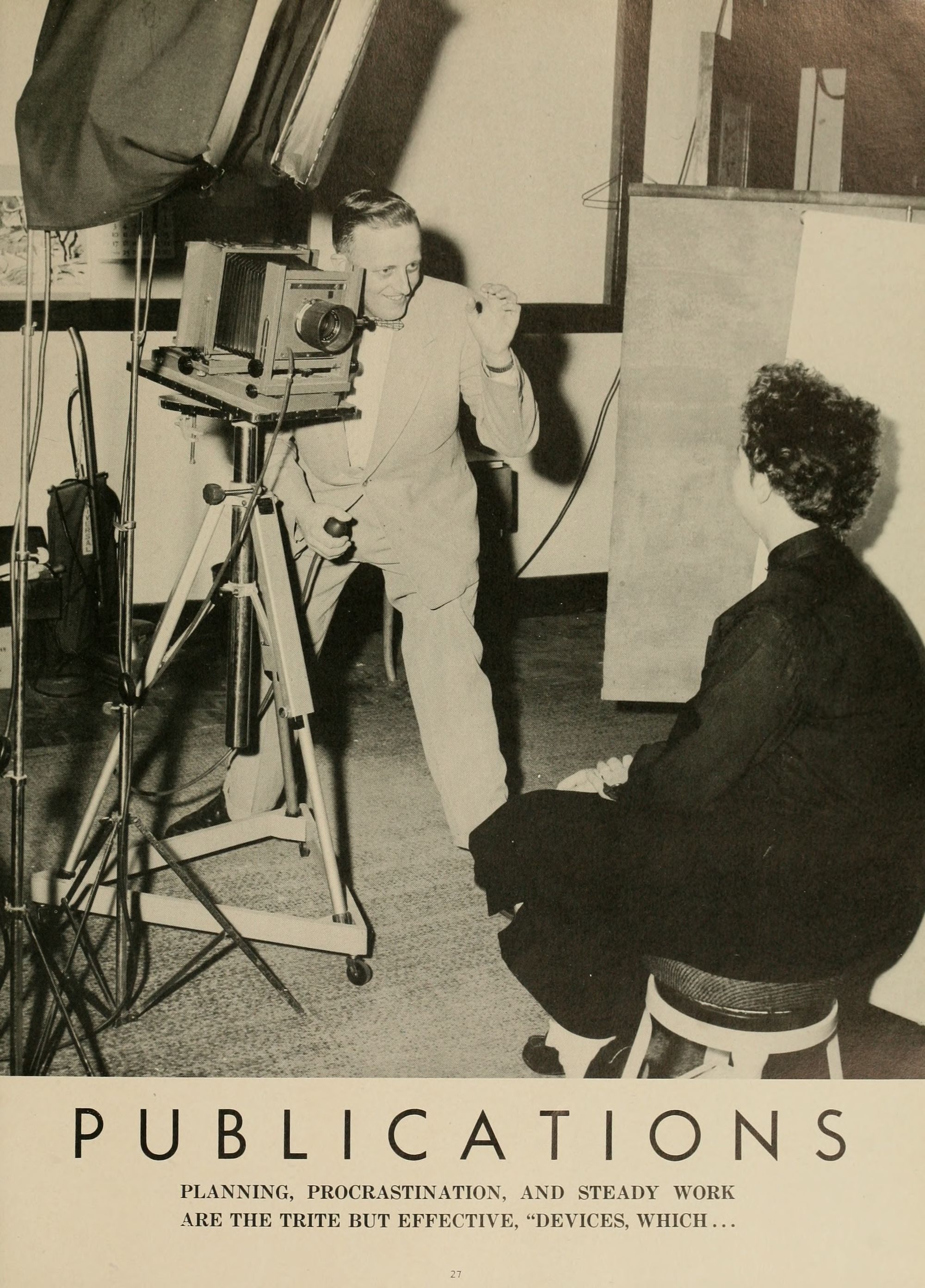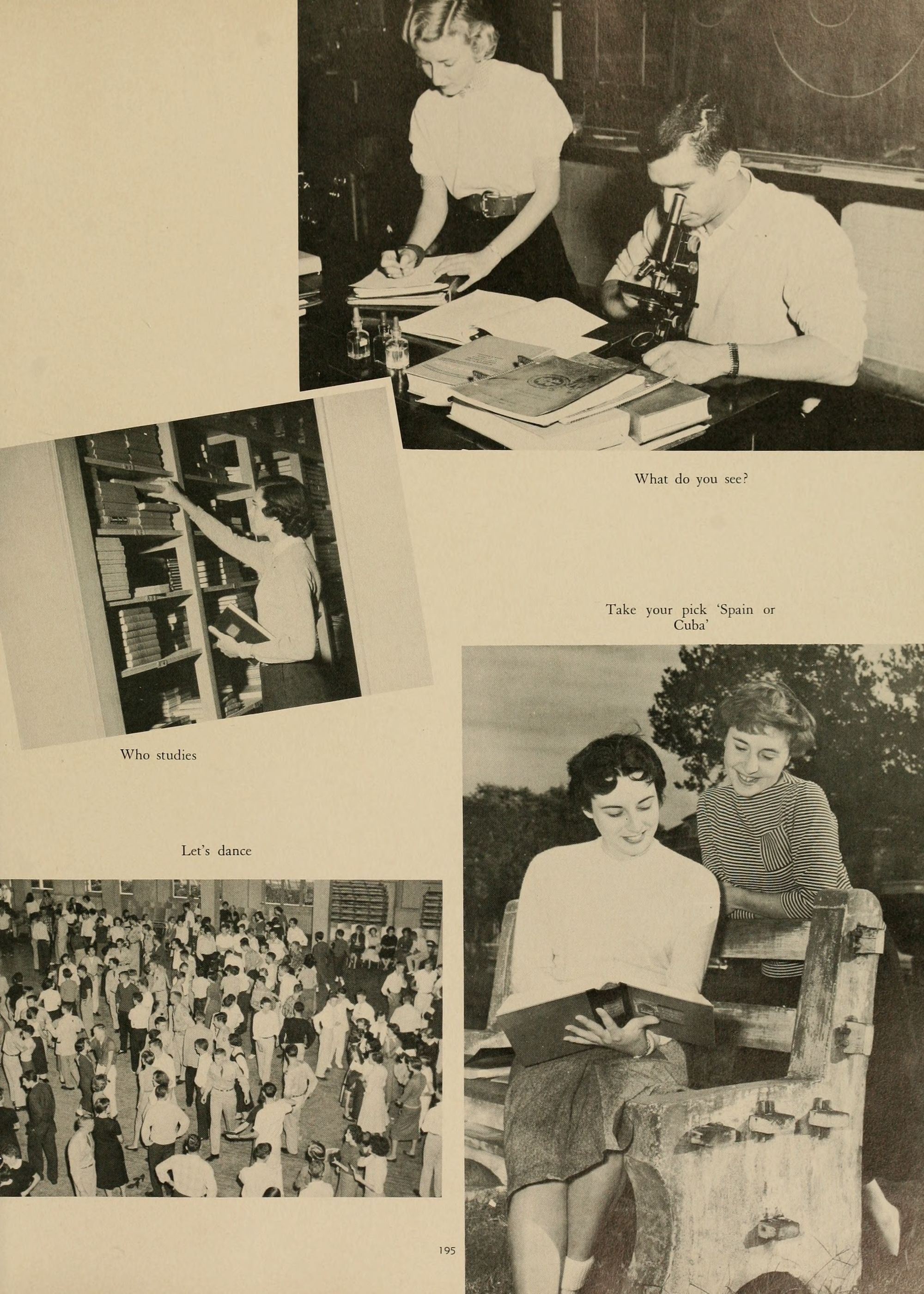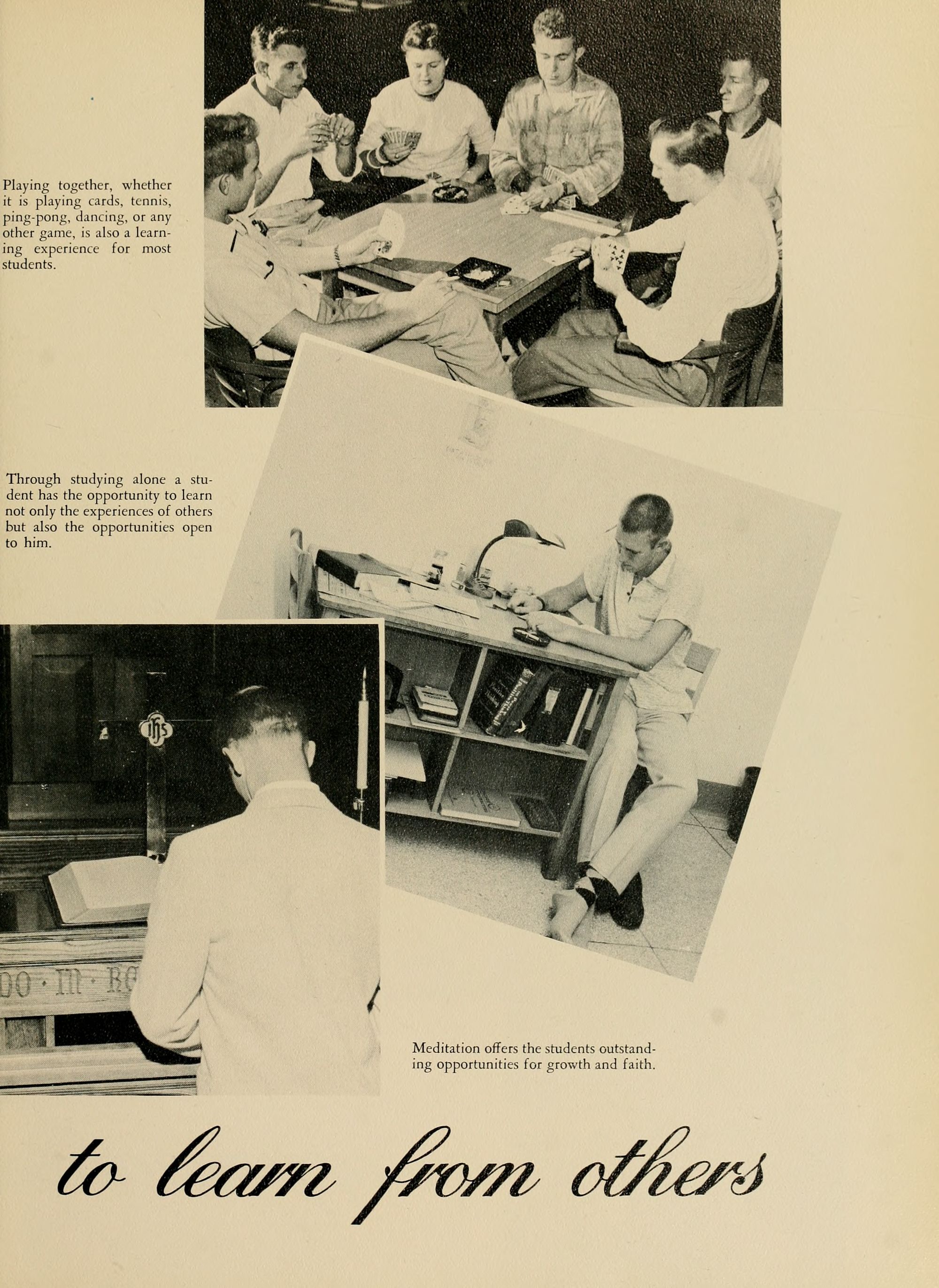 Achievement in the classroom adds spice to hours of relaxation, which are many and varied. Only when a student attains the greatest achievement in his studies are the hours of relaxation enjoyed and wel-comed to their fullest. Since the main objective of college is to heighten his scholastic standards and to aid him in choosing a vocation, the work of the class-room naturally precedes all other activities. Within his busy life the student finds few precious hours to