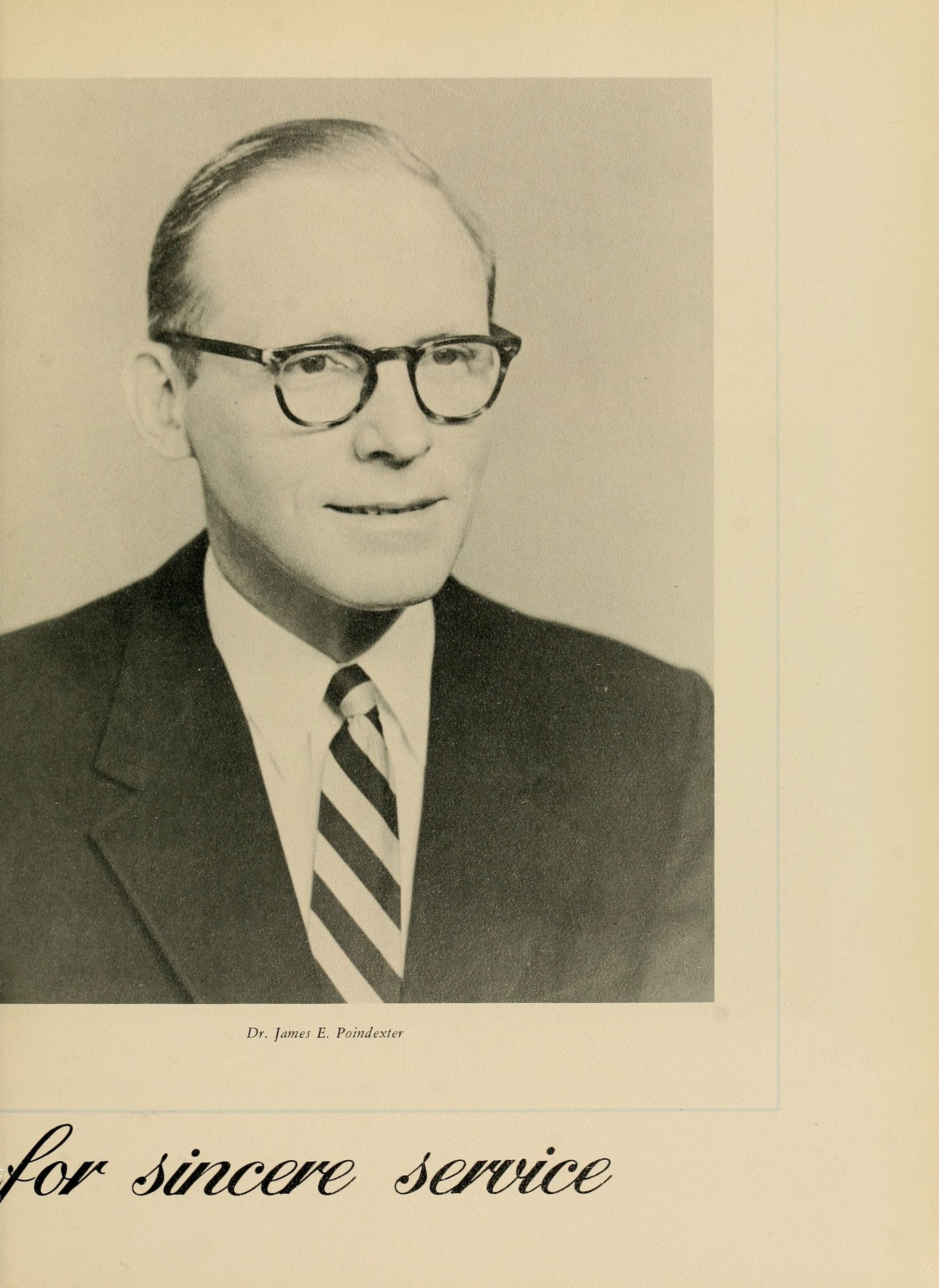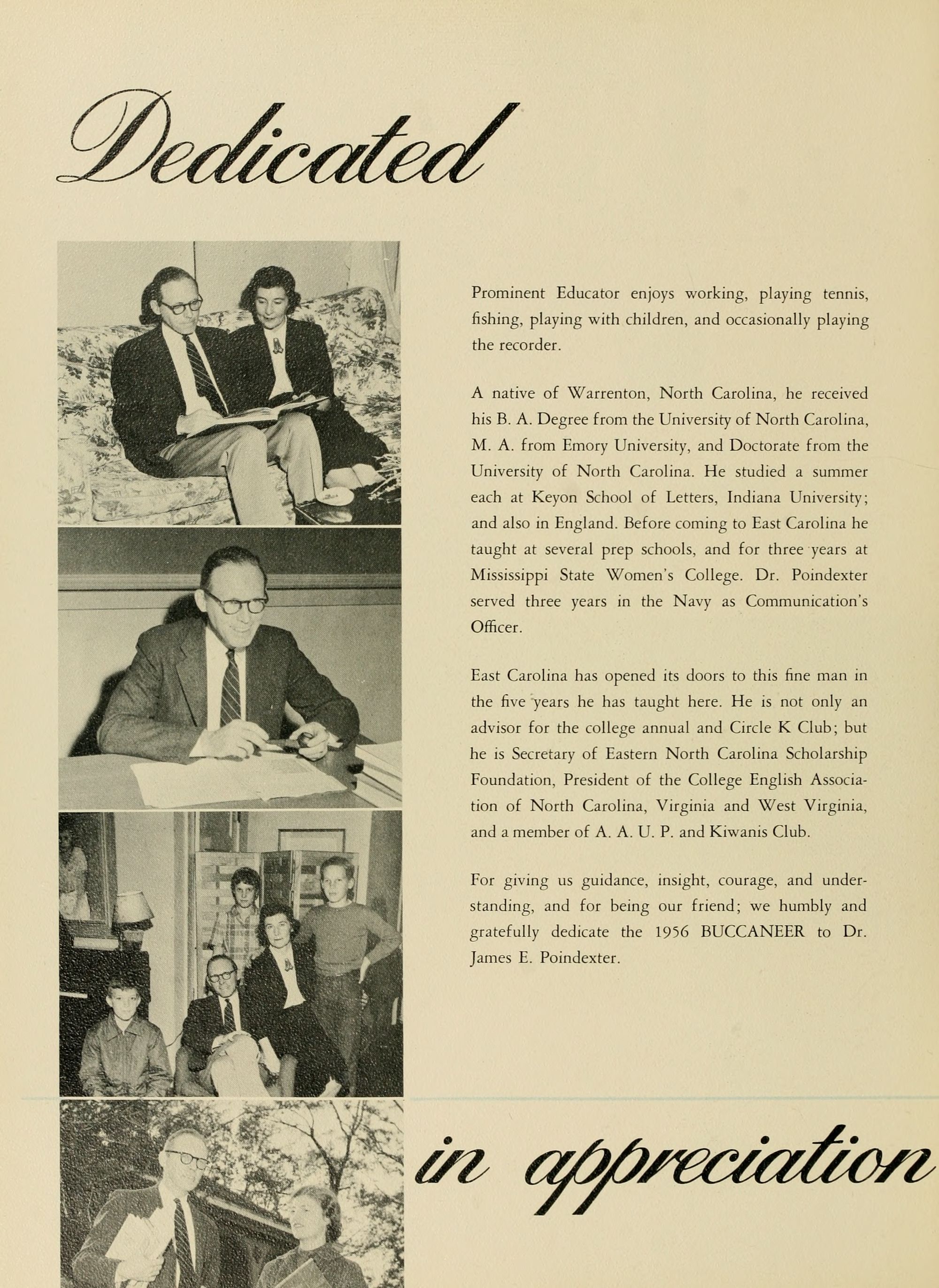 A native of Warrenton, North Carolina, he received his B. A. Degree from the University of North Carolina, M. A. from Emory University, and Doctorate from the University of North Carolina. He studied a summer each at Keyon School of Letters, Indiana University; and also in England. Before coming to East Carolina he taught at several prep schools, and for three years at Mississippi State Women's College. Dr. Poindexter served three years in the Navy as Communication's Officer.