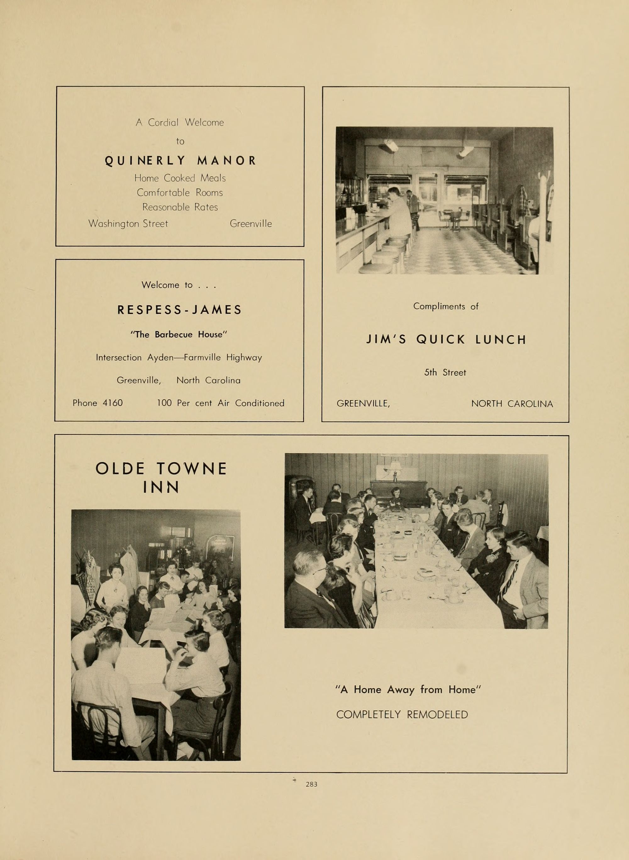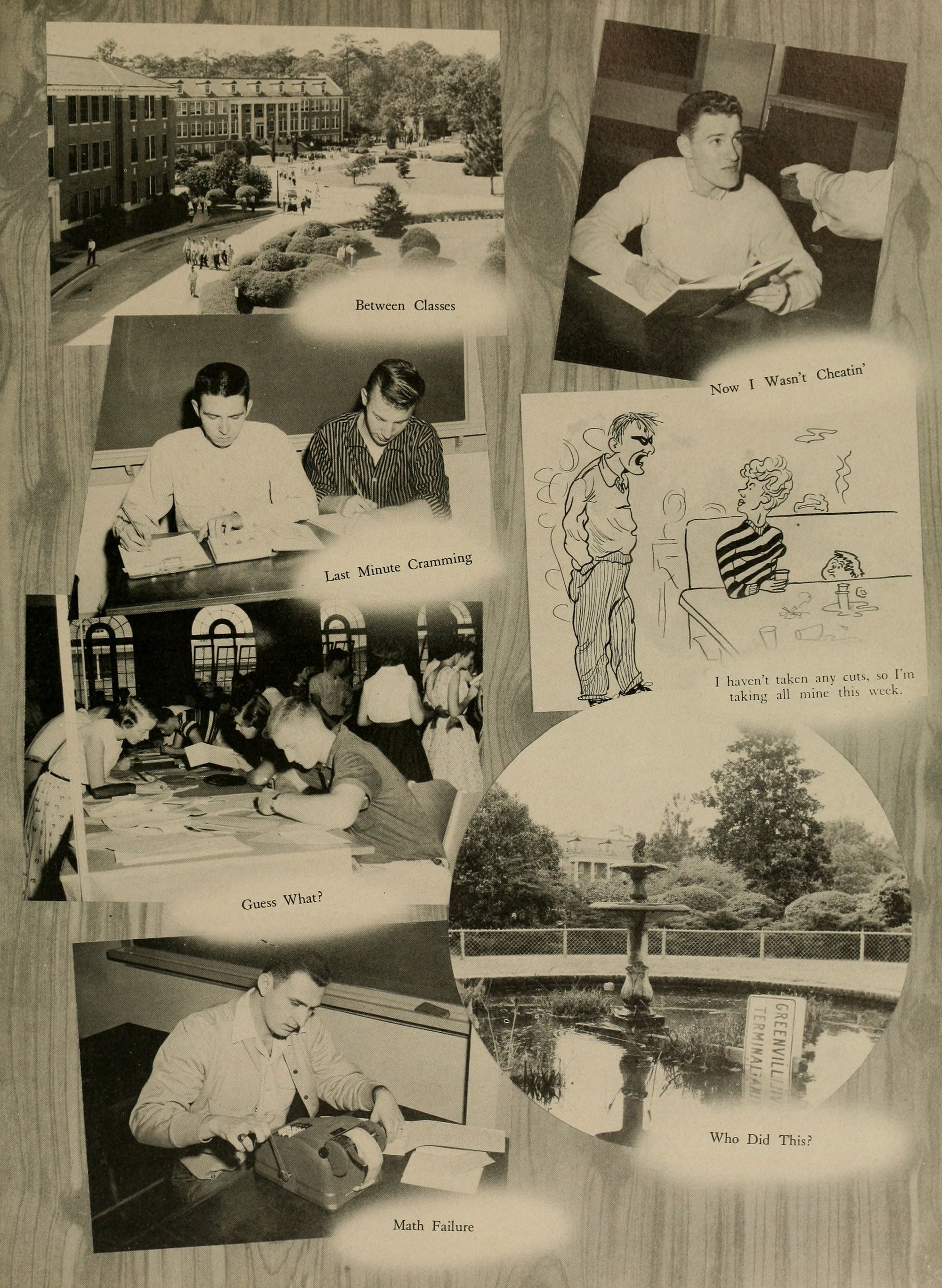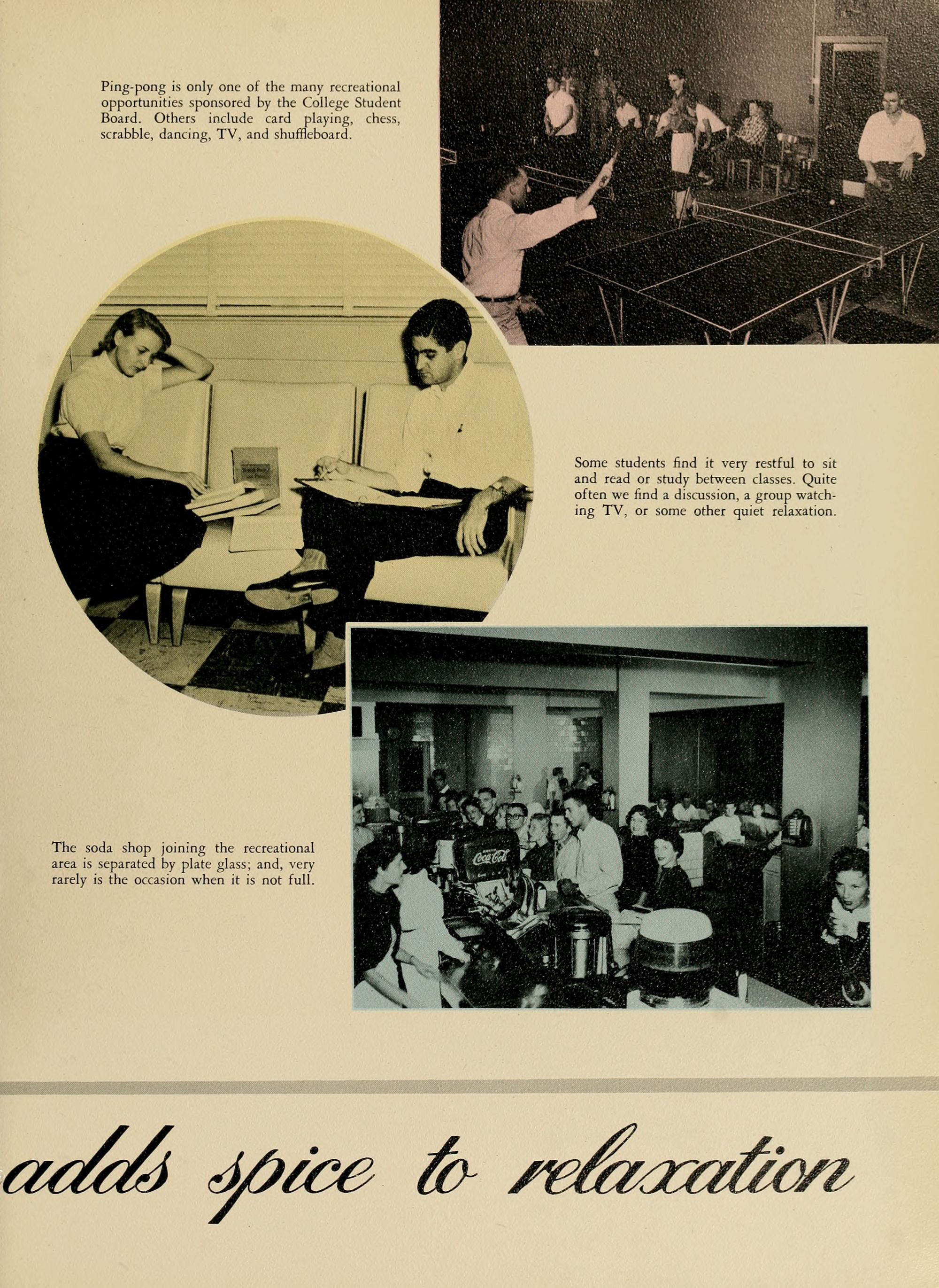 The opportunities to create for the student his social life and increase his extra-curricular activities, are numerous at East Carolina. Many moments of enjoy- ment and relaxation are taken advantage of by the student who visits the College Union. Here, after his studies have been completed, a collegian may find the atmosphere most pleasant and refreshing to his tired mind.