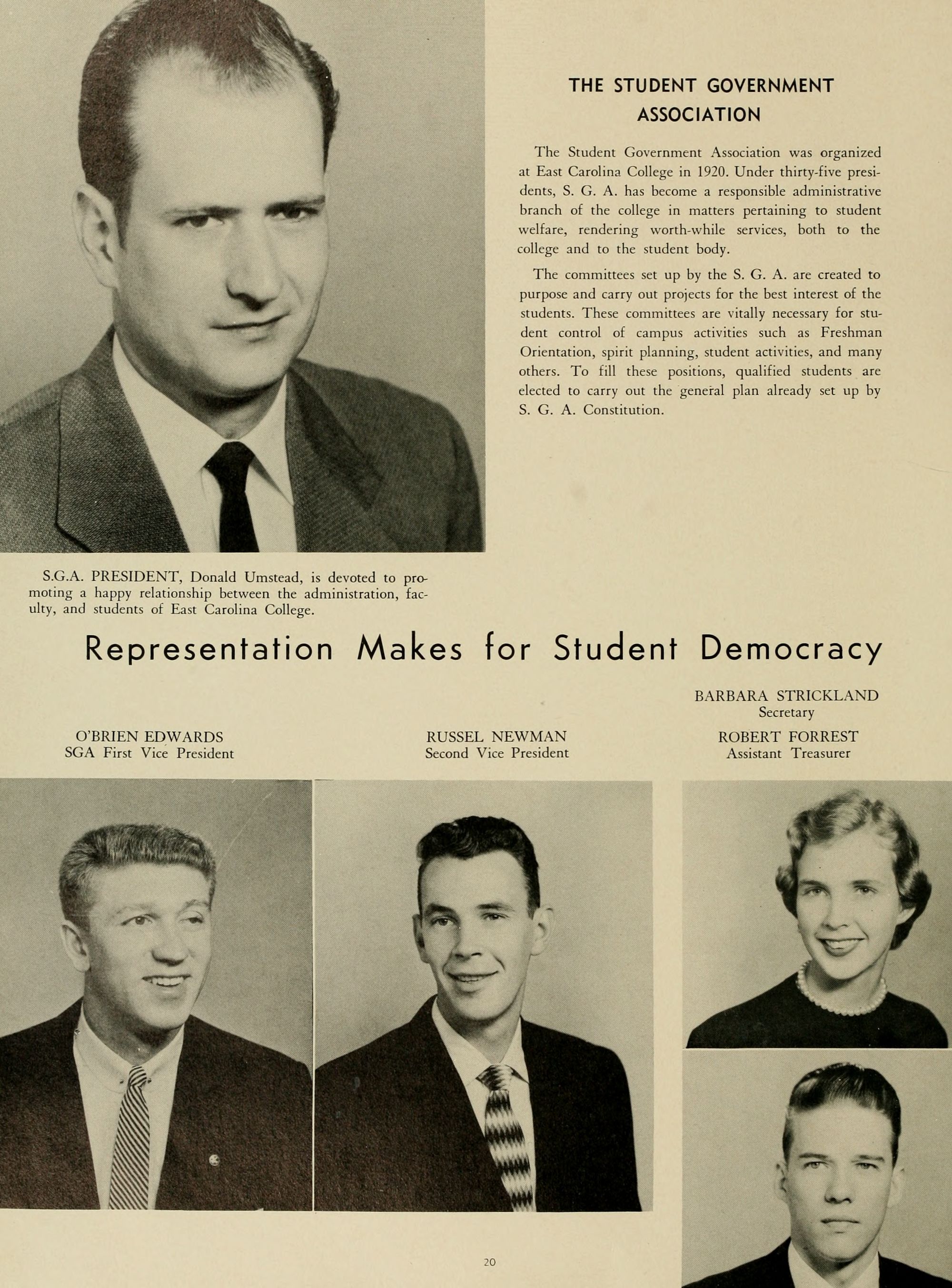 S.G.A. PRESIDENT, Donald Umstead, is devoted to pro-moting a happy relationship between the administration, fac-ulty, and students of East Carolina College.