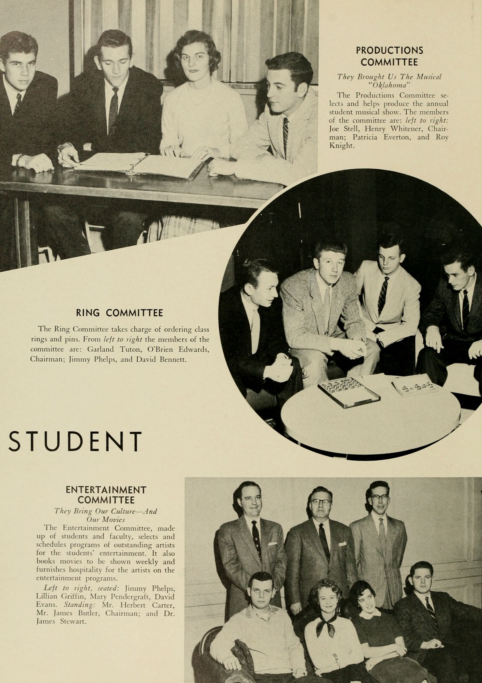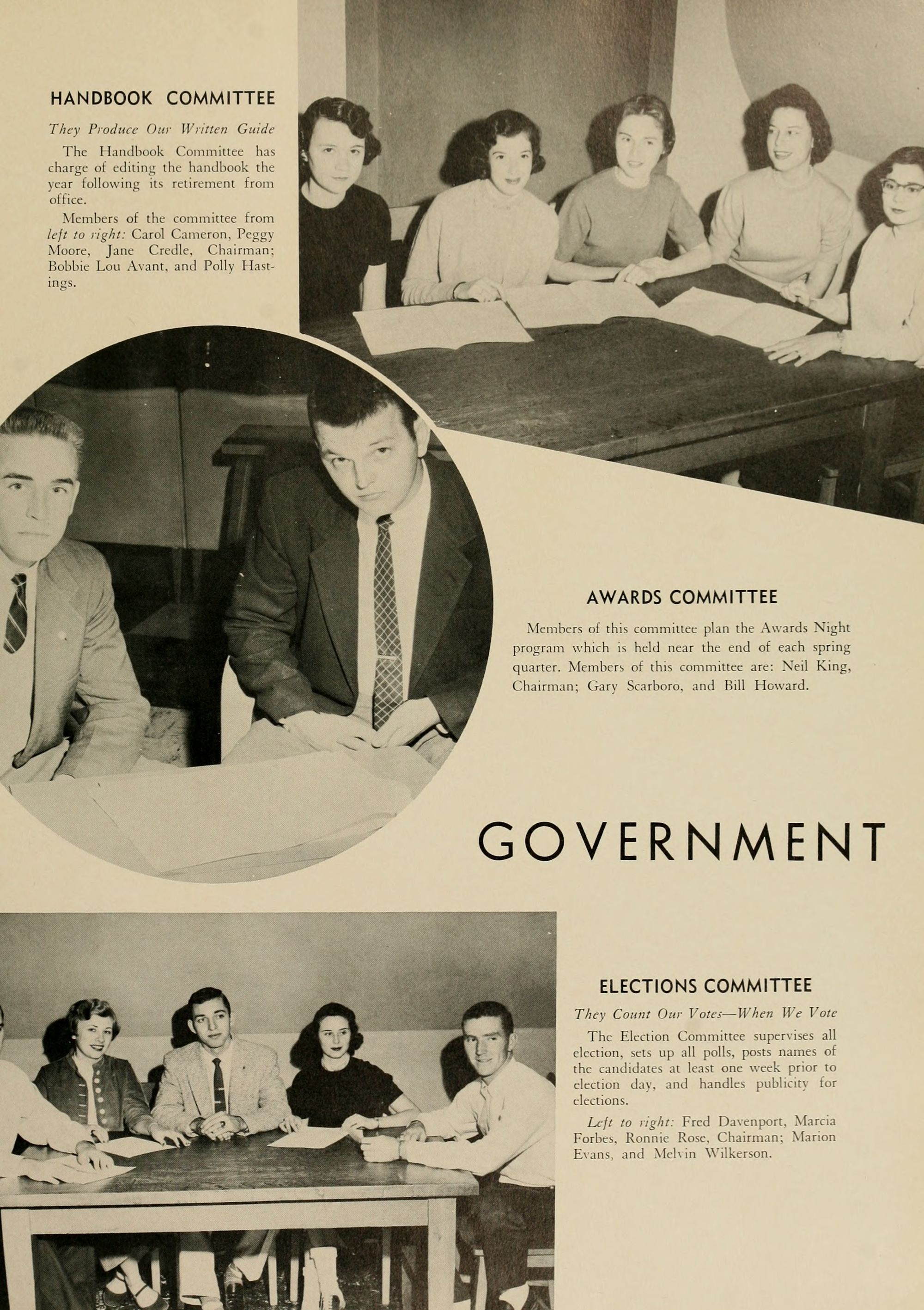 The committees set up by the S. G. A. are created to purpose and carry out projects for the best interest of the students. These committees are vitally necessary for stu- dent control of campus activities such as Freshman Orientation, spirit planning, student activities, and many others. To fill these positions, qualified students are elected to carry out the general plan already set up by S. G. A. Constitution.