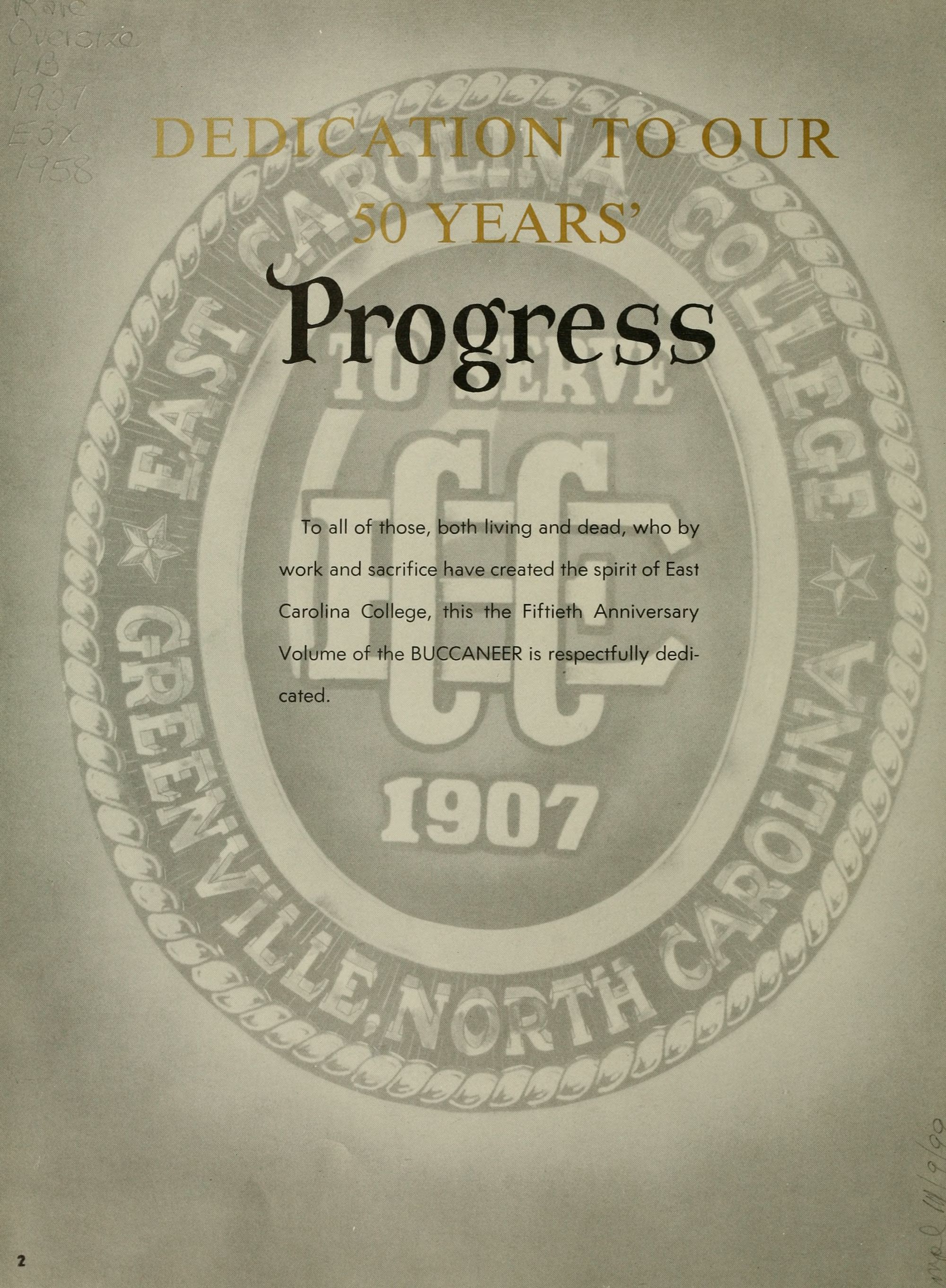 To all of those, both living and dead, who by work and sacrifice have created the spirit of East Carolina College, this the Fiftieth Anniversary Volume of the BUCCANEER is respectfully dedi-cated.