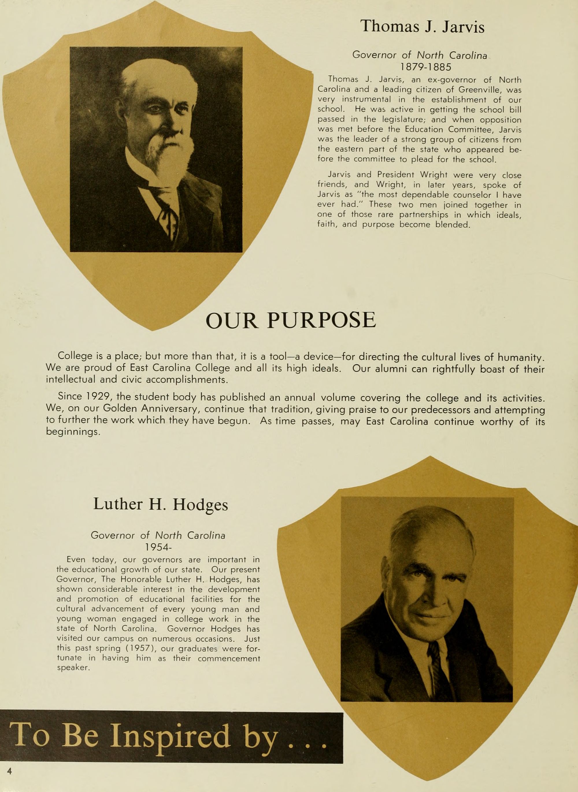 Thomas J. Jarvis, an ex-governor of North Carolina and a leading citizen of Greenville, was very instrumental in the establishment of our school. He was active in getting the school bill passed in the legislature; and when opposition was met before the Education Committee, Jarvis was the leader of a strong group of citizens from the eastern part of the state who appeared be- fore the committee to plead for the school.