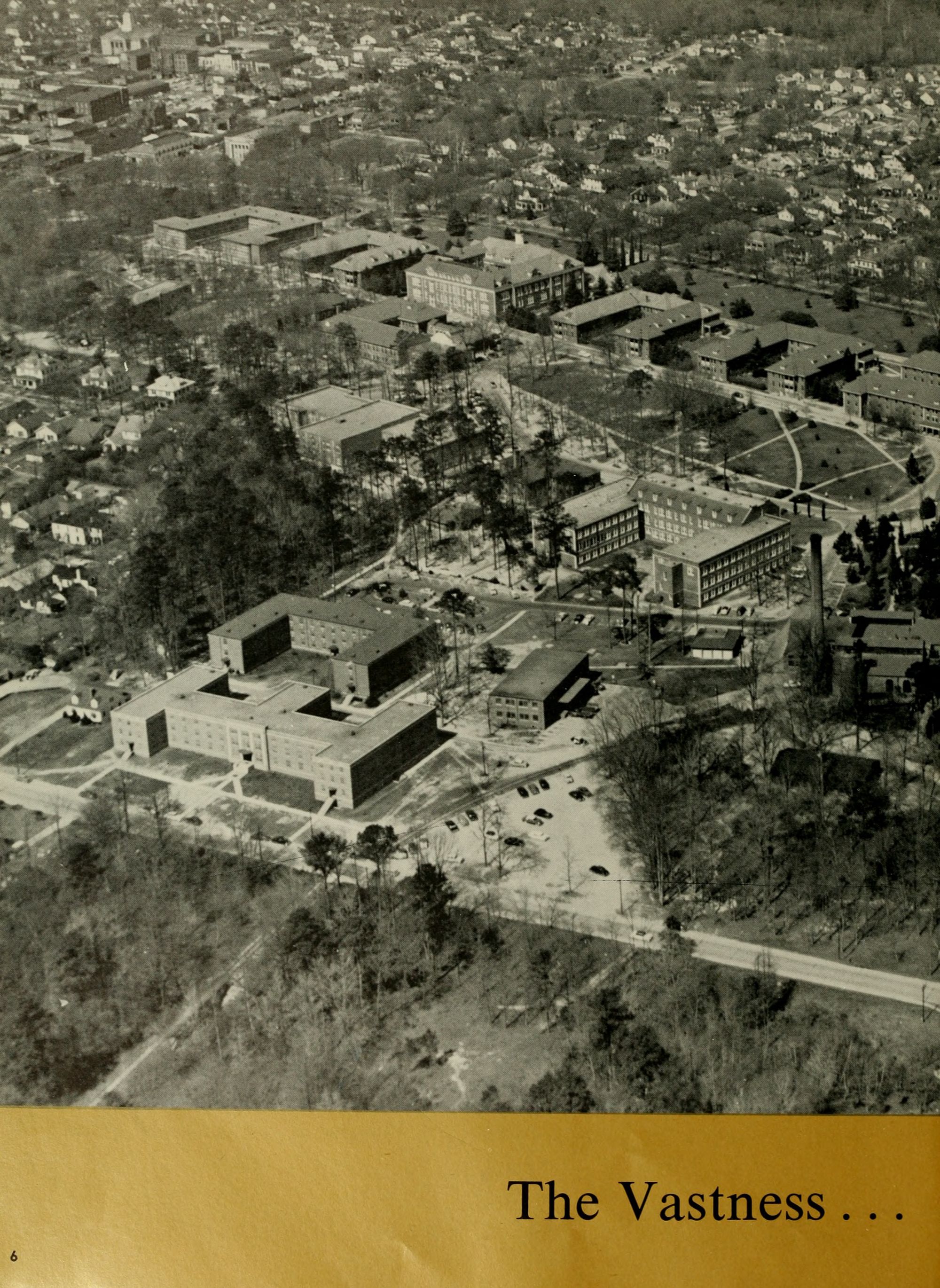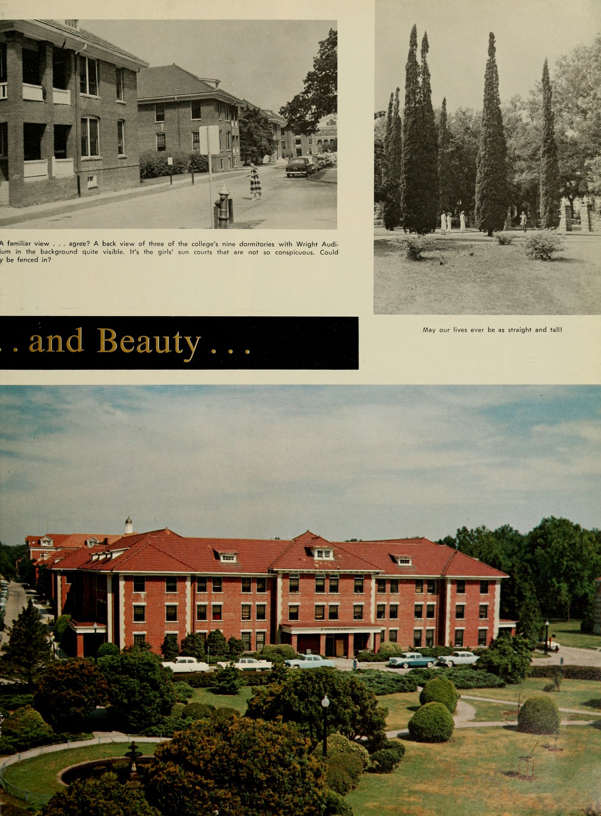 A familiar view . . . agree? A back view of three of the college's nine dormitories with Wright Auditorium in the background quite visible. It's the girls' sun courts that are not so conspicuous. Could they be fenced in?