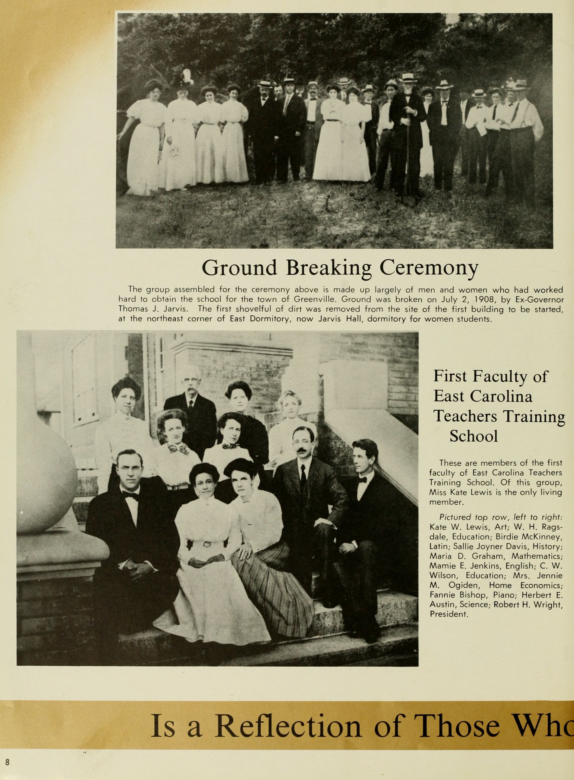 The group assembled for the ceremony above is made up largely of men and women who had worked hard to obtain the school for the town of Greenville. Ground was broken on July 2, 1908, by Ex-Governor Thomas J. Jarvis. The first shovelful of dirt was removed from the site of the first building to be started, at the northeast corner of East Dormitory, now Jarvis Hall, dormitory for women students.