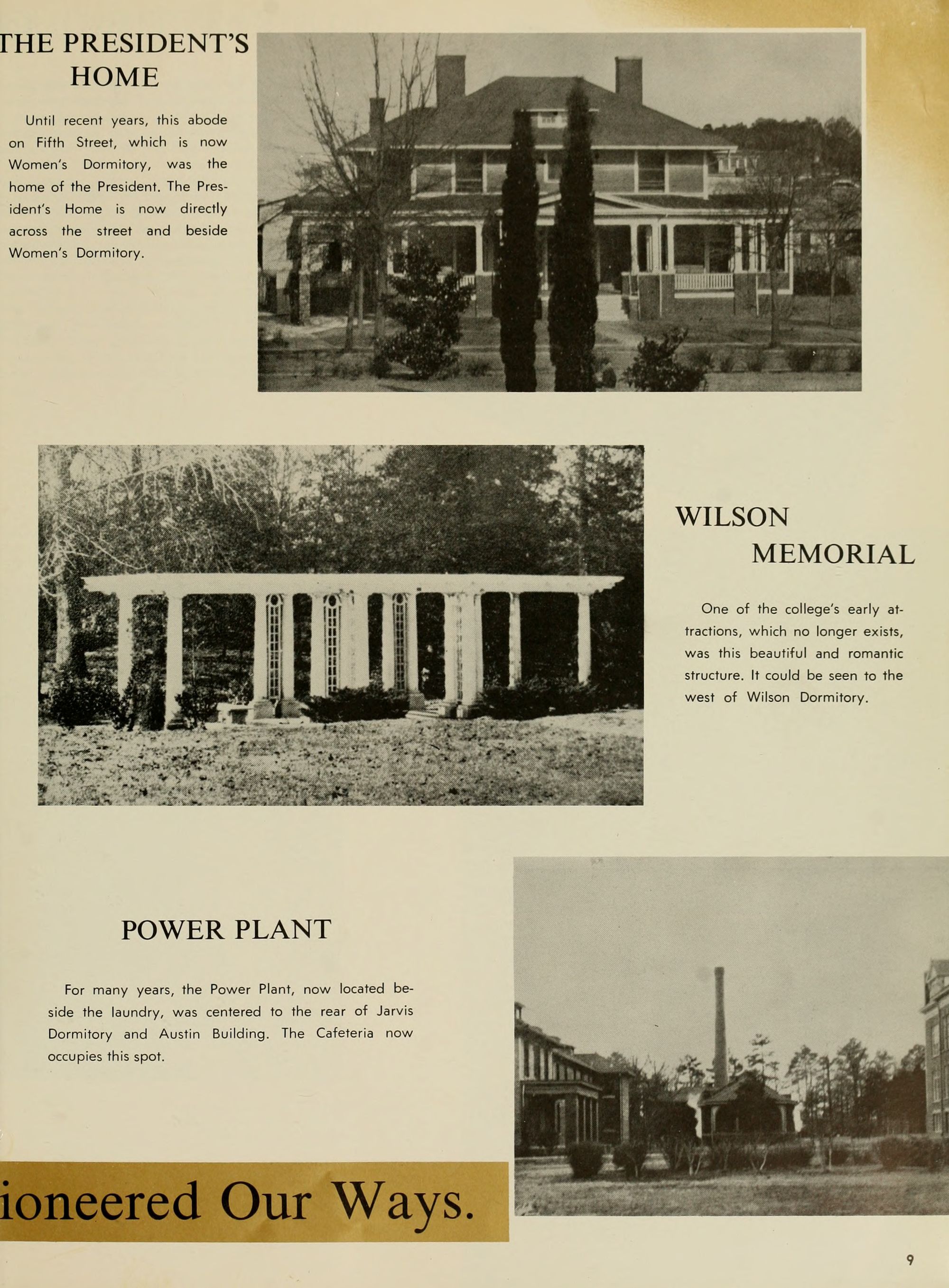 For many years, the Power Plant, now located be- side the laundry, was centered to the rear of Jarvis Dormitory and Austin Building. The Cafeteria now occupies this spot.