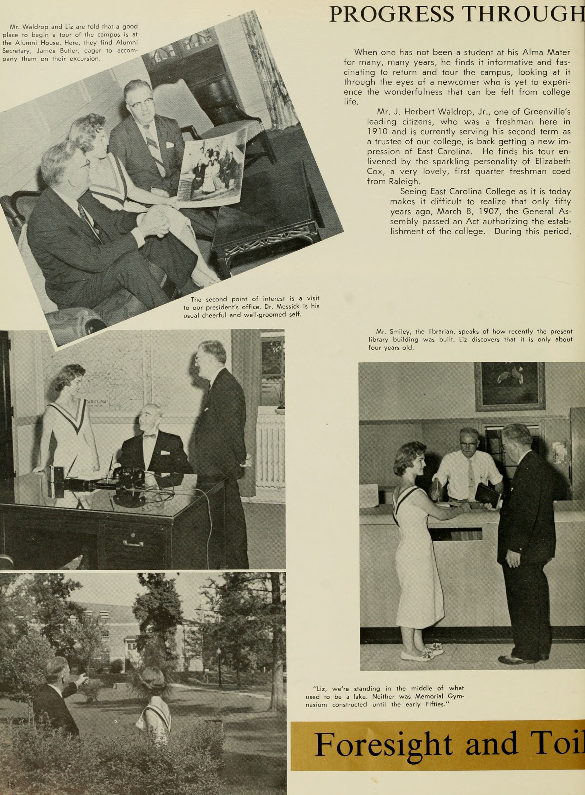 Seeing East Carolina College as it is today makes it difficult to realize that only fifty years ago, March 8, 1907, the General As- sembly passed an Act authorizing the estab- lishment of the college. During this period,