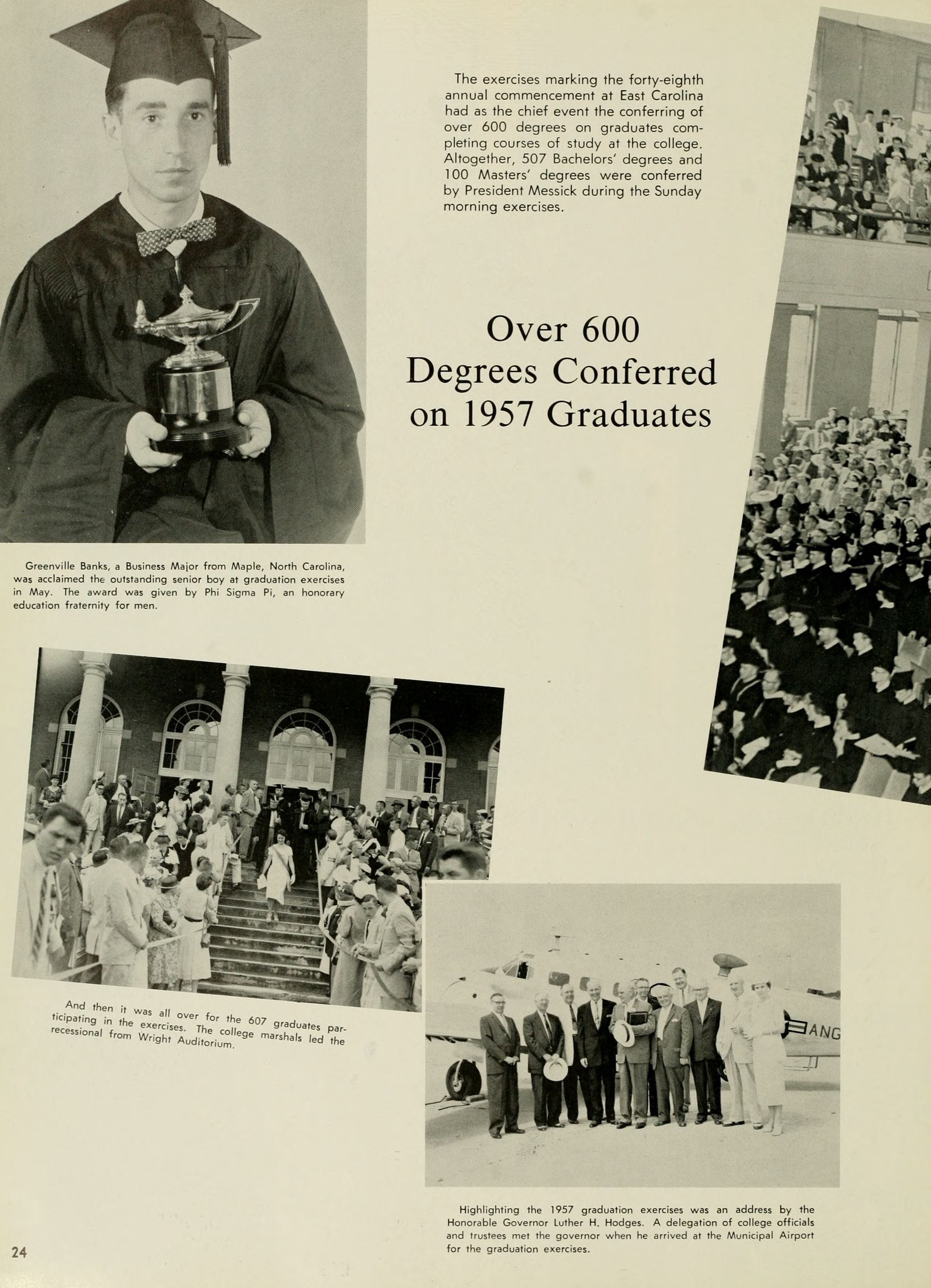 Even today, our governors are important in the educational growth of our state. Our present Governor, The Honorable Luther H. Hodges, has shown considerable interest in the development and promotion of educational facilities for the cultural advancement of every young man and young woman engaged in college work in the state of North Carolina. Governor Hodges has visited our campus on numerous occasions. Just this past spring (1957), our graduates were for- tunate in having him as their commencement speaker.