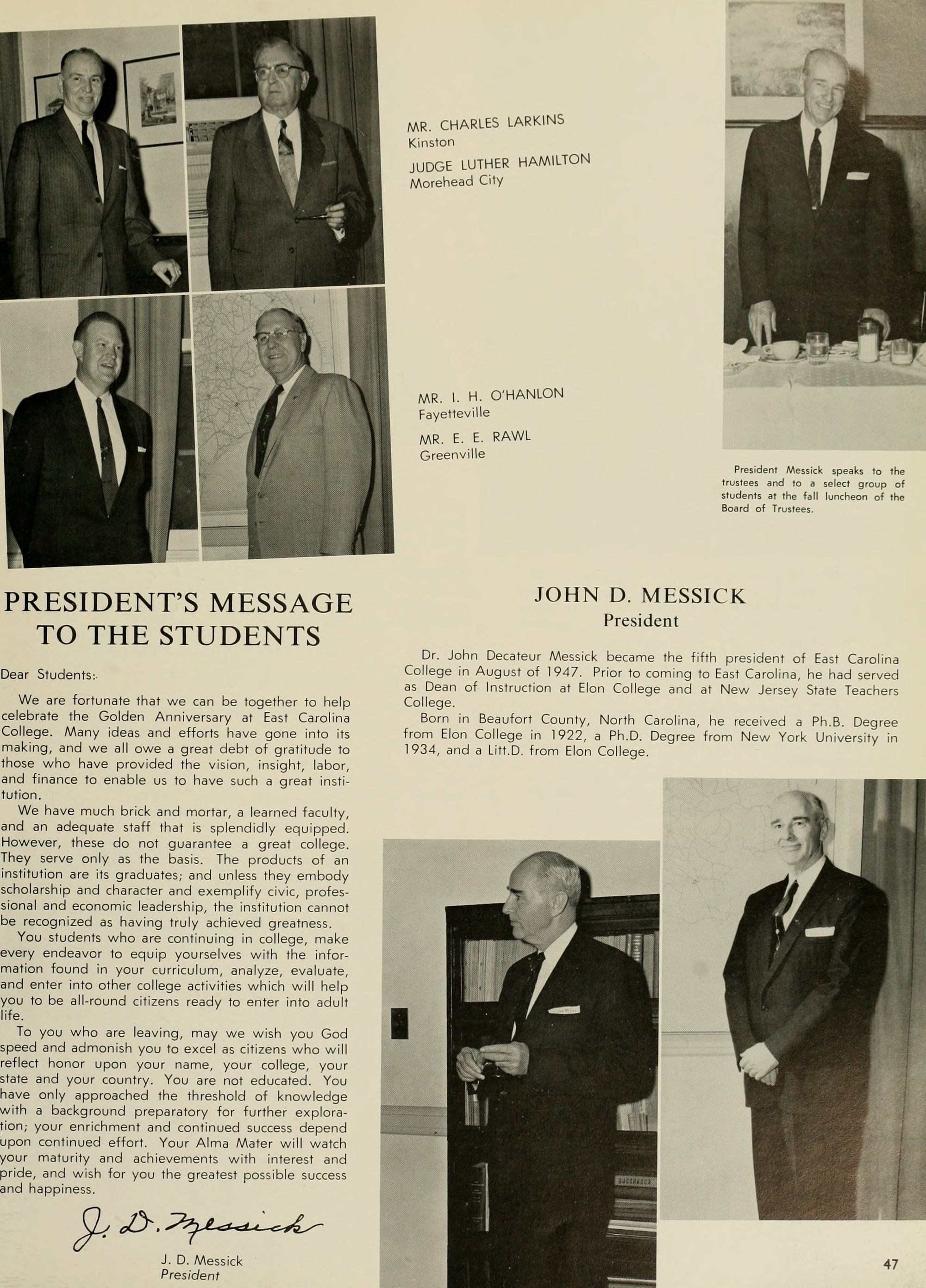 Dr. John D. Messick was appointed president in 1947. As a result of his ten years of capable leader- ship, the college has experienced a period of phenome- nal progress marked by expansion of physical facilities, growth in number of students and staff members, and development of new fields of service to education in the state.