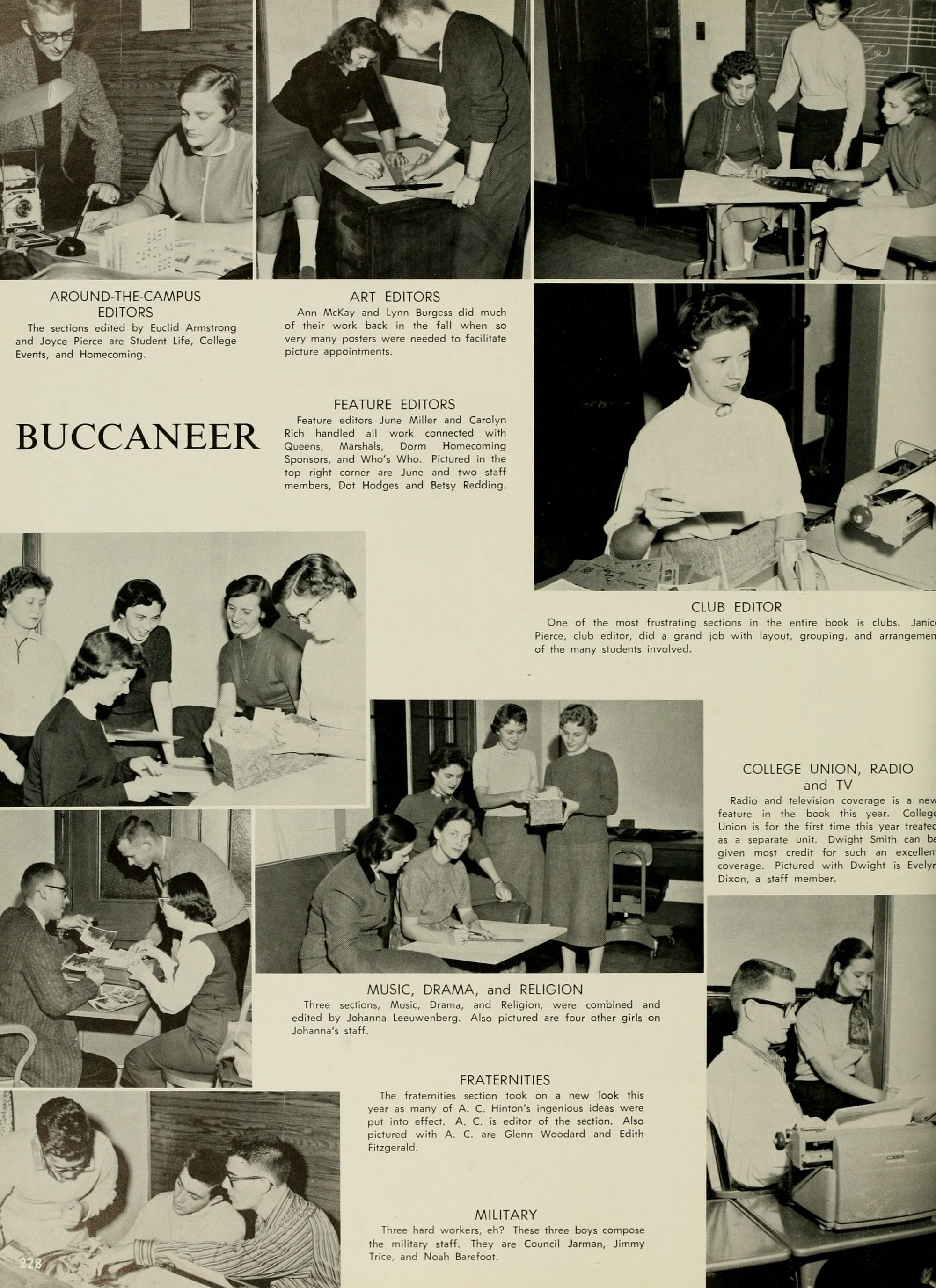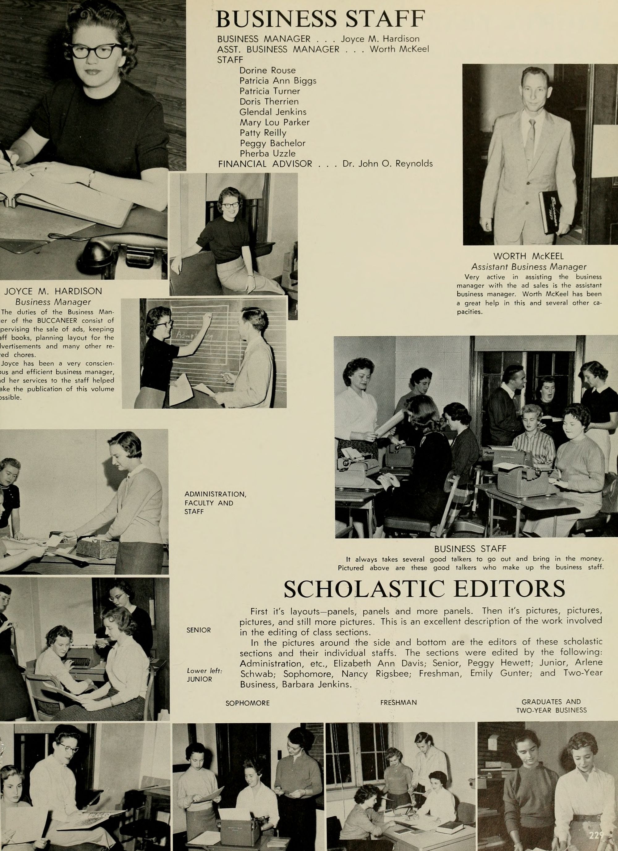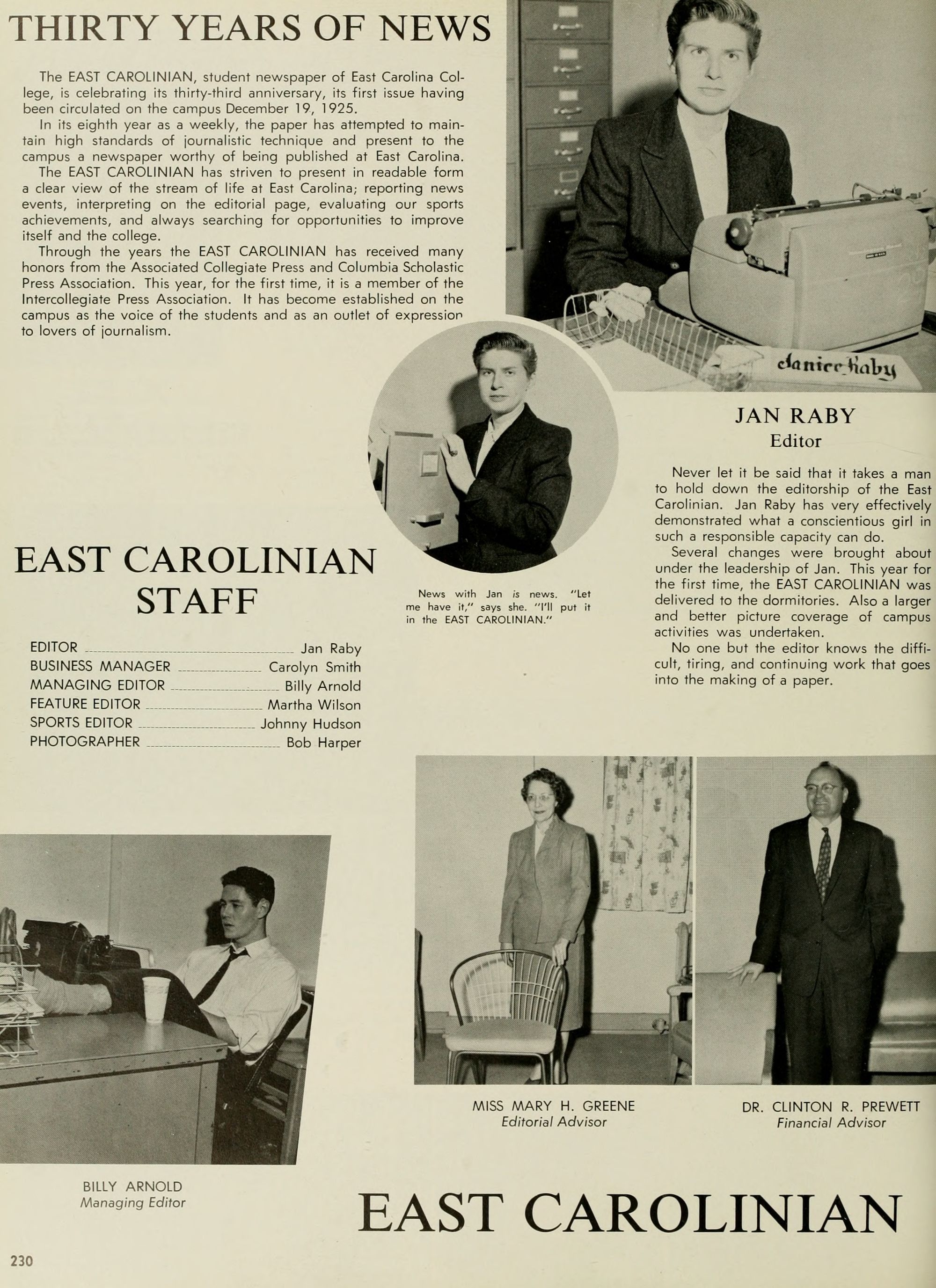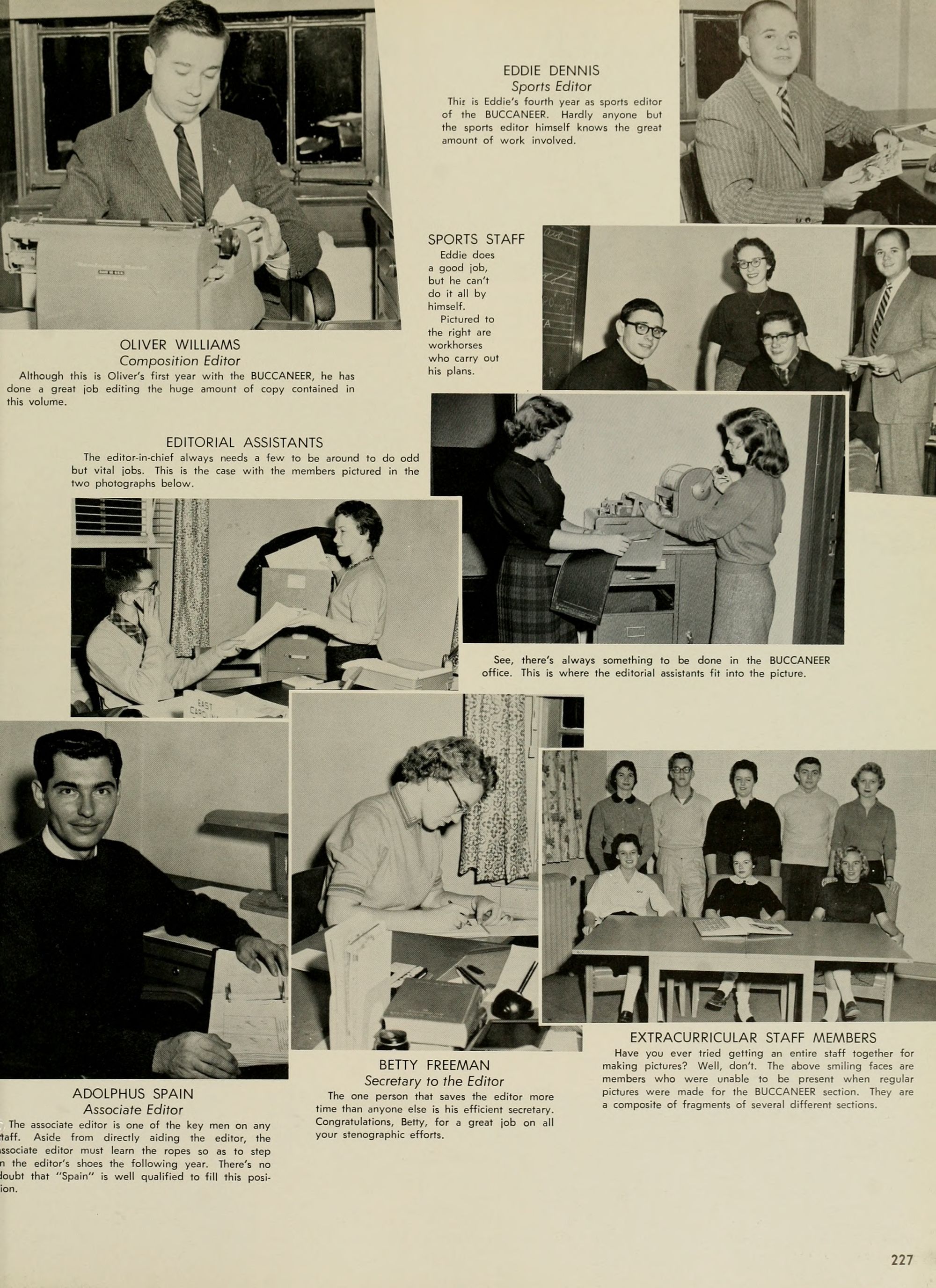The Editor's right hand is always his Associate Editor, and my right hand has certainly been skill- fully and continuously at work this year. Credit unlimited goes to Adolphus Spain, my Associate Editor; Joyce Hardison, Business Manager,- Worth McKeel, Assistant Business Manager; Joyce and Janice Pierce, whose tireless efforts have kept progress rolling,- Eddie Dennis, A. C. Hinton, Euclid Armstrong, Council Jarman, Oliver Williams, Ann McKay, June Miller, Dwight Smith, Pat' Dunn, Beverly Durham, Johonna Leeuwenberg, Peggy Hewett, Arlene Schwab, Betty Ann Davis, Mike Williamson, Emily "Grunt" Gunter, Charlotte "Shorty" Strickland, Joe Kelly, Margaret Conyer's, Jim- my Trice, Mike Katsias, and last but certainly not least, my other hand, Betty Freeman ( ).