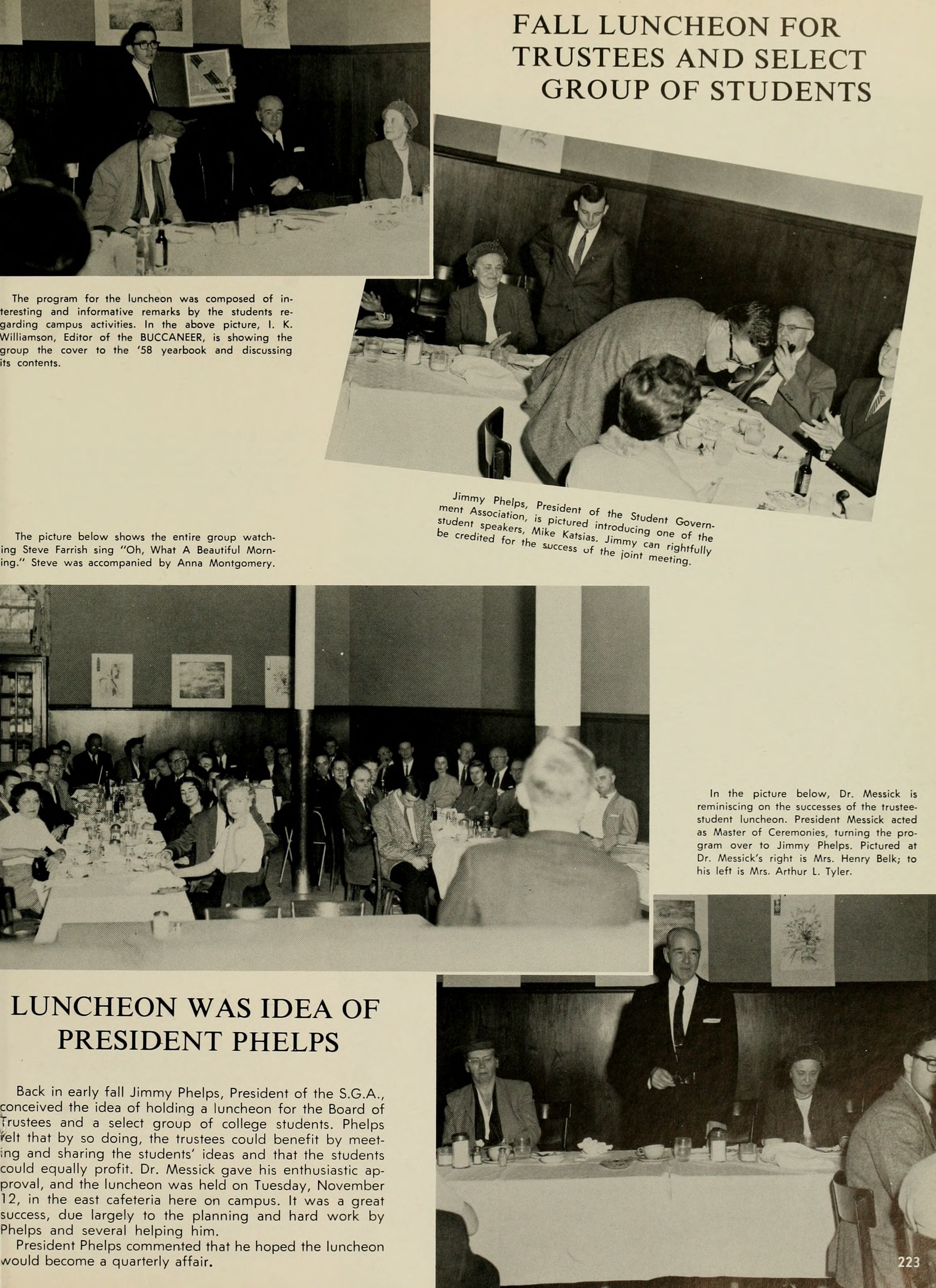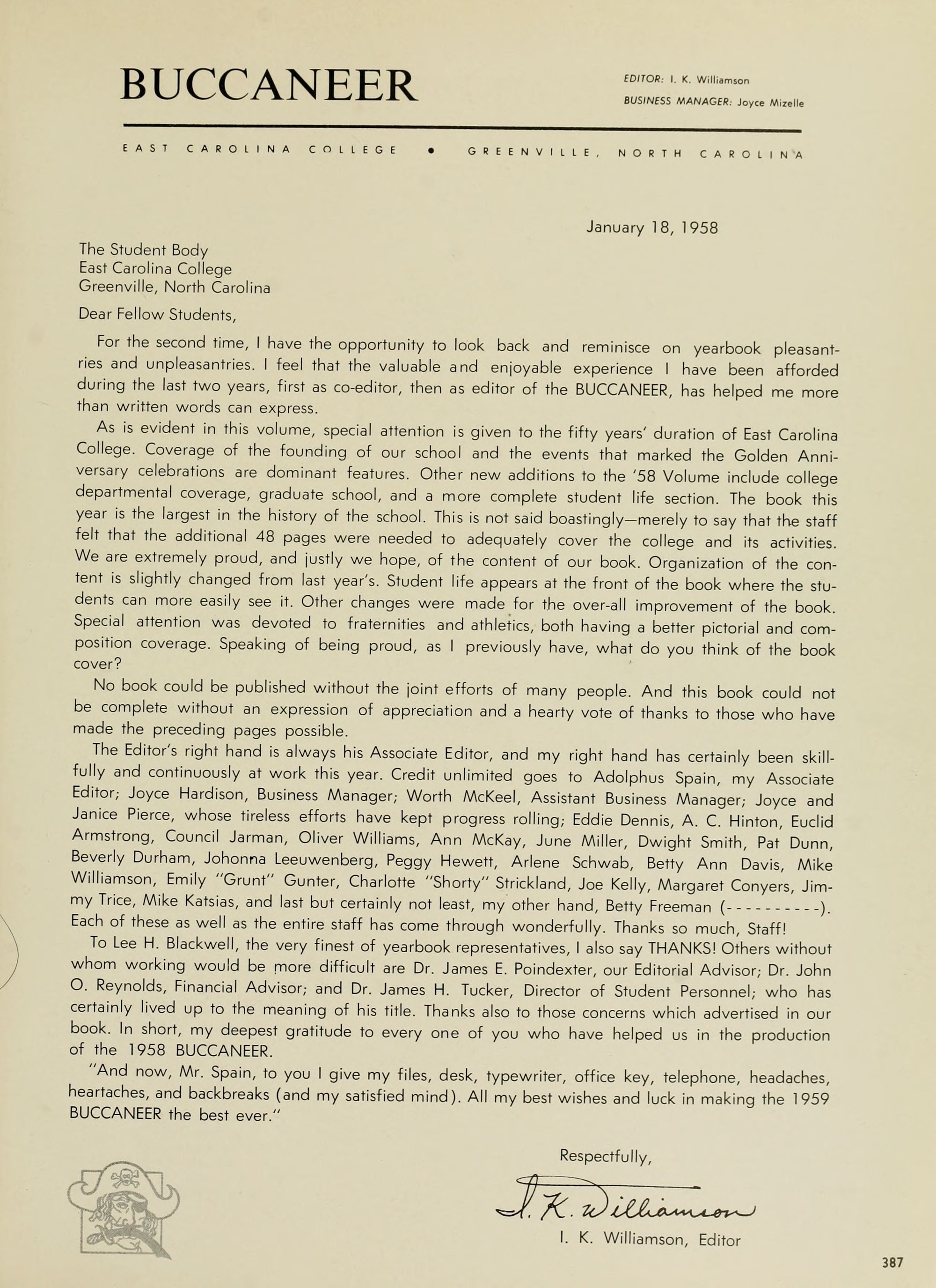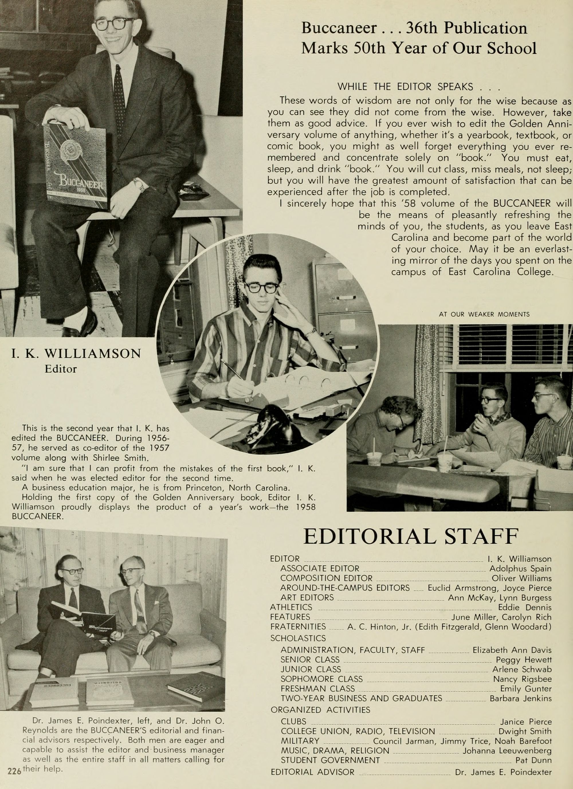To Lee H. Blackwell, the very finest of yearbook representatives, I also say THANKS! Others without whom working would be more difficult are Dr. James E. Poindexter, our Editorial Advisor,- Dr. John O. Reynolds, Financial Advisor; and Dr. James H. Tucker, Director of Student Personnel; who has certainly lived up to the meaning of his title. Thanks also to those concerns which advertised in our book. In short, my deepest gratitude to every one of you who have helped us in the production of the 1958 BUCCANEER.