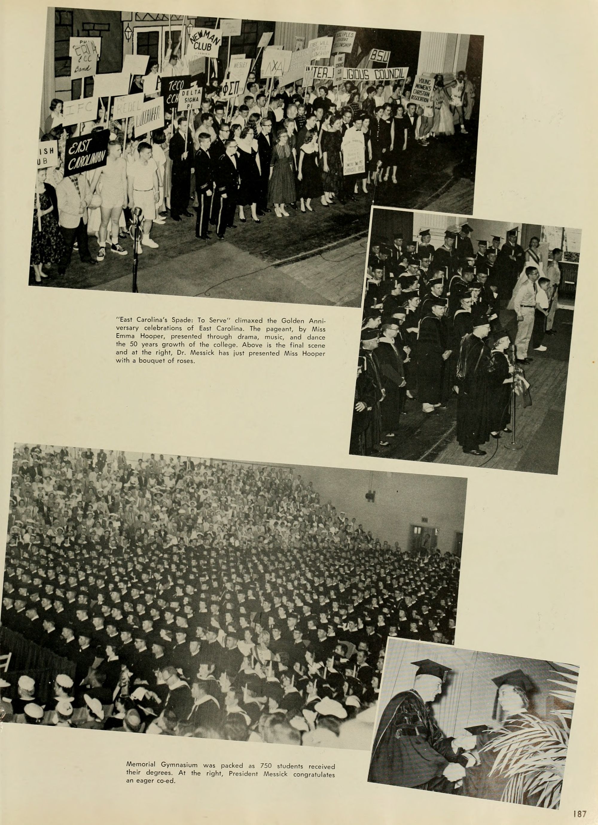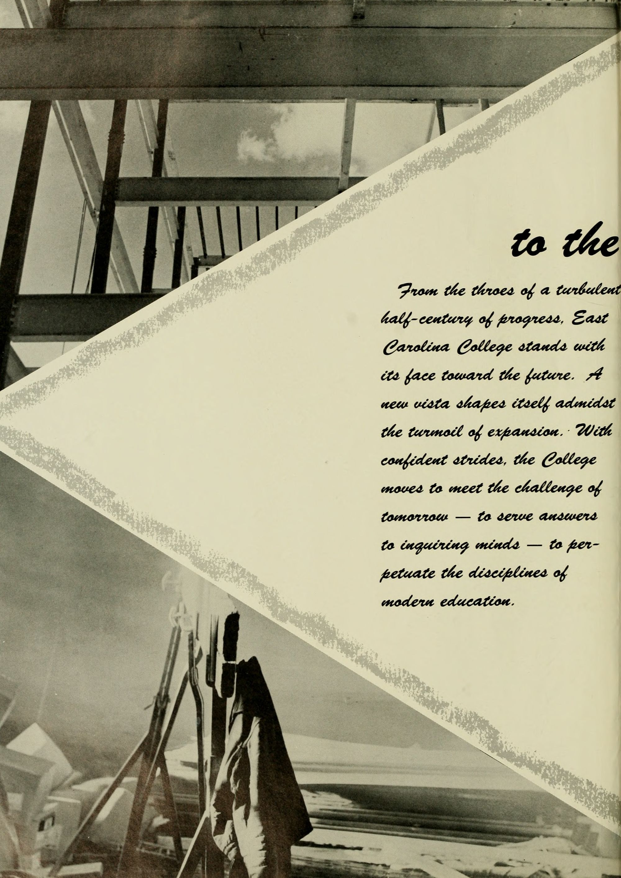 From the throes of a turbulent half-century of progress, East Carolina College stands with its face toward the future. A new vista shapes itself admist the turmoil of expansion. With confident strides, the College moves to meet the challenge of tomorrow--to serve answers to inquiring minds--to perpetuate the disciplines of modern education.