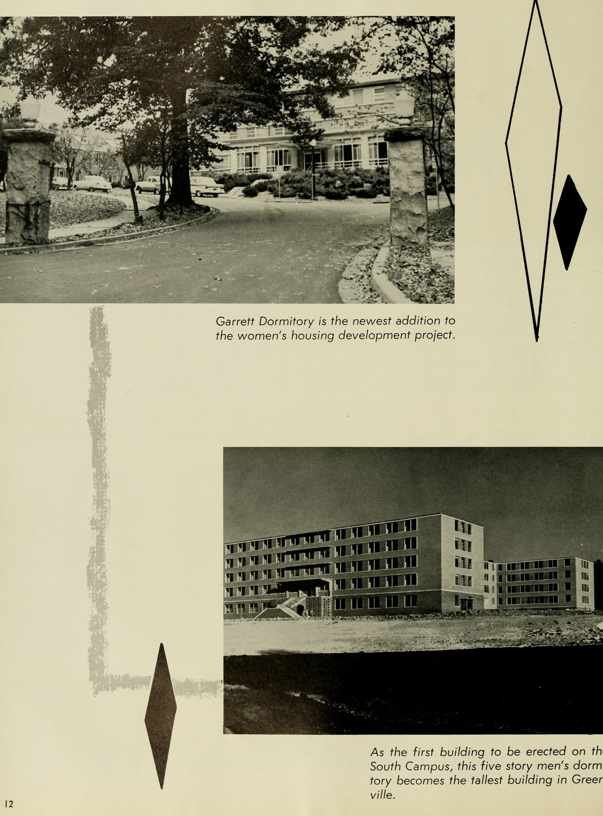 As the first building to be erected on th South Campus, this five story men's dormitory becomes the tallest building in Greenville.