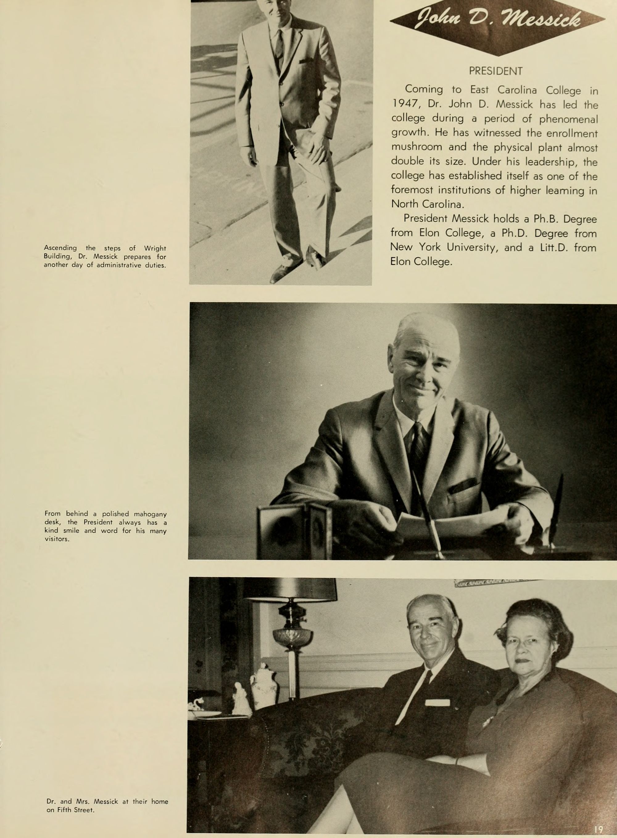 Coming to East Carolina College in 1947, Dr. John D. Messick has led the college during a period of phenomenal growth. He has witnessed the enrollment mushroom and the physical plant almost double its size. Under his leadership, the college has established itself as one of the foremost institutions of higher learning in North Carolina.
