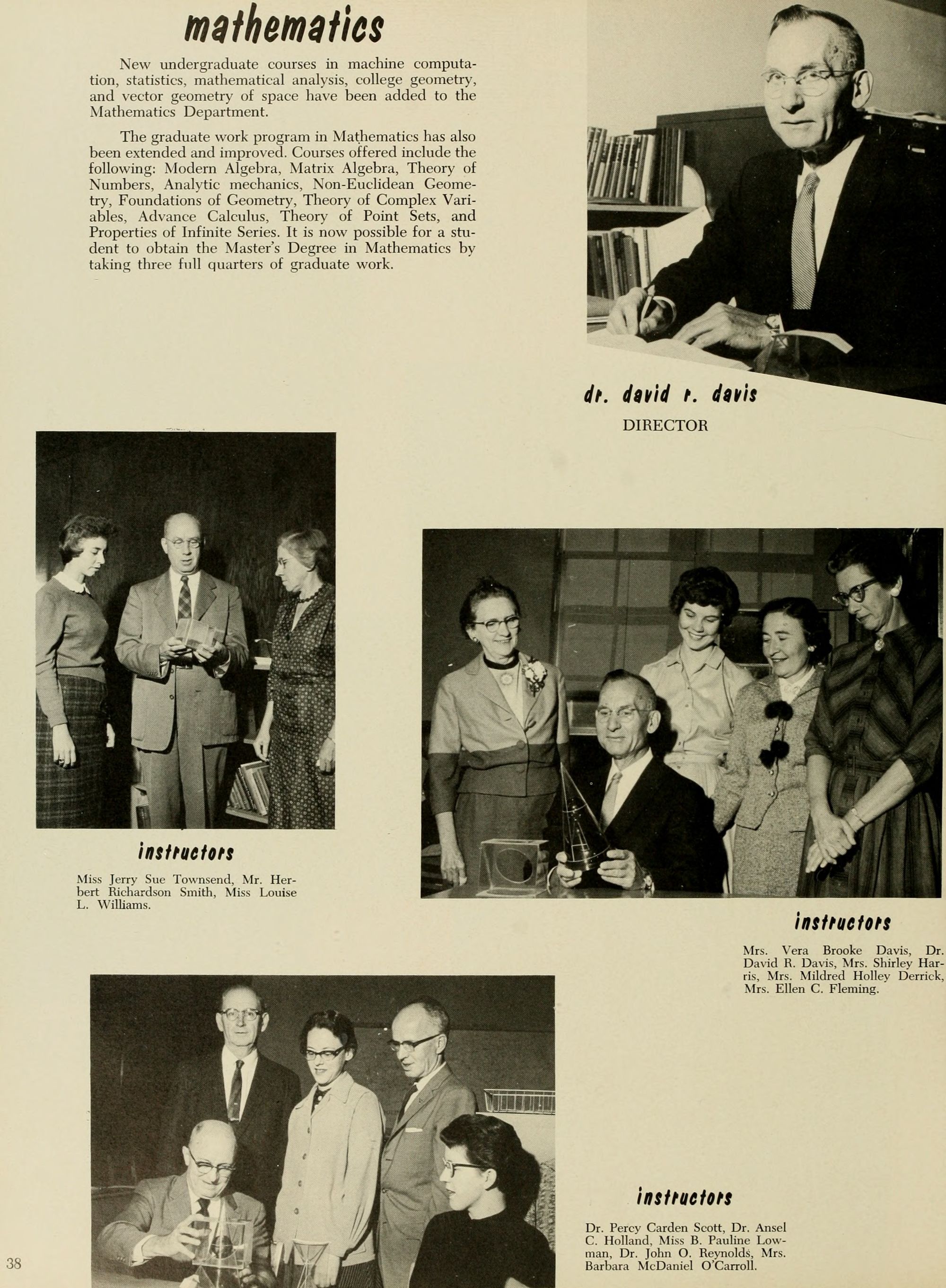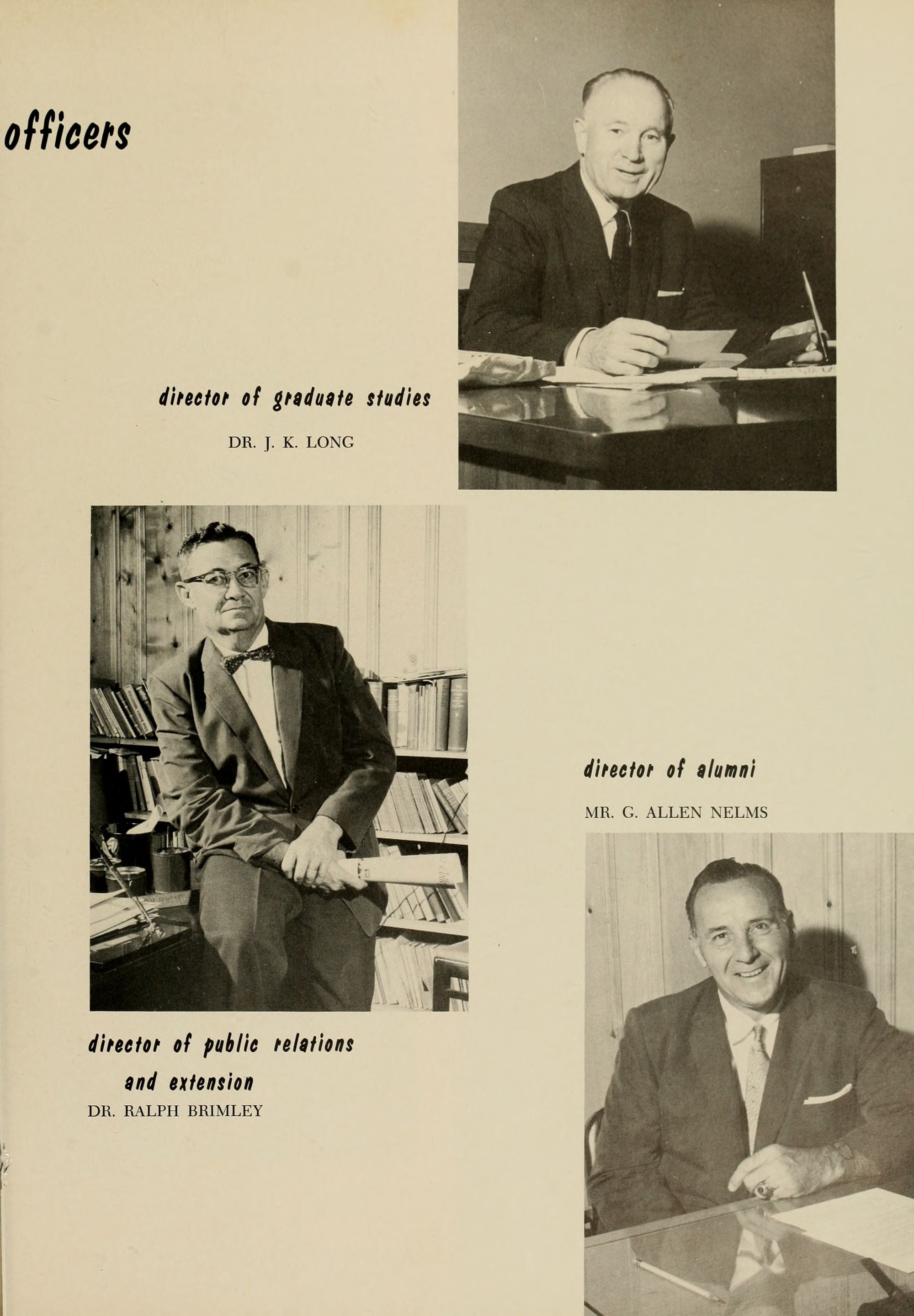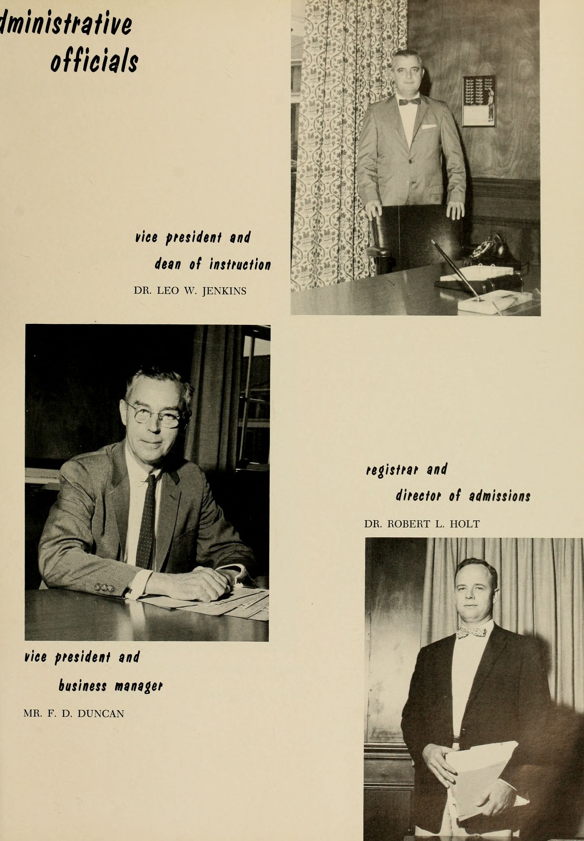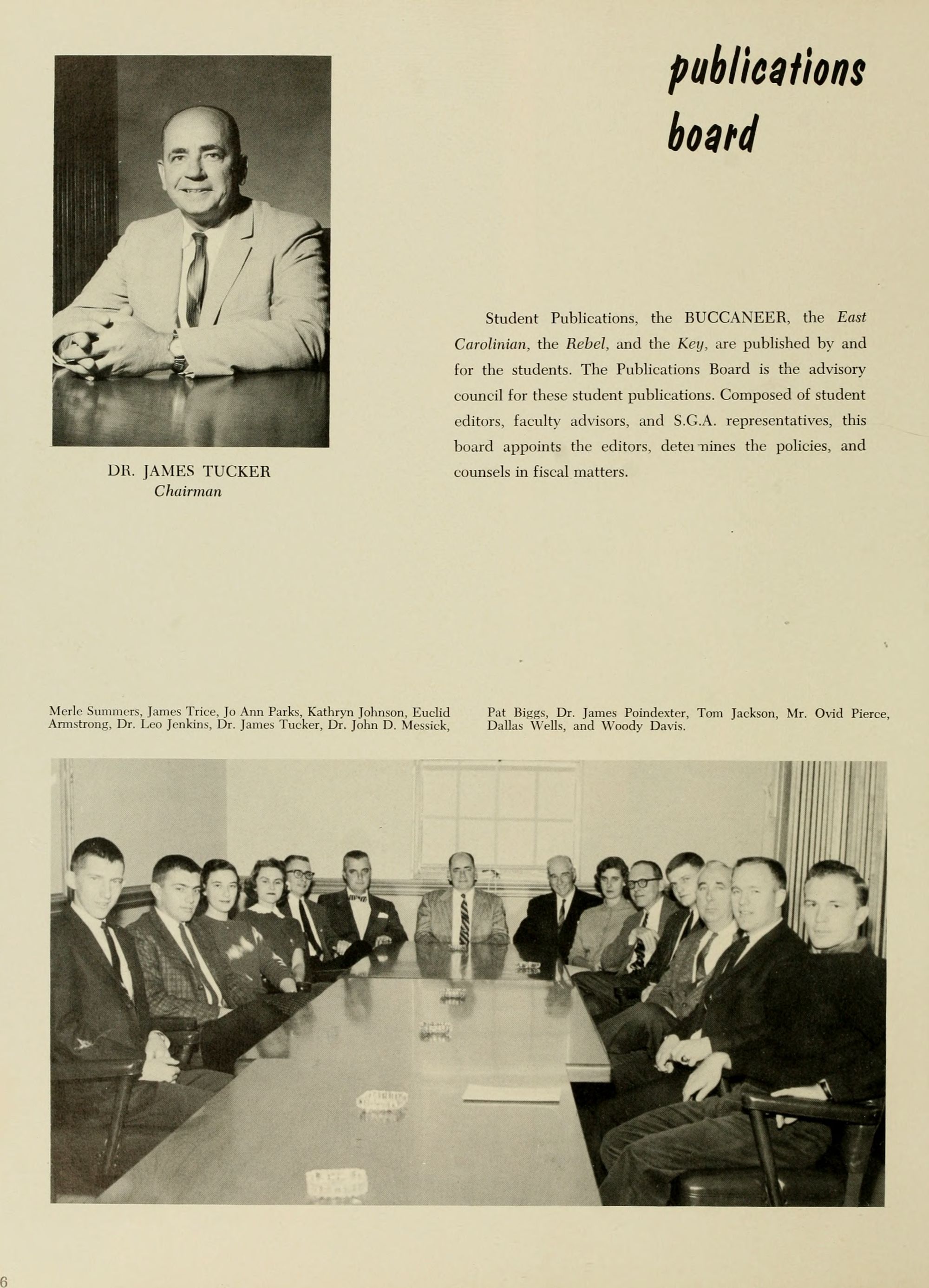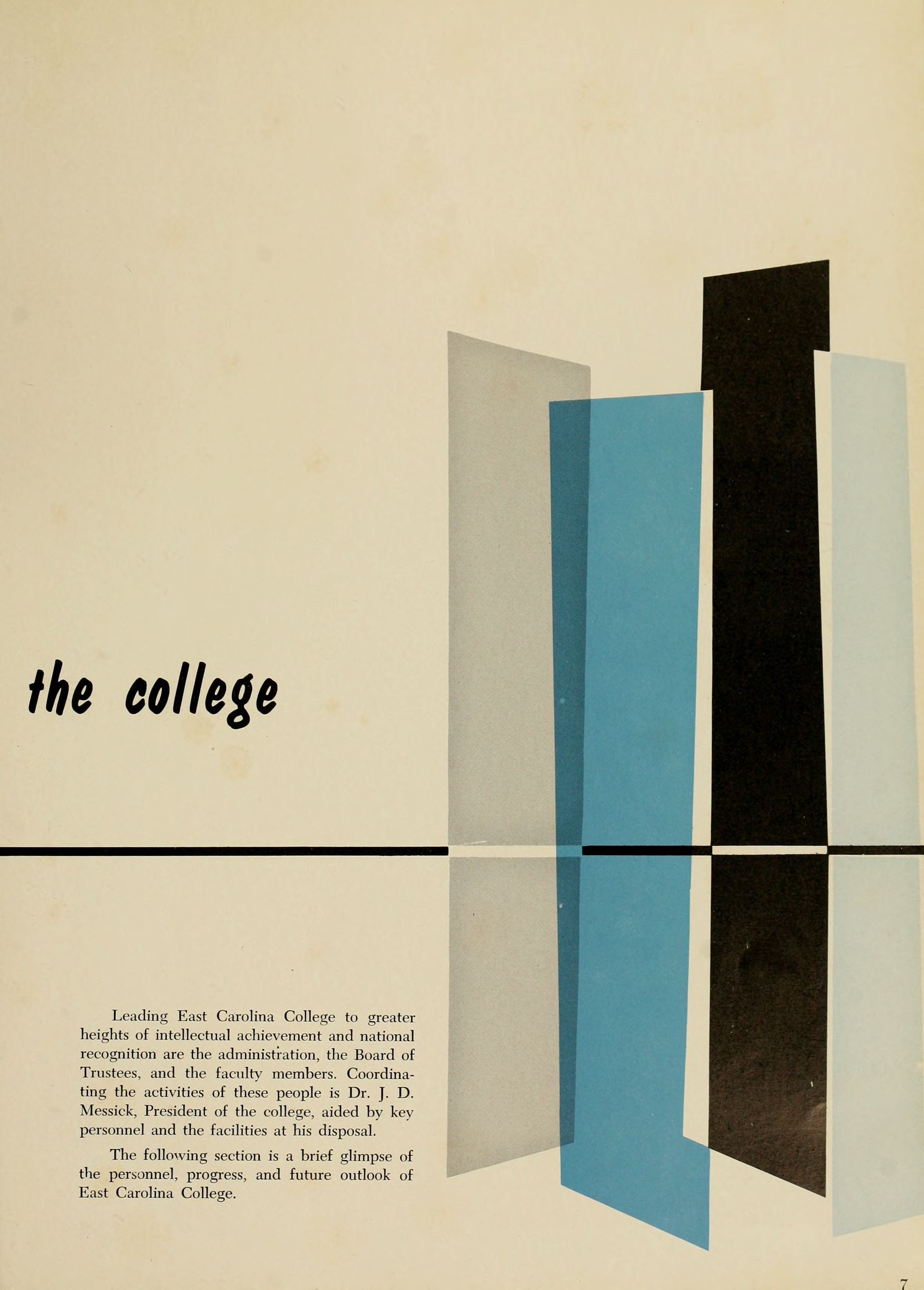 Leading East Carolina College to greater heights of intellectual achievement and national recognition are the administration, the Board of Trustees, and the faculty members. Coordina- ting the activities of these people is Dr. J. D. Messick, President of the college, aided by key personnel and the facilities at his disposal.