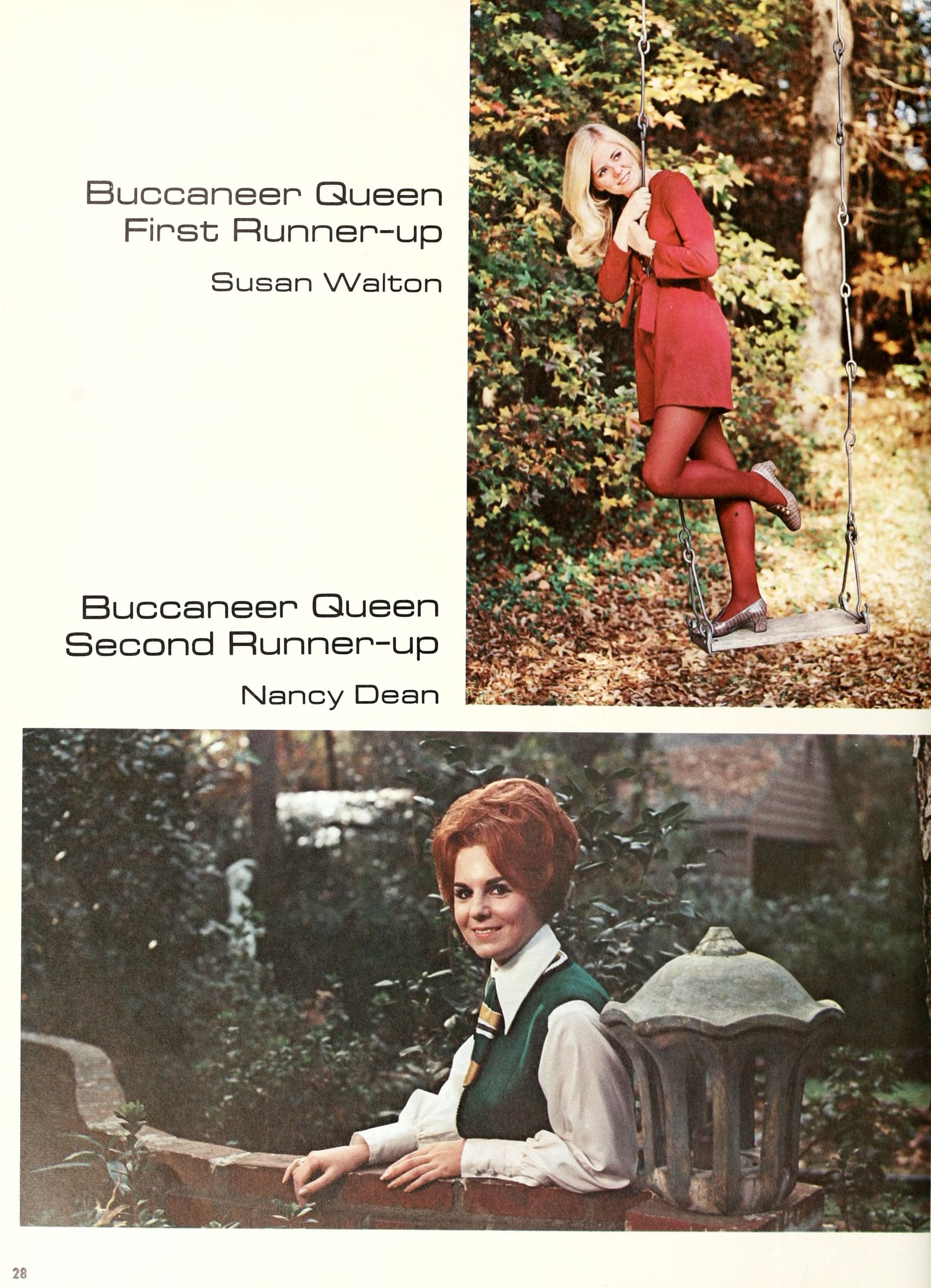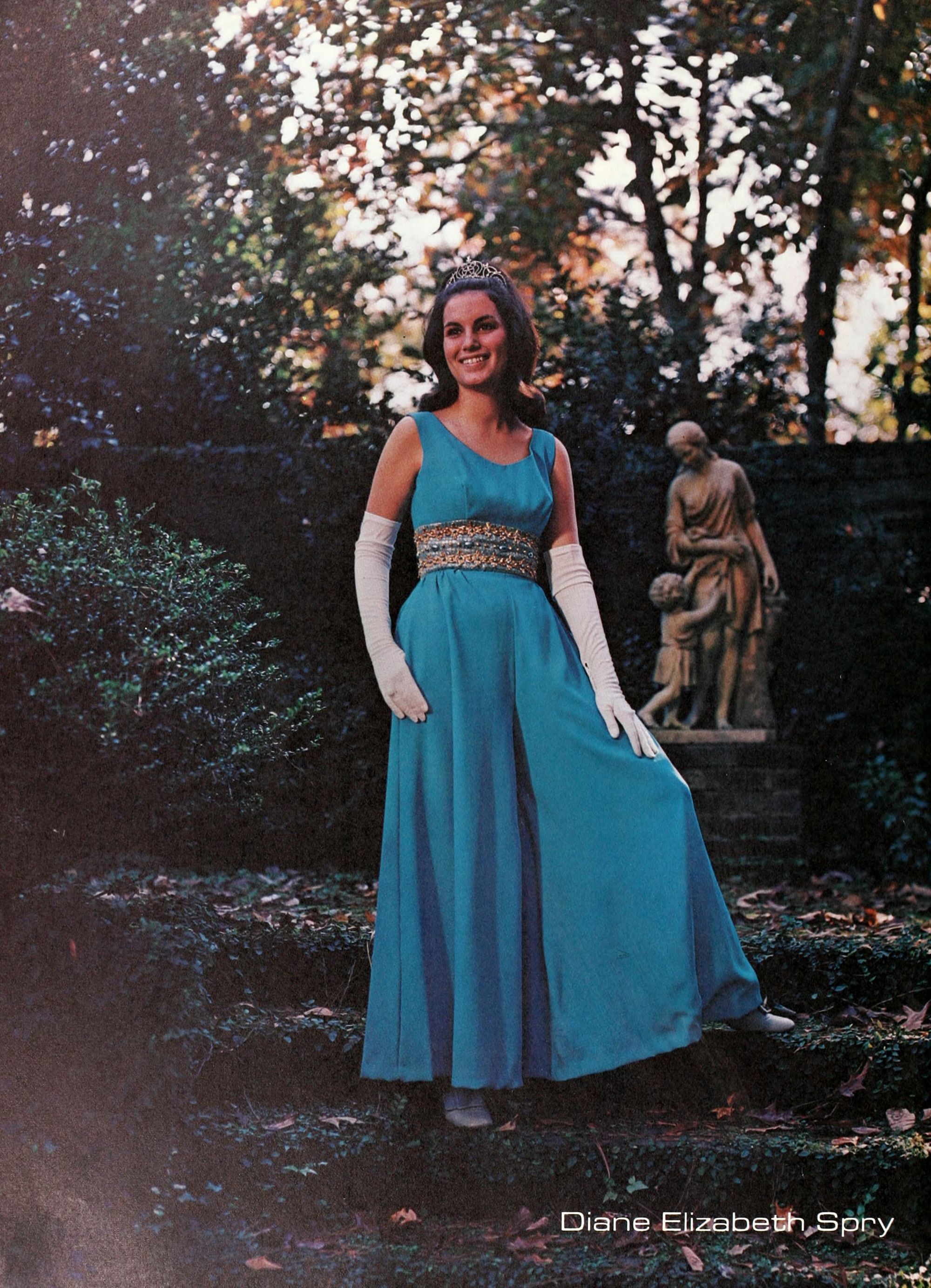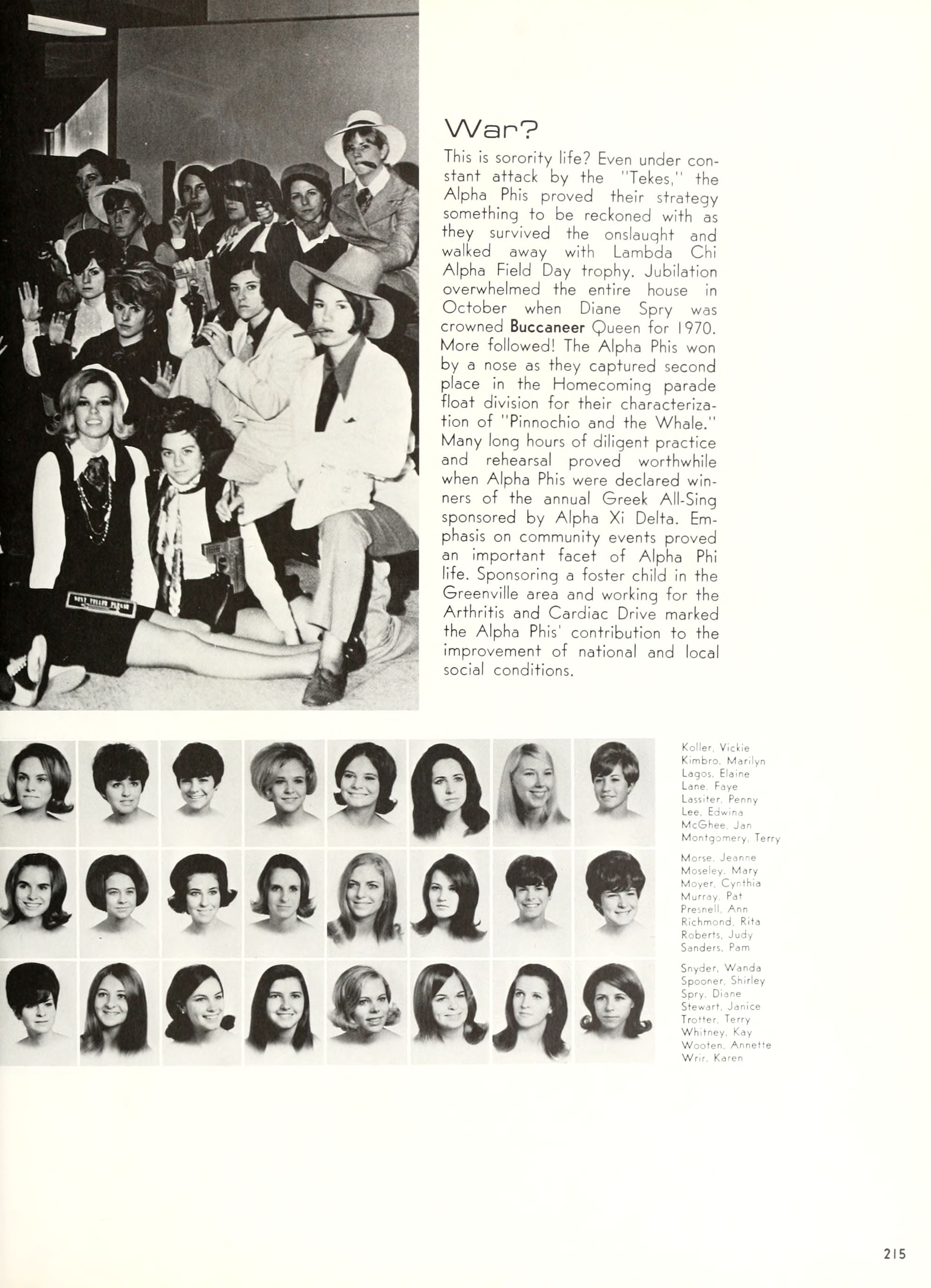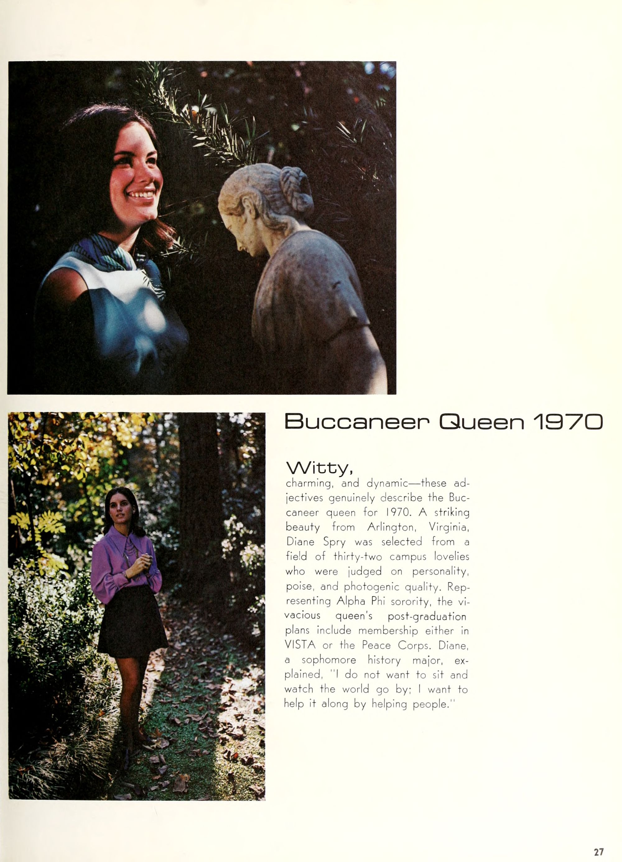 charming, and dynamic - these ad- jectives genuinely describe the Buc- caneer queen for 1970. A striking beauty from Arlington, Virginia, Diane Spry was selected from a field of thirty-two campus lovelies who were judged on personality, poise, and photogenic quality. Rep- resenting Alpha Phi sorority, the vi- vacious queen's post-graduation plans include membership either in VISTA or the Peace Corps. Diane, a sophomore history major, ex- plained, "I do not want to sit and watch the world go by; I want to help it along by helping people."