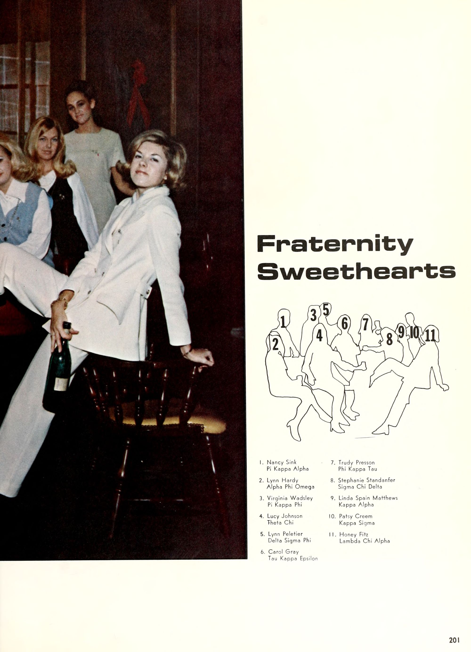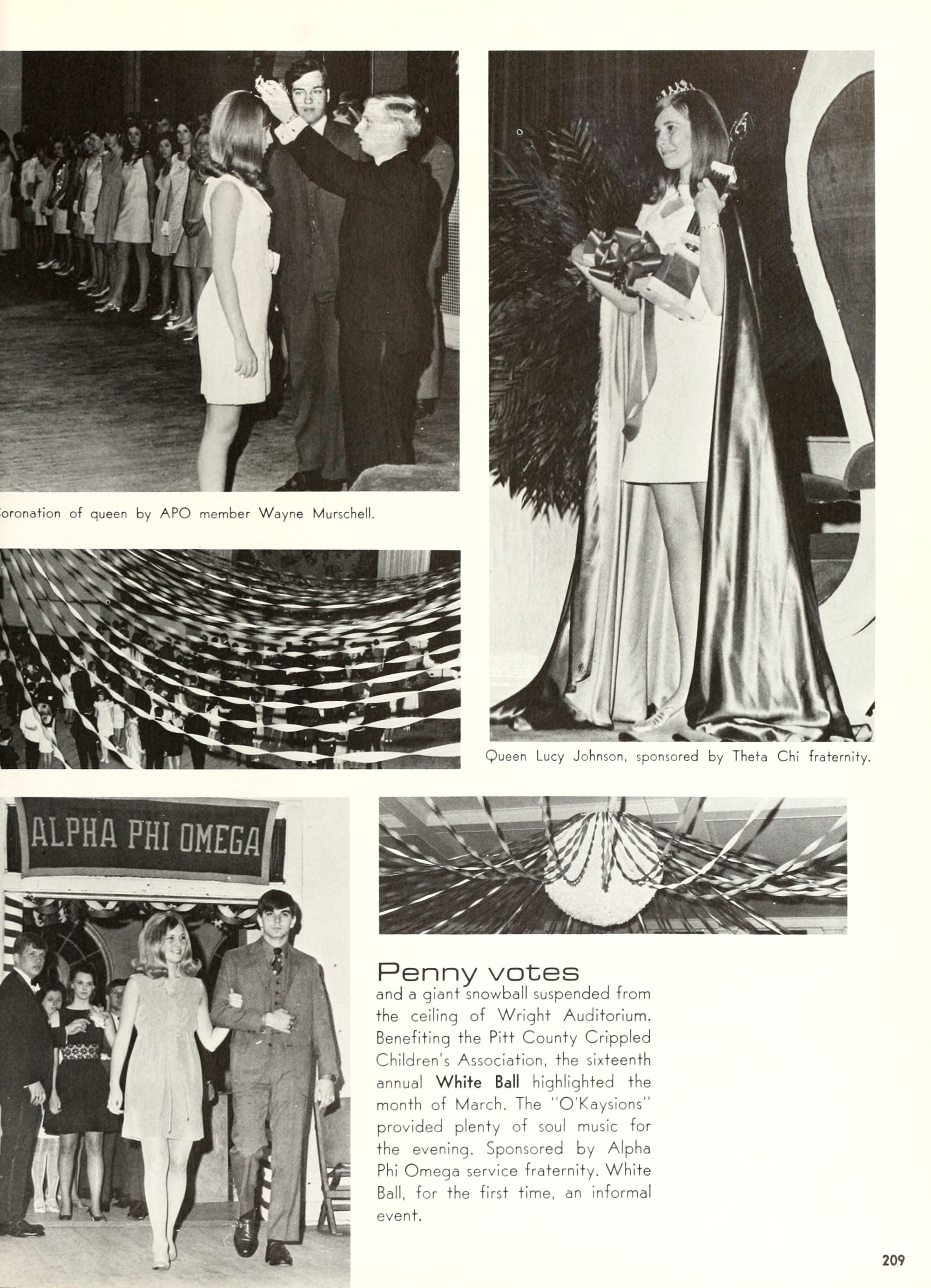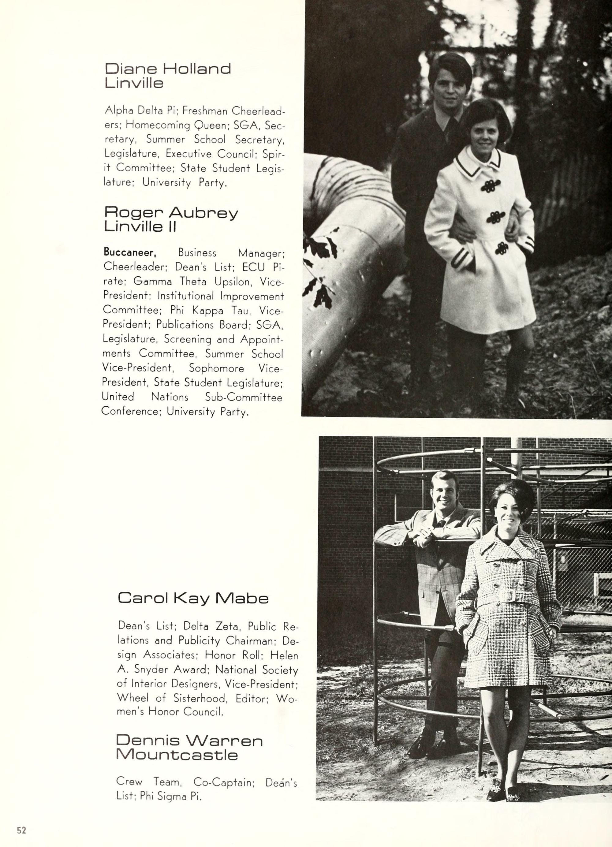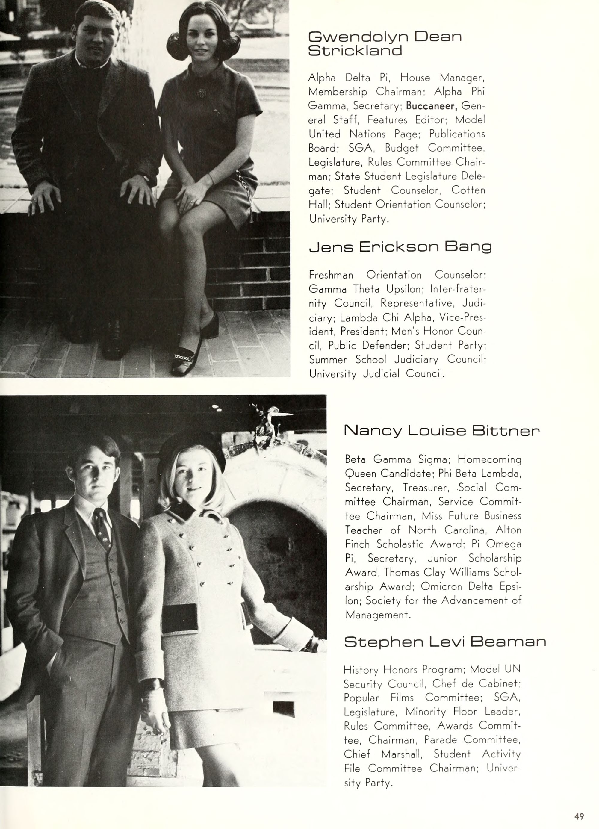 charming, and dynamic - these ad- jectives genuinely describe the Buc- caneer queen for 1970. A striking beauty from Arlington, Virginia, Diane Spry was selected from a field of thirty-two campus lovelies who were judged on personality, poise, and photogenic quality. Rep- resenting Alpha Phi sorority, the vi- vacious queen's post-graduation plans include membership either in VISTA or the Peace Corps. Diane, a sophomore history major, ex- plained, "I do not want to sit and watch the world go by; I want to help it along by helping people."