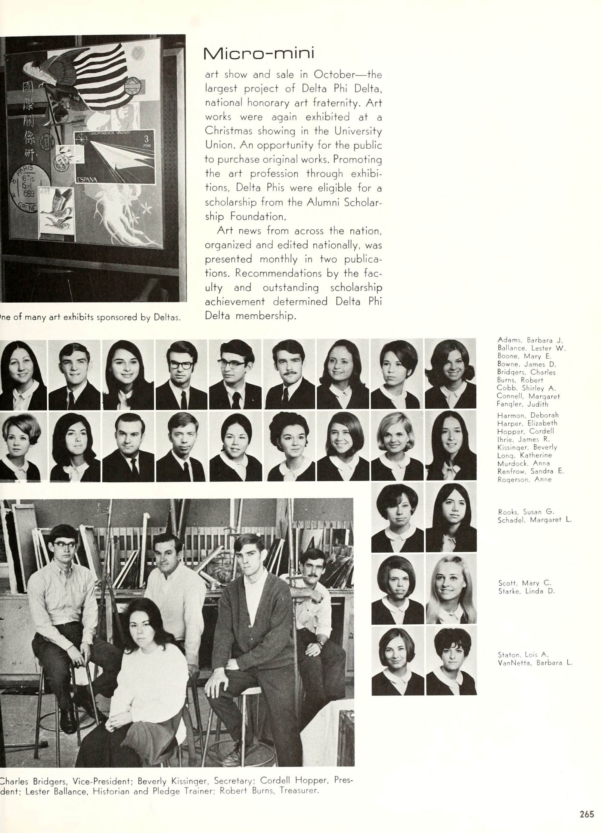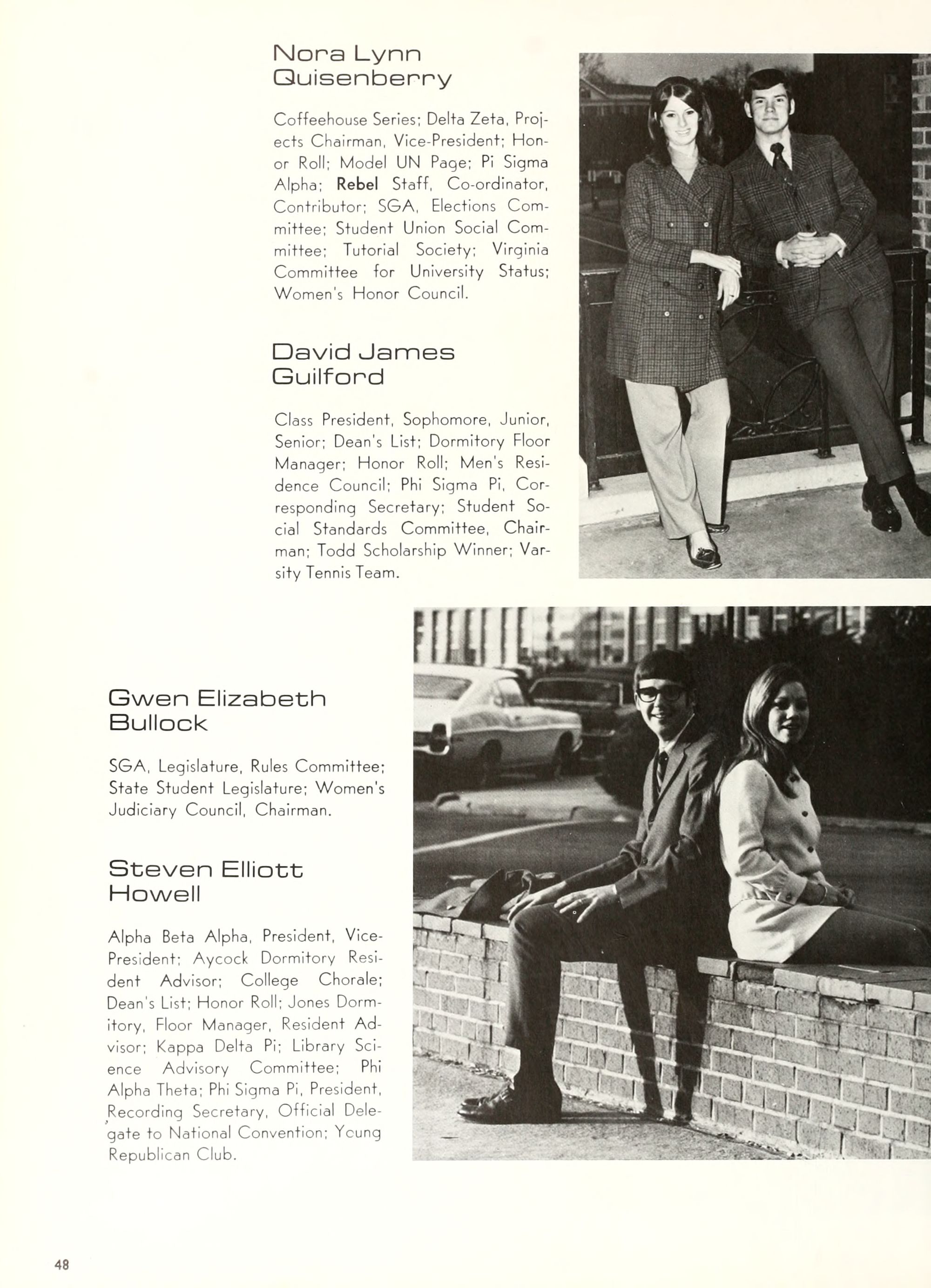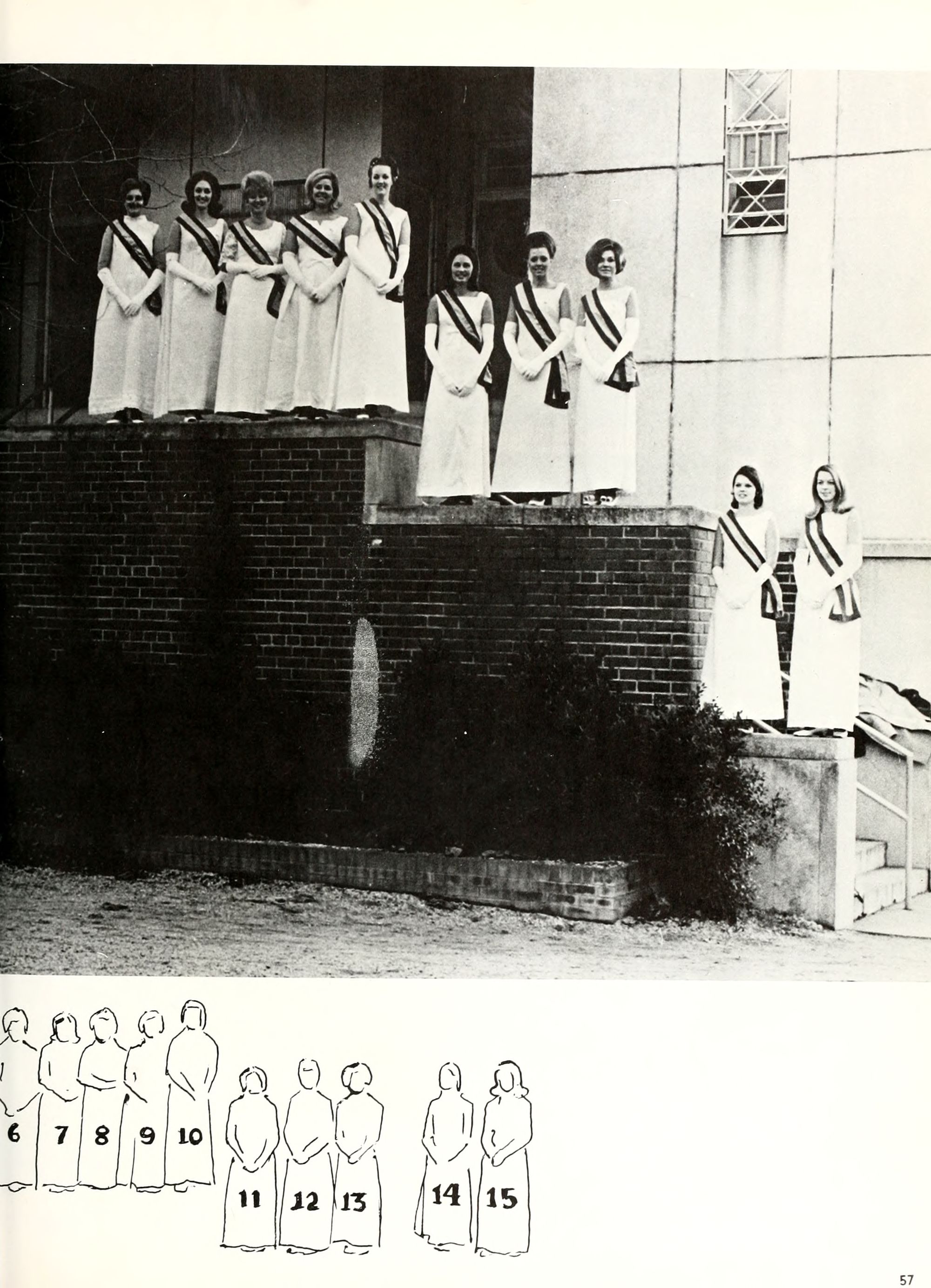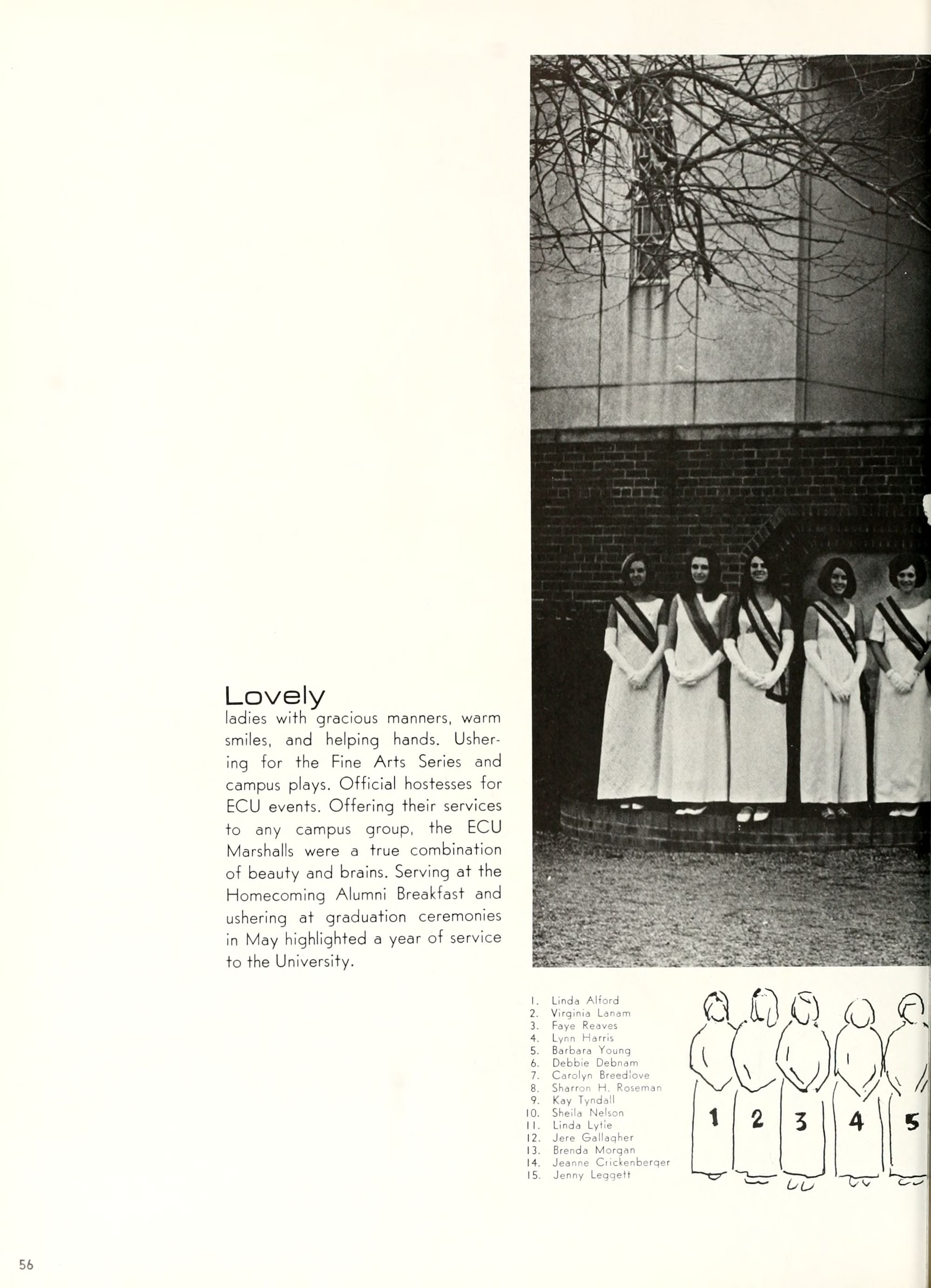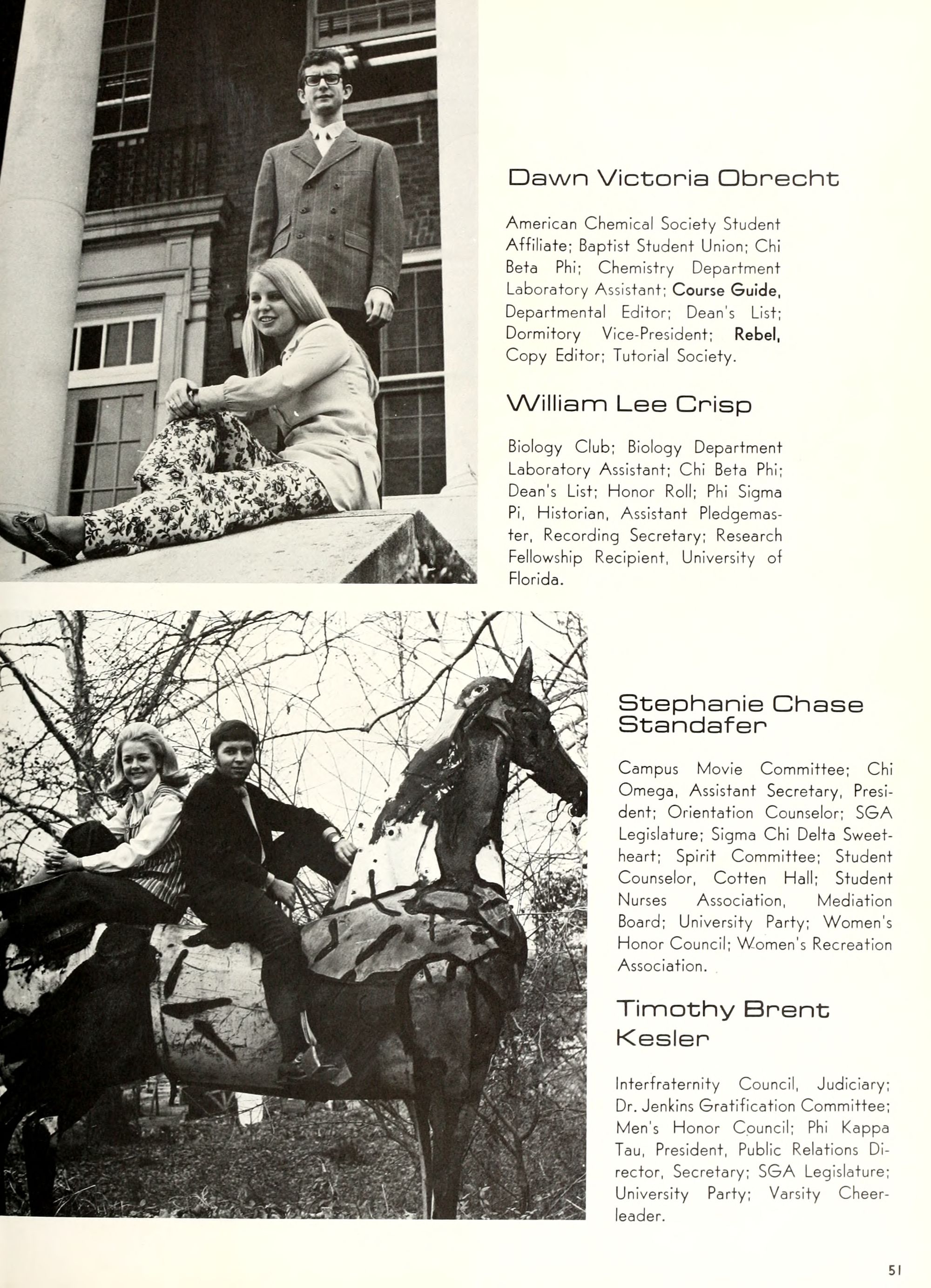 charming, and dynamic - these ad- jectives genuinely describe the Buc- caneer queen for 1970. A striking beauty from Arlington, Virginia, Diane Spry was selected from a field of thirty-two campus lovelies who were judged on personality, poise, and photogenic quality. Rep- resenting Alpha Phi sorority, the vi- vacious queen's post-graduation plans include membership either in VISTA or the Peace Corps. Diane, a sophomore history major, ex- plained, "I do not want to sit and watch the world go by; I want to help it along by helping people."