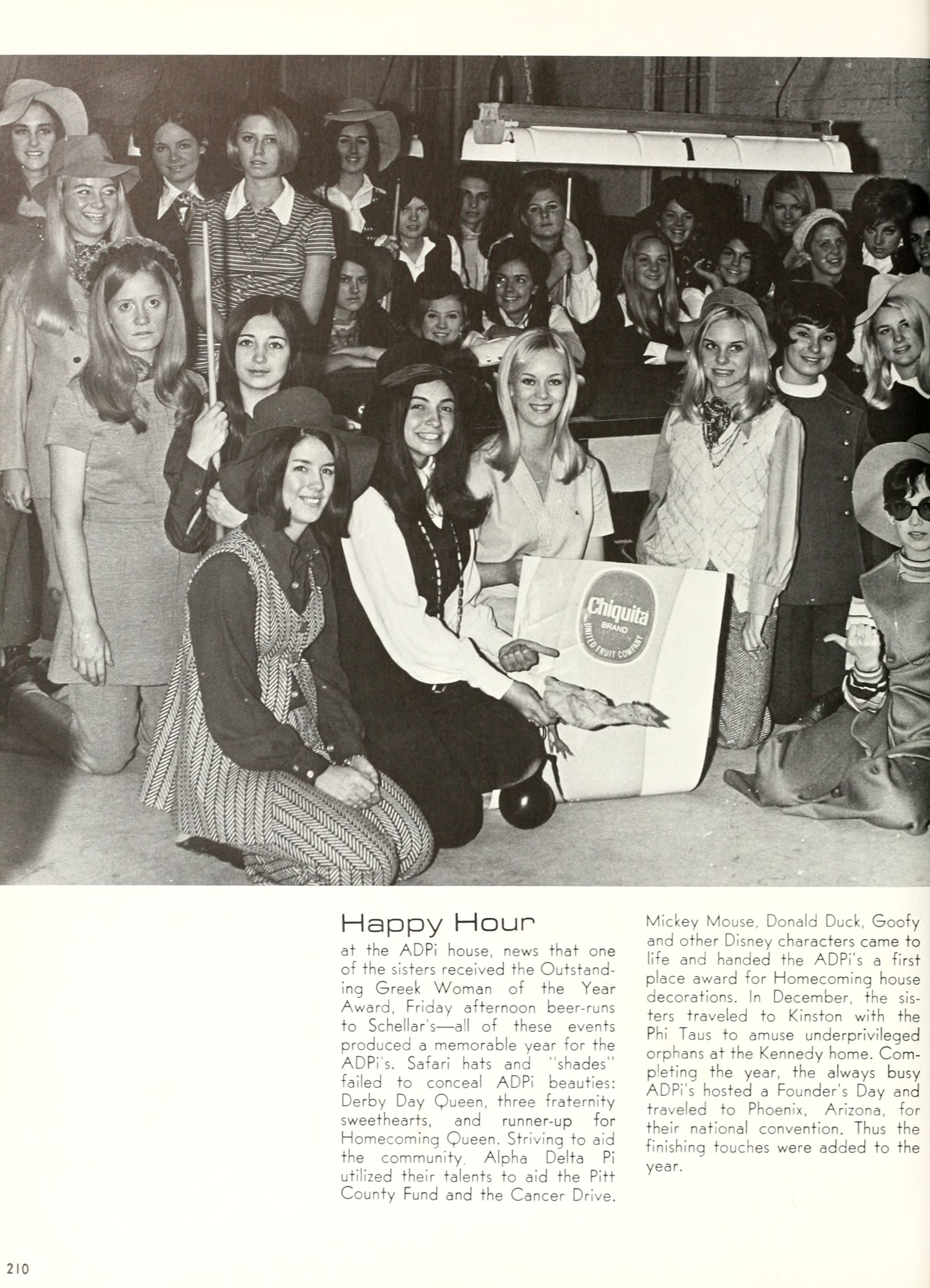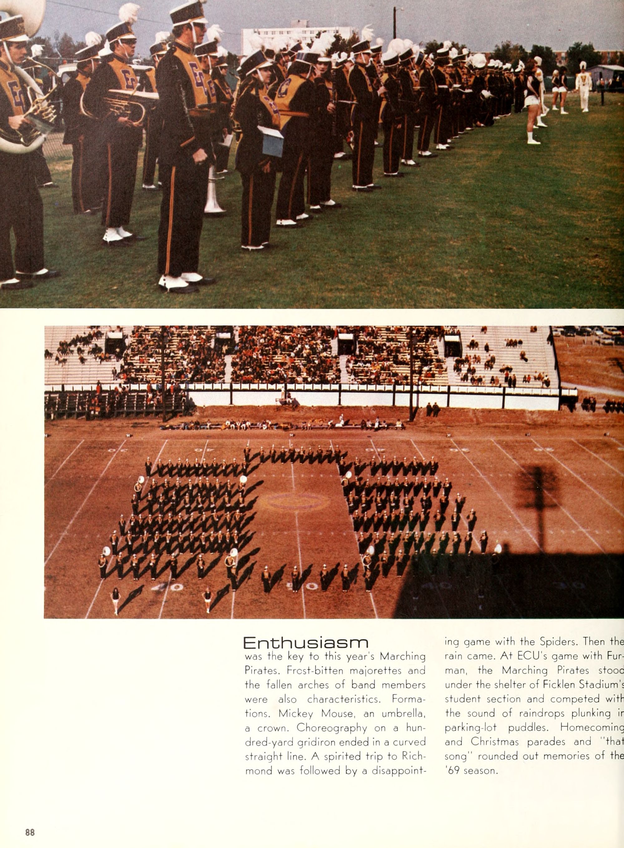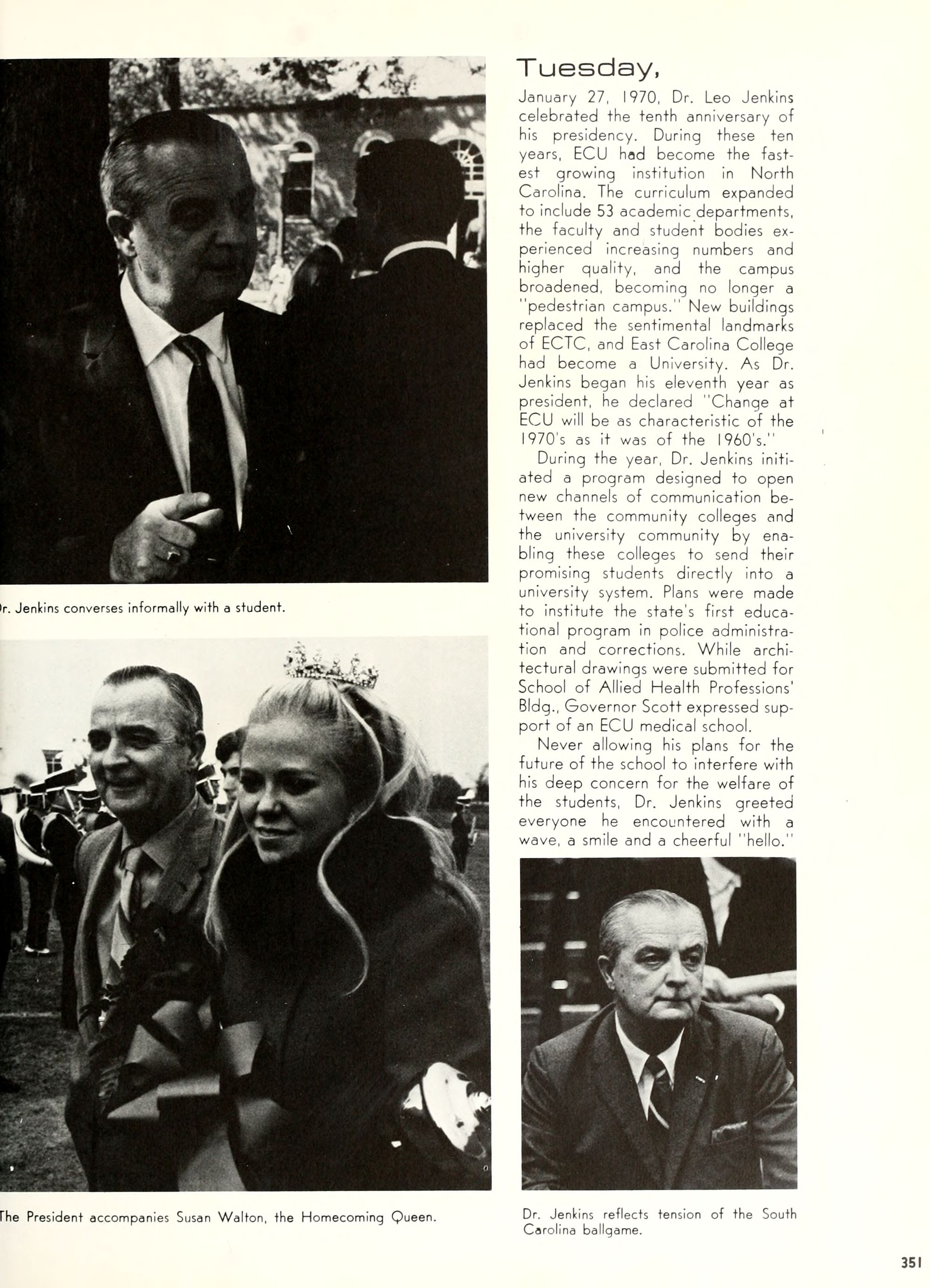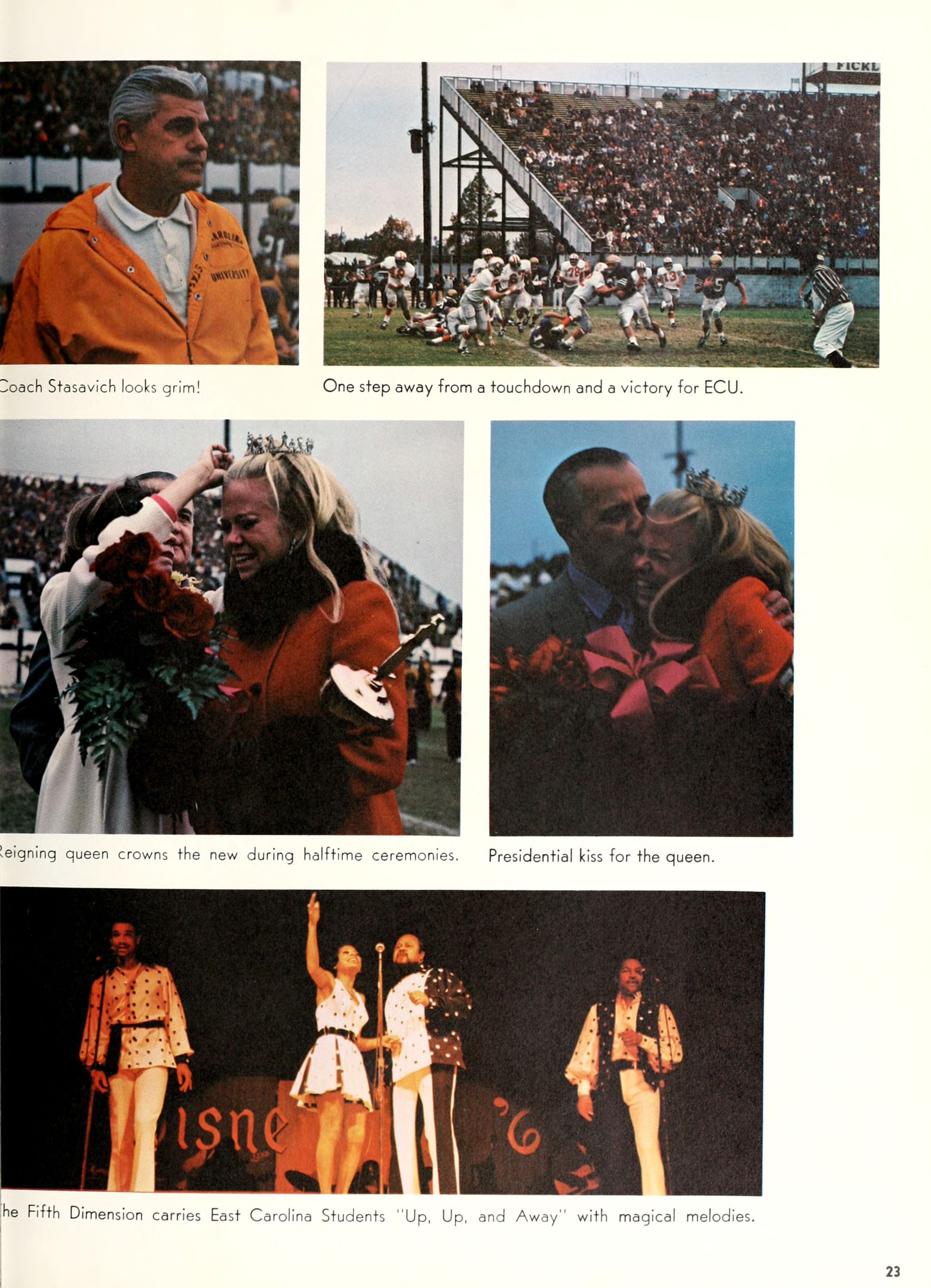 Donald Duck, and Goofy. Plenty of sunshine, color, and happiness. Empty bottles of "Rebel Yell" and "Seagram's 7." hHome- coming, requiring hundreds of hours of dedi- cated preparation, provided ECU with a spectacle of color and enthusiasm unparal- leled by any previous campus event. Con- certs by Dionne Warwick and The Fifth Dimension overwhelmed more than 8,000 students and guests who literally packed in- to Minges Coliseum. Even when the David- son Wildcats came from behind to defeat the Pirates, enthusiasm remained high. Pin- nochio, Dumbo, Jiminy Cricket, and a host of other Disney characters transformed "Greater Groovy Greenville" into a fan- tasyland of animation. An endless array of sorority and fraternity house decorations stimulated the Imagination of everyone from six to sixty, hlomecoming 1970 proved the world a "carousel of color."