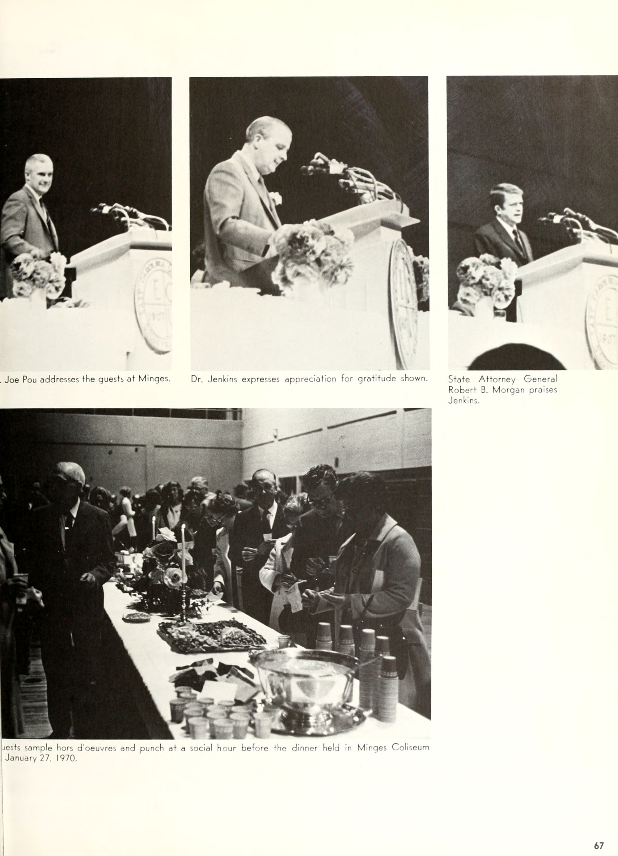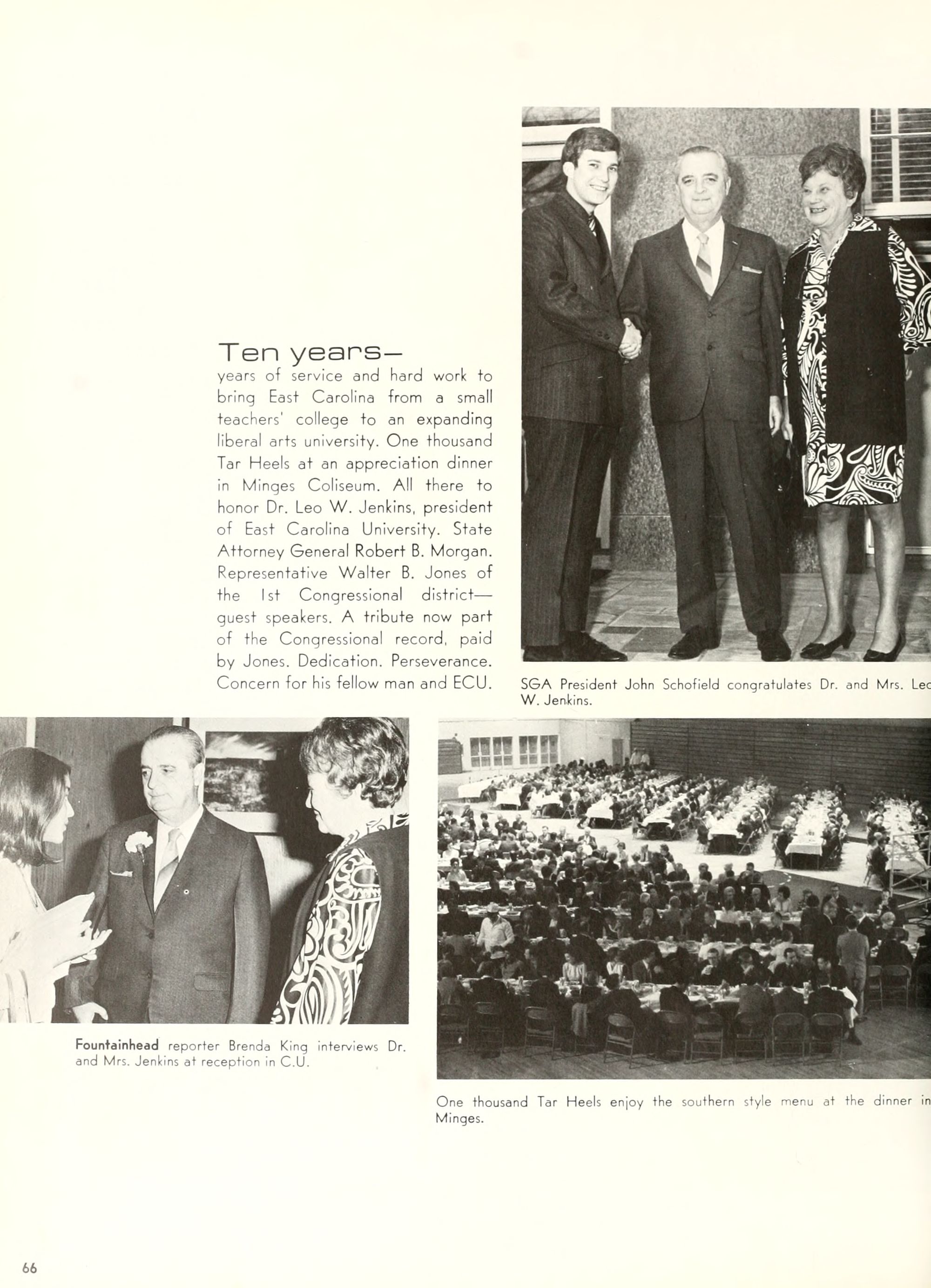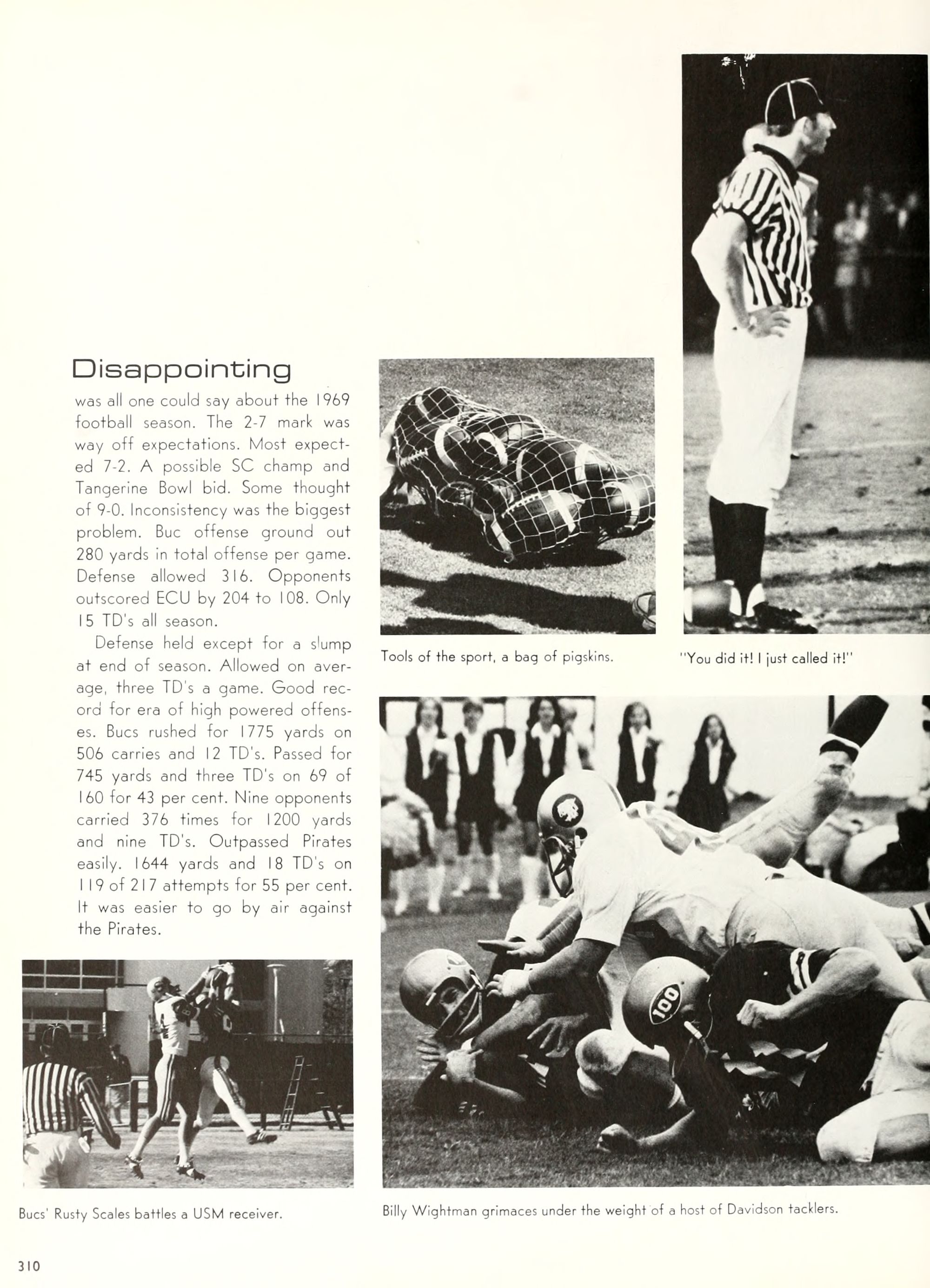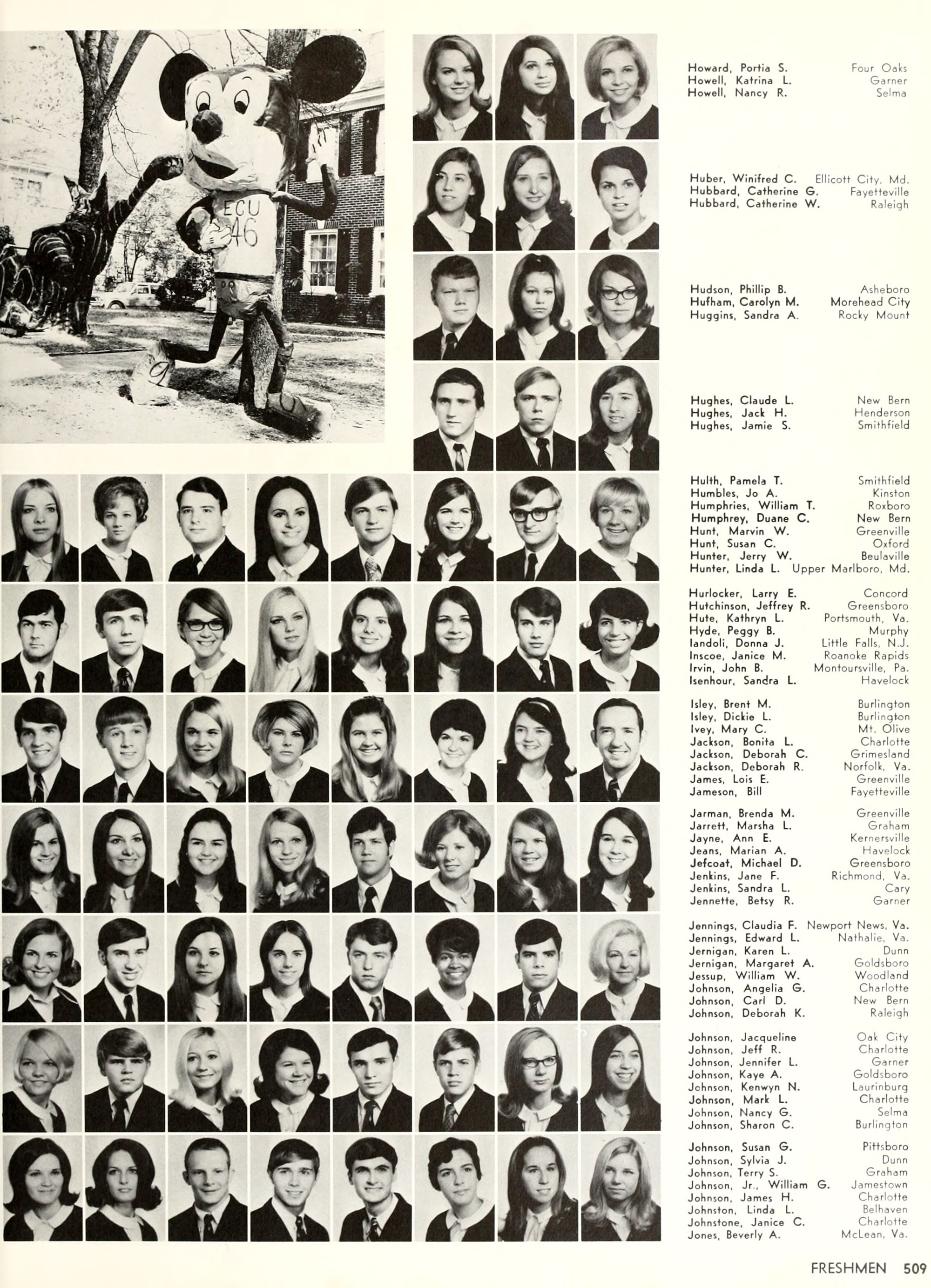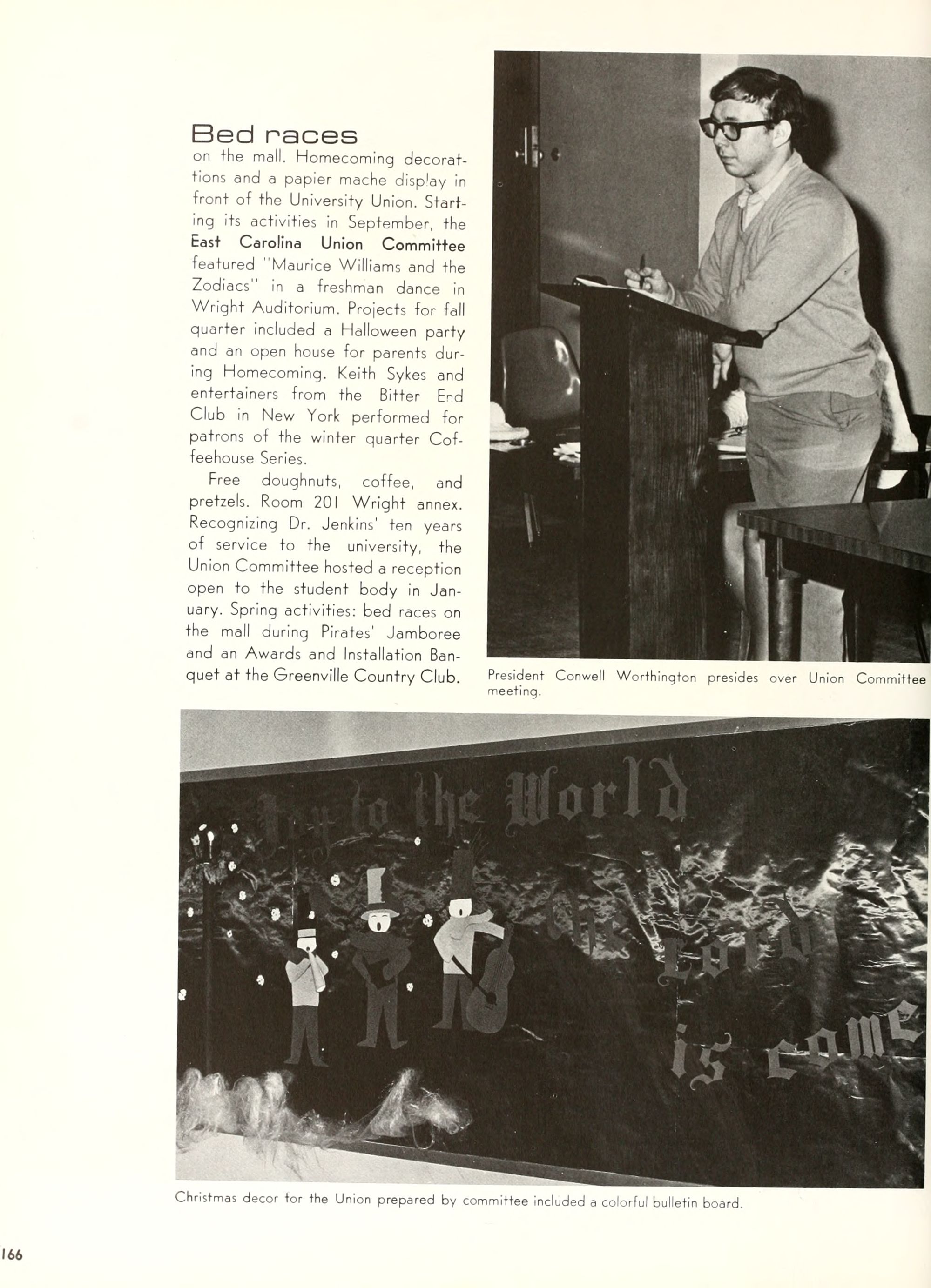 Donald Duck, and Goofy. Plenty of sunshine, color, and happiness. Empty bottles of "Rebel Yell" and "Seagram's 7." hHome- coming, requiring hundreds of hours of dedi- cated preparation, provided ECU with a spectacle of color and enthusiasm unparal- leled by any previous campus event. Con- certs by Dionne Warwick and The Fifth Dimension overwhelmed more than 8,000 students and guests who literally packed in- to Minges Coliseum. Even when the David- son Wildcats came from behind to defeat the Pirates, enthusiasm remained high. Pin- nochio, Dumbo, Jiminy Cricket, and a host of other Disney characters transformed "Greater Groovy Greenville" into a fan- tasyland of animation. An endless array of sorority and fraternity house decorations stimulated the Imagination of everyone from six to sixty, hlomecoming 1970 proved the world a "carousel of color."