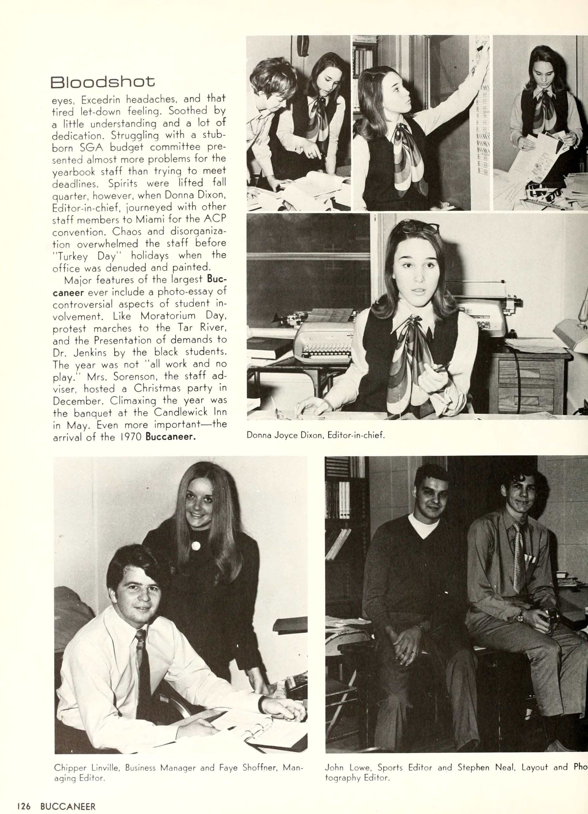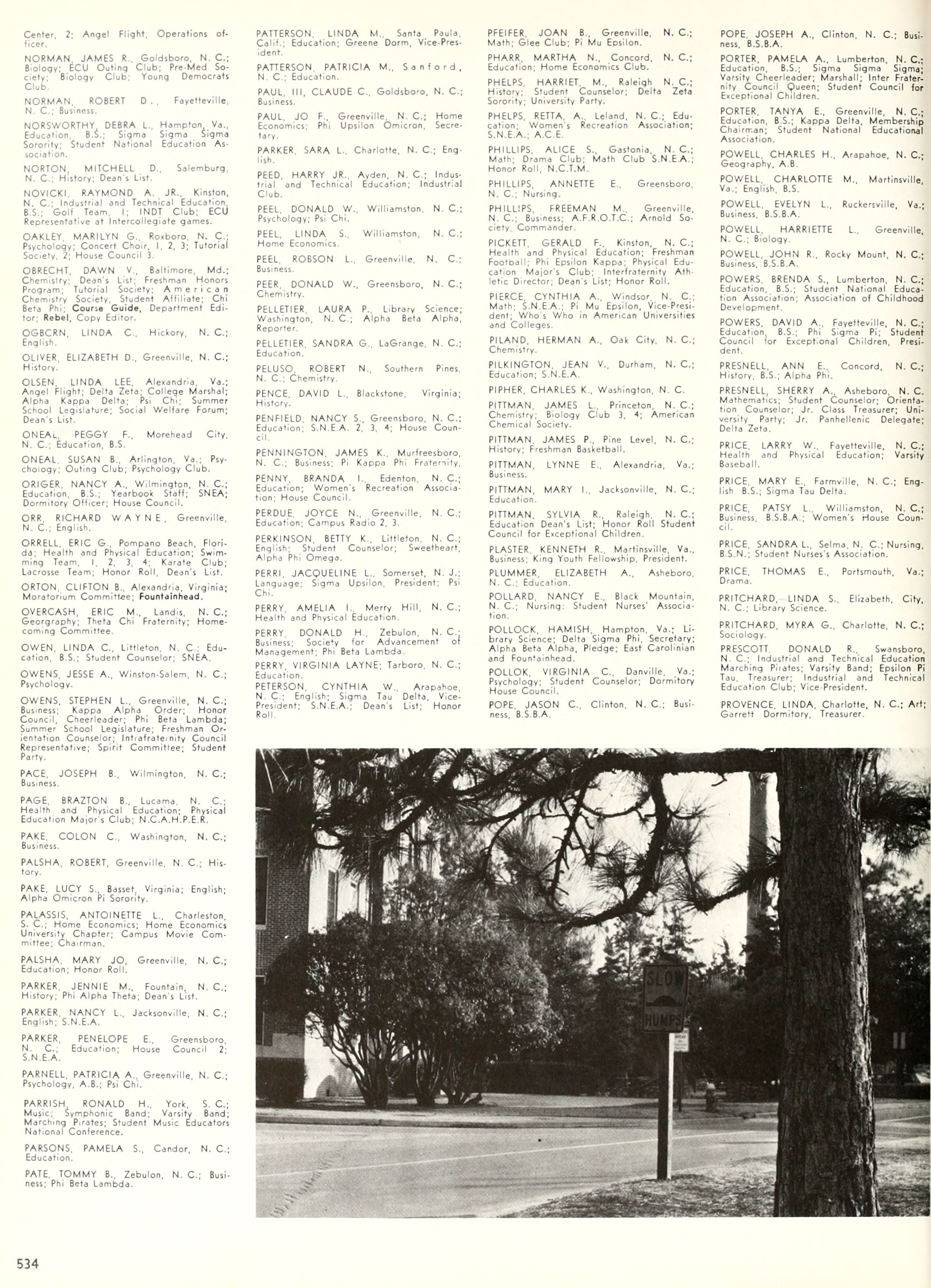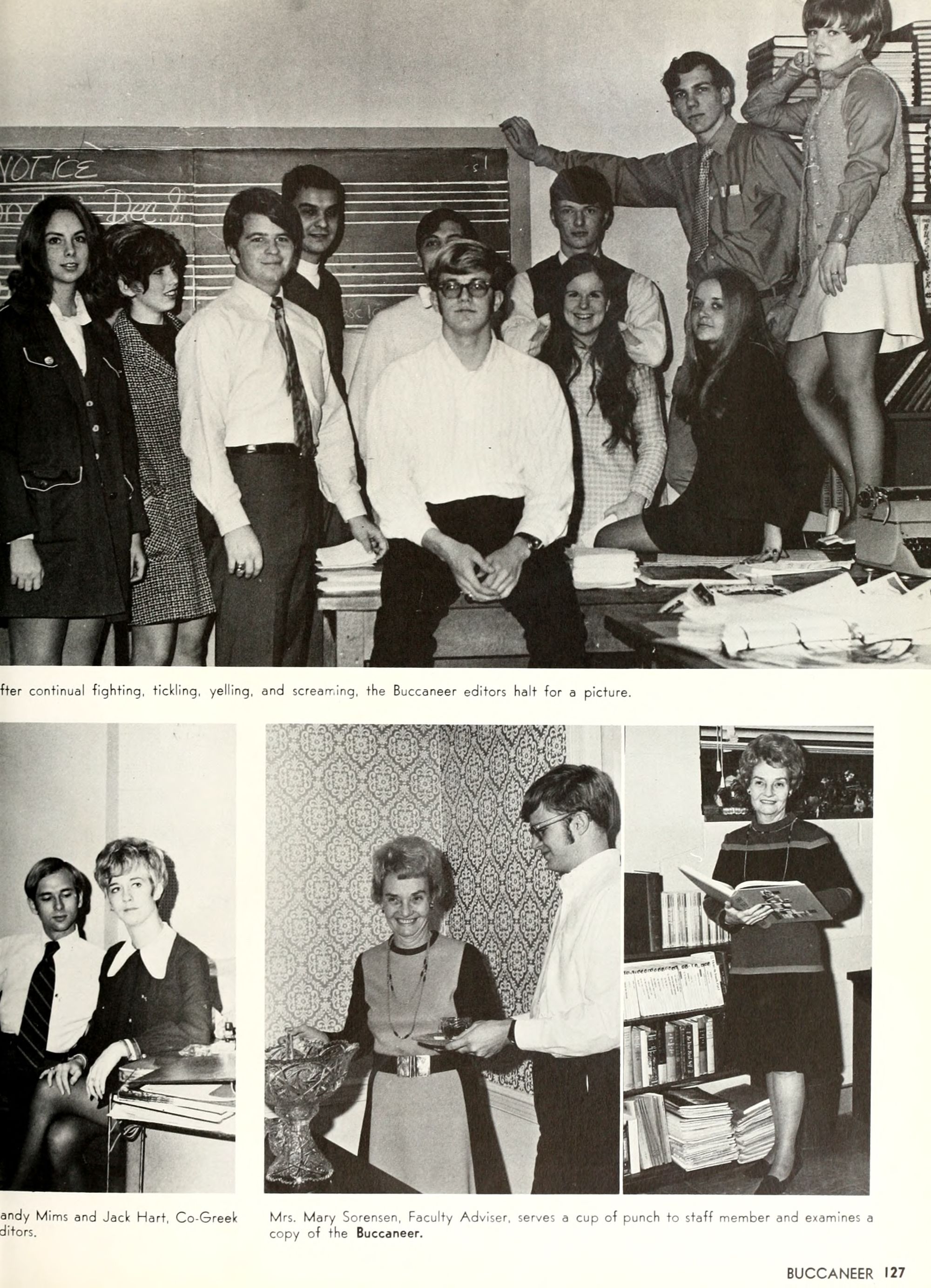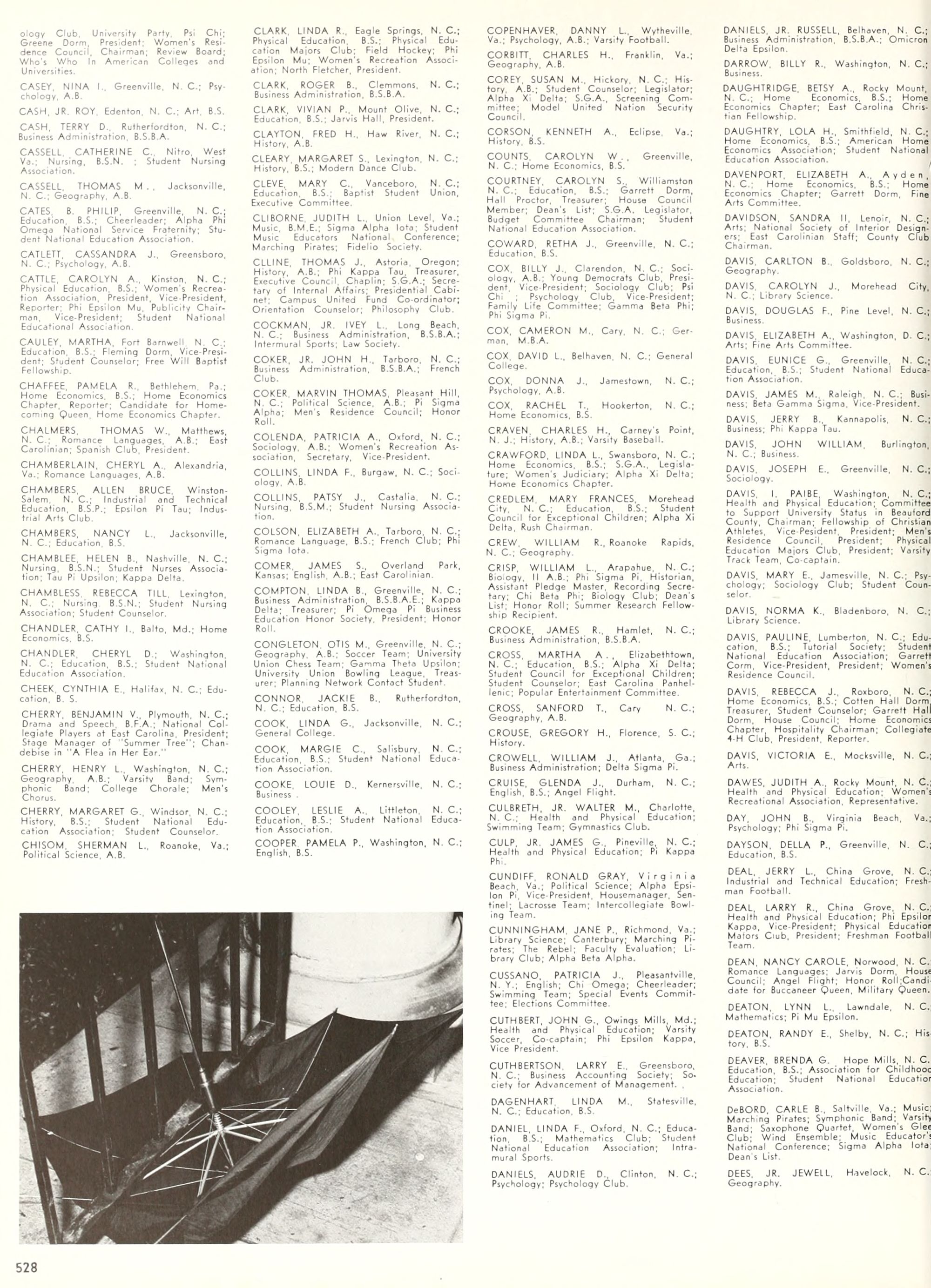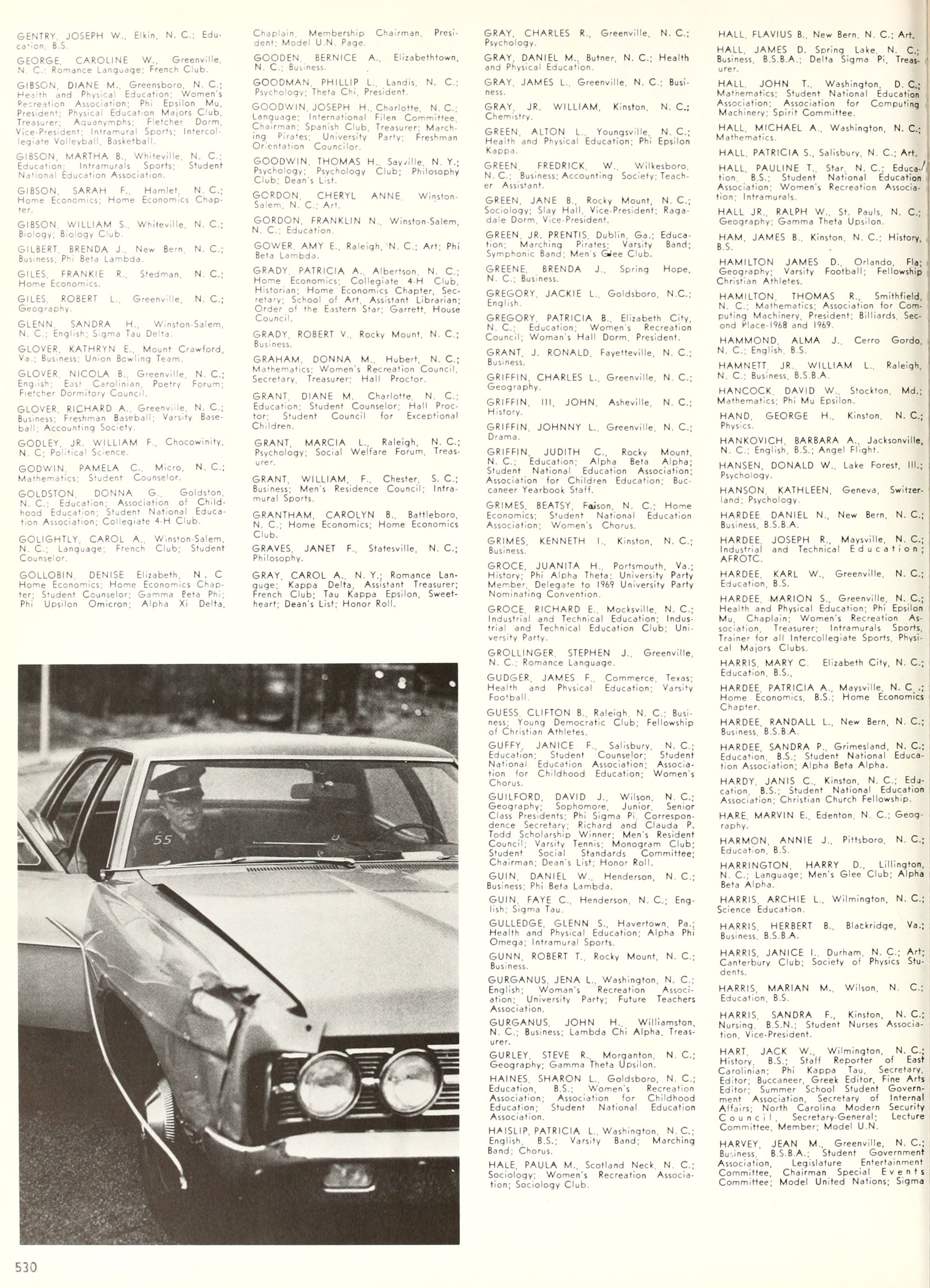 the car wreck on page 508 of the 1970 buccaneer is my mother's fault. she was driving the station wagon that hit the beetle and shoved it into the other car. she always blamed it on me. i was a little over 2 at the time. she said i started to fall over, because i was standing on the front seat, and she reached over to get me, causing her foot to come off the brake. it is family lore. she went on to teach dance at ecu for years. my dad was called out of work that day.