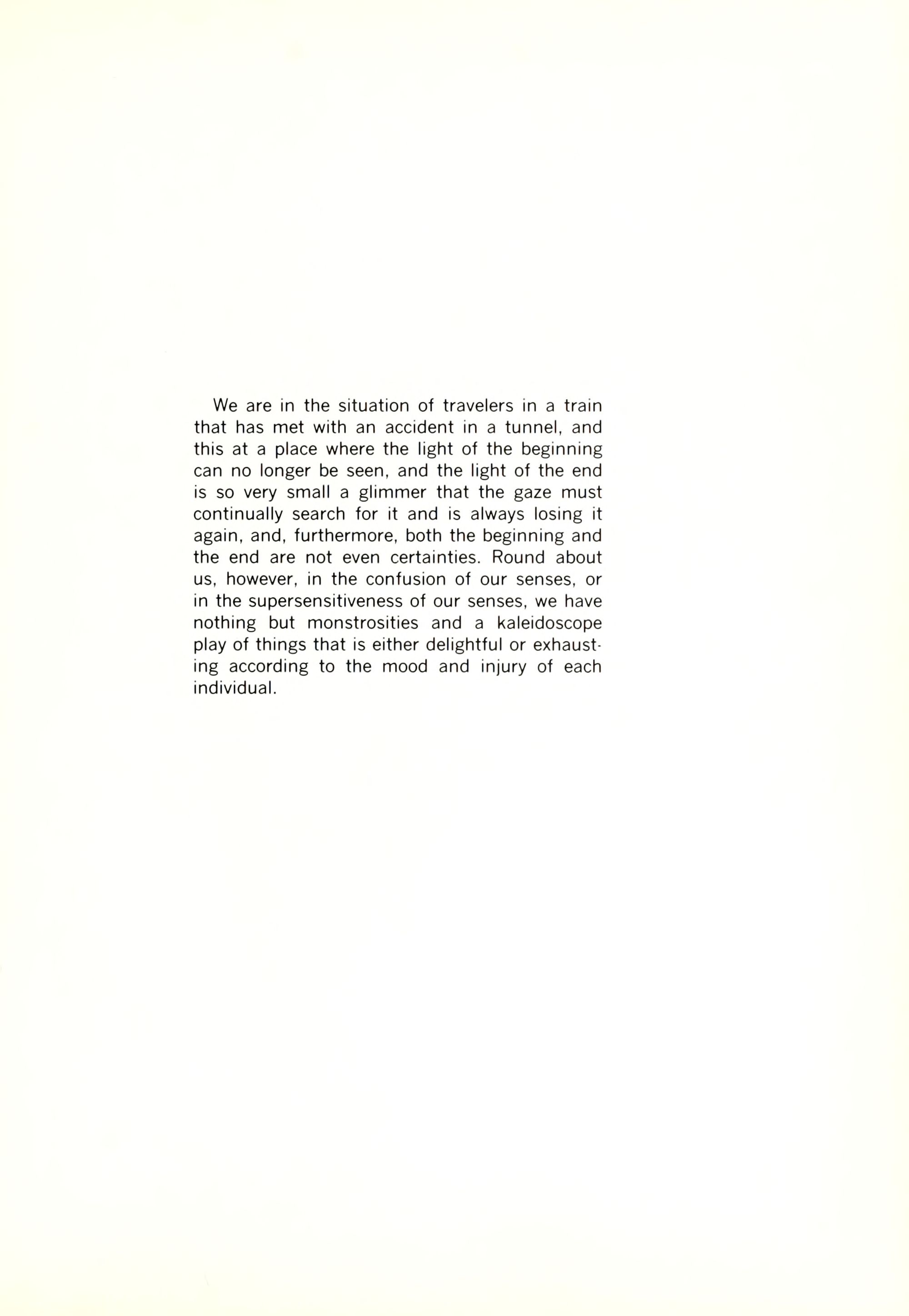 We are in the situation of travelers in a train that has met with an accident in a tunnel, and this at a place where the light of the beginning can no longer be seen, and the light of the end is so very small a glimmer that the gaze must continually search for it and is always losing it again, and, furthermore, both the beginning and the end are not even certainties. Round about us, however, in the confusion of our senses, or in the supersensitiveness of our senses, we have nothing but monstrosities and a kaleidoscope play of things that is either delightful or exhaust- ing according to the mood and injury of each individual.