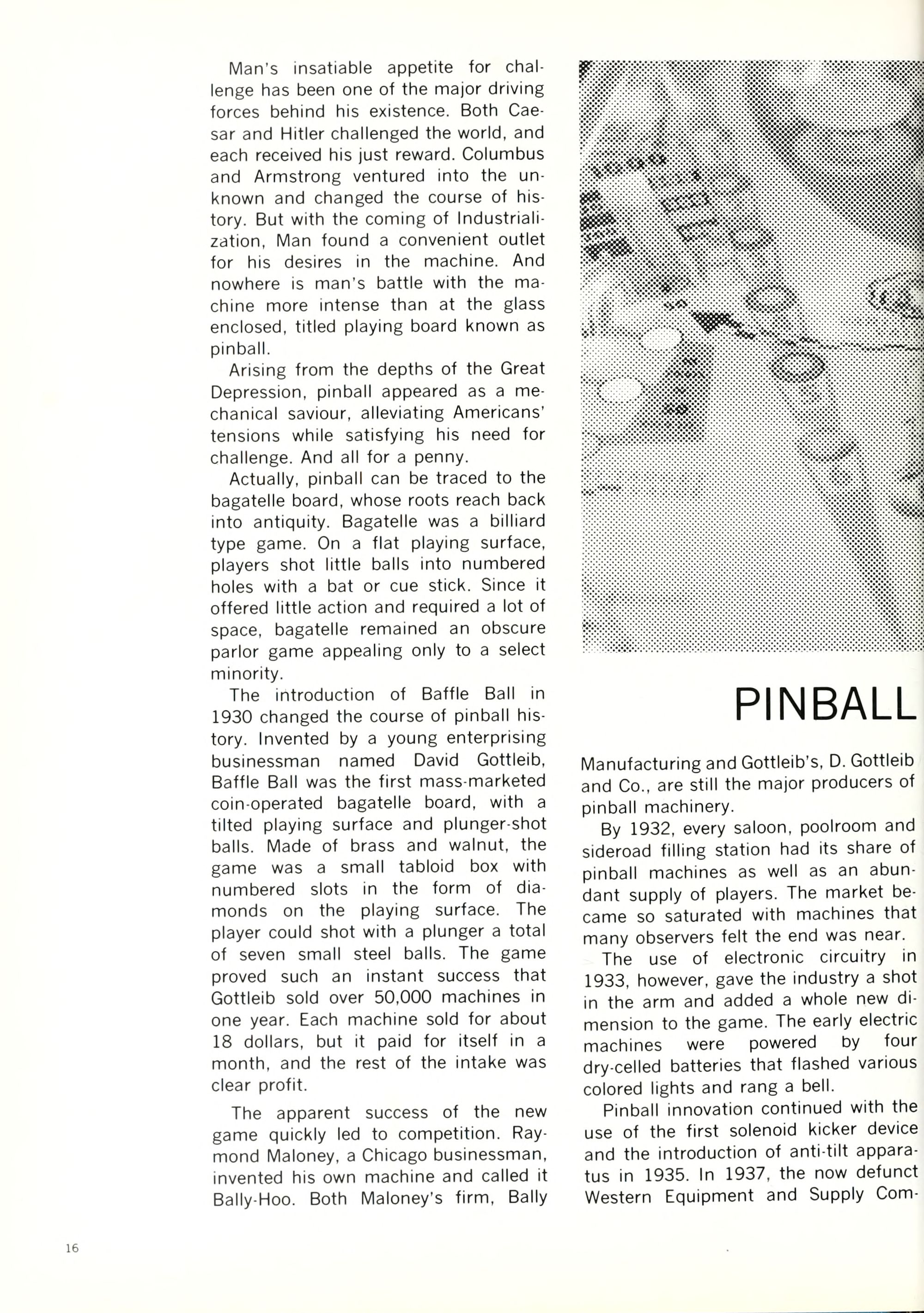 Man's insatiable appetite for chal- lenge has been one of the major driving forces behind his existence. Both Cae- sar and Hitler challenged the world, and each received his just reward. Columbus and Armstrong ventured into the un- known and changed the course of his- tory. But with the coming of Industriali- zation, Man found a convenient outlet for his desires in the machine. And nowhere is man's battle with the ma- chine more intense than at the glass enclosed, titled playing board known as pinball.