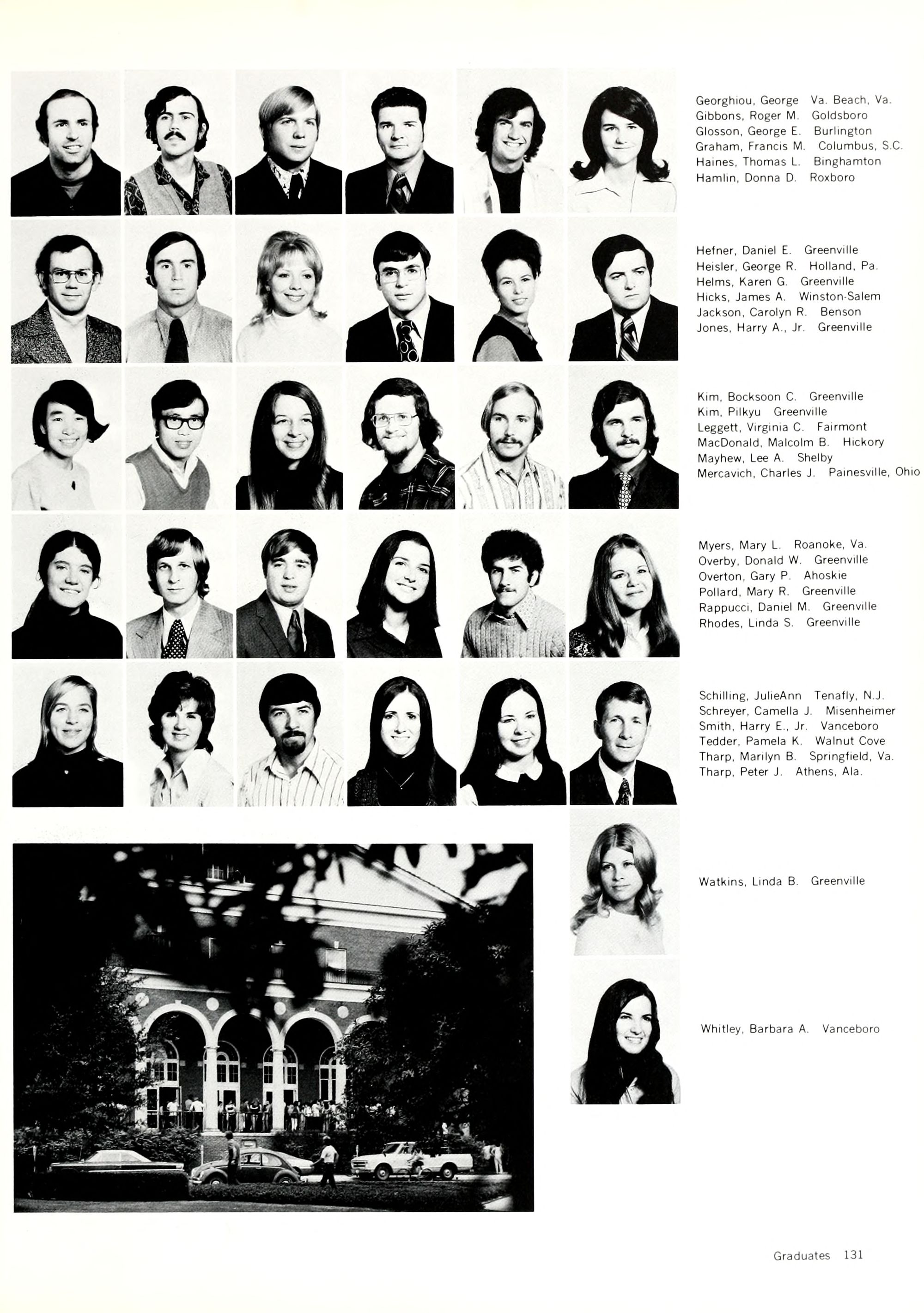Physical - Greenville is a city of 26,000, about 100 miles from Raleigh, North Carolina. The campus is in a rural environment - there's a mall with grass and trees - little else. The major eyesore is the heating plant which belches black smoke into the air.