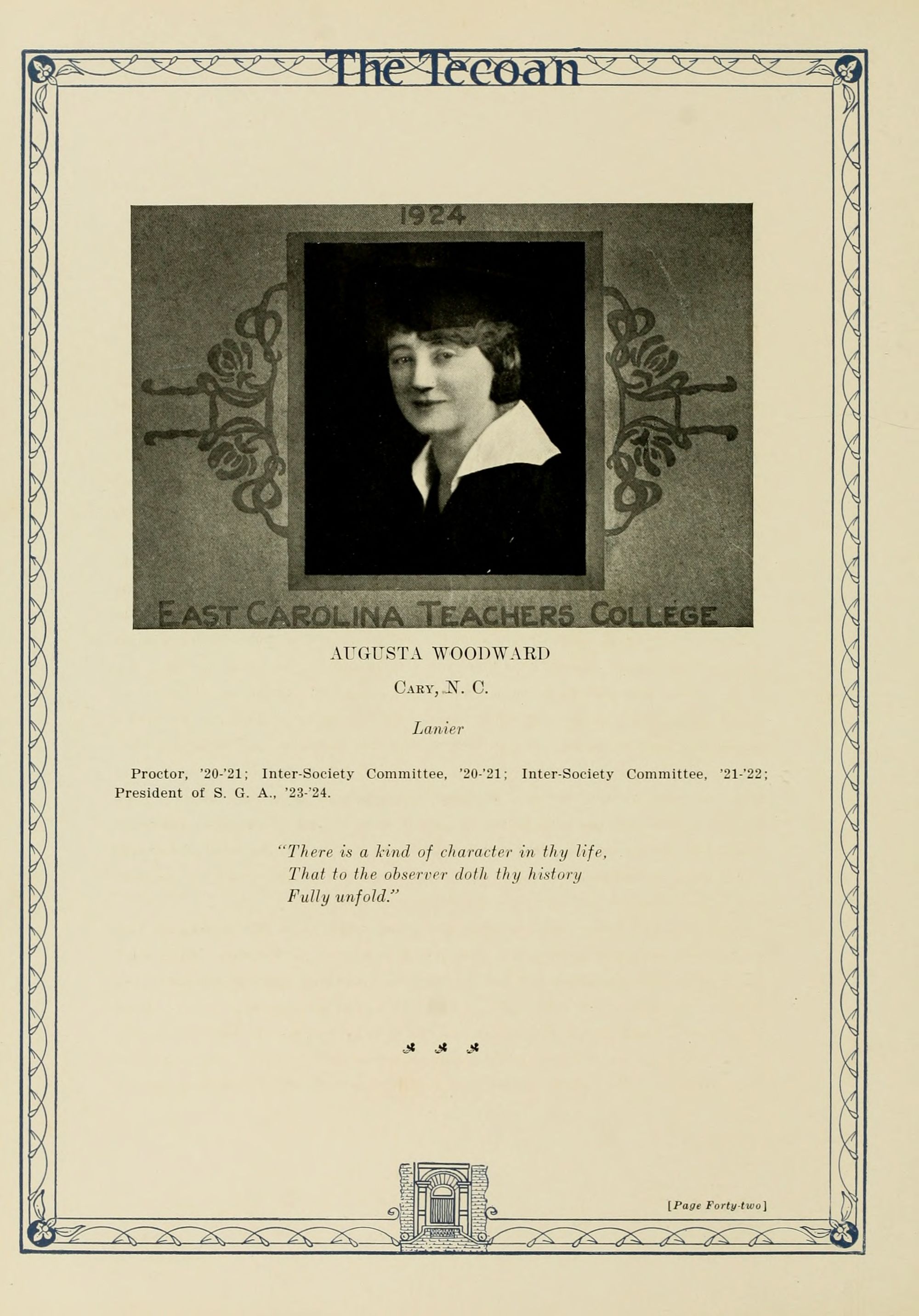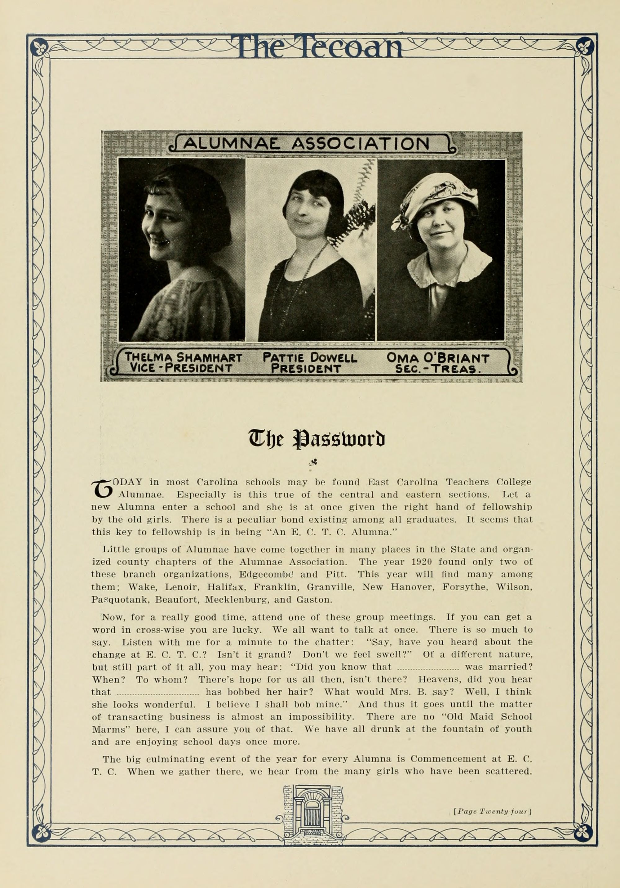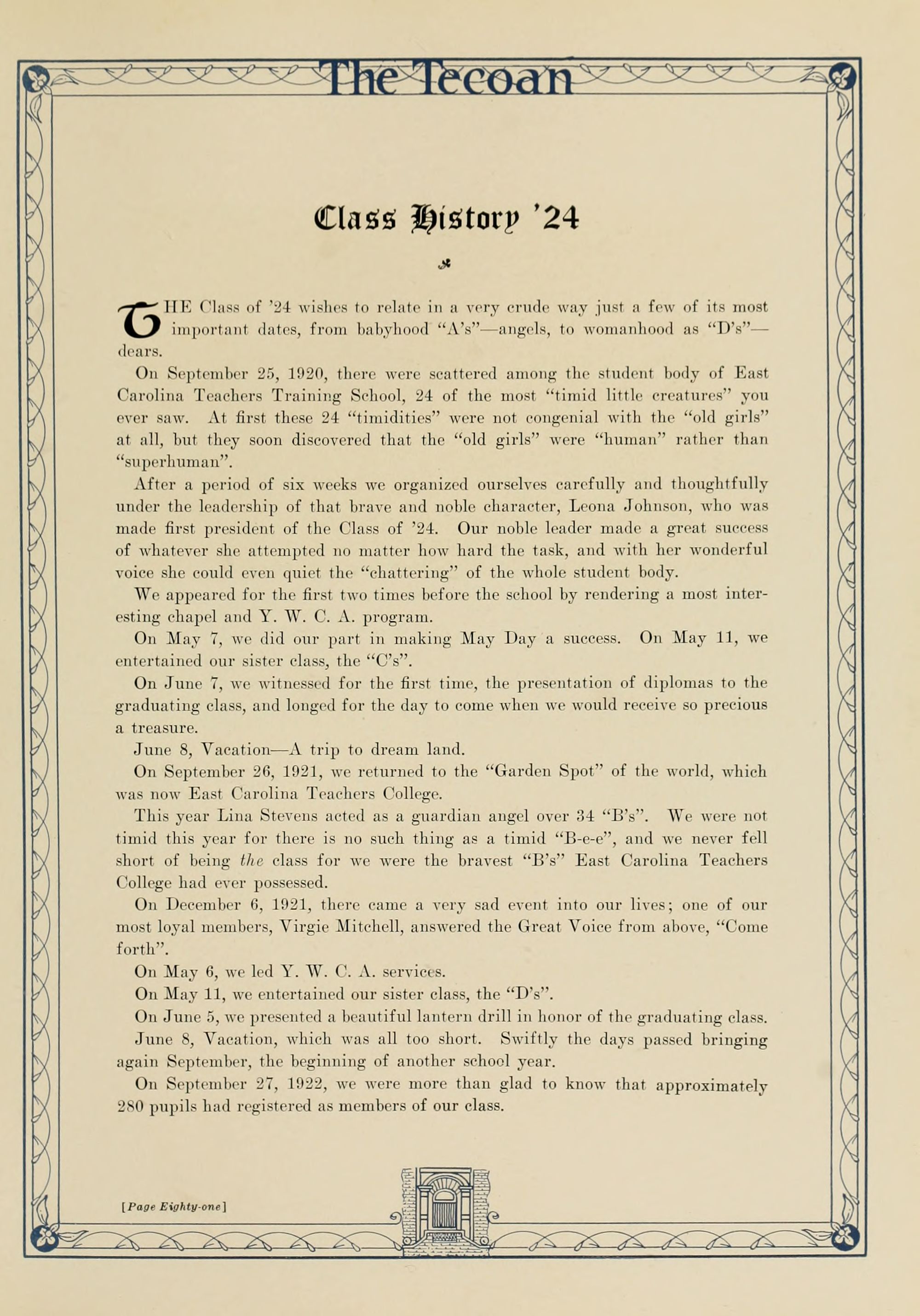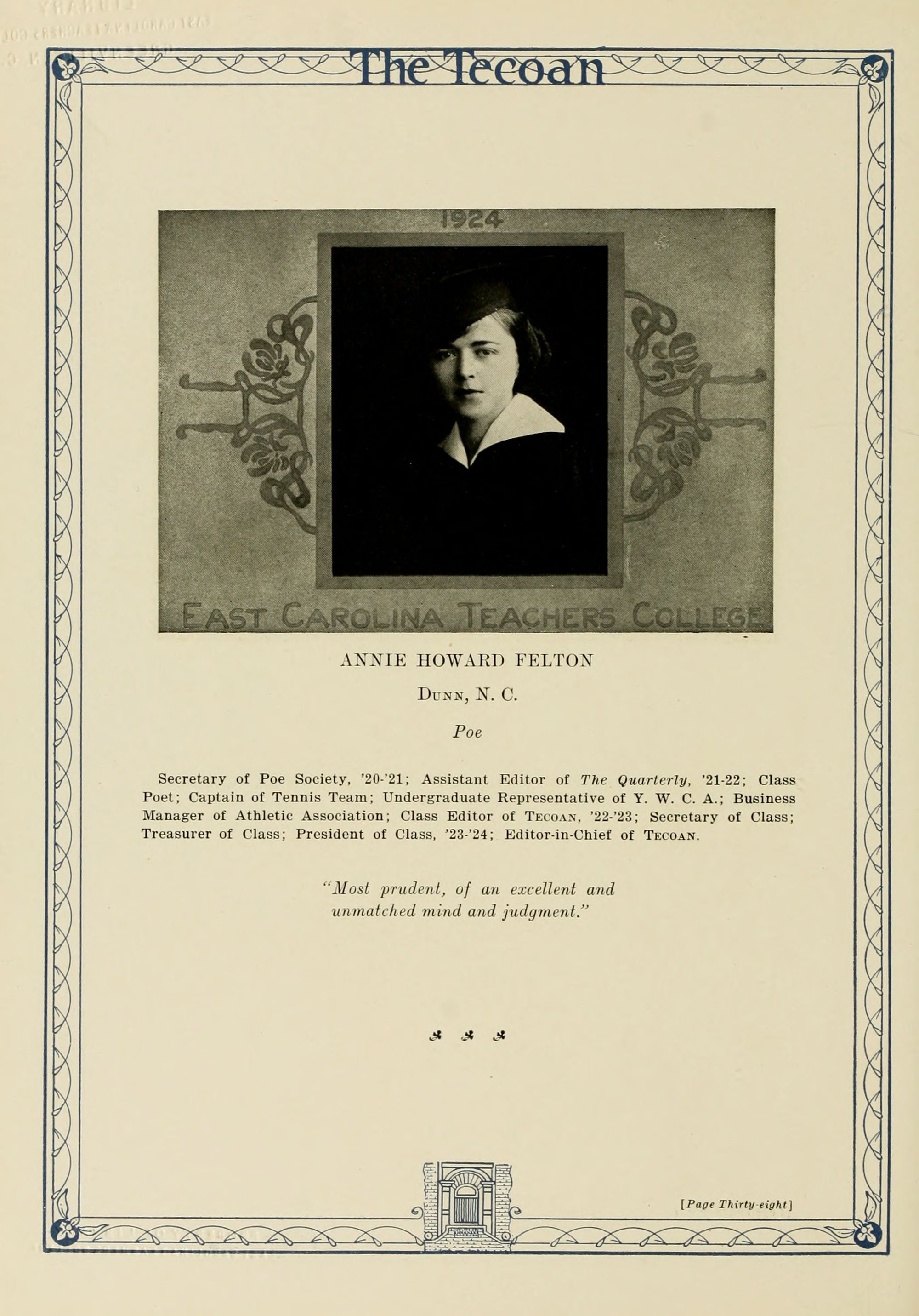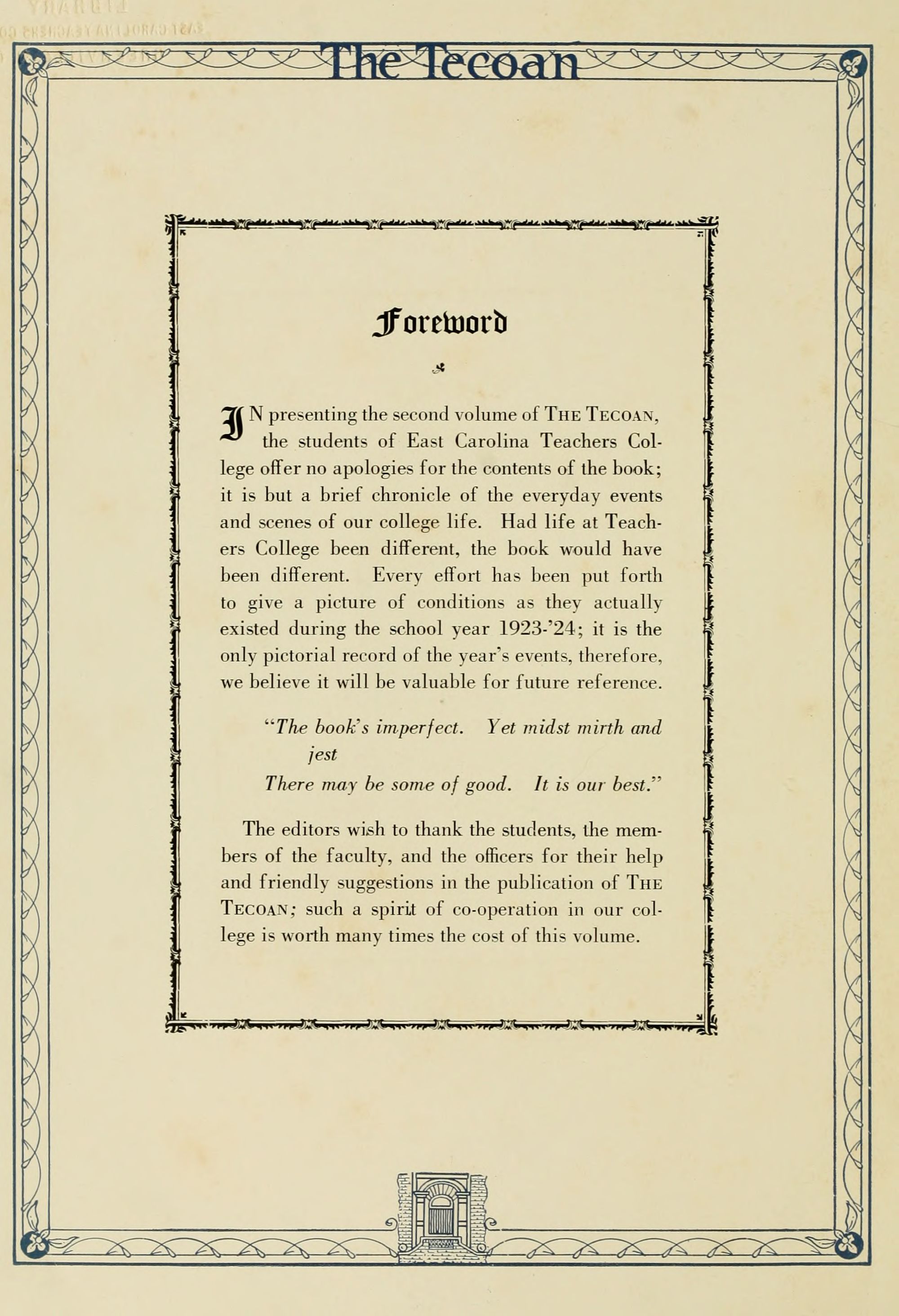 In presenting the second volume of The Tecoan, the students of East Carolina Teachers College offer no apologies for the contents of the book; it is but a brief chronicle of the everyday events and scenes of our college life. Had life at Teachers College been different, the book would have been different. Every effort has been put forth to give a picture of conditions as they actually existed during the school year 1923-'24; it is the only pictorial record of the year's events, therefore, we believe it will be valuable for future reference.