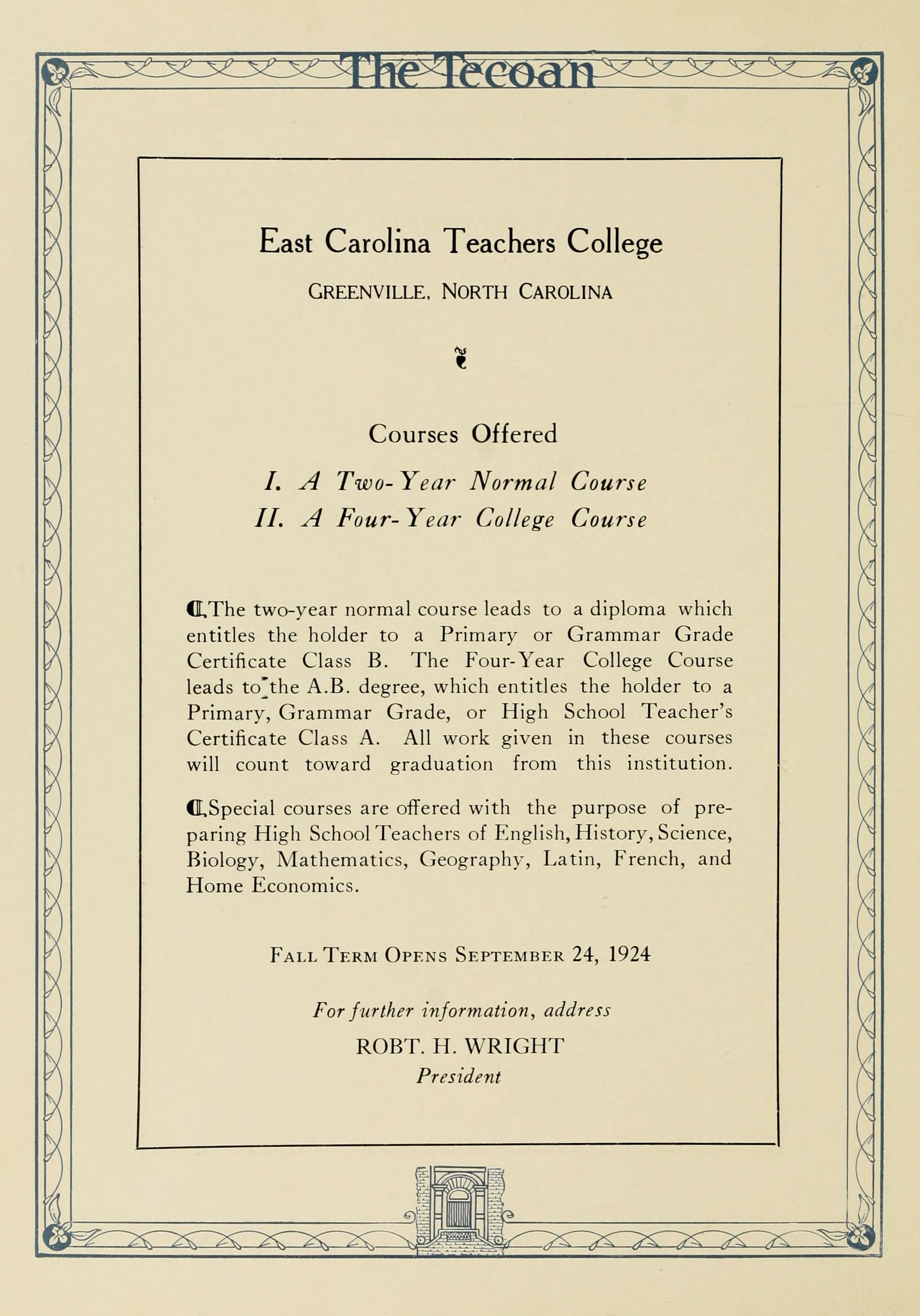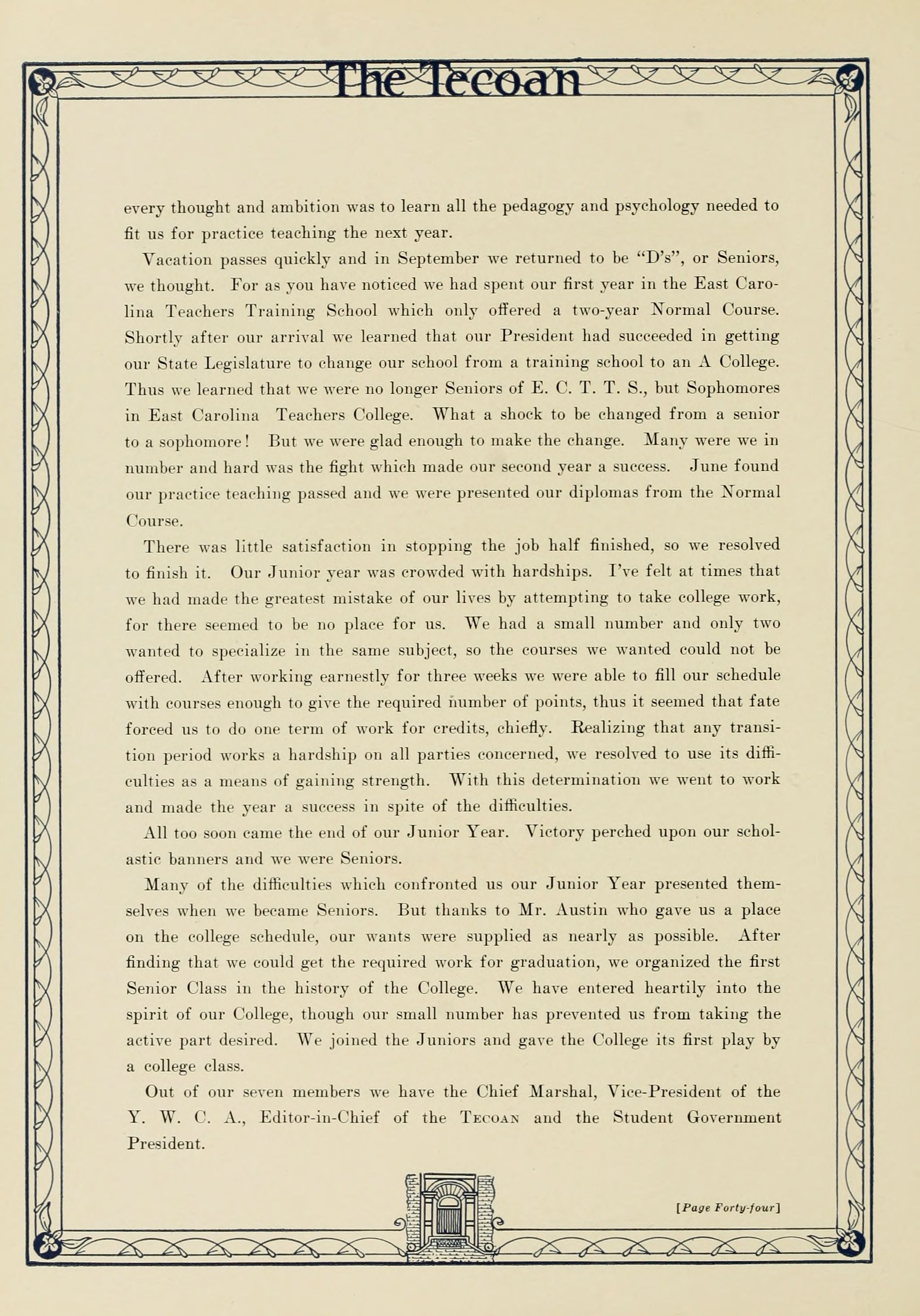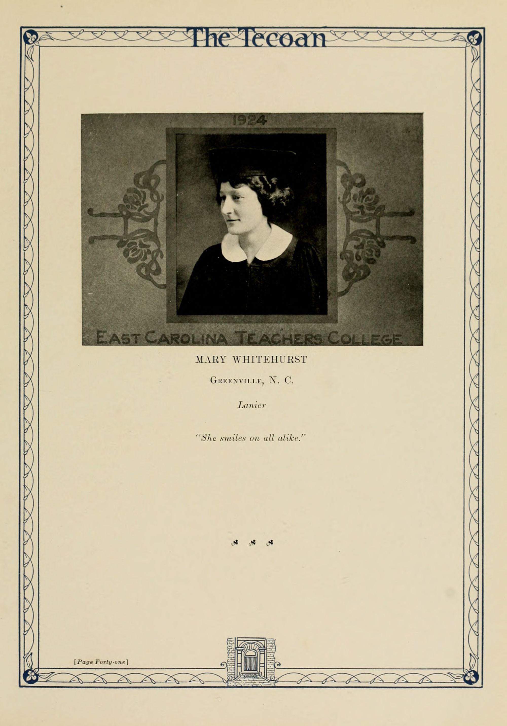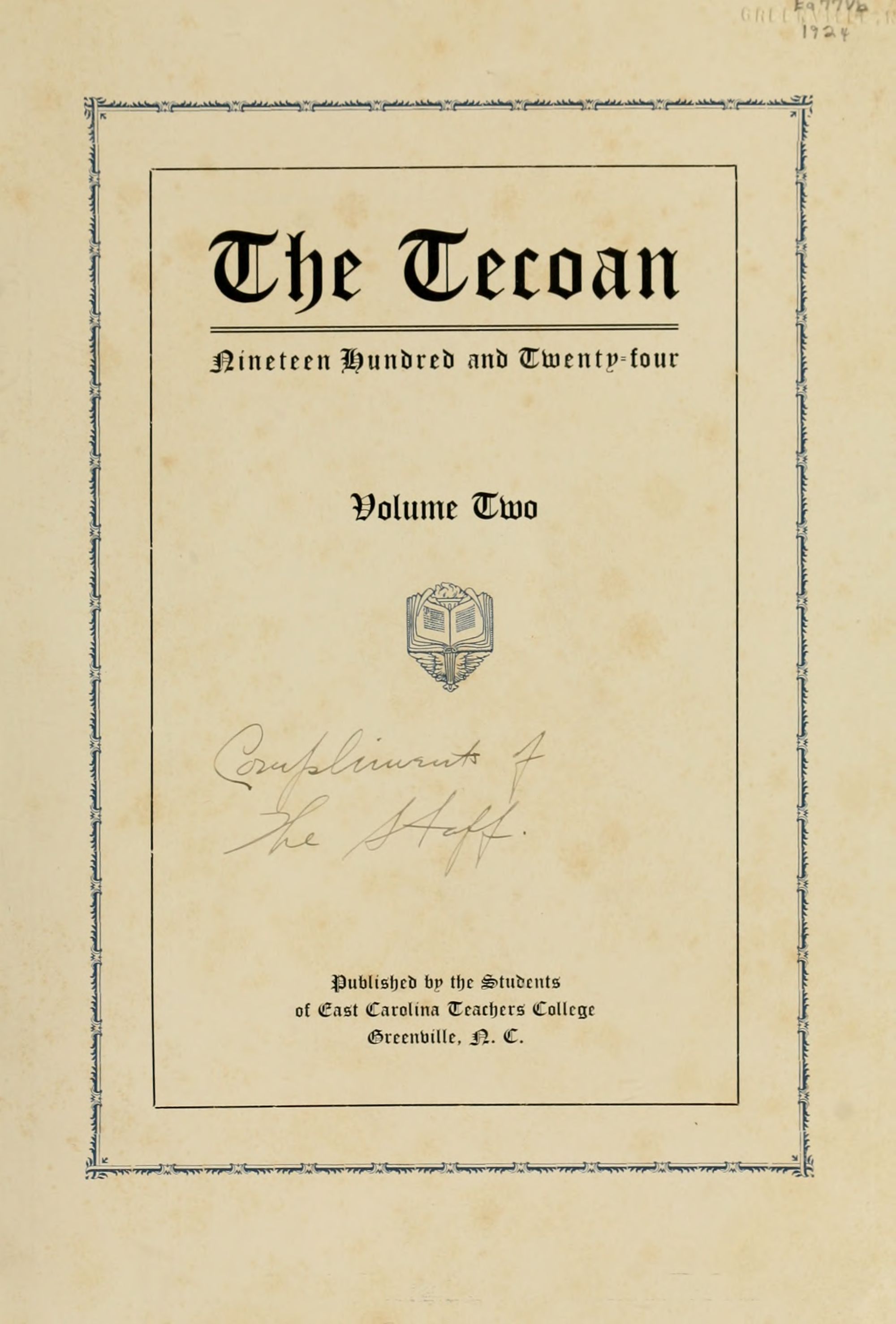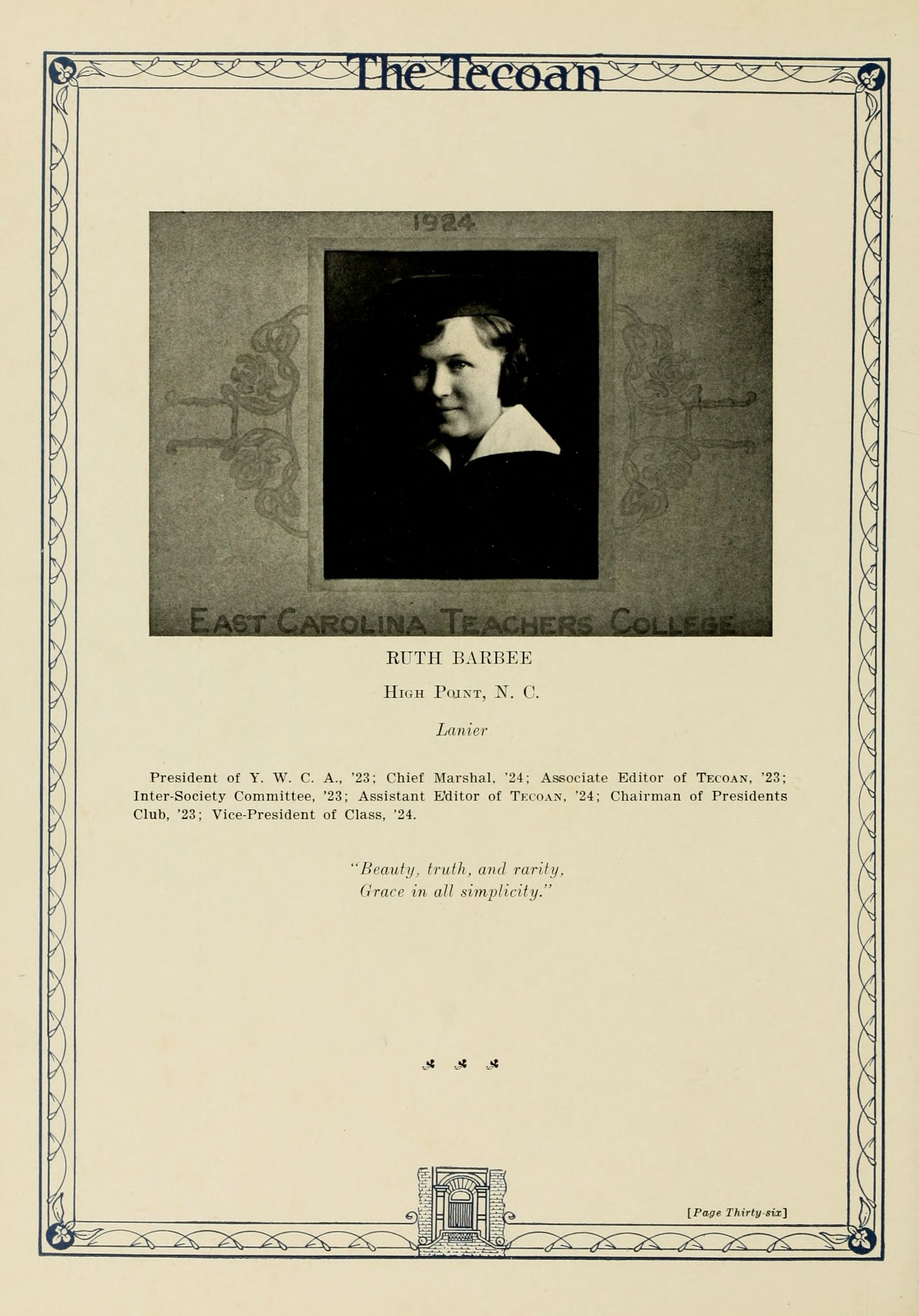 In presenting the second volume of The Tecoan, the students of East Carolina Teachers College offer no apologies for the contents of the book; it is but a brief chronicle of the everyday events and scenes of our college life. Had life at Teachers College been different, the book would have been different. Every effort has been put forth to give a picture of conditions as they actually existed during the school year 1923-'24; it is the only pictorial record of the year's events, therefore, we believe it will be valuable for future reference.