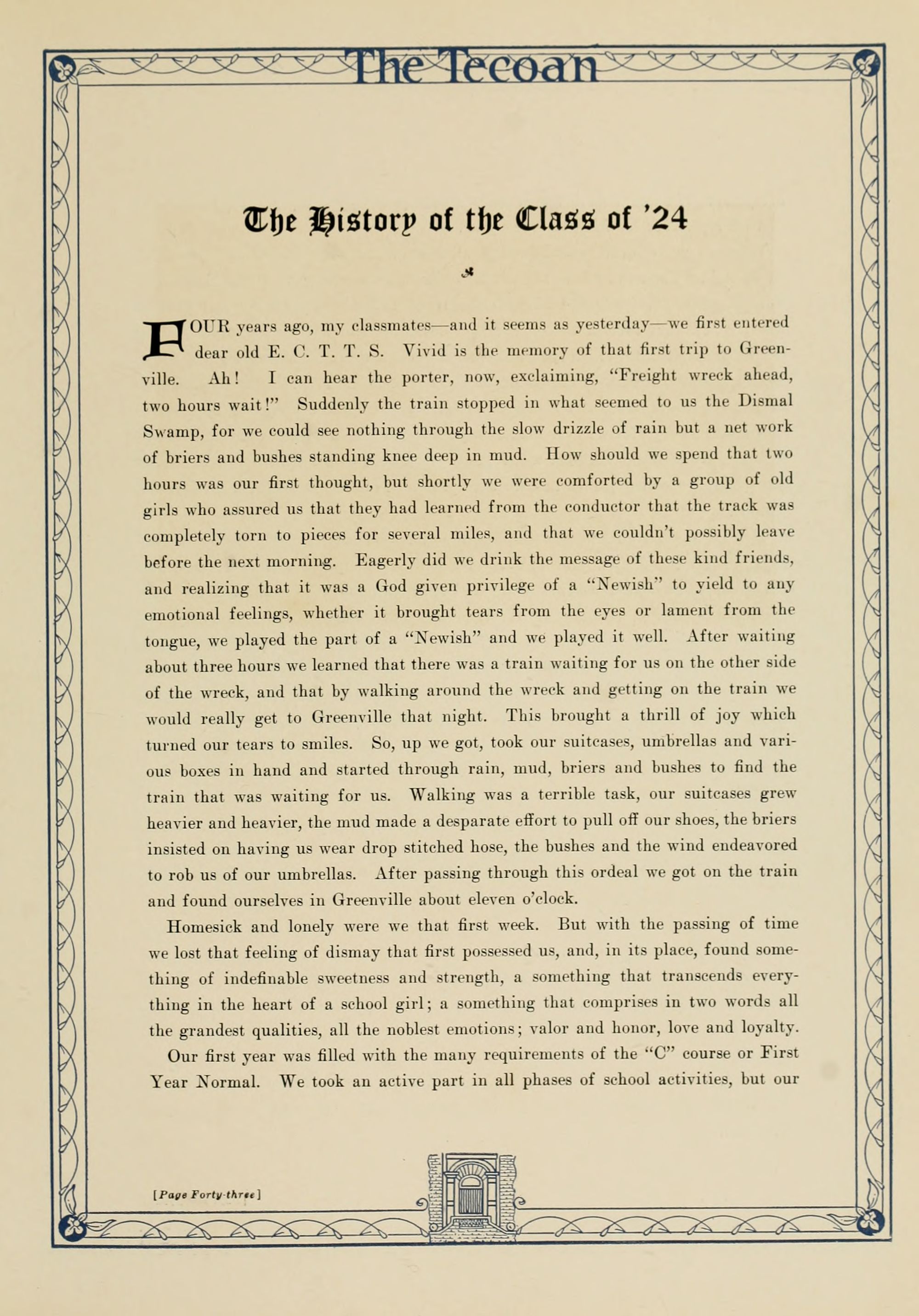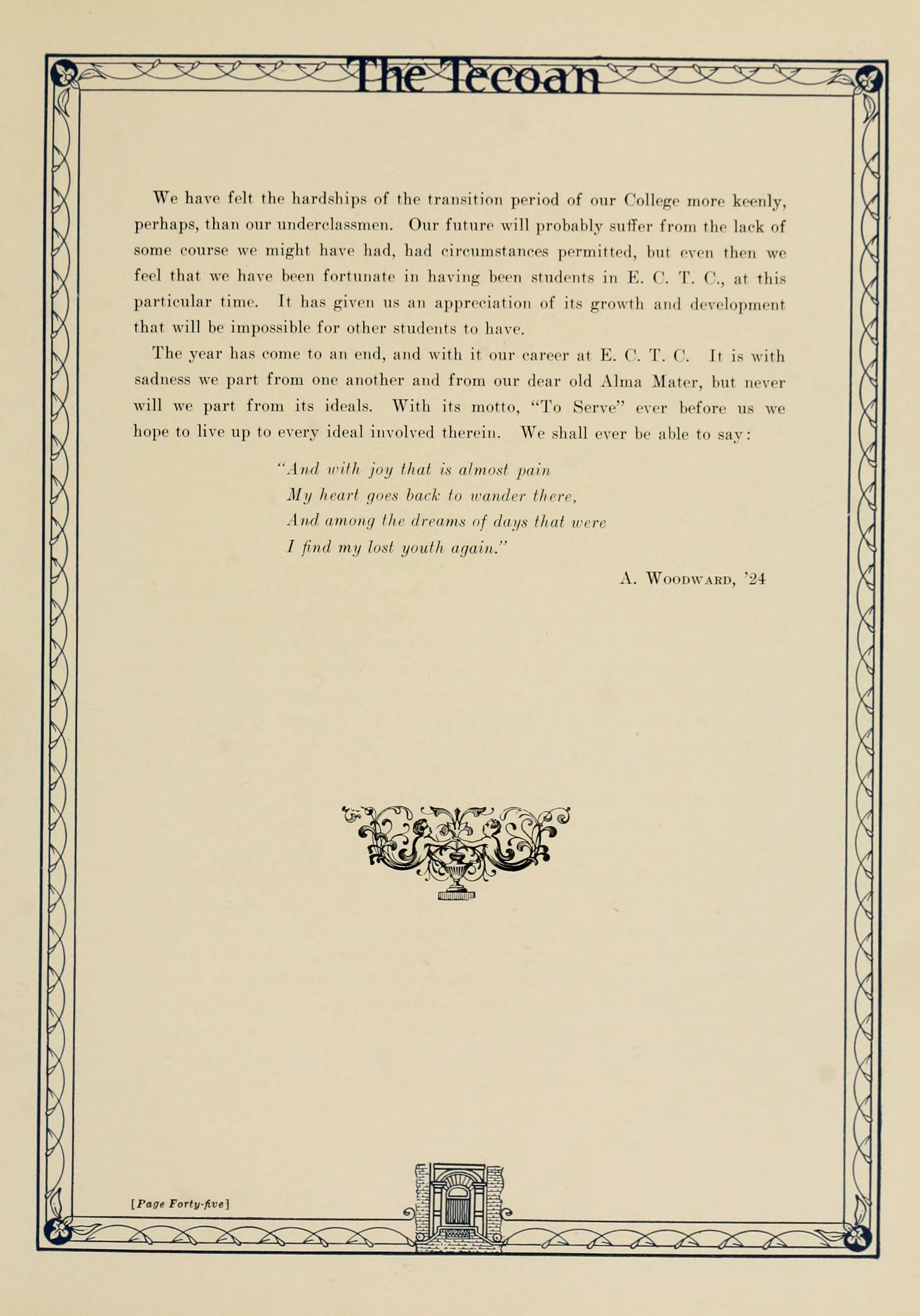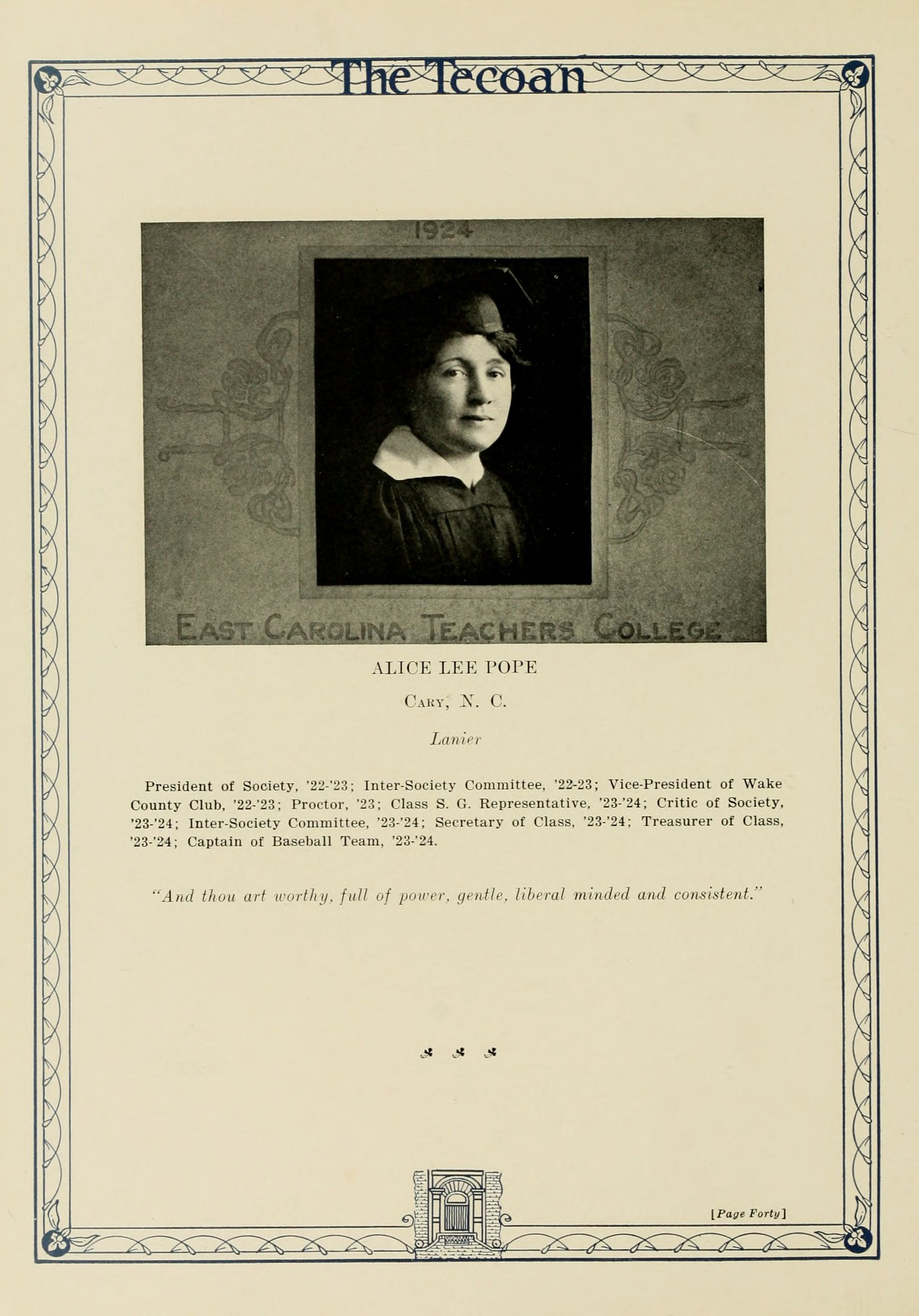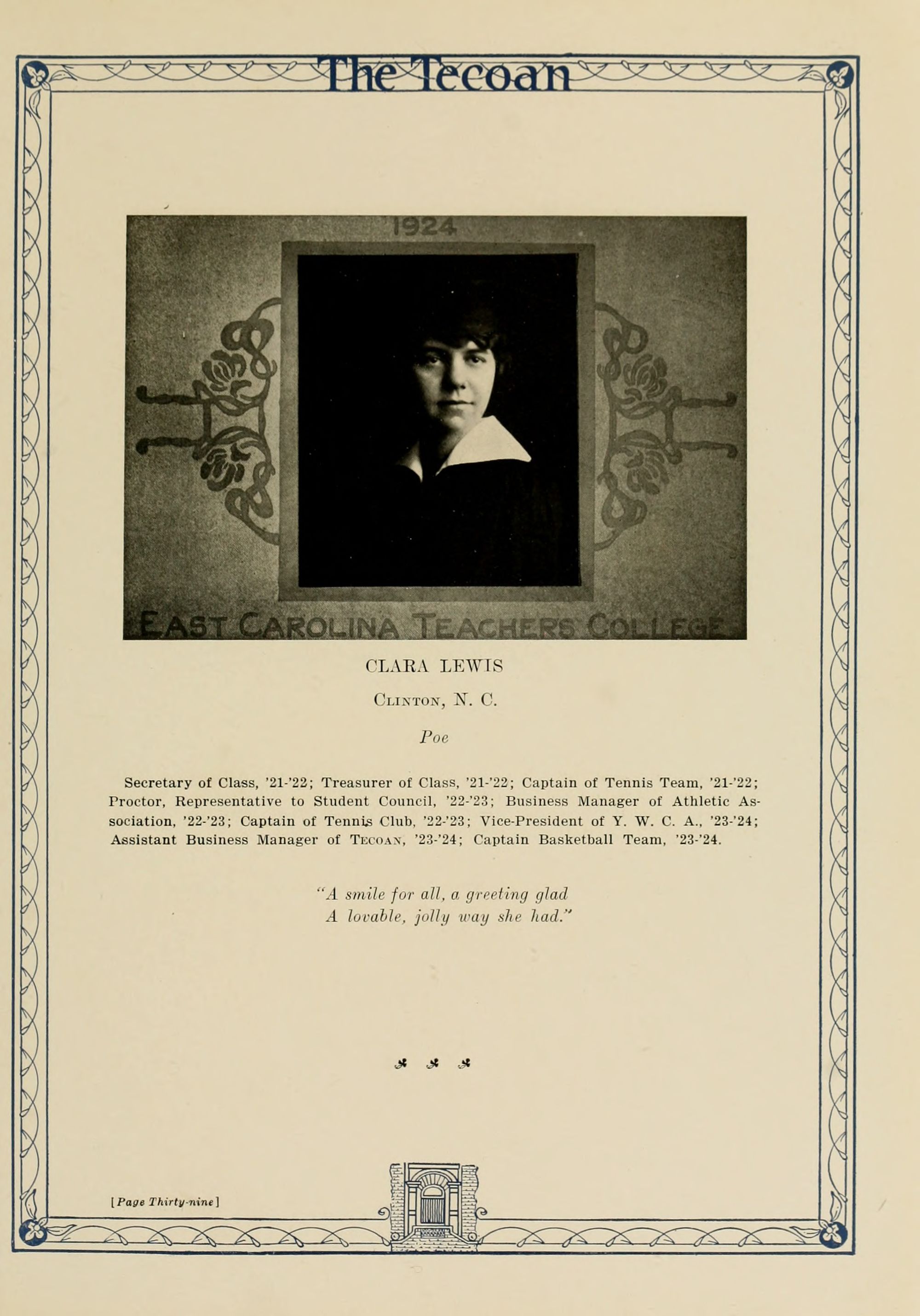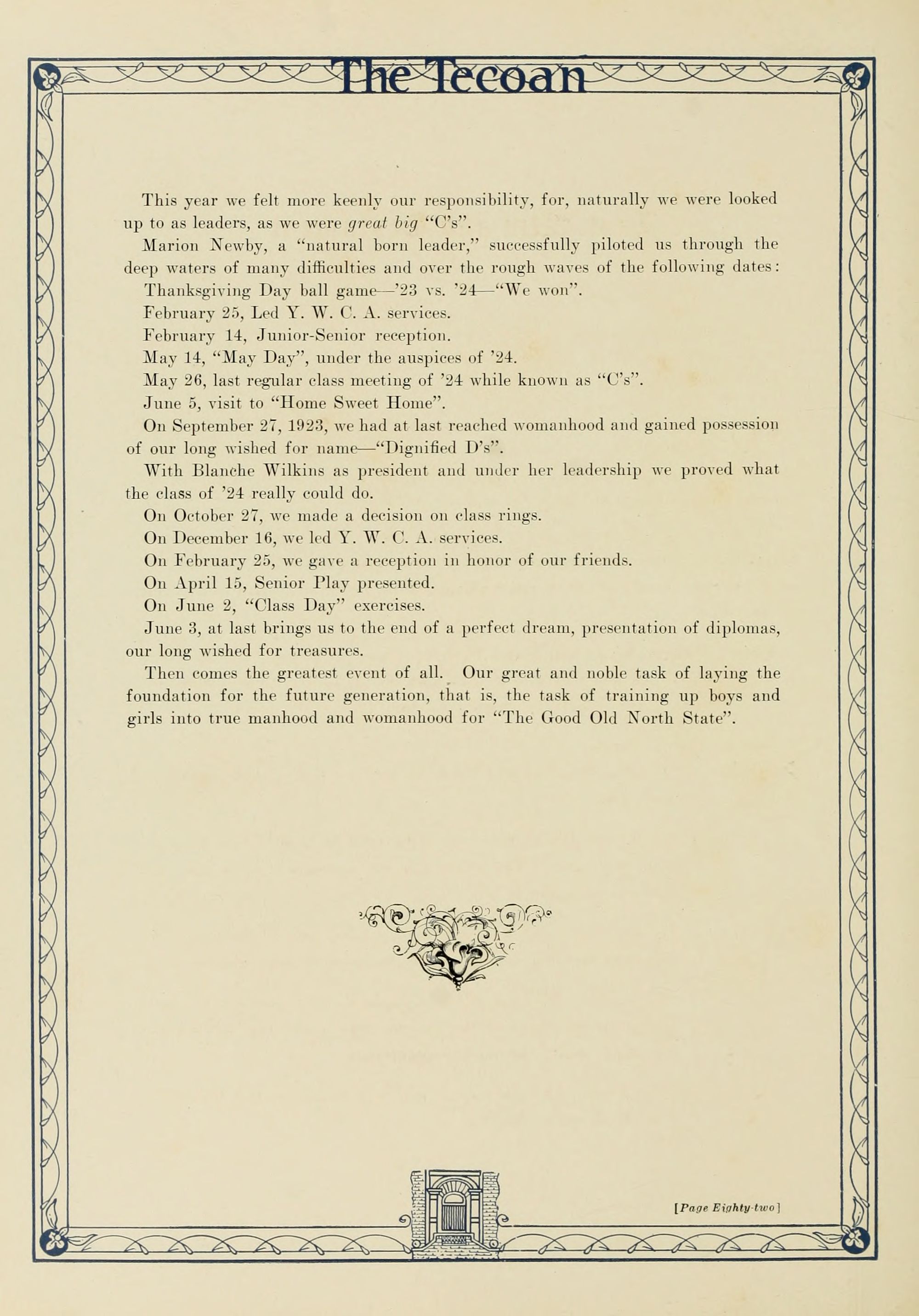 In presenting the second volume of The Tecoan, the students of East Carolina Teachers College offer no apologies for the contents of the book; it is but a brief chronicle of the everyday events and scenes of our college life. Had life at Teachers College been different, the book would have been different. Every effort has been put forth to give a picture of conditions as they actually existed during the school year 1923-'24; it is the only pictorial record of the year's events, therefore, we believe it will be valuable for future reference.